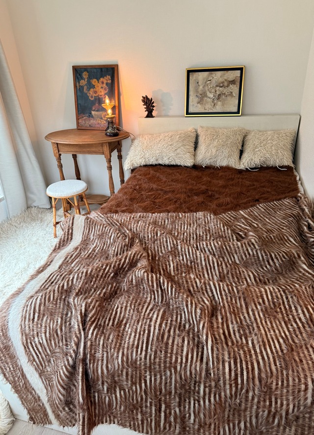 ヴィンテージ バッターニエ ブラウン Lサイズ サイズ: 193x 130cm 1980年代前半 未使用ヴィンテージ これは非常に美しく艶やかな毛質のブラウンの無地。毛は長くしなやかで、これ以上ないほどつやつやです。 未使用で、非常に状態が良く毛が薄くなっている部分も見当たりません。 全体にダイヤ型の織り柄もしっかり出ていて、はっきりとした柄がとても美しいです。 ソファにかけるのもいいですし、床に敷いても、ベッドの足元にかけて大きめのベッドスローとしても使える美しい1枚です。 色味はダークなチョコレートブラウン。 たっぷりとした毛は、光に当たるときらきらと輝きます。持ち上げるとずっしりと毛の厚みがあり、どんな寒い日にもこの1枚があれば安心です。 なかなかこの品質で未使用のブラウン無地は希少です。 (アンゴラ山羊の毛は現代に私たちが慣れている羊毛やナイロンなどよりも、ツヤとはりがあります。だからこそ輝くのですが、肌着などで座られるとちくちくと感じる方もいらっしゃるかもしれません。普通のコットンのスカート、パンツ、チノパンなどや、秋冬の服で座られたらどなたでも気にならないと思います。もちろん足元に置かれる分にはさらさらとしてとても気持ちがいいと思います) アンゴラ山羊の毛は春に刈られ、洗ってから毛糸としてつむがれ、さらに木製の機織りで一つ一つ完全に手作業で織られます。 それを、さらにまた洗って乾かすという作業があるため、織り始めてから数えても1週間はかかります。 昔はこうした山羊飼いの遊牧民たちが多くいたのですが、現代では山羊飼いをやめて都会で暮らす若者も多いため、年々この毛布を作る家族は減ってきているのだそうです。 山羊の毛そのままの色を生かし、一切染めずに織られているバッターニエは、クリーム、黒、茶色、キャメル、グレーがメインの色合いです。 山羊によって、毛色や毛質は違い、特にキャメルやカフェオレブラウン、ぱっきりとした茶色までブラウン系の濃淡はいろいろ。 毛質も繊細で細くふわふわとした巻毛のものから、太めでしっかりとしたものまで一頭ずつ違うので、1枚1枚どんな毛を使っているかでモヘアの個性が変わってきます。 nomad apartment.shopでは、新品のバッターニエと、ヴィンテージの貴重なバッターニエの両方を取り扱っています。 新品は、現代のモダンな空間によく似合います。 ヴィンテージに比べて布自体がしっかりとしているため、ラグとして気軽にどこにでも使いやすいものになります。 ヴィンテージは、アンゴラ山羊の毛の毛量が多く、まさに毛皮のような厚みと柔らかさが魅力。 色合いやデザインは一つ一つ違います。 1980年代のヴィンテージは毛質がとても良く、最近人気が出ているため数年後には無くなる可能性もあります。 ぜひ見比べてお好みのものを見つけてください。