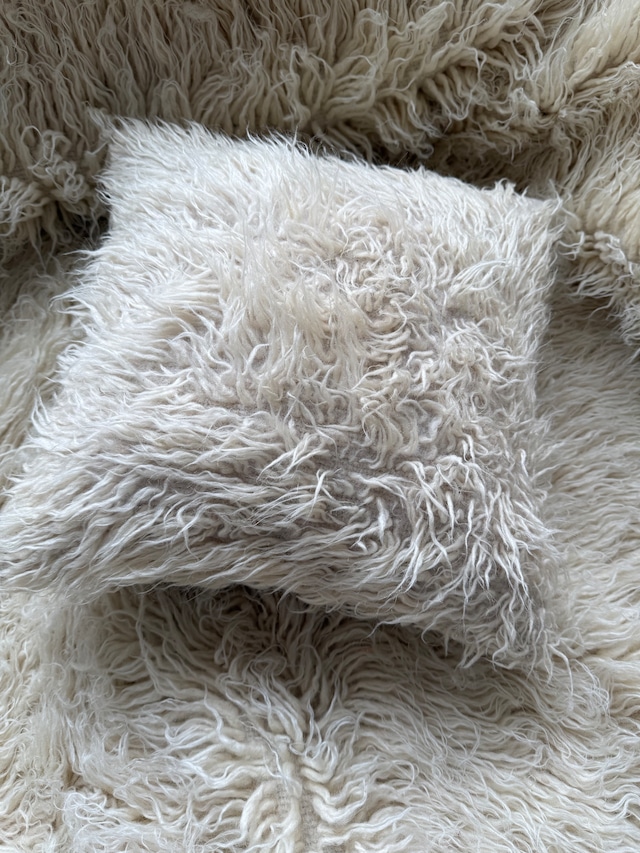 ヴィンテージ トゥル シープ クッションカバー サイズ 40x 40cm 1980年代 羊毛 長い毛足のもしゃもしゃのTulu(トゥル)のクッションカバー。 1番使いやすい40x40cmです。 とても美しいホワイトの毛です。 ソファやベッドの上に置くと、まるでペットがいるような可愛らしさです。 大きなトゥルの織り物を再利用して作られたクッションカバーですが、今回のものは毛足が非常に長い豊かな色が特徴です。 ちょっとウニのようなもしゃもしゃ感がなんともいえずキュートです。 裏側はリネンのような非常に淡いグレー布地(リネンではないと思います)で、とても品がいい仕上がりです。ベージュのチャック部分の始末もきちんとされています。 ※クッション中綿をご希望の方は1200円、300円送料プラスでお送り可能です。 ご連絡下さい。 Tulu は、トルコ語で「tüylü」(毛深い)を意味します。トルコのカラピナルの遊牧民たちによって、伝統的に織られてきました。 この地域の遊牧民たちは、寒い冬の間、トゥル絨毯を床敷物や寝具、毛布、時に壁掛けとして使っていました。織り方は、イランの「ギャッベ」、モロッコの「ベニワレン」と似ています。 山岳地帯で暮らす遊牧民たちが自らの暮らしのために織ってきたもので、寒さを凌ぐためにこのように毛足が長い織物を作るようになったようです。 織り方はざっくりとしていて、いかにも家庭で織られてきた手織りの織り物。紡いだ長い羊の毛を織り込んでいます。 1980年代以降は、遊牧民の数が減ったためにこのような織物が作られなくなりました。大変希少なトゥル、この機会にぜひお手に取っていただけたらと思います。