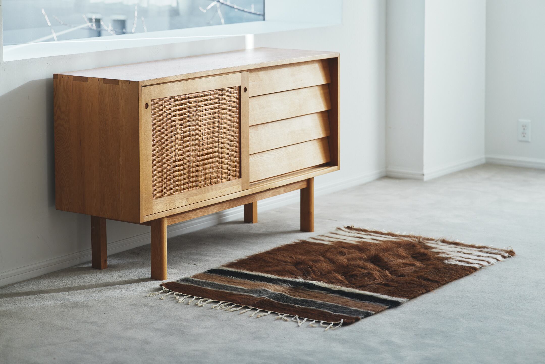 ブラウンのバッターニエは、フェミニンさがあまりなく、家具に合わせるとシャープで贅沢な雰囲気になります。これ1枚でかっこいいラグジュアリーな空間になるかと思います。