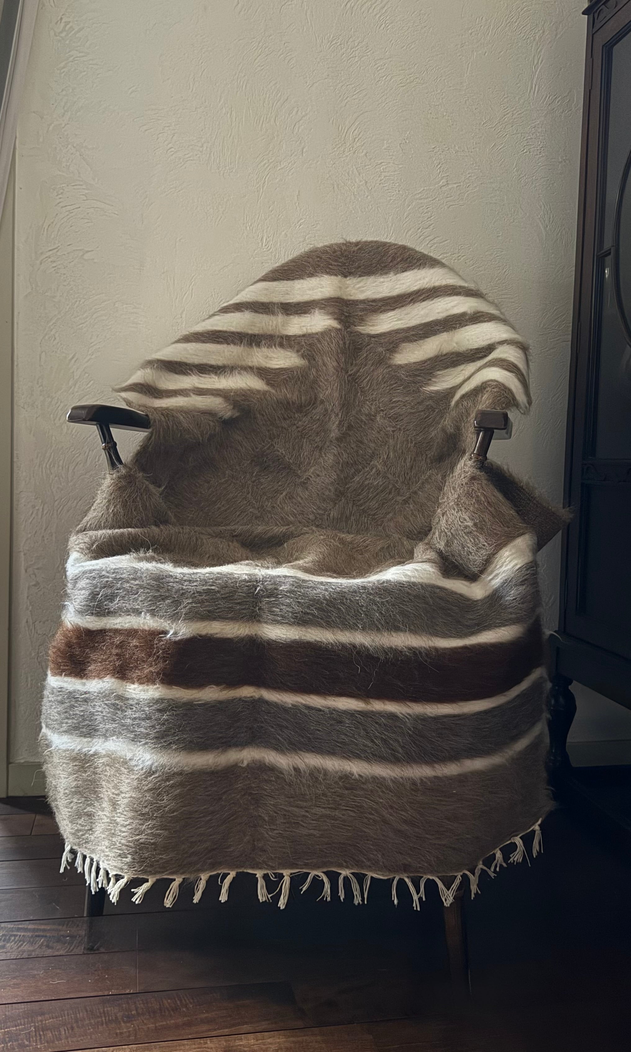 バッターニエは、アンゴラ山羊の毛で織られています。羊やウサギの毛などより、ツヤとハリがあり、夏の薄着や肌着で座ると、ほんの少しちくちく感を感じるかもしれません。