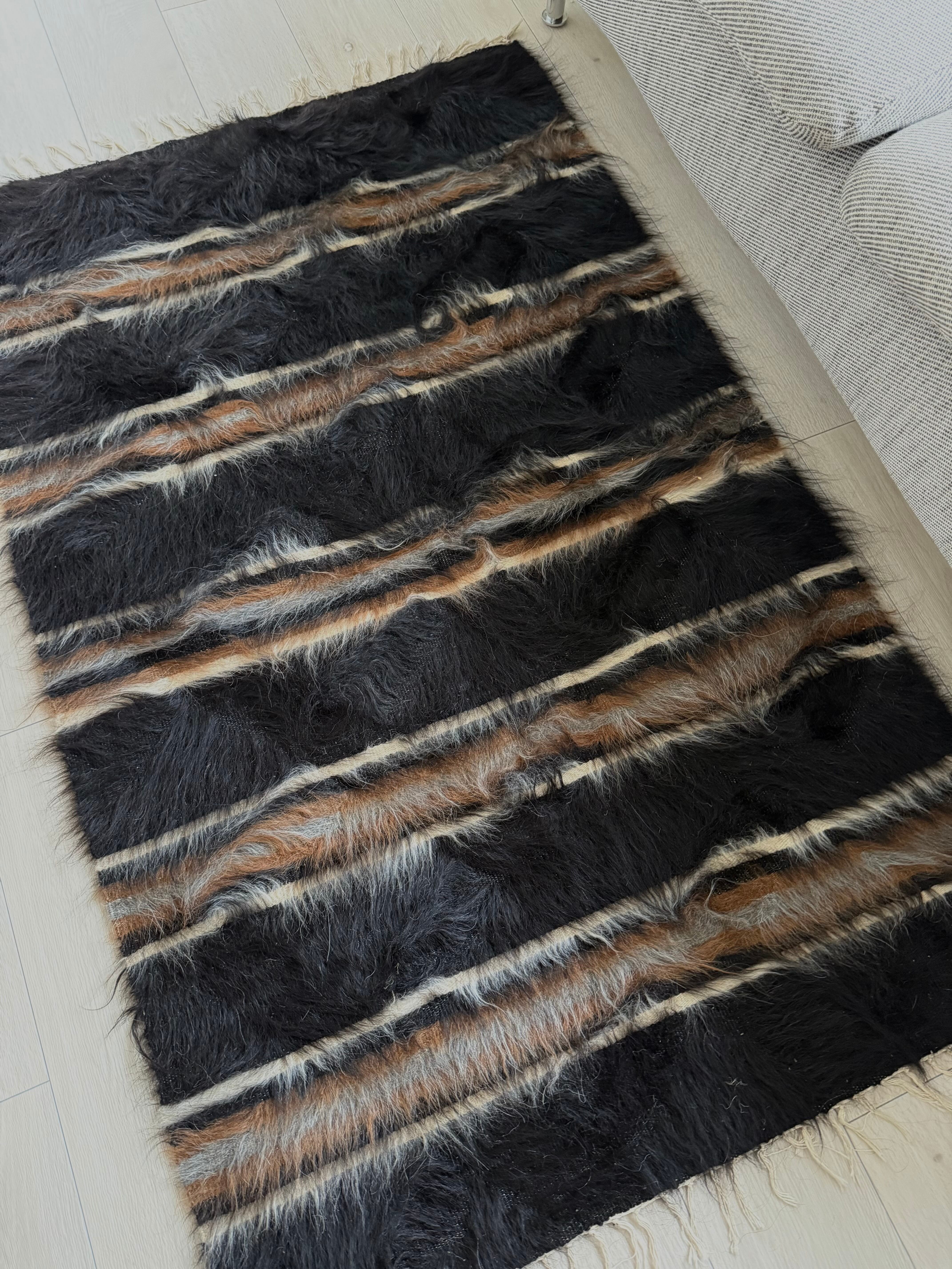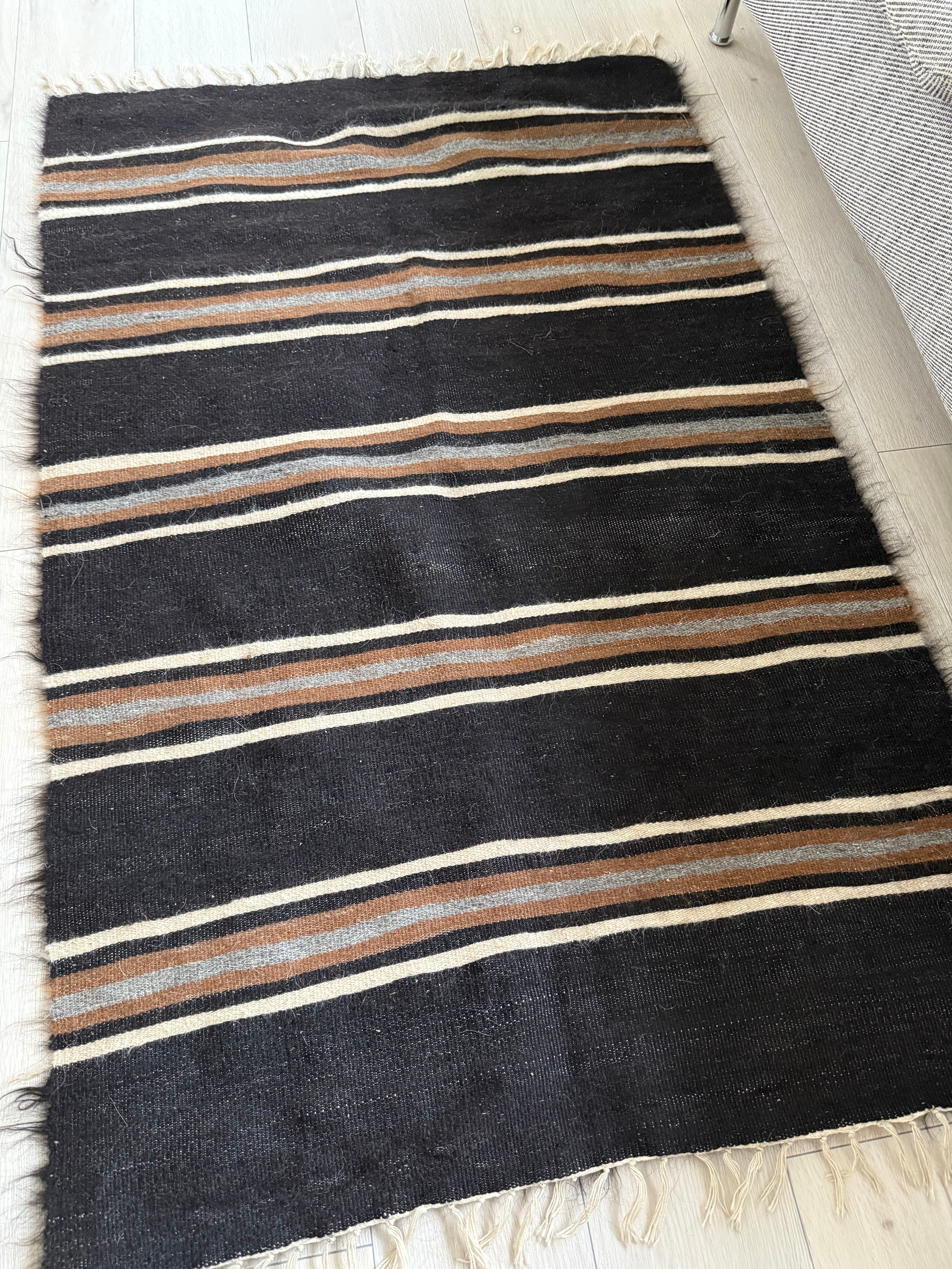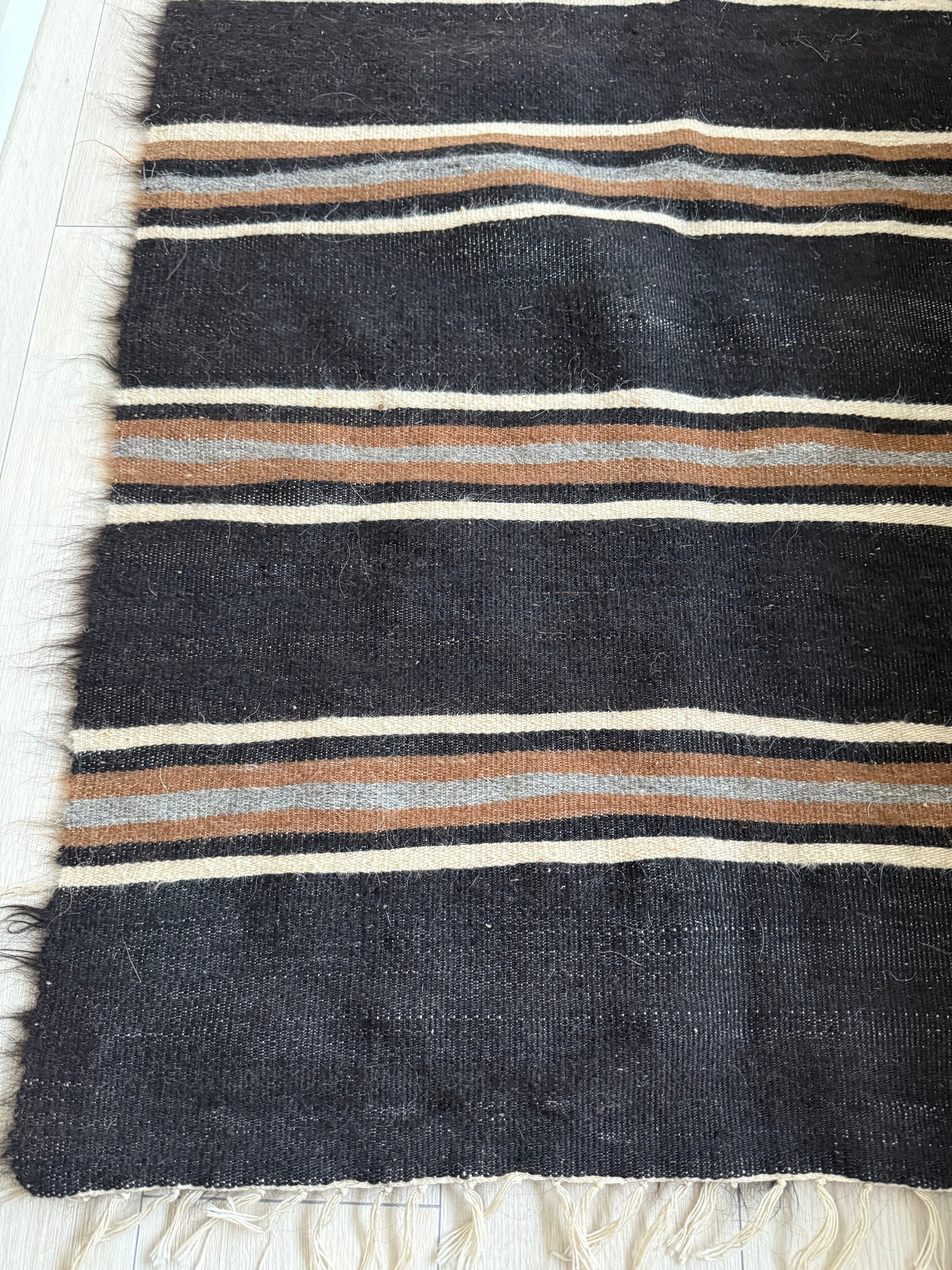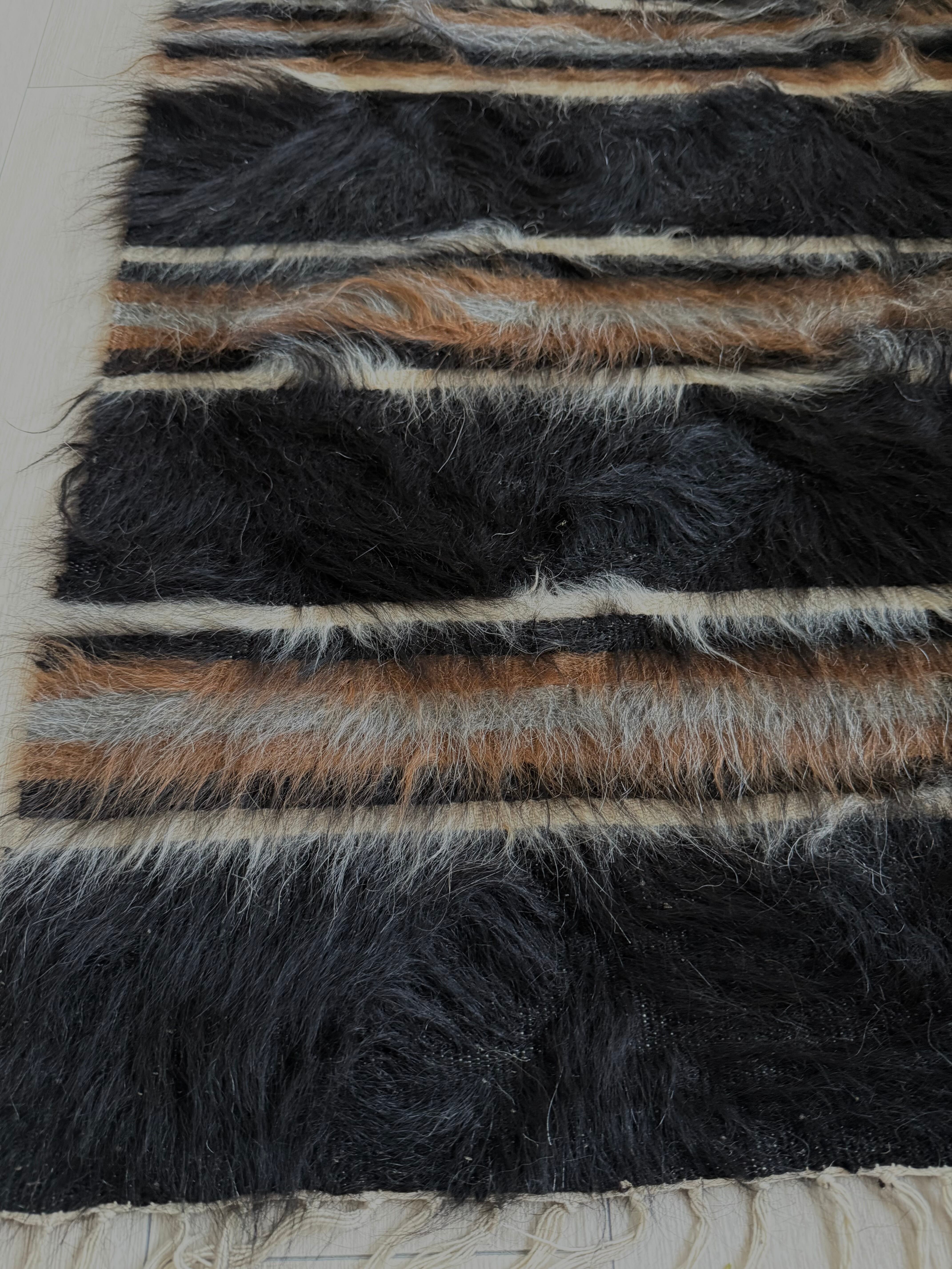 バッターニエにストライプ自体はよく存在するのですが、このように長く艶のある毛のものはとても珍しいものです。この柄は、裏側もかっこよく、裏側だけでも魅力的なキリムとして使えます(写真5.6.7枚目をご覧ください)。