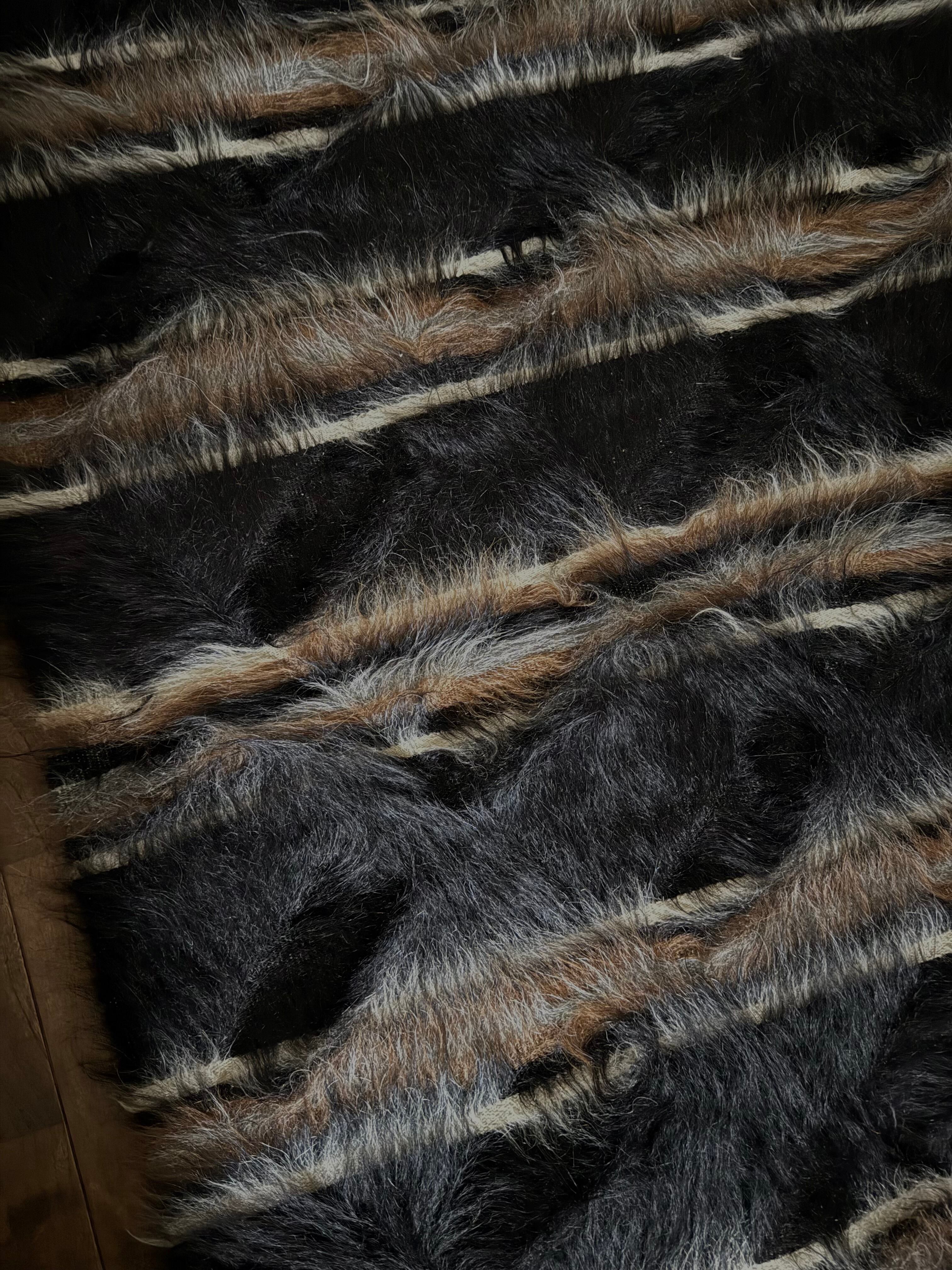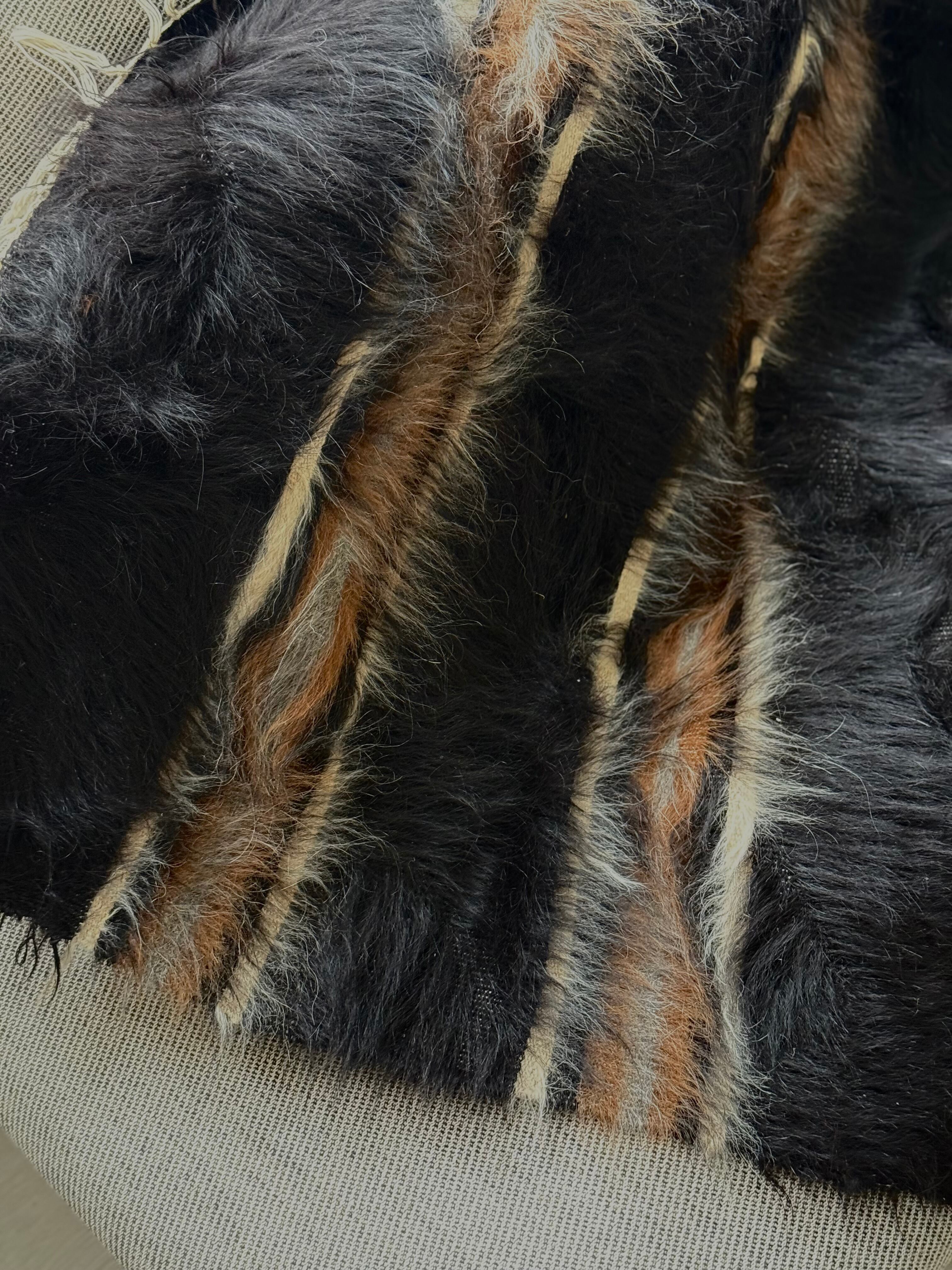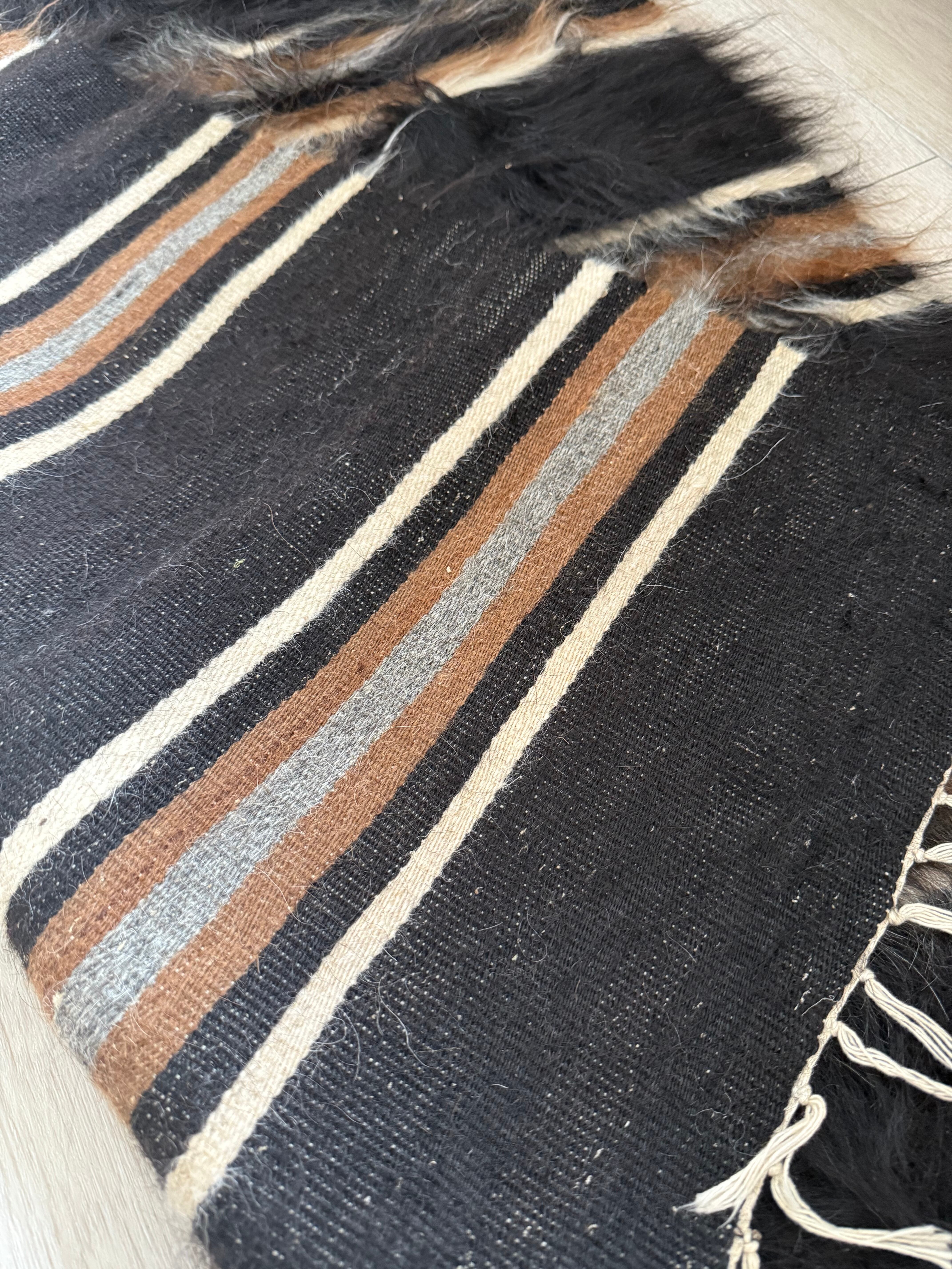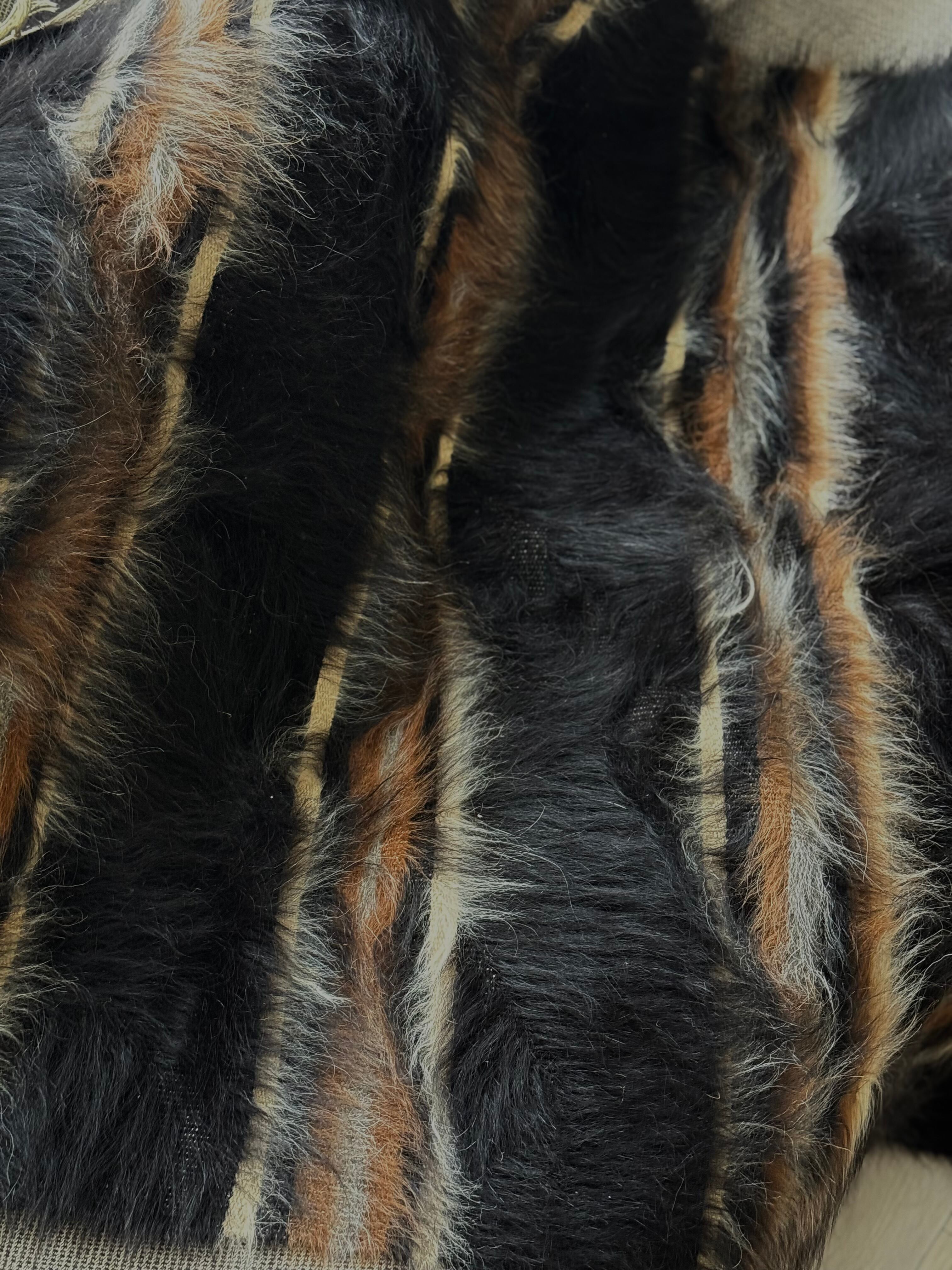 とても珍しく美しいブラックのストライプ。長くて艶のあるブラック、ホワイト、キャメル、グレーの3色の毛が重なるようにストライプの上にも流れて、贅沢で美しいニュアンスを出しています。