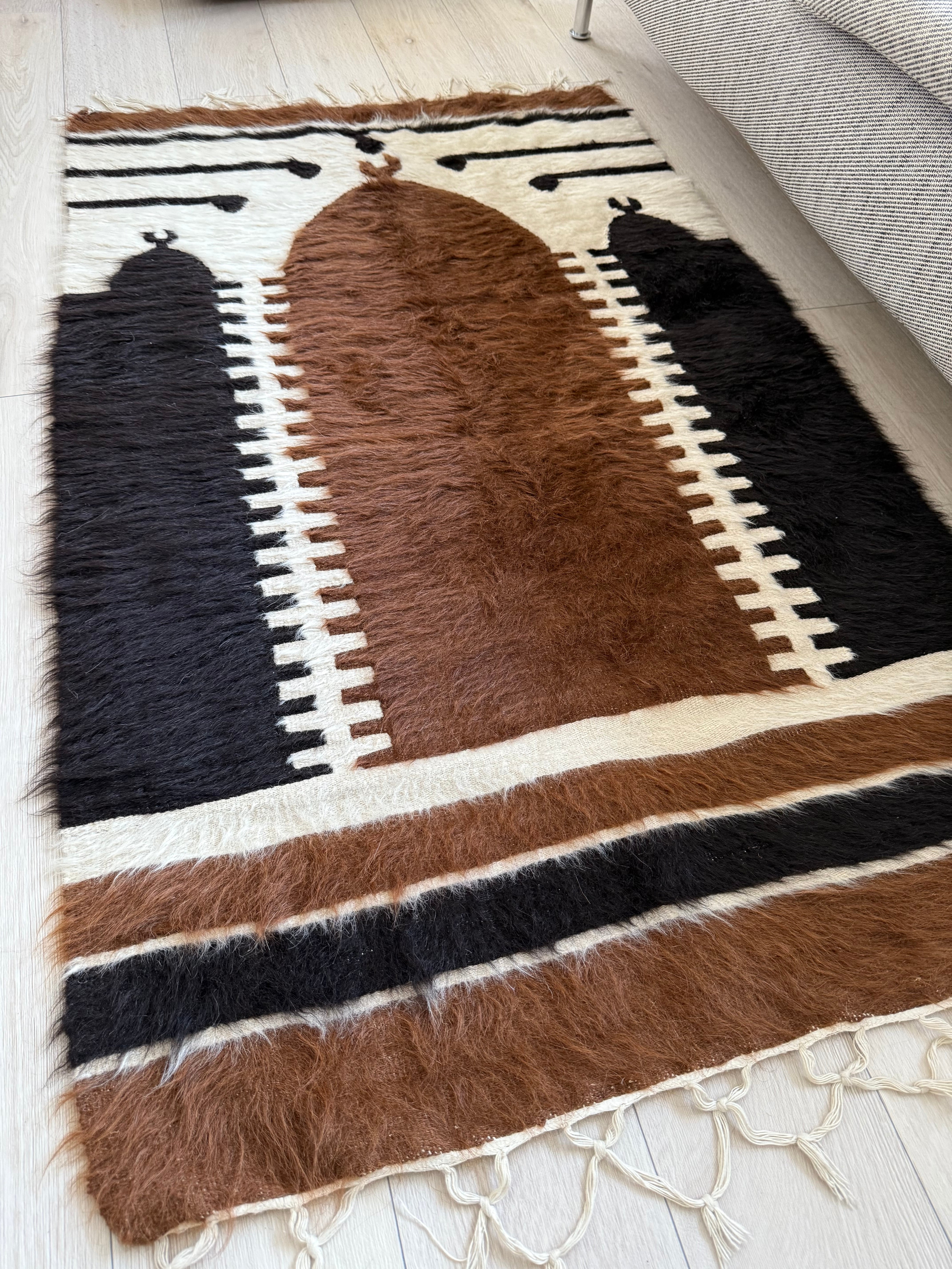 モスクとその間にあるハシゴのようなモチーフ、それぞれは別々に織られて、縫い合わされています。非常に込んだ作りのアートのような1枚です。