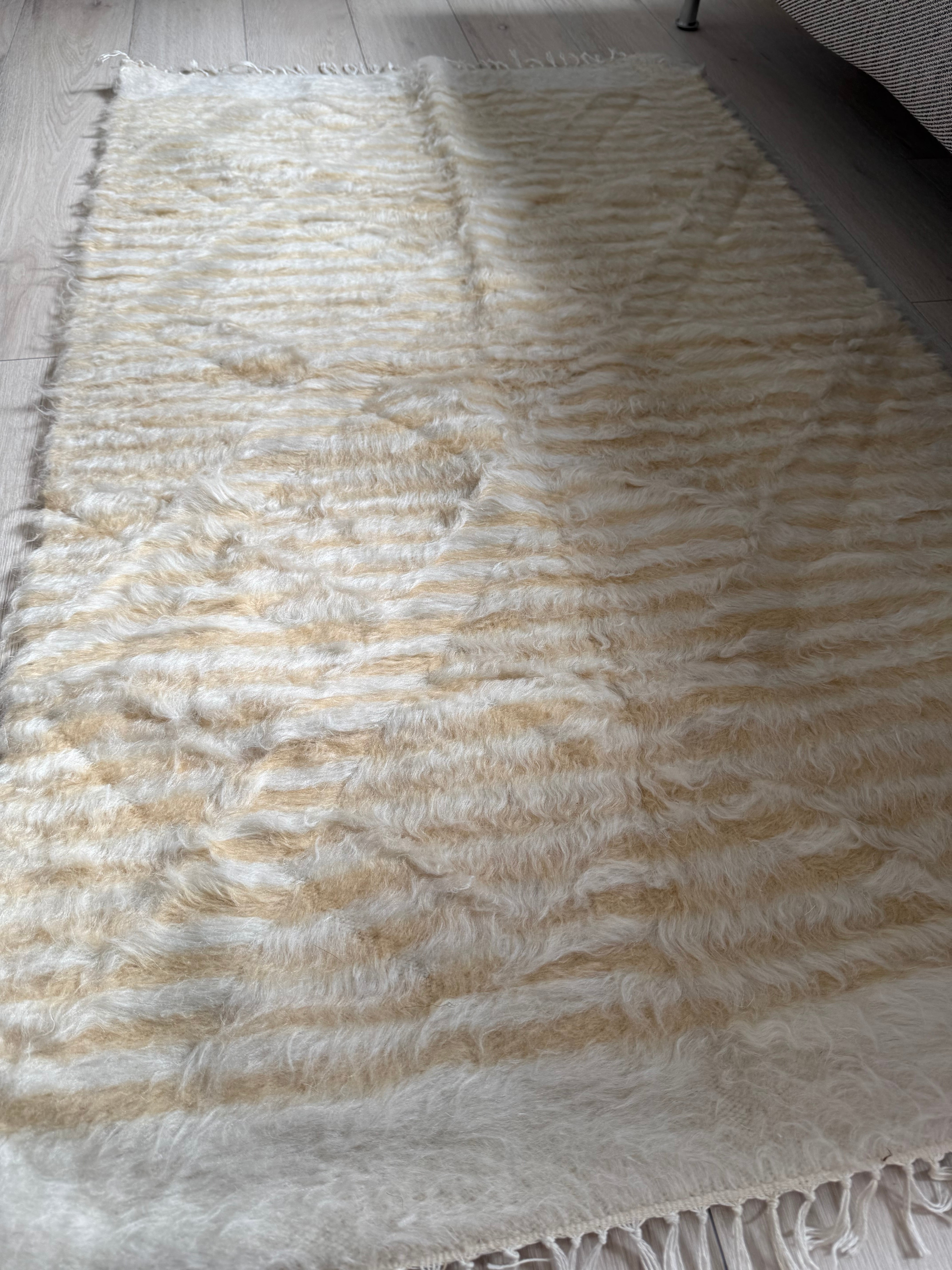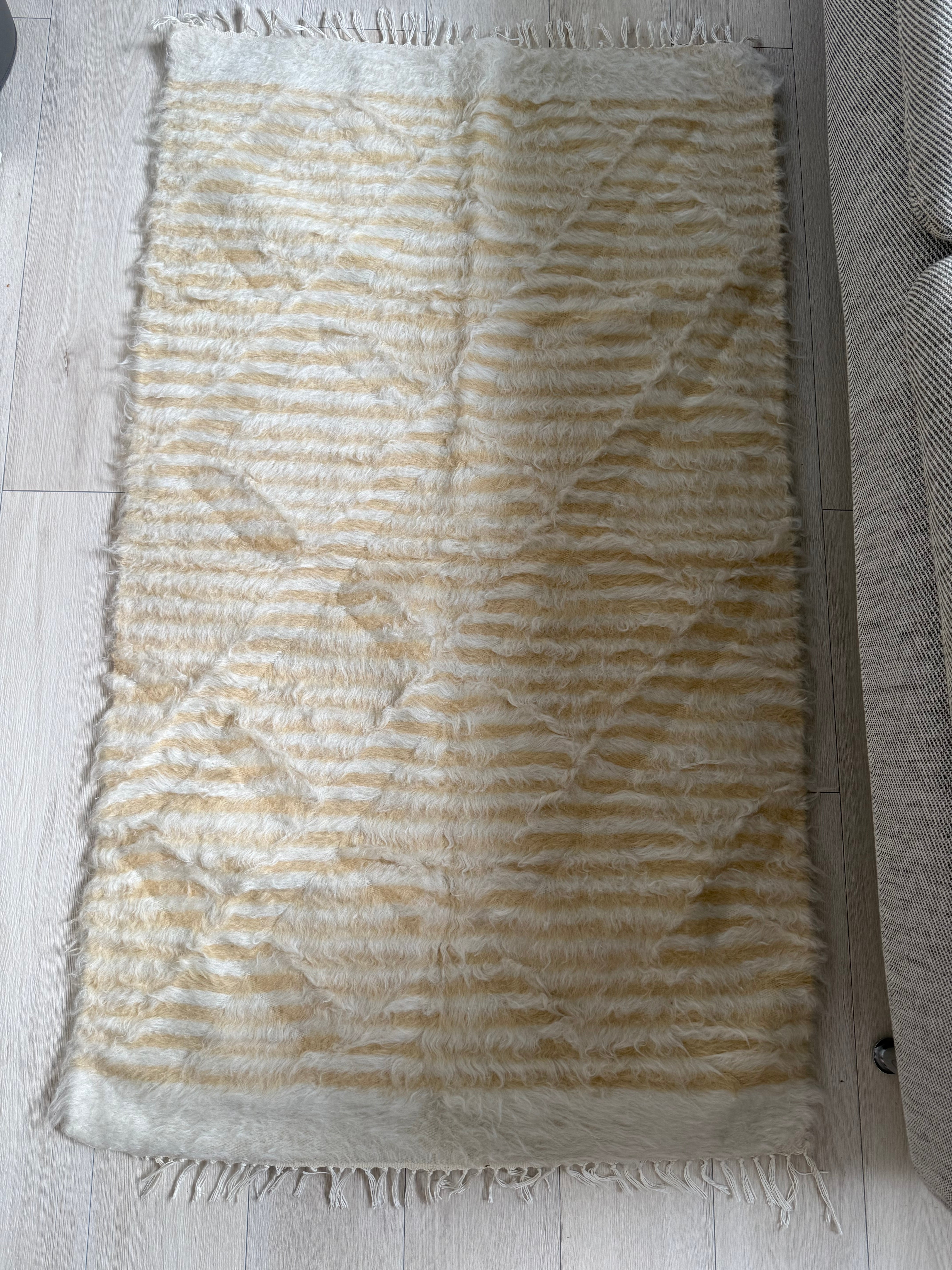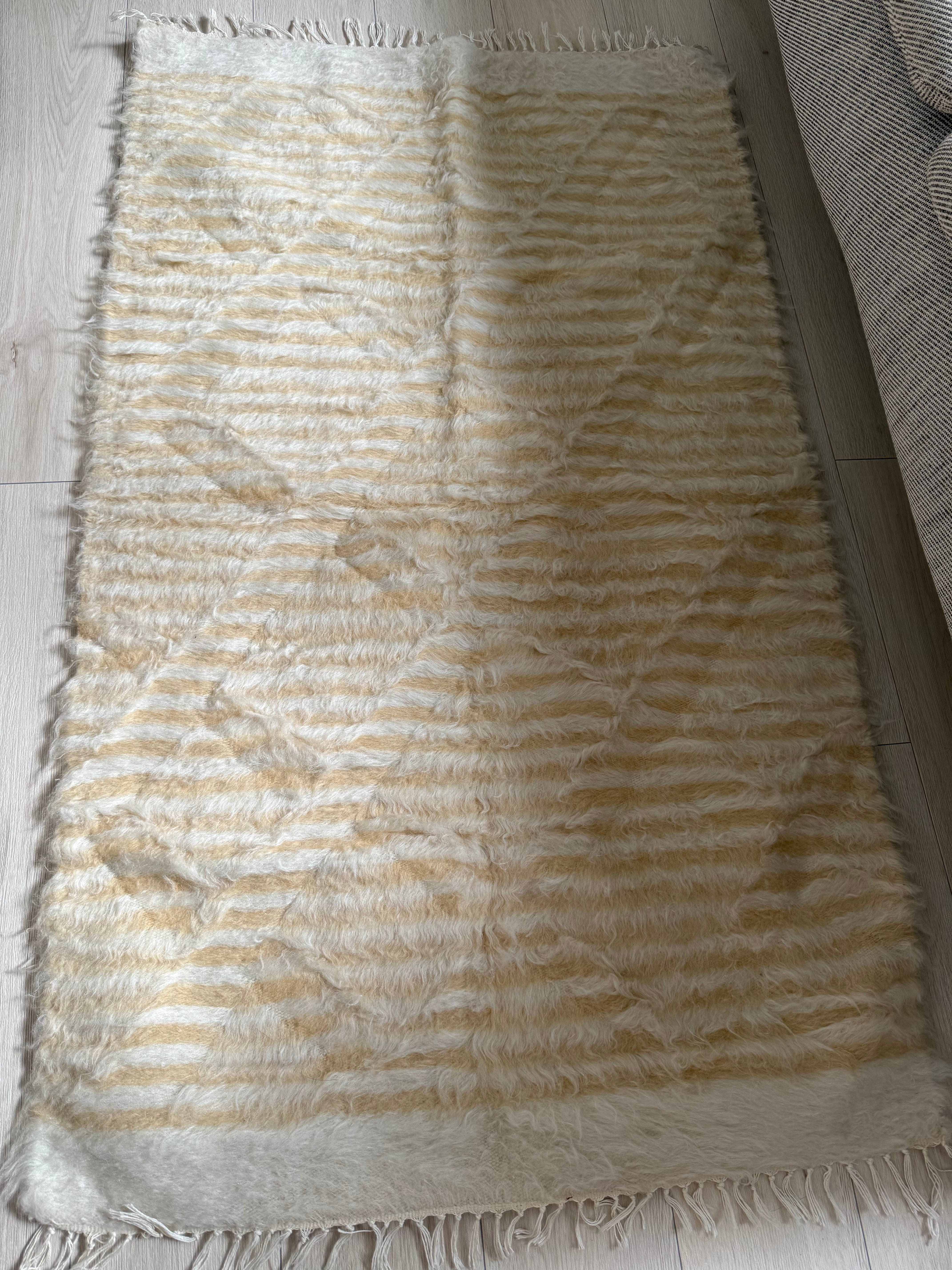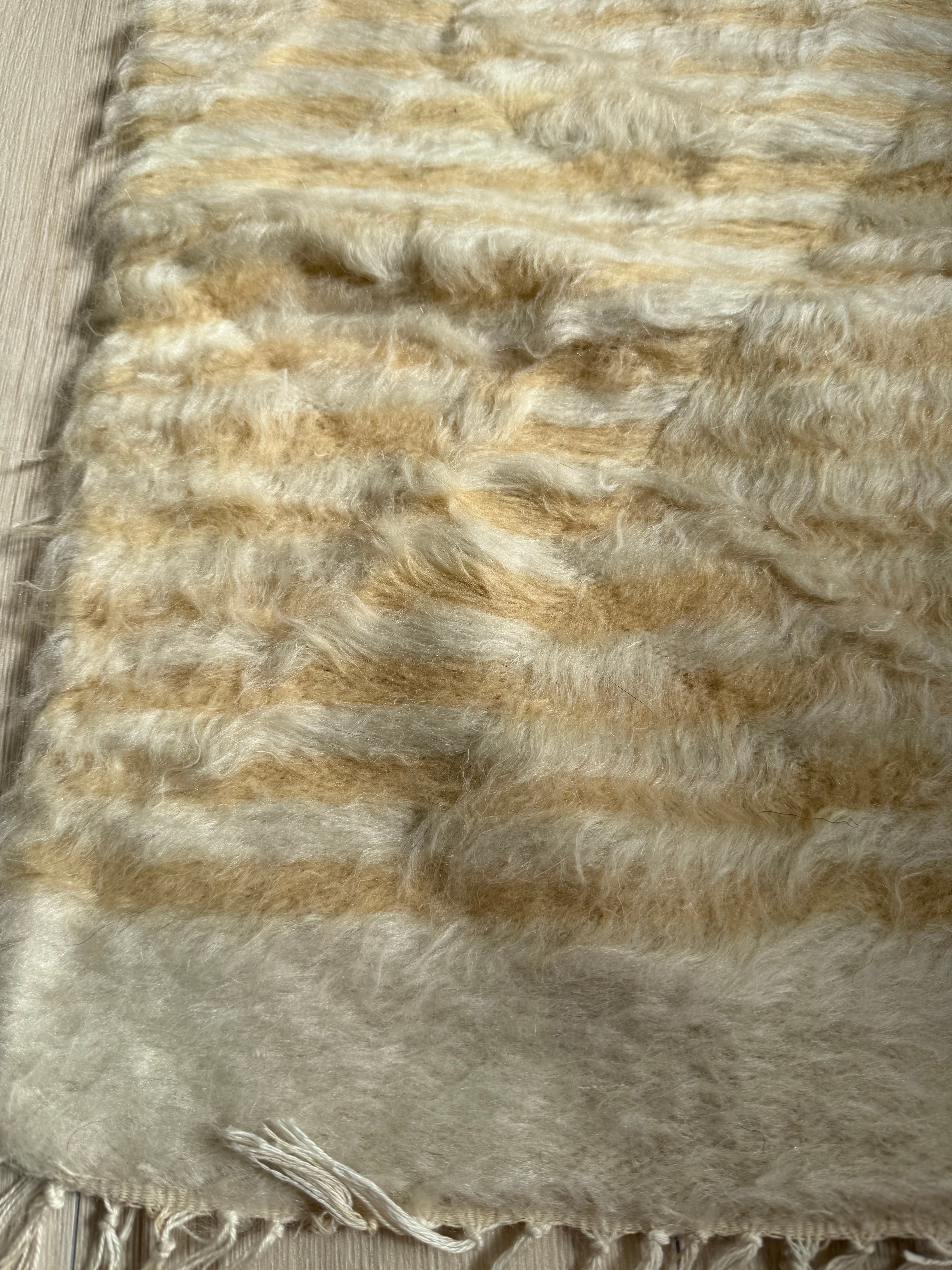 山羊によって、毛色や毛質は違い、特にキャメルやカフェオレブラウン、ぱっきりとした茶色までブラウン系の濃淡はいろいろ。毛質も繊細で細くふわふわとした巻毛のものから、太めでしっかりとしたものまで一頭ずつ違うので、1枚1枚どんな毛を使っているかでモヘアの個性が変わってきます。柄はモスクの壁に設置されている祈りの場、ミフラーブをデザインしているものが多いですが、無地やストライプのものもあります。