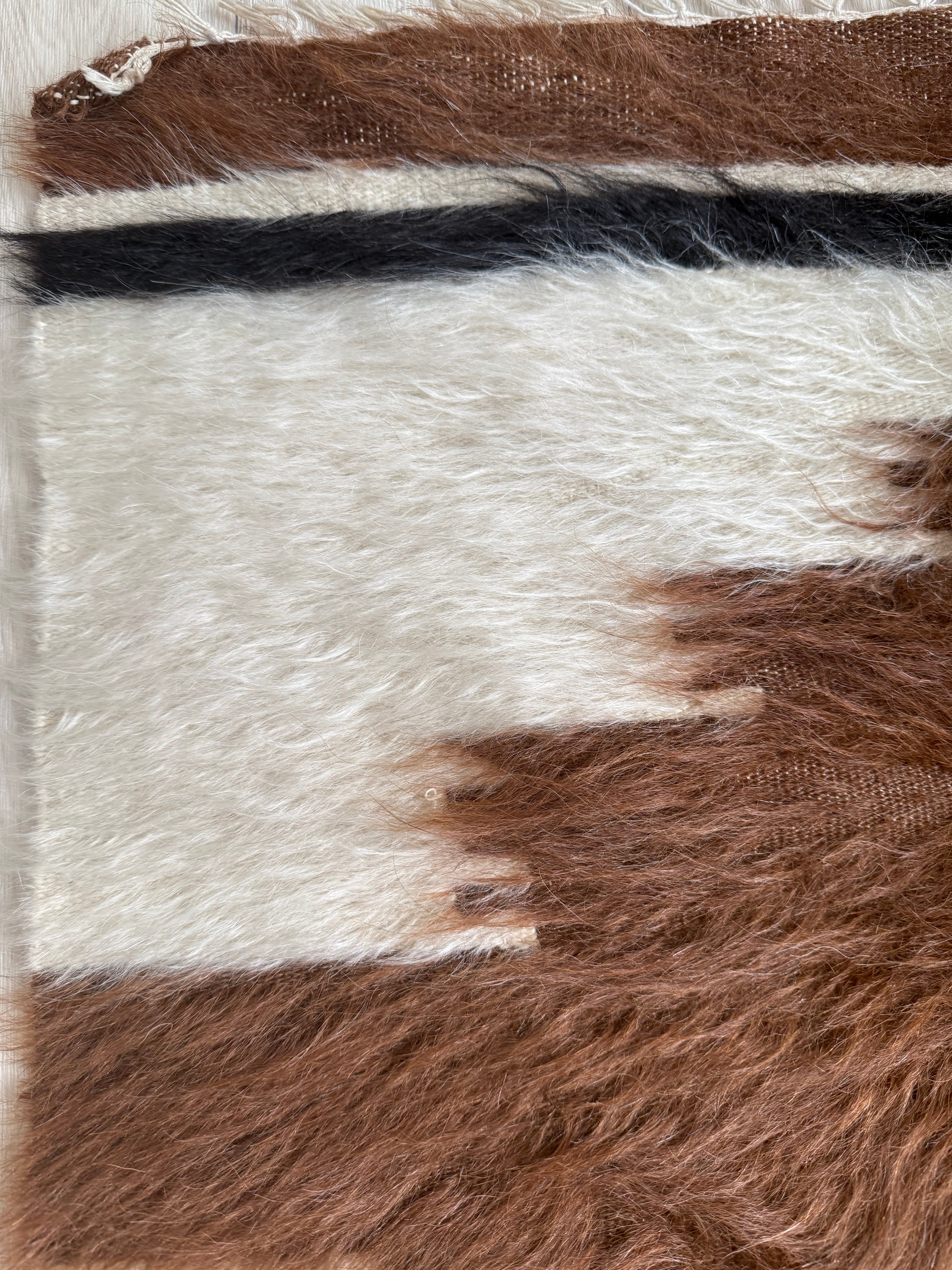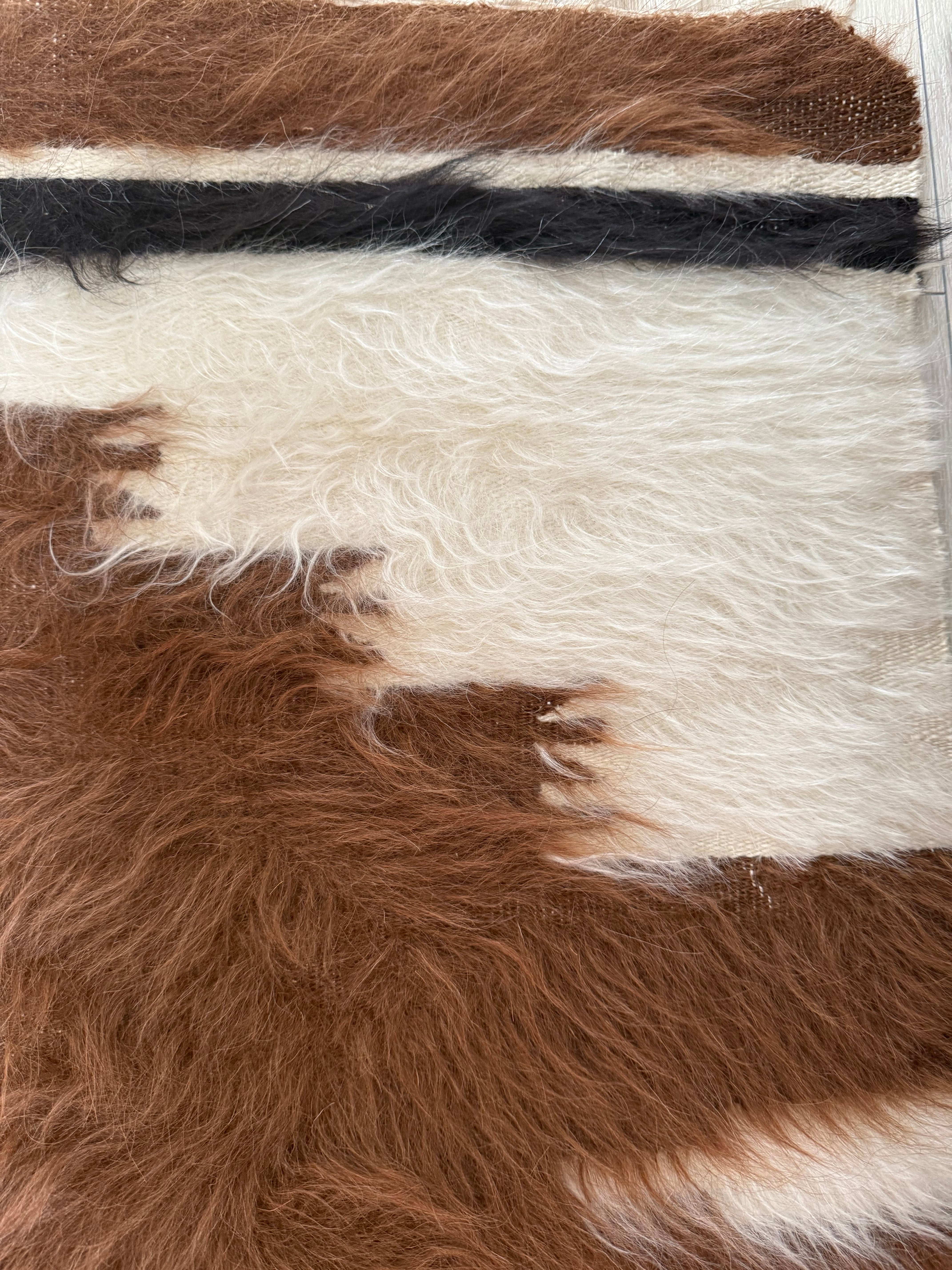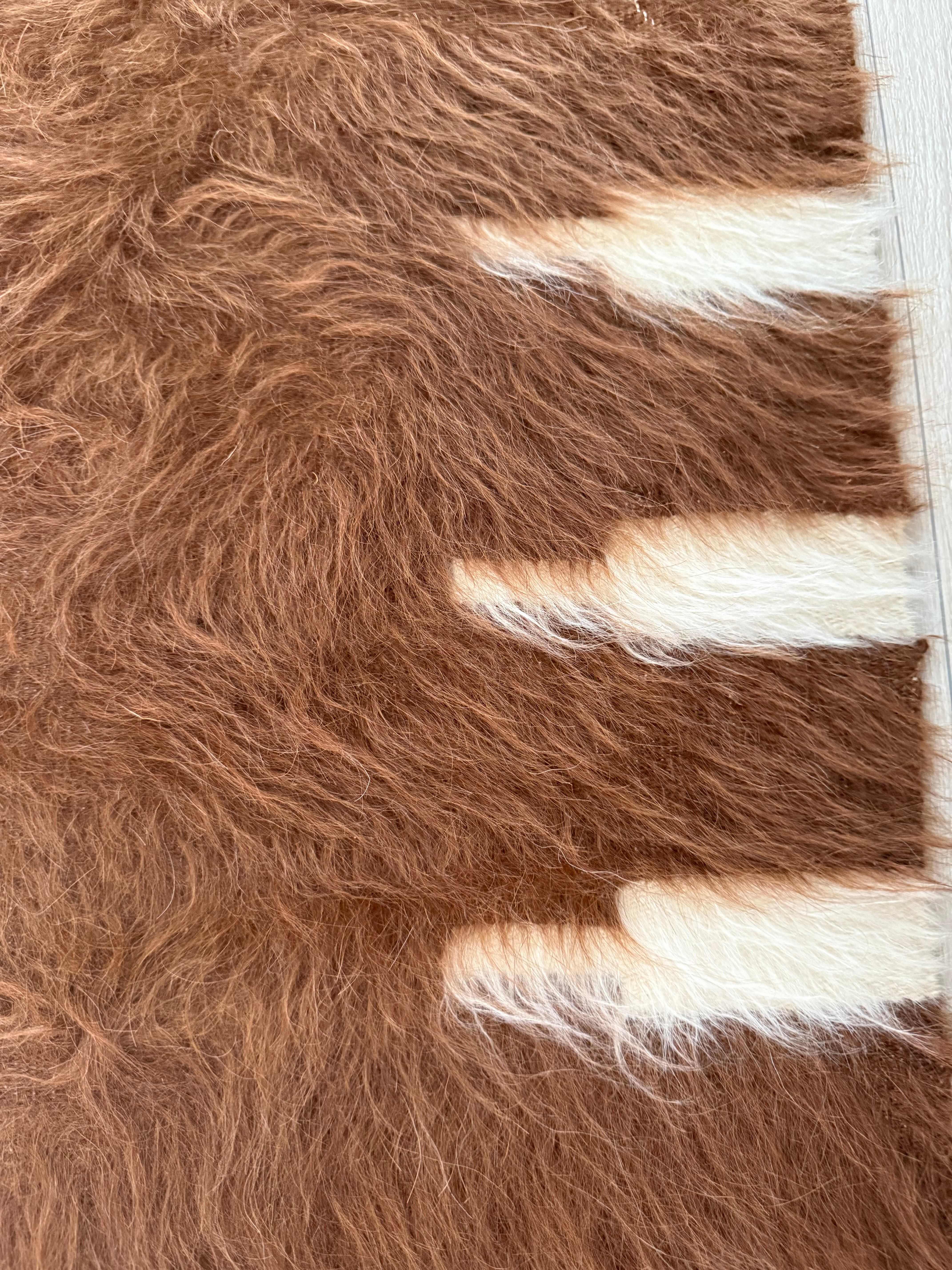 ふさふさのブラウンとホワイトに、ボトムには美しい4色が配された1枚。