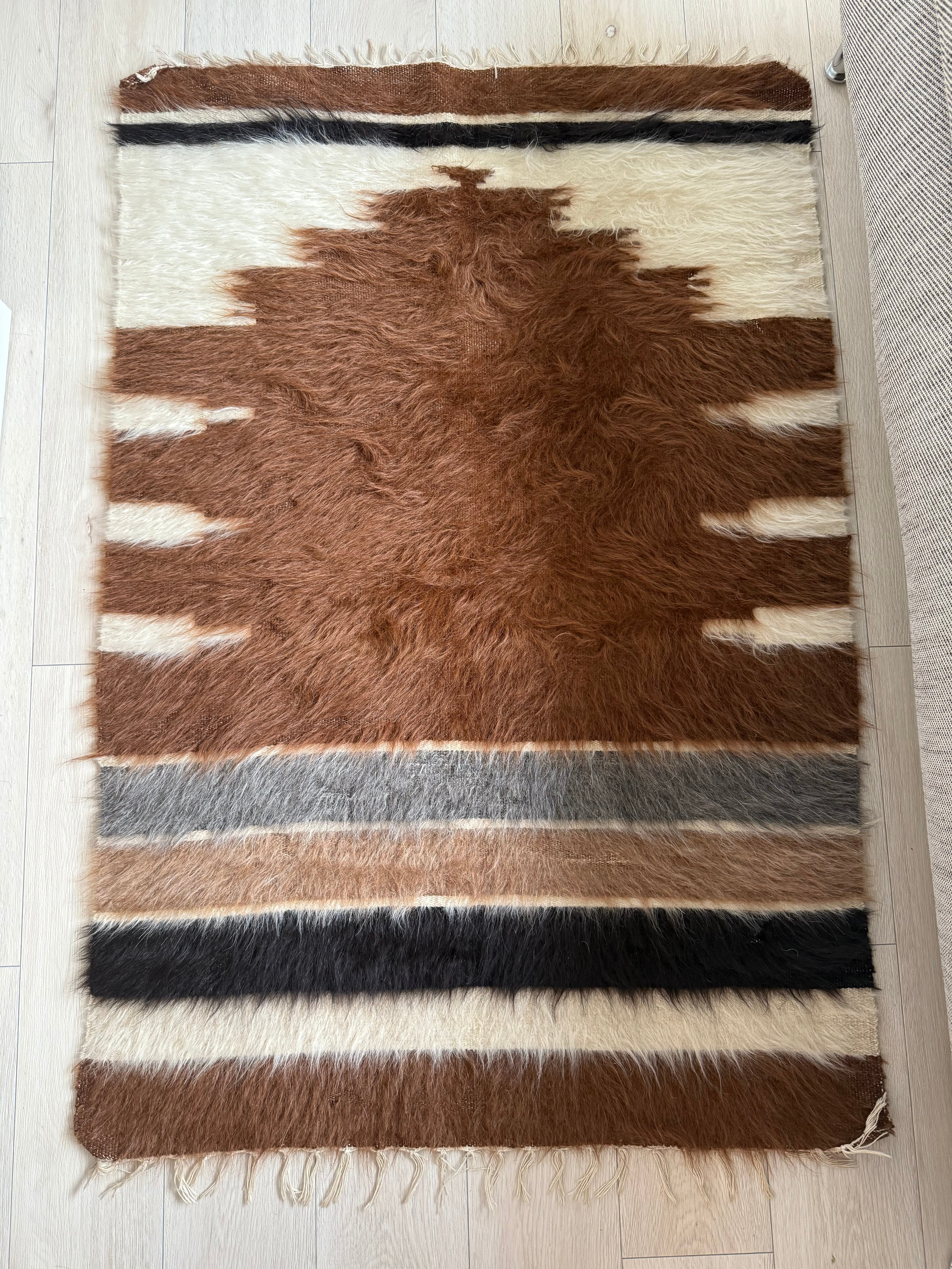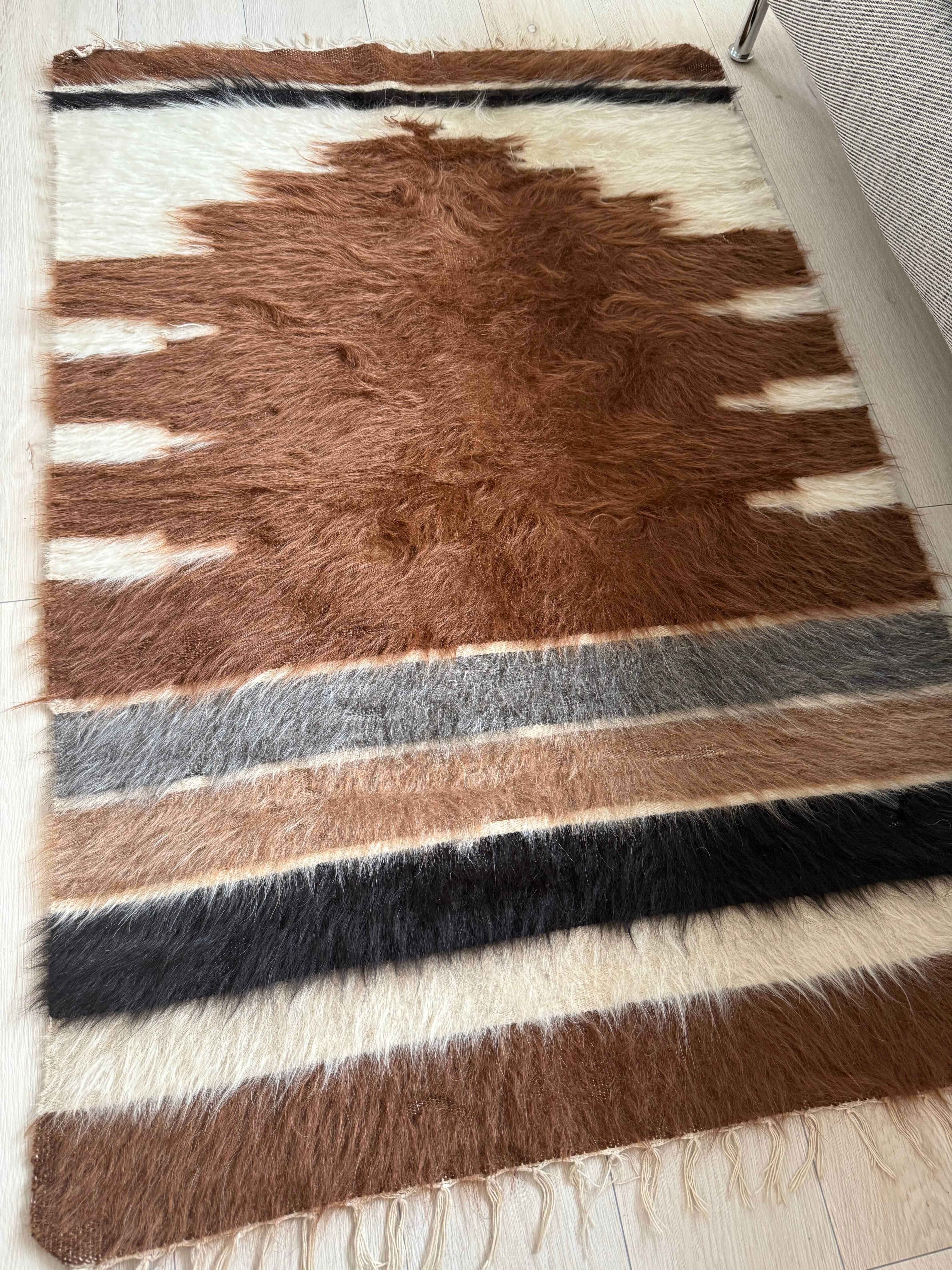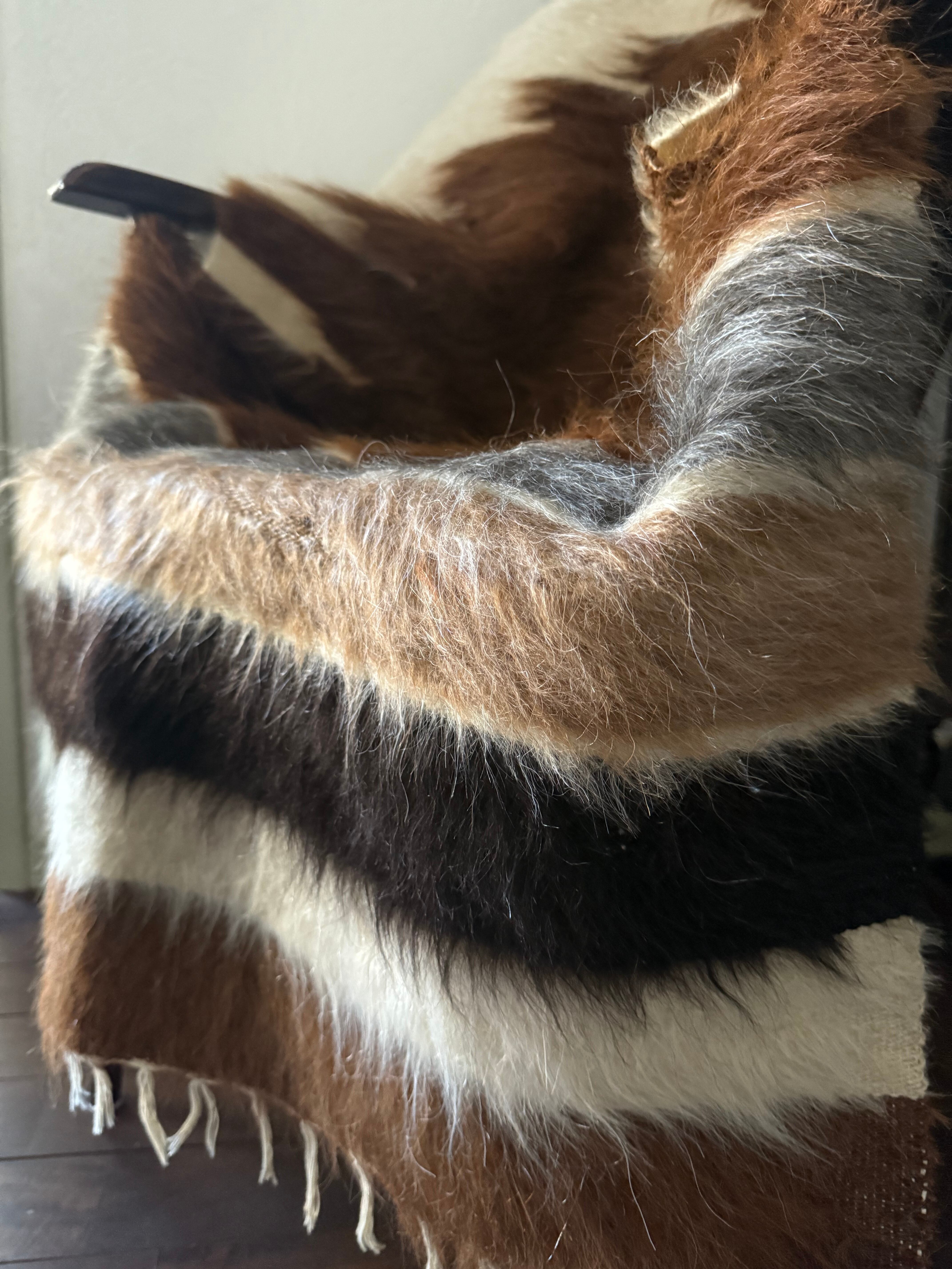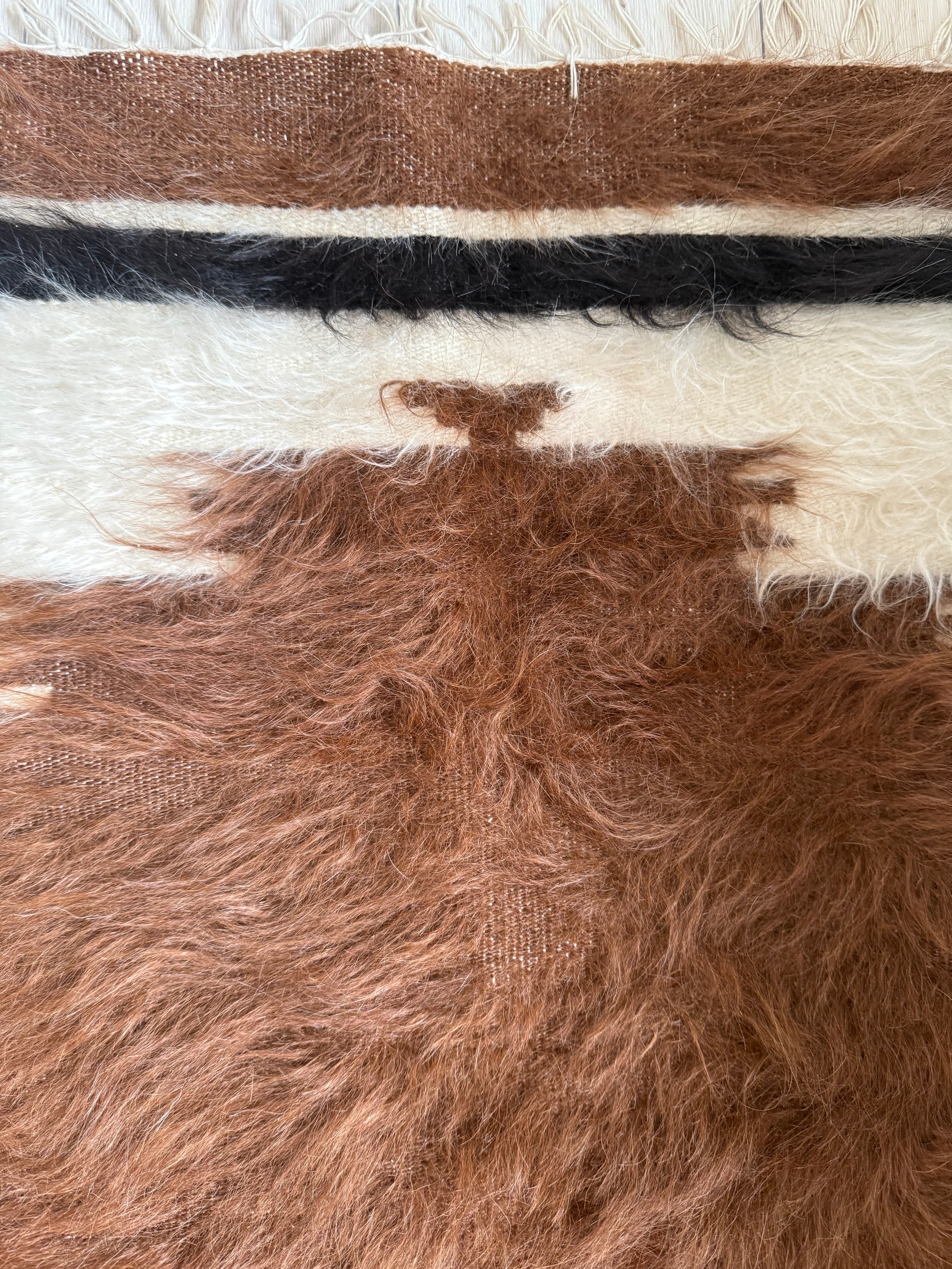 ふさふさのブラウンとホワイトに、ボトムには美しい4色が配された1枚。
