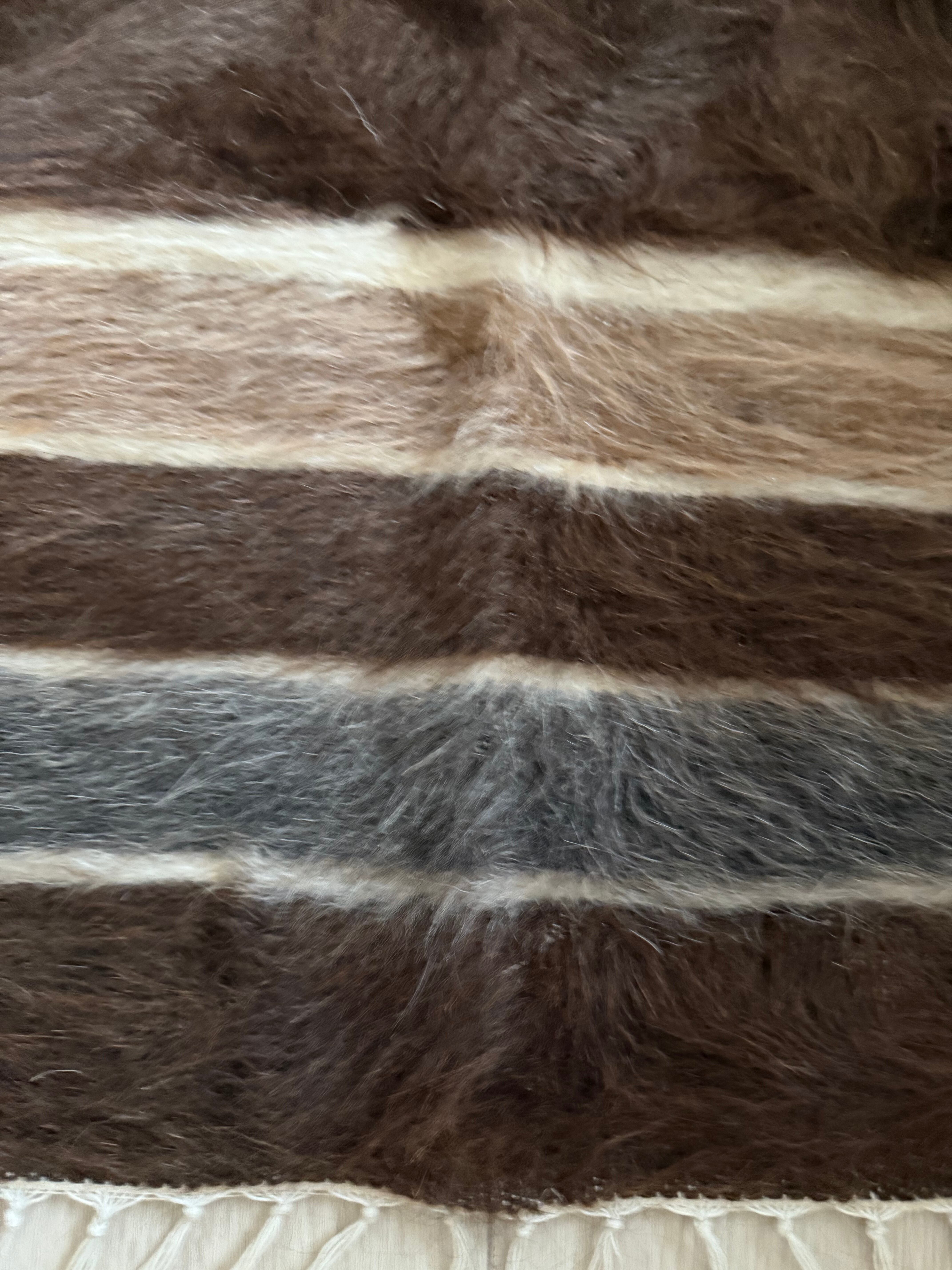 中央は非常に豊かな毛のダイヤ柄の織り地。ボトムは淡いベージュ、ダークブラウン、グレーのマルチストライプです。