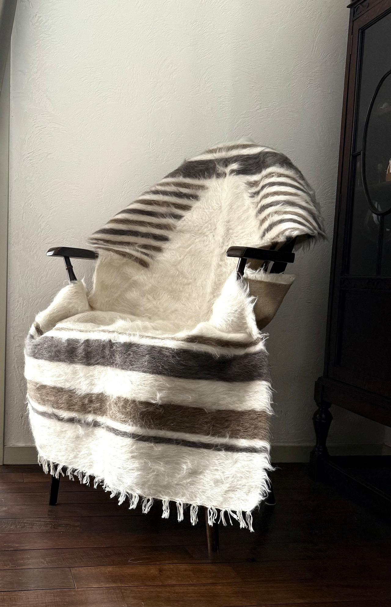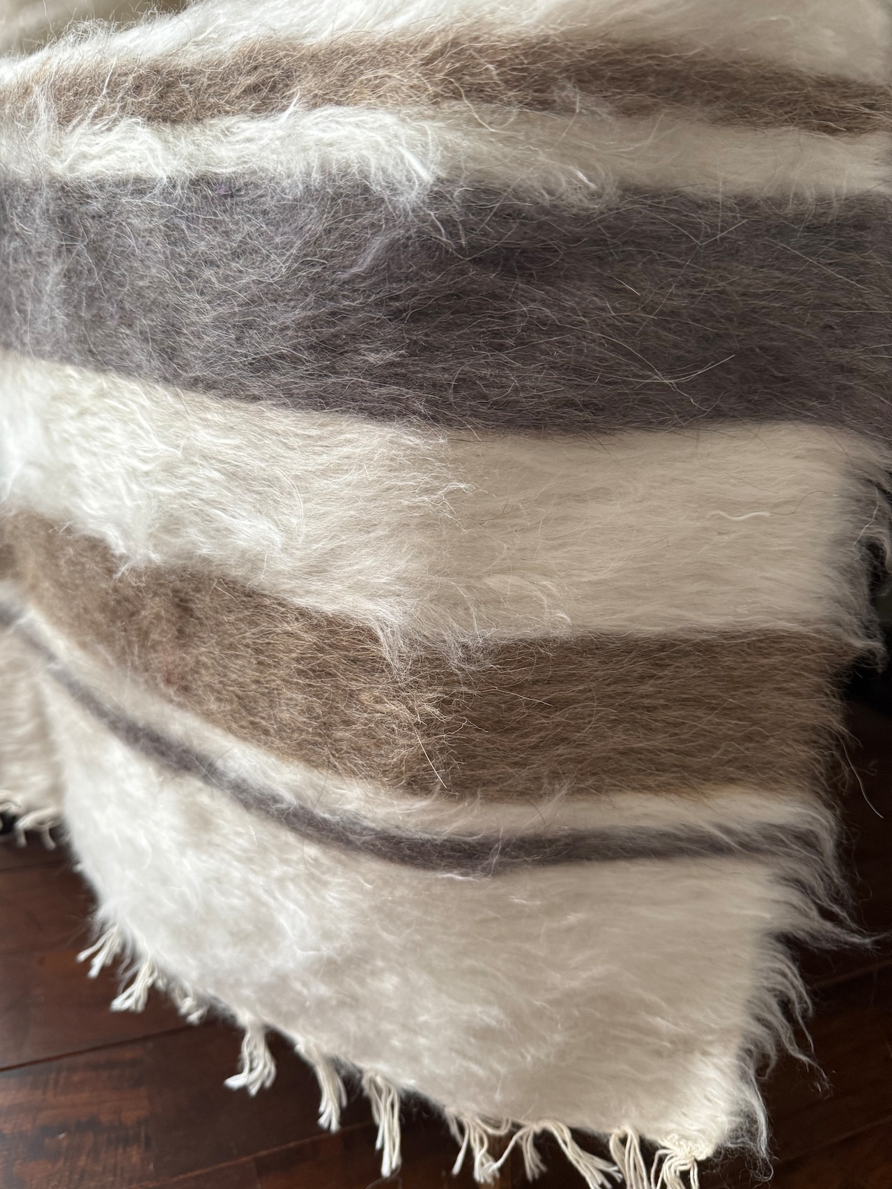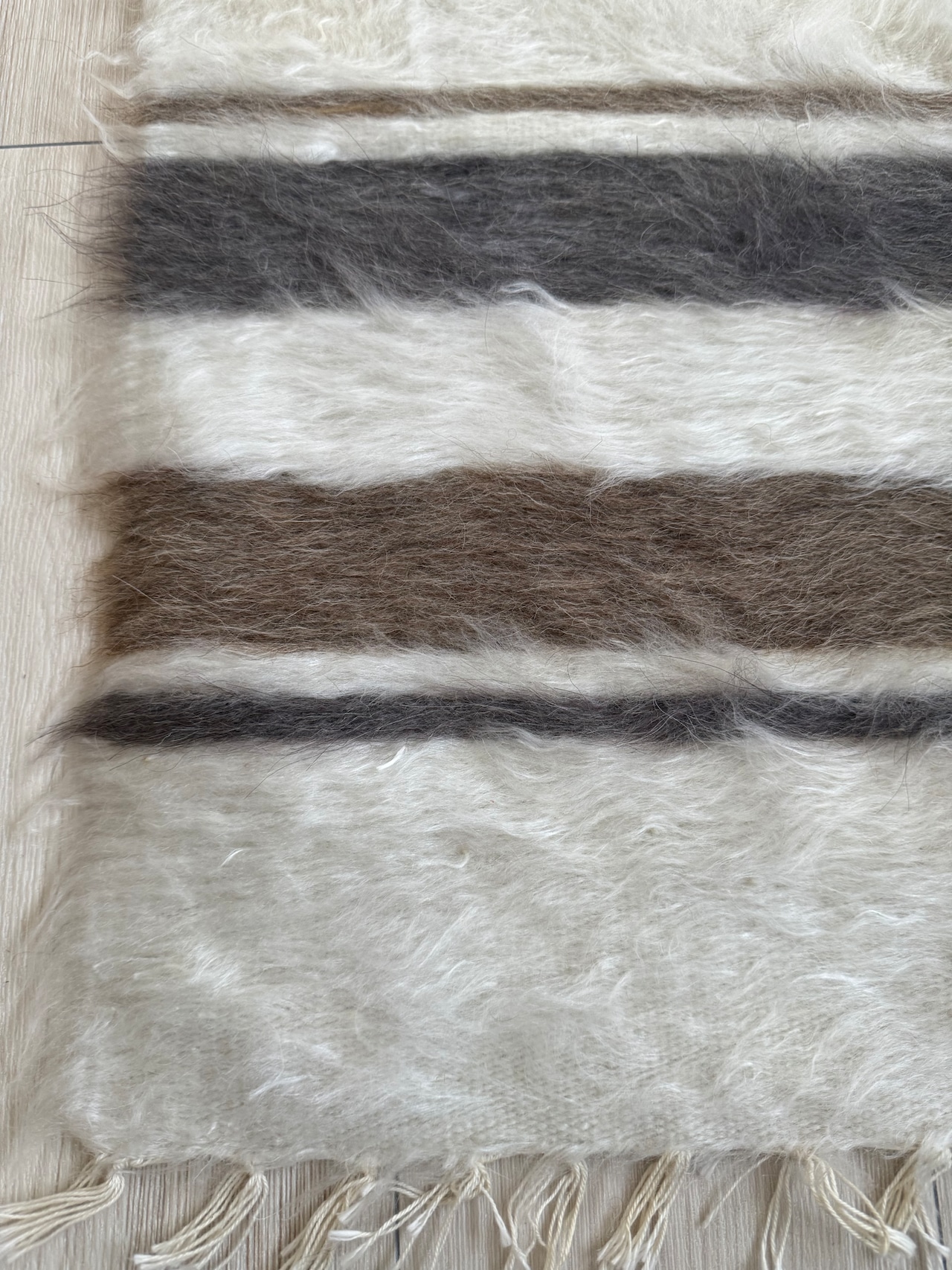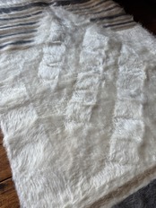 バッターニエは、アンゴラ山羊の毛で織られています。こちらはホワイト部分が特にとてもやわらかく、ちくちく感を感じませんでしたが、感覚には個人差がありますのでご了承ください。