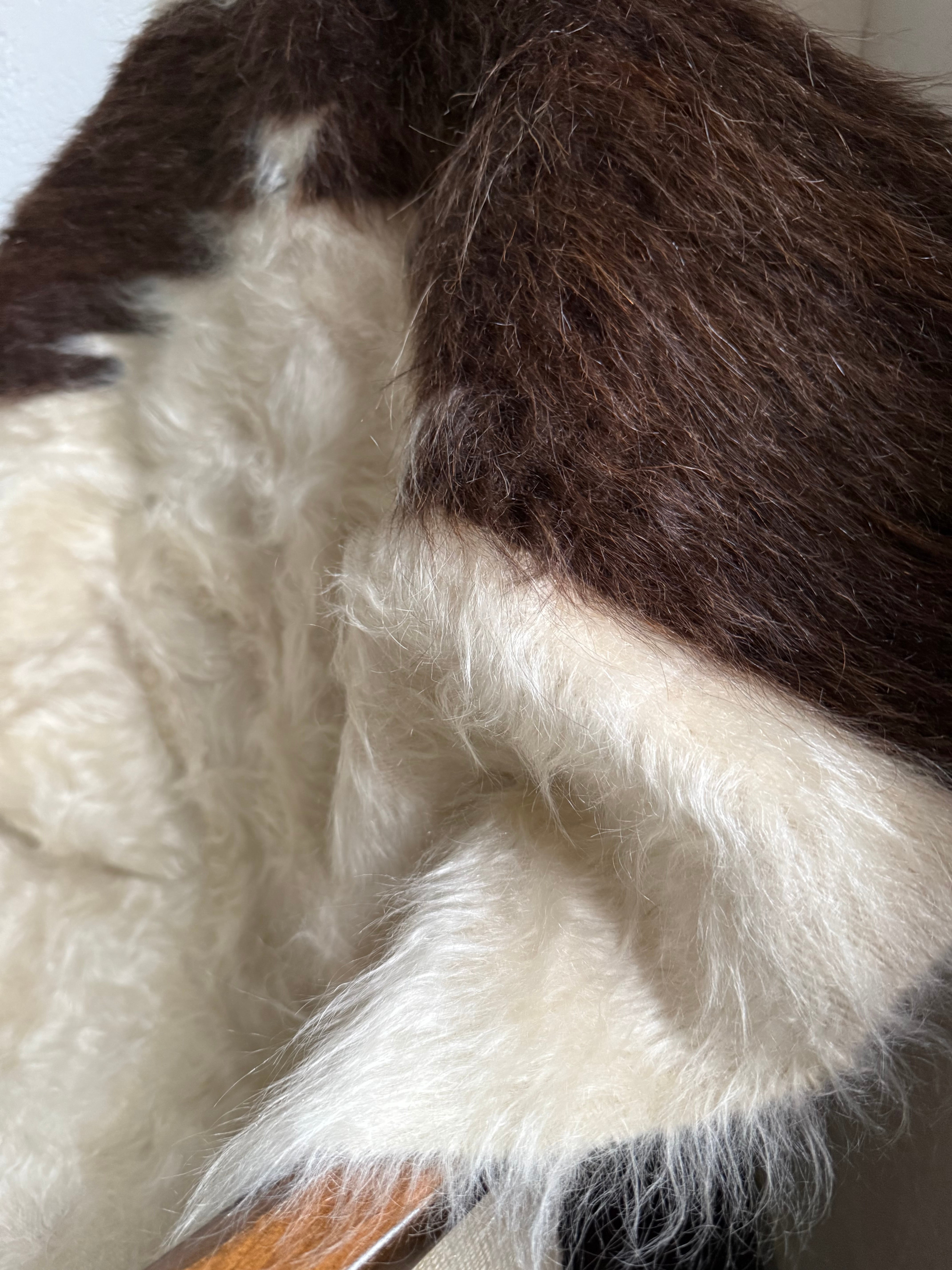 クリーム色の豊かなホワイトの毛をベースに、トップにはダークチョコレートのようなブラウン、ボトムには凛としたブラックと、ダークグレーの2色が組み合わされた1枚。通常の120センチより7センチ長めです。