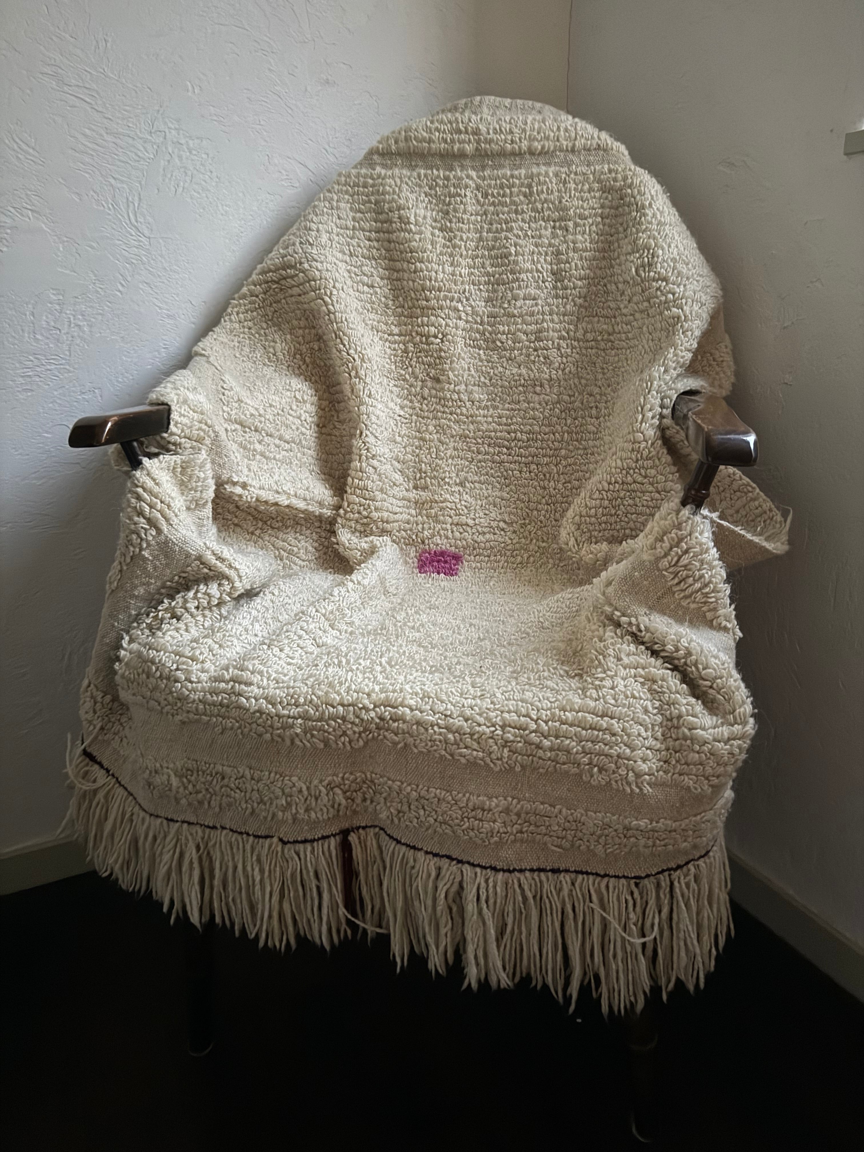 織り方はざっくりとしていて、いかにも家庭で織られてきた手織りの織り物。紡いだ長い羊の毛を織り込んでいます。