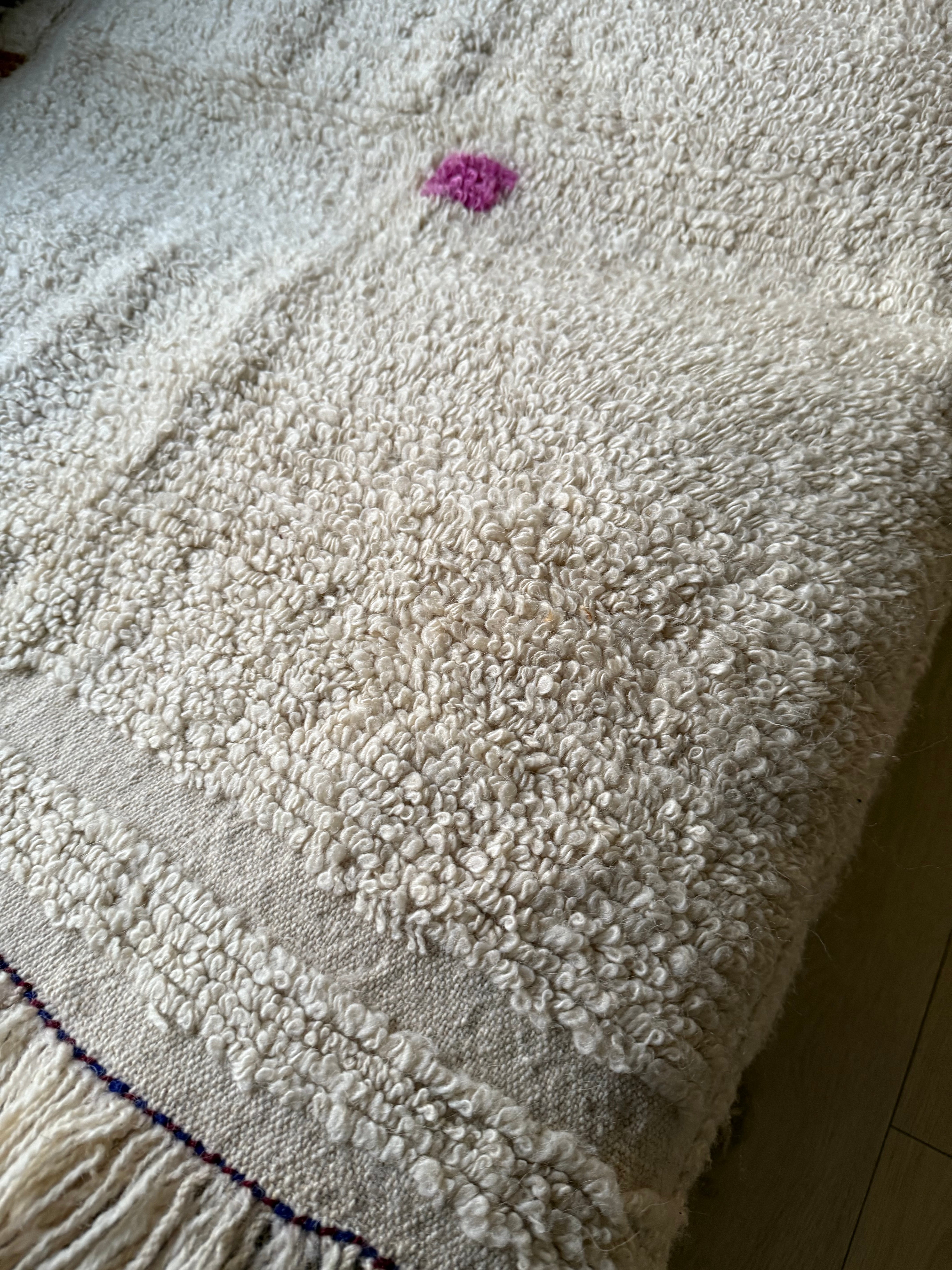 中央に四角いピンクの彩り、フリンジを下にしておいて左端には明るいブラウンとブルーの彩りが添えられています。