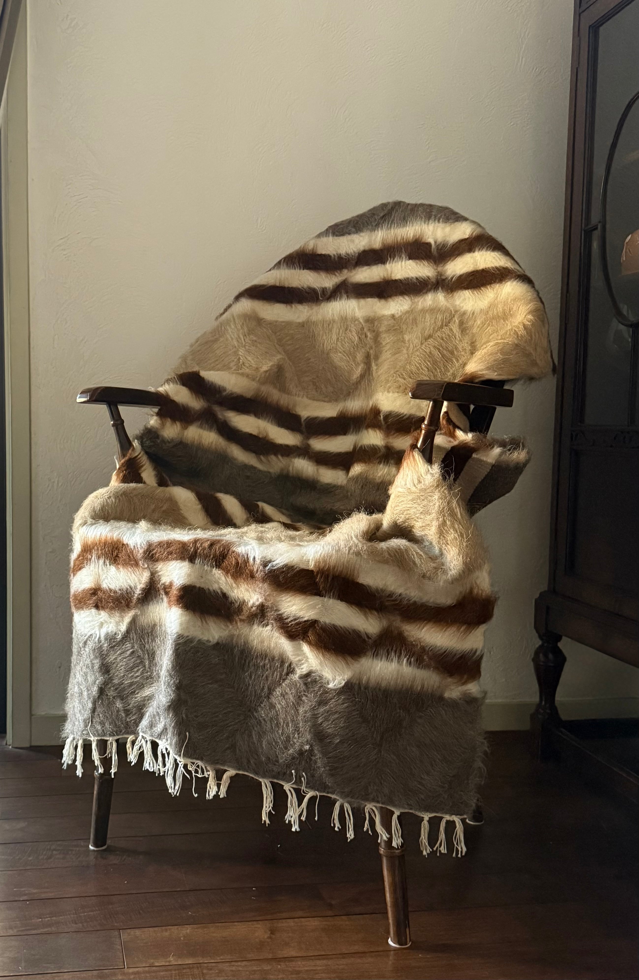 バッターニエは、アンゴラ山羊の毛で織られています。羊やウサギの毛などより、ハリがあり、艶があります。薄着や肌着で座るとほんの少しちくちく感を感じる方がいらっしゃるかもしれません。(また、木の織り機で織られているため、木の繊維が入っていることがよくあります)