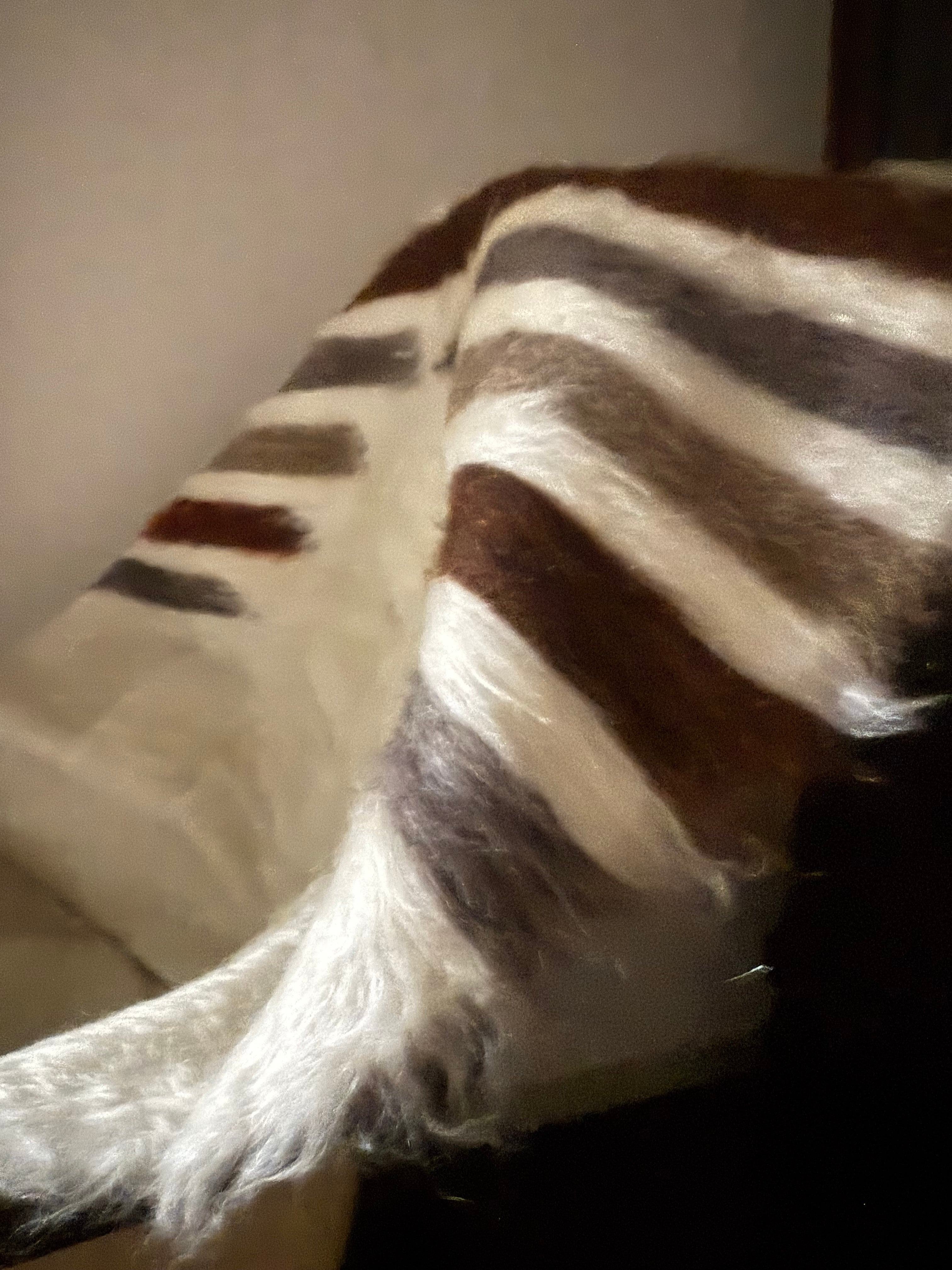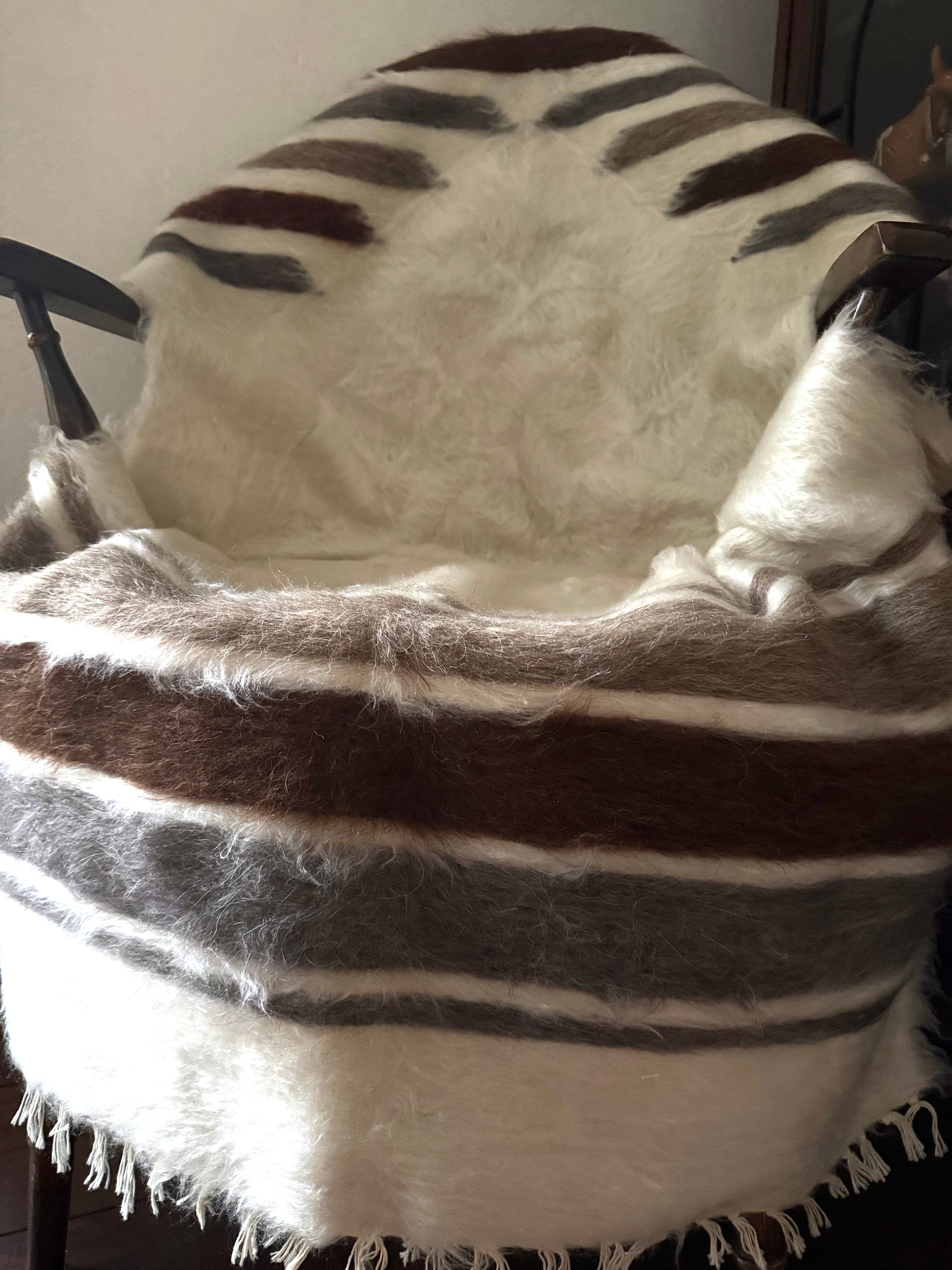 バッターニエはアンゴラ山羊の毛を使って織られています。現代の私たちが慣れている羊毛やナイロン、コットンなどと違い、毛自体に艶があり、ハリがあります。薄着や肌着で座るとほんの少しちくちく感を感じる方がいらっしゃるかもしれません。(また、木の織り機で織られているため、木の繊維が入っていることがよくあります)
