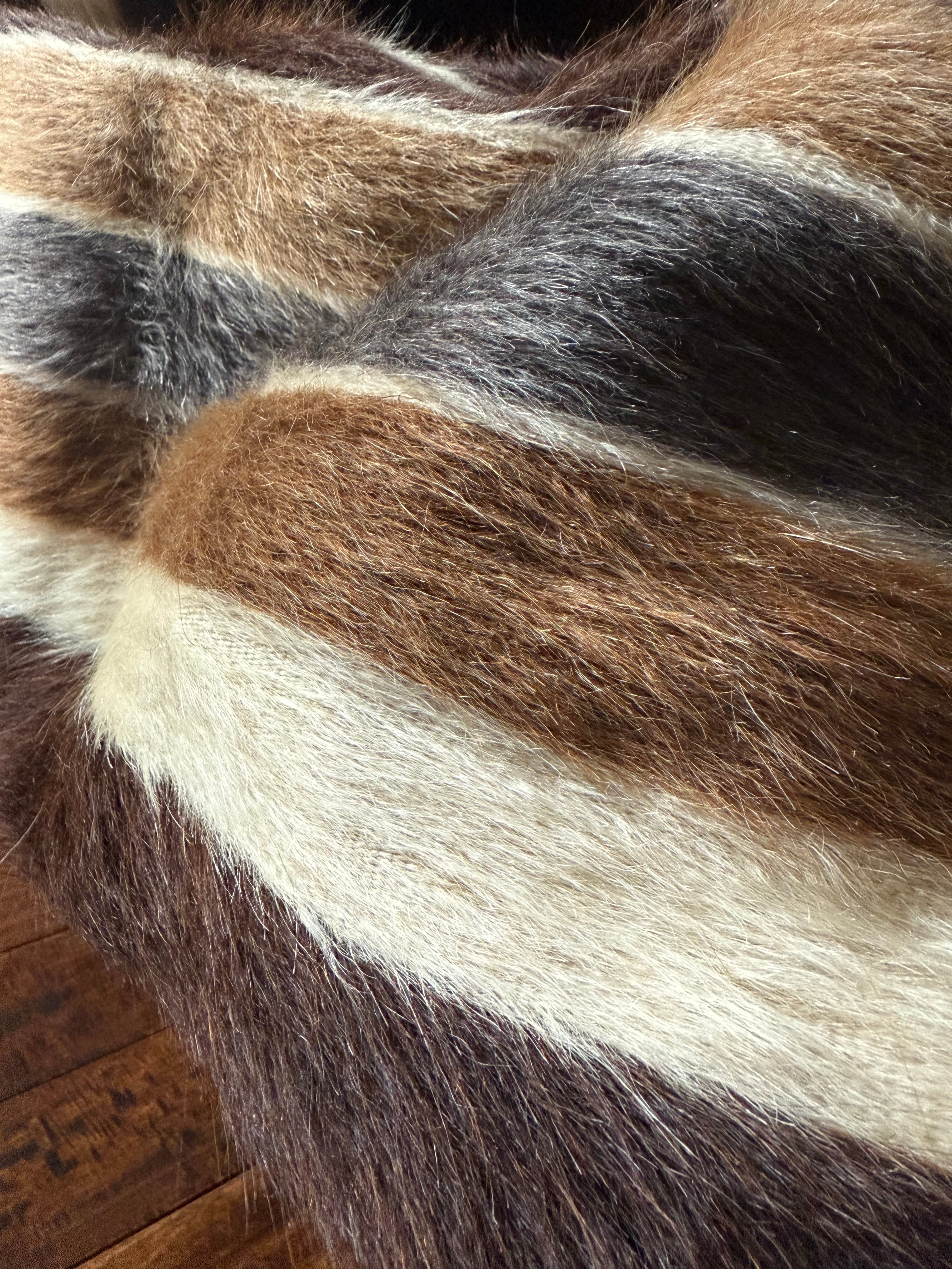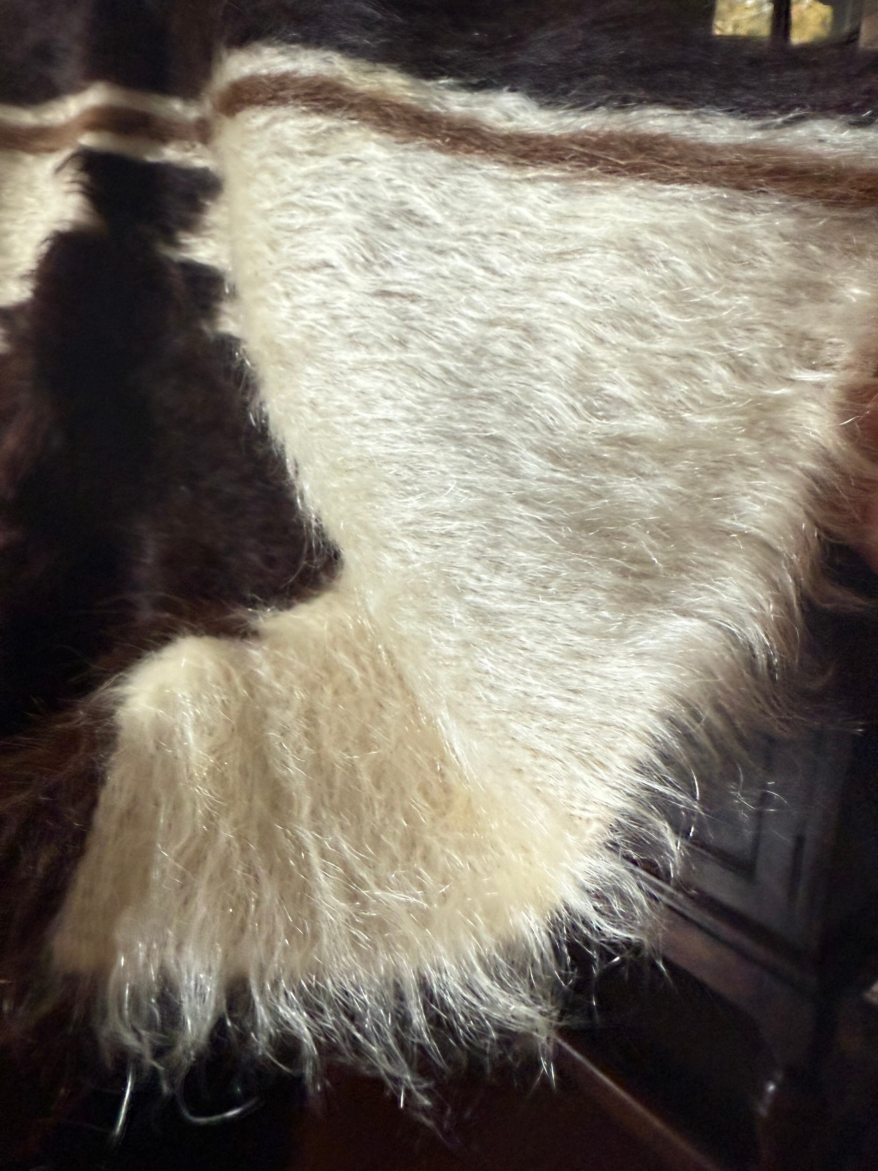 ✴︎こちらは艶のある非常に美しい1枚ですが、少し硬めの毛です。厚手のスウェットやジーンズなどでしたら上に座ってもあまり気にならないと個人的には思いますが、感覚は非常に個人差がありますので、ご了承の上、お買い求めください。