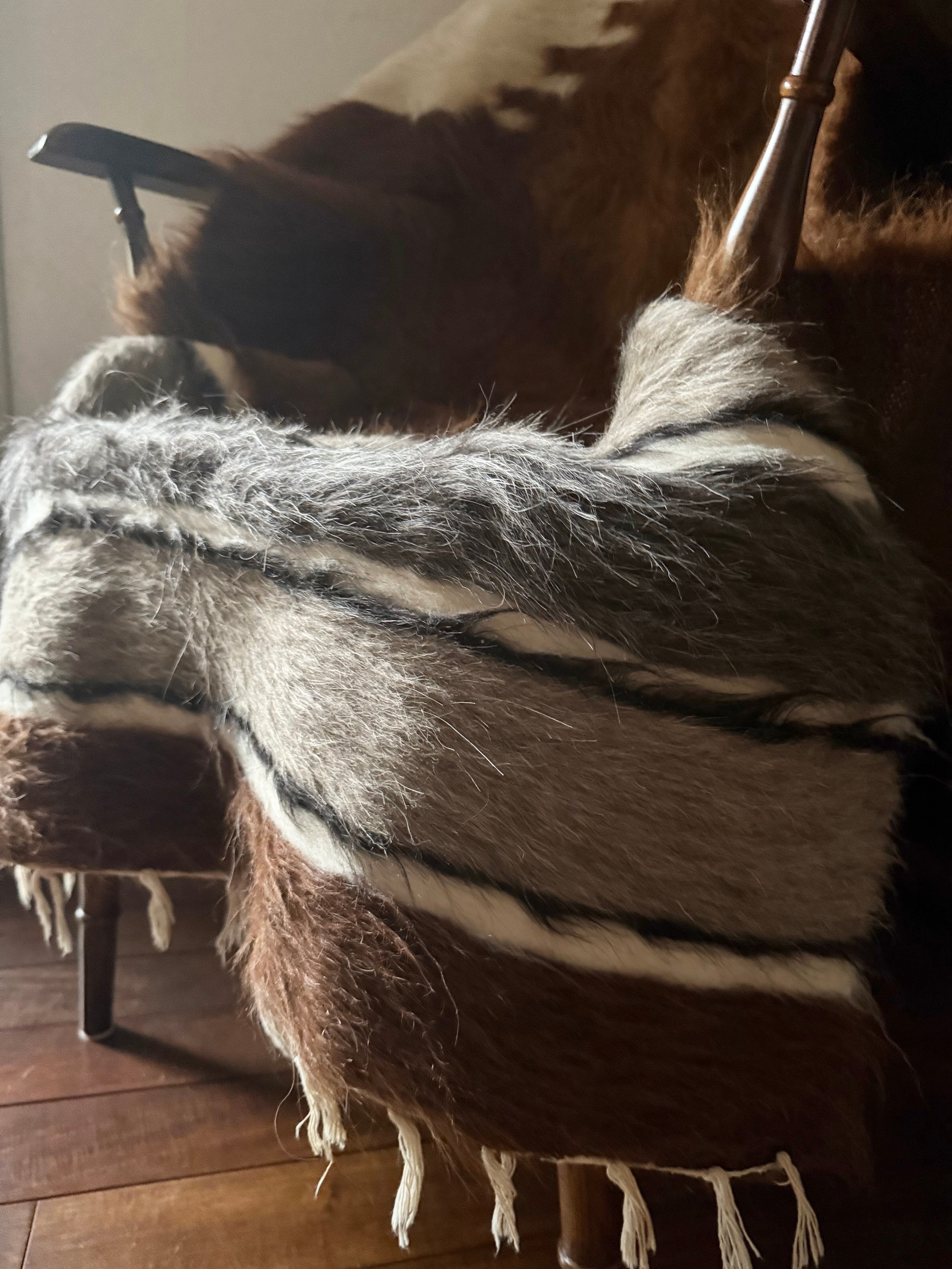 山羊の毛そのままの色を生かし、染めずに織られているバッターニエは、クリーム、黒、茶色、キャメル、グレーがメインの色合いです。
