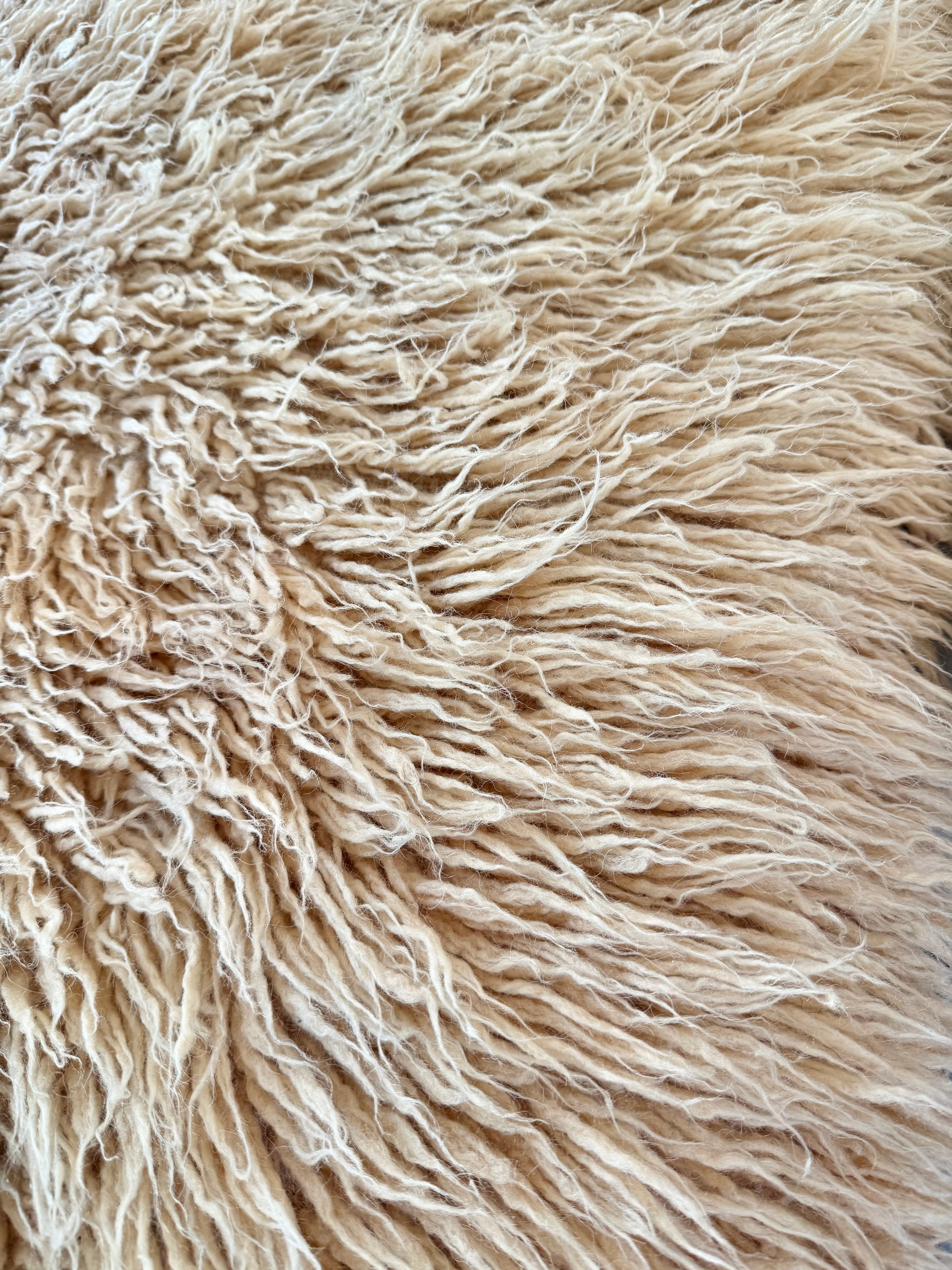 山岳地帯で暮らす遊牧民たちが自らの暮らしのために織ってきたもので、寒さを凌ぐためにこのように毛足が長い織物を作るようになったようです。