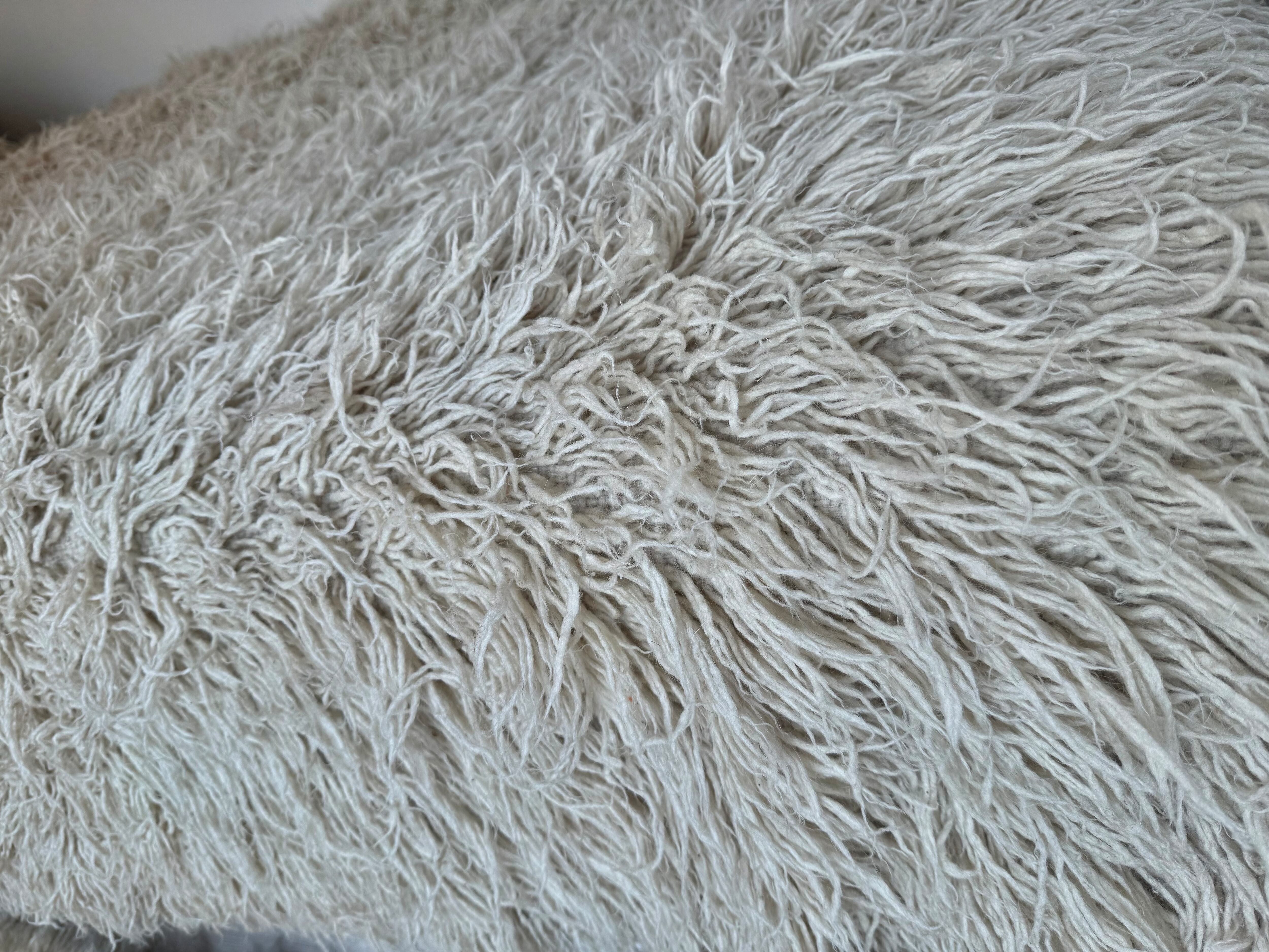 織り方はざっくりとしていて、いかにも家庭で織られてきた手織りの織り物。紡いだ長い羊の毛を織り込んでいます。