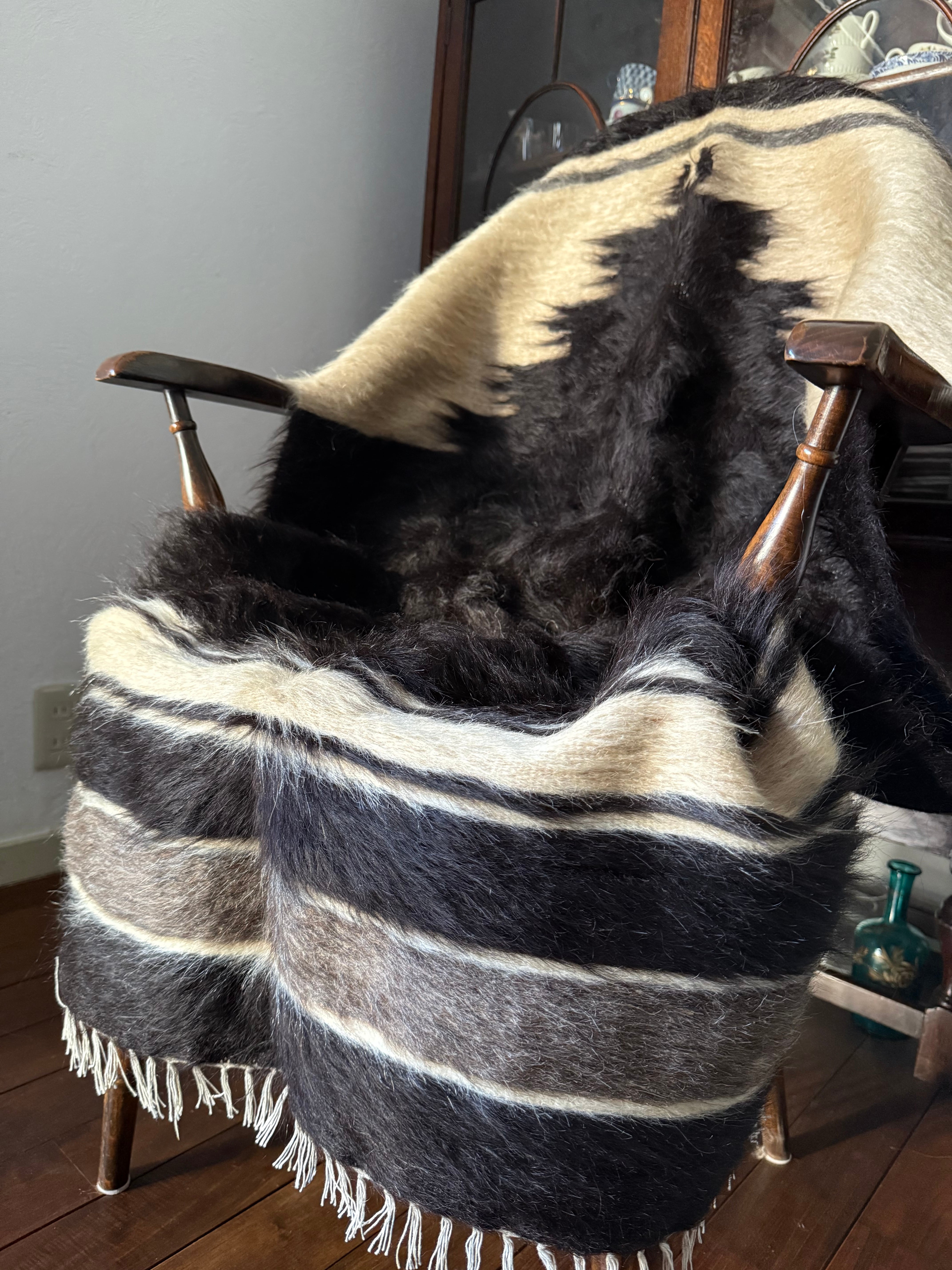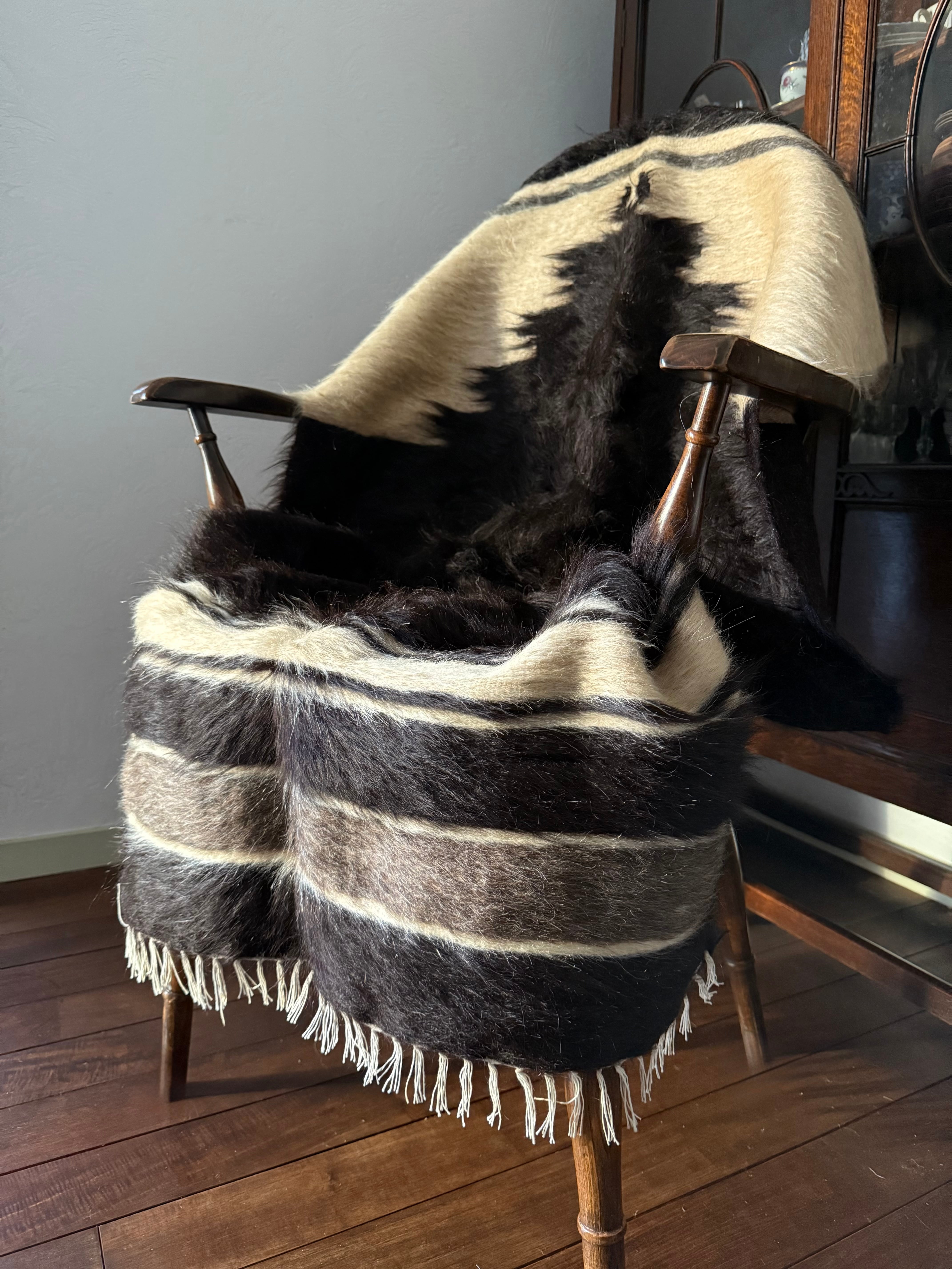 山羊の毛そのままの色を生かし、染めずに織られているバッターニエは、クリーム、黒、茶色、キャメル、グレーがメインの色合いです。
