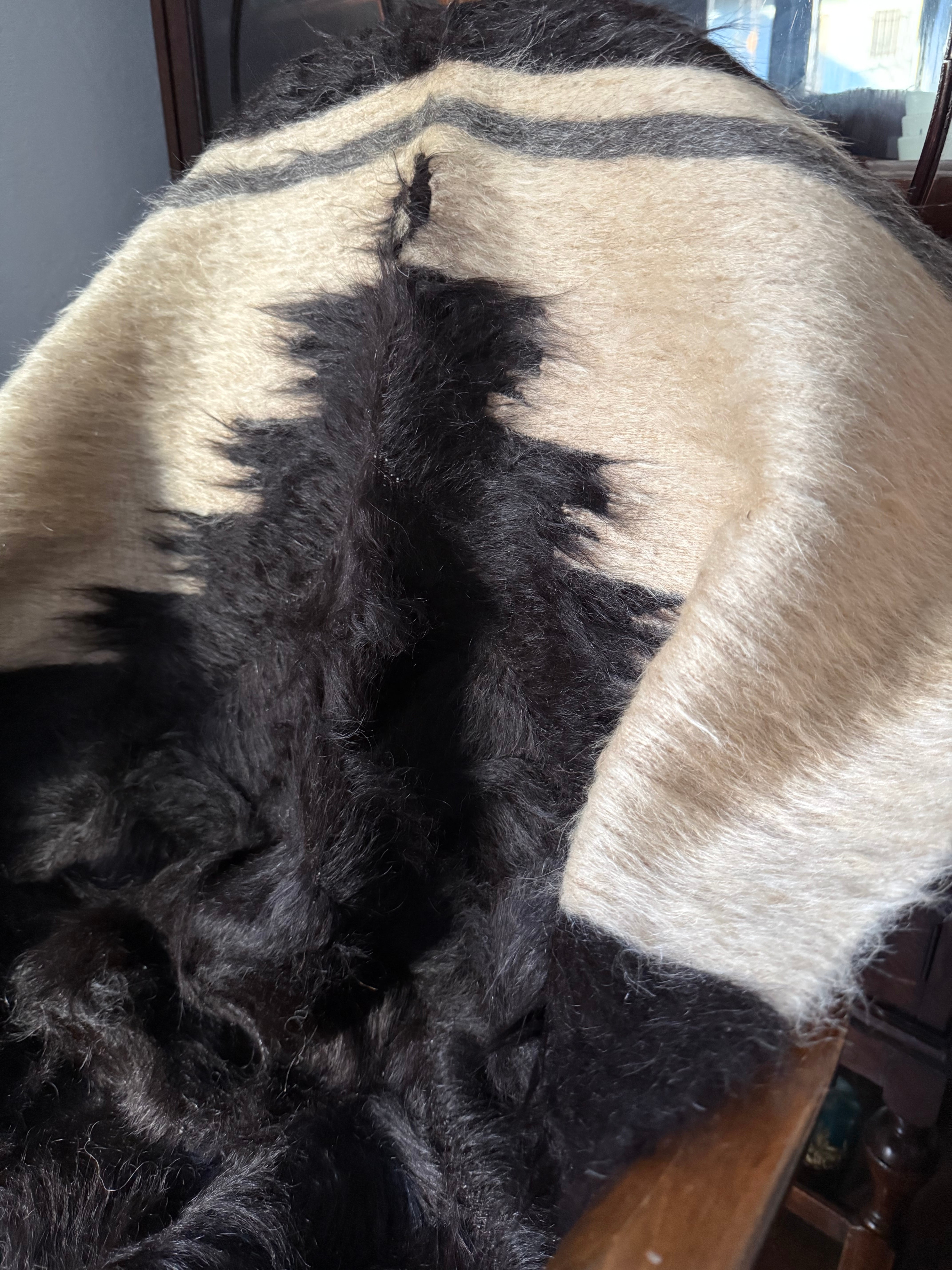 つやつや真っ黒のヴィンテージバッターニエ。こちらは、トップの部分はストライプなしのエクリュの毛だけで織られています。