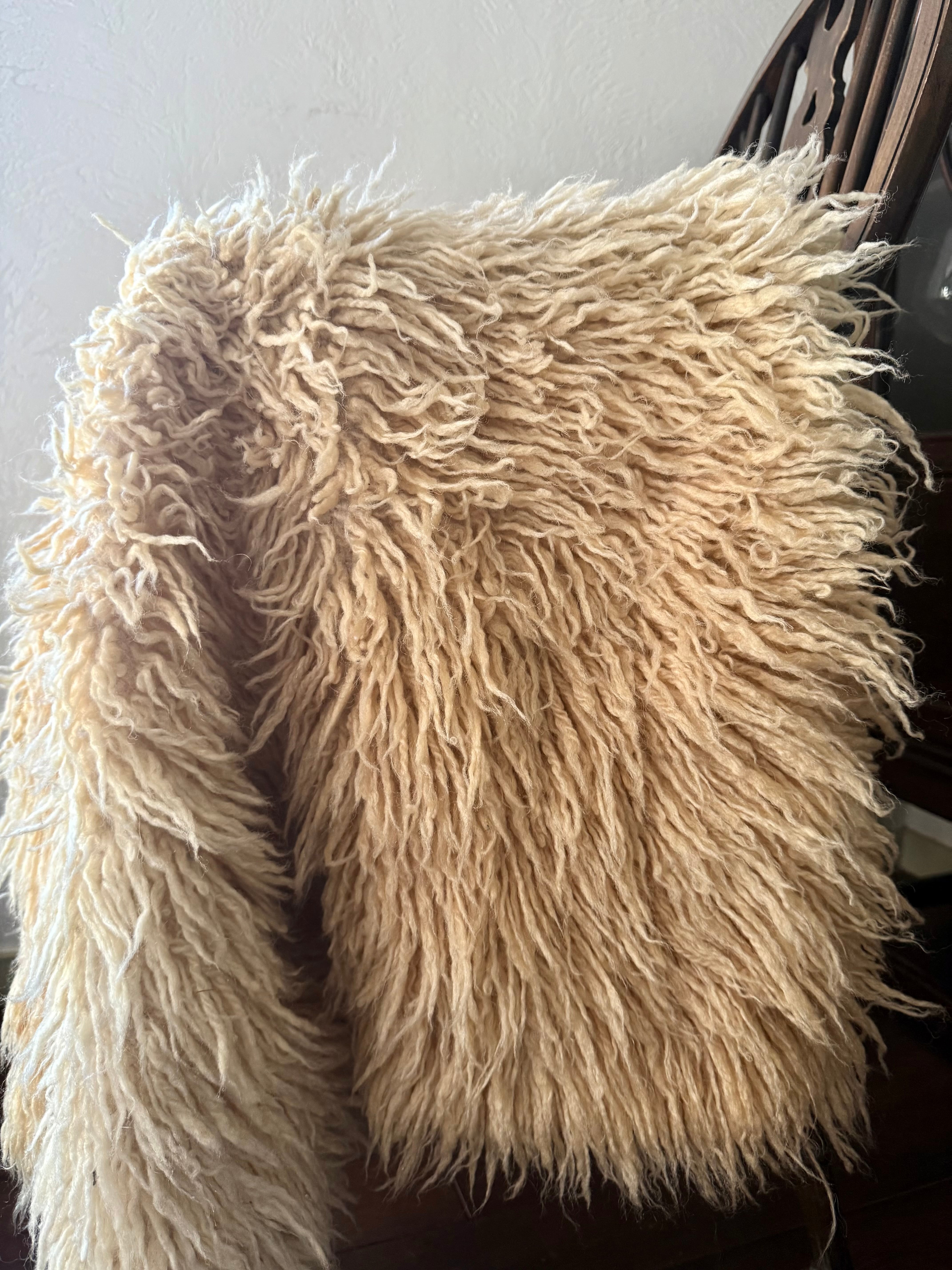 織り方はざっくりとしていて、いかにも家庭で織られてきた手織りの織り物。紡いだ長い羊の毛を織り込んでいます。