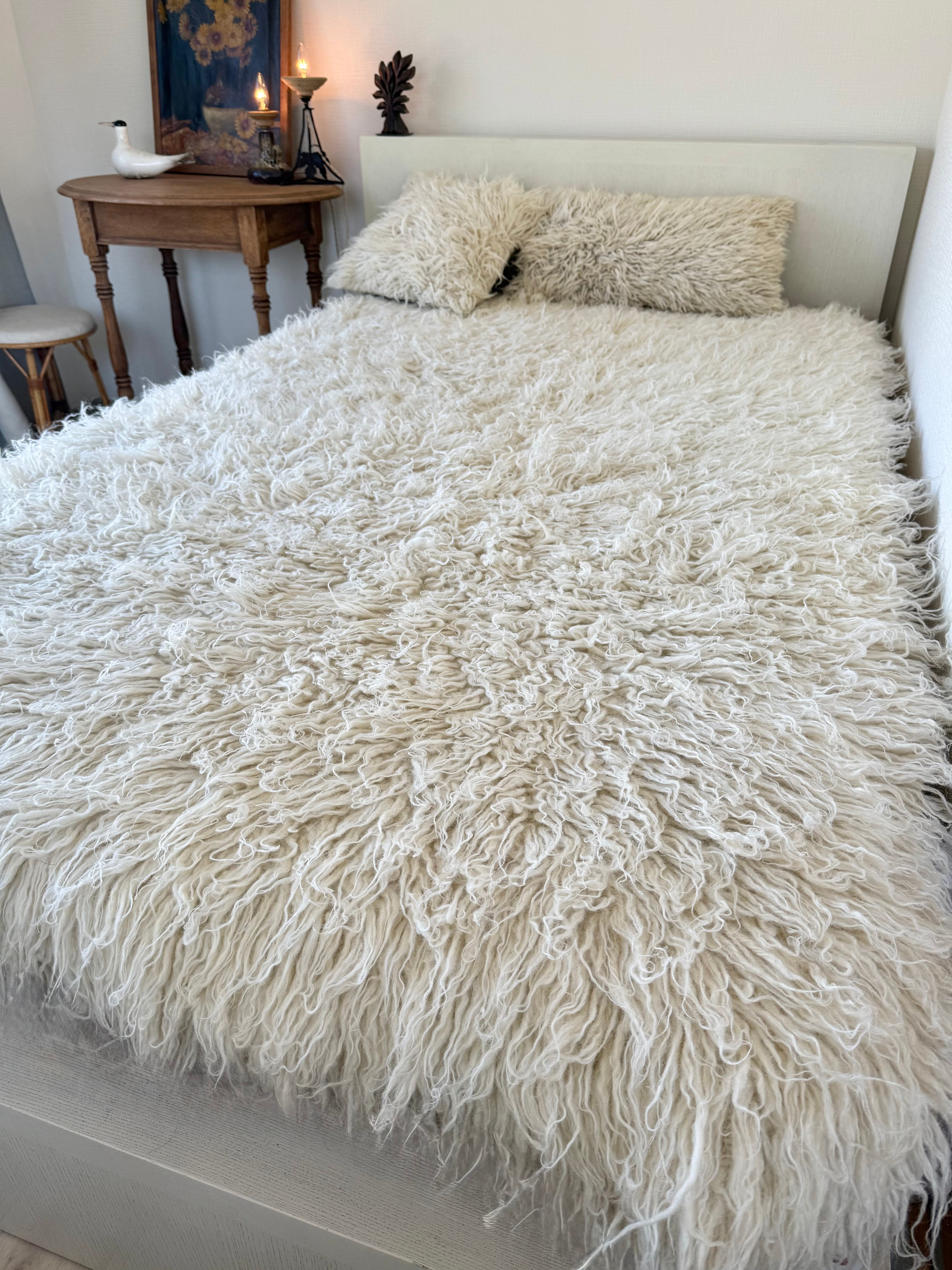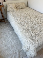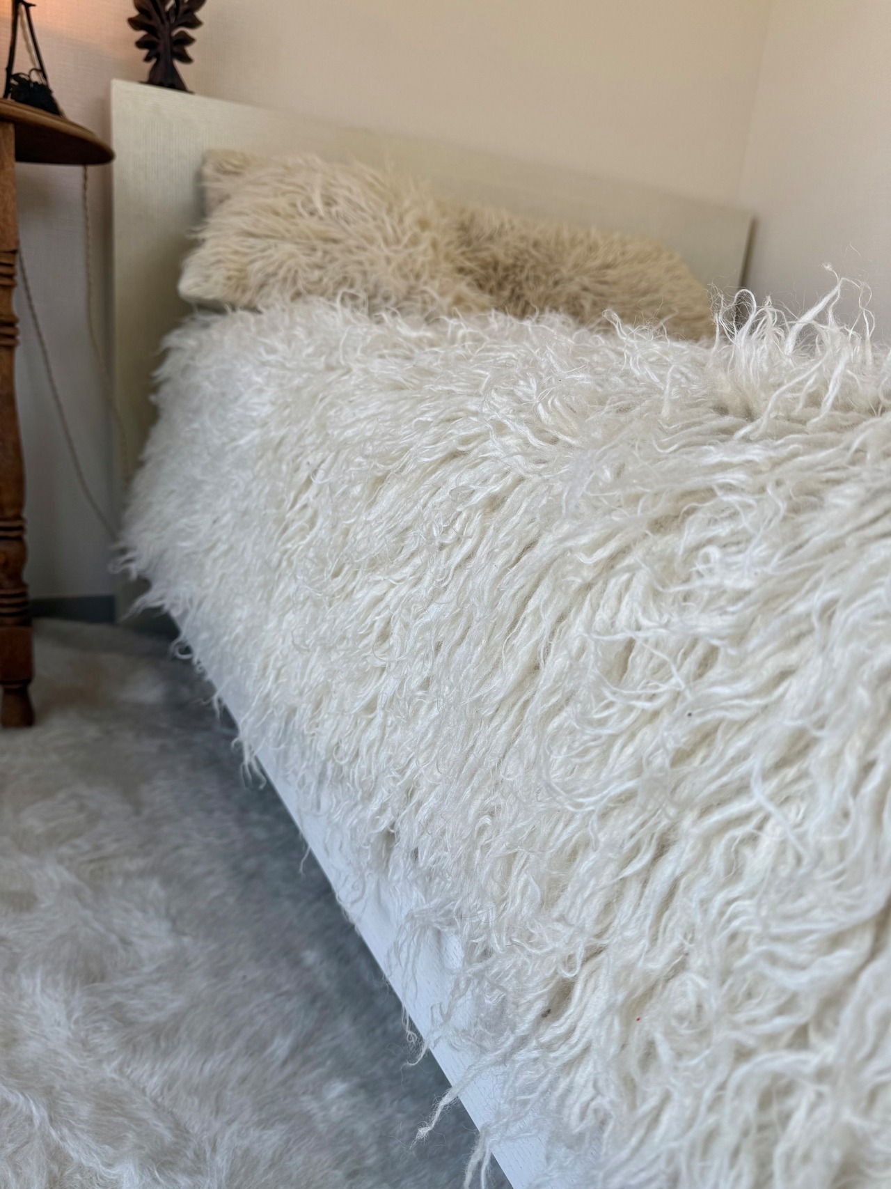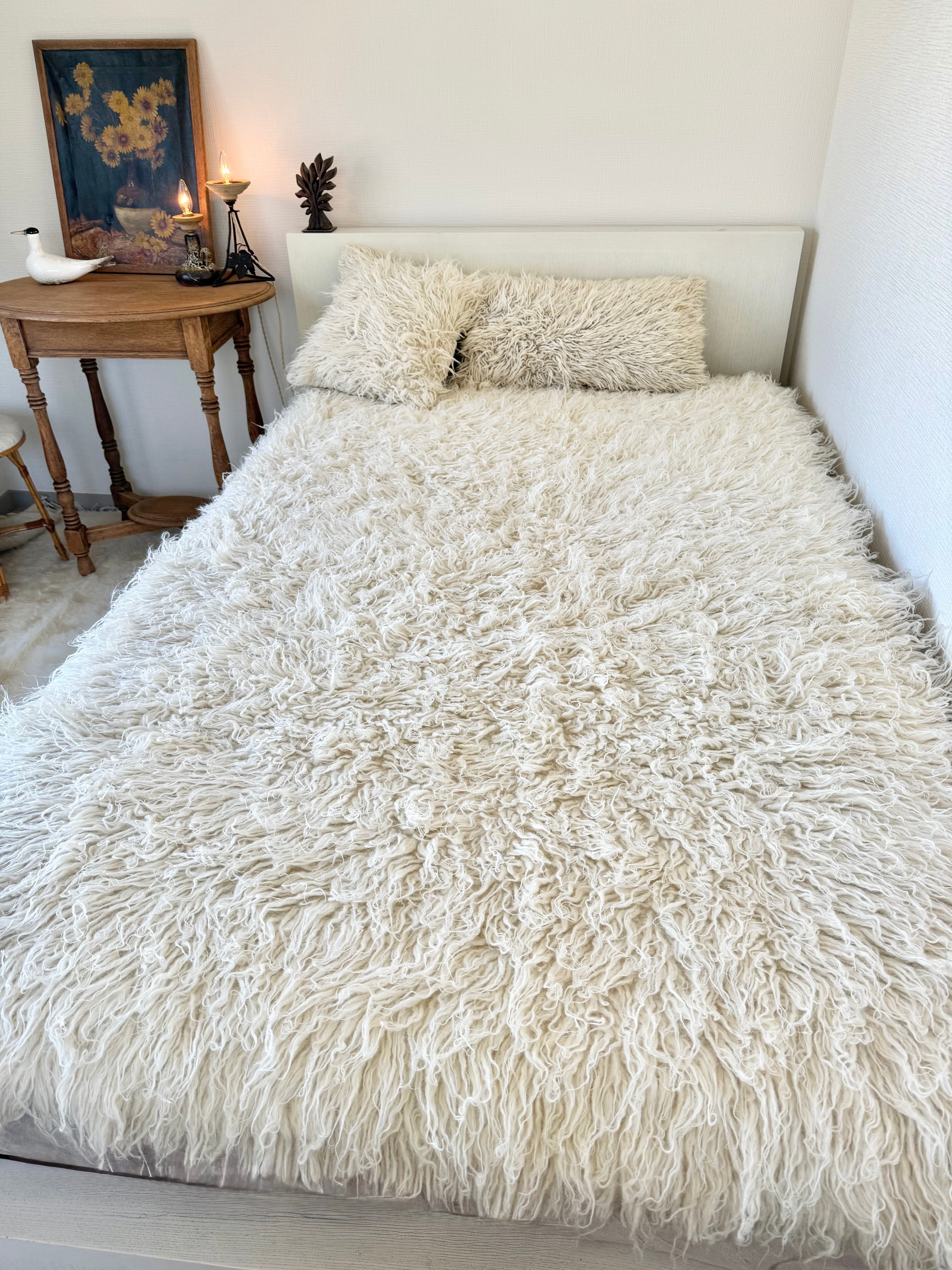 これをベッドにかけるとベッドがもこもこのソファに早変わりします。(長さが通常のベットだと完全に覆える長さではないので、もこもこの毛布をかける感覚でお使い頂けます)