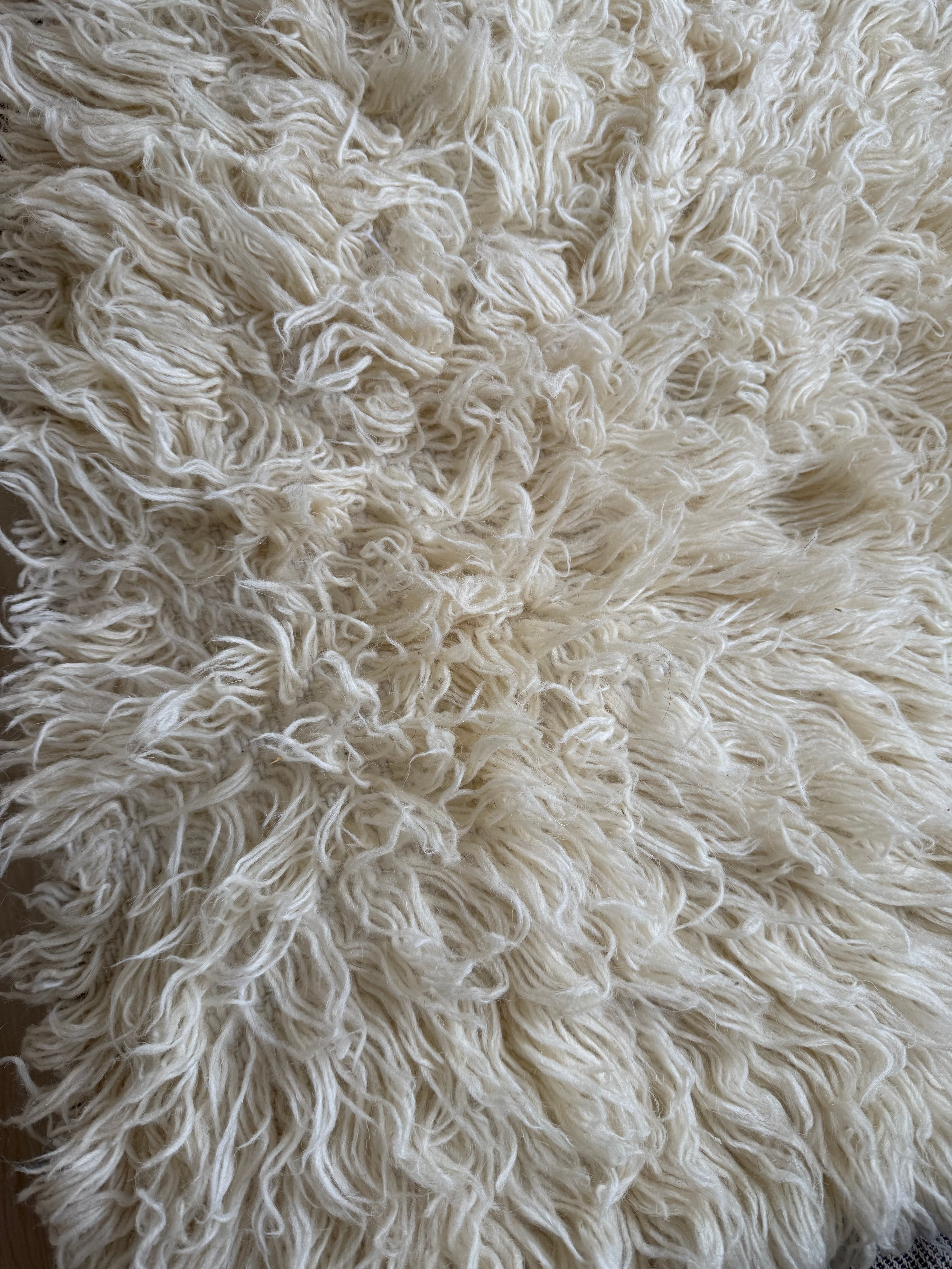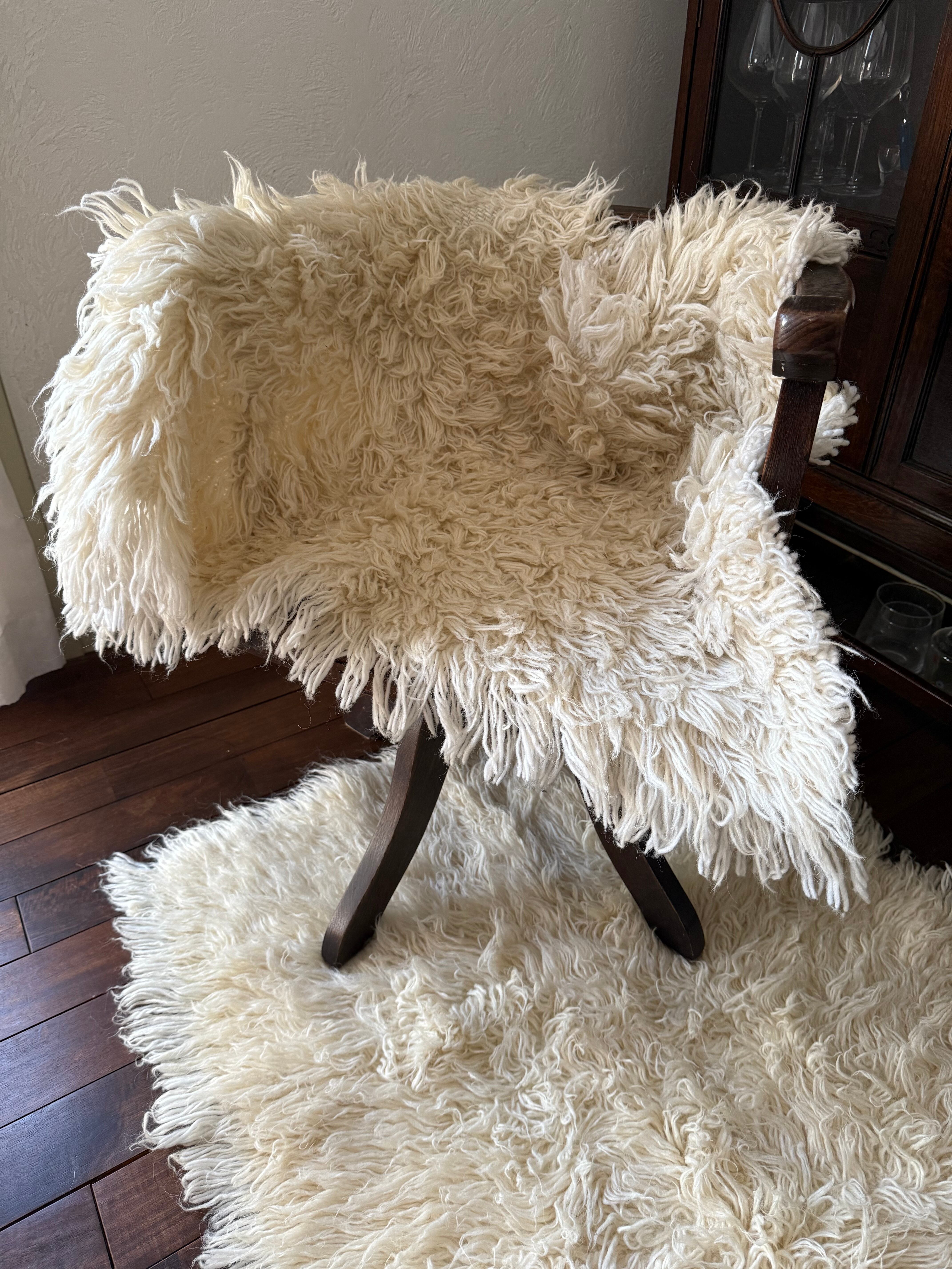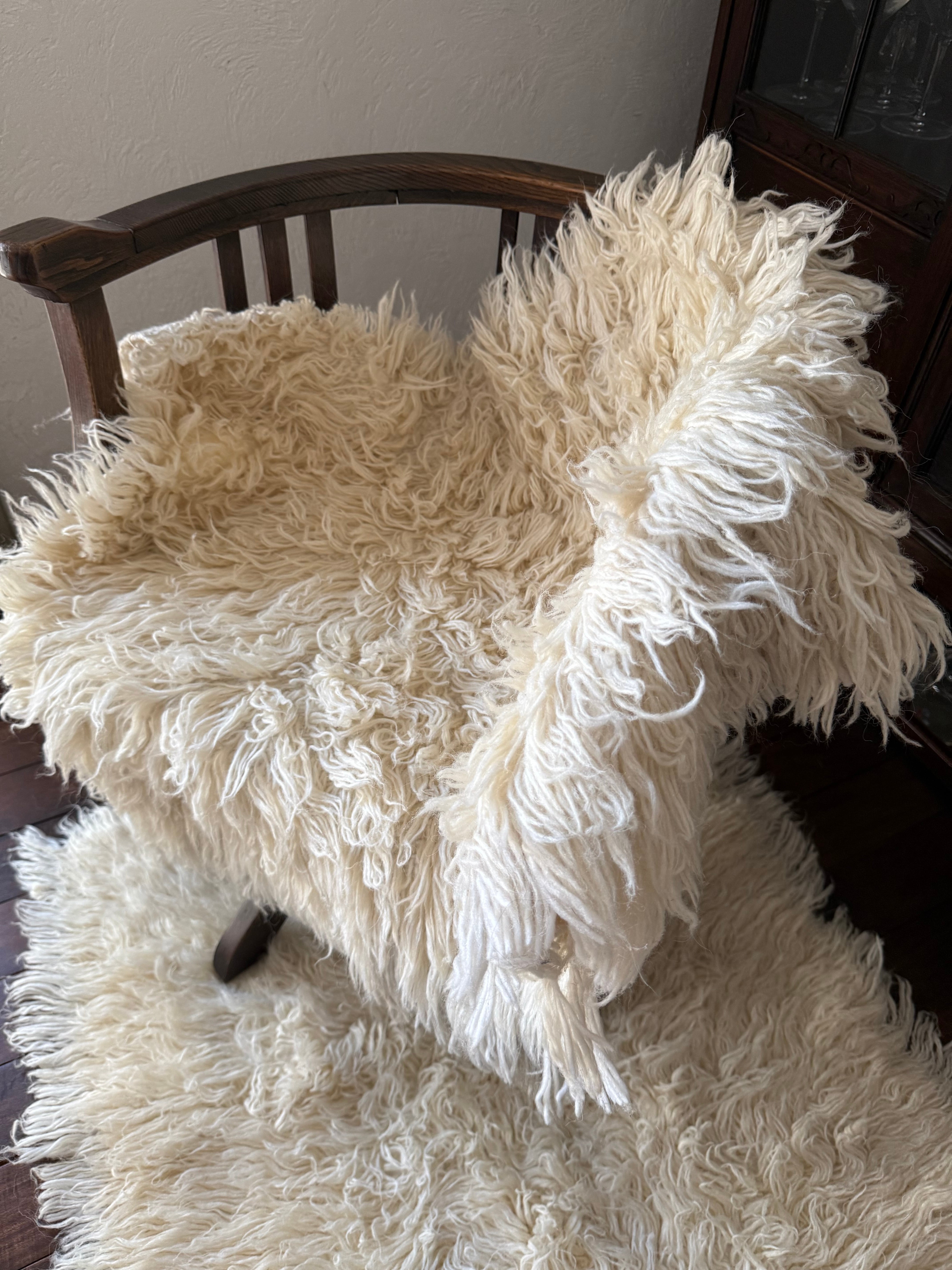 山岳地帯で暮らす遊牧民たちが自らの暮らしのために織ってきたもので、寒さを凌ぐためにこのように毛足が長い織物を作るようになったようです。