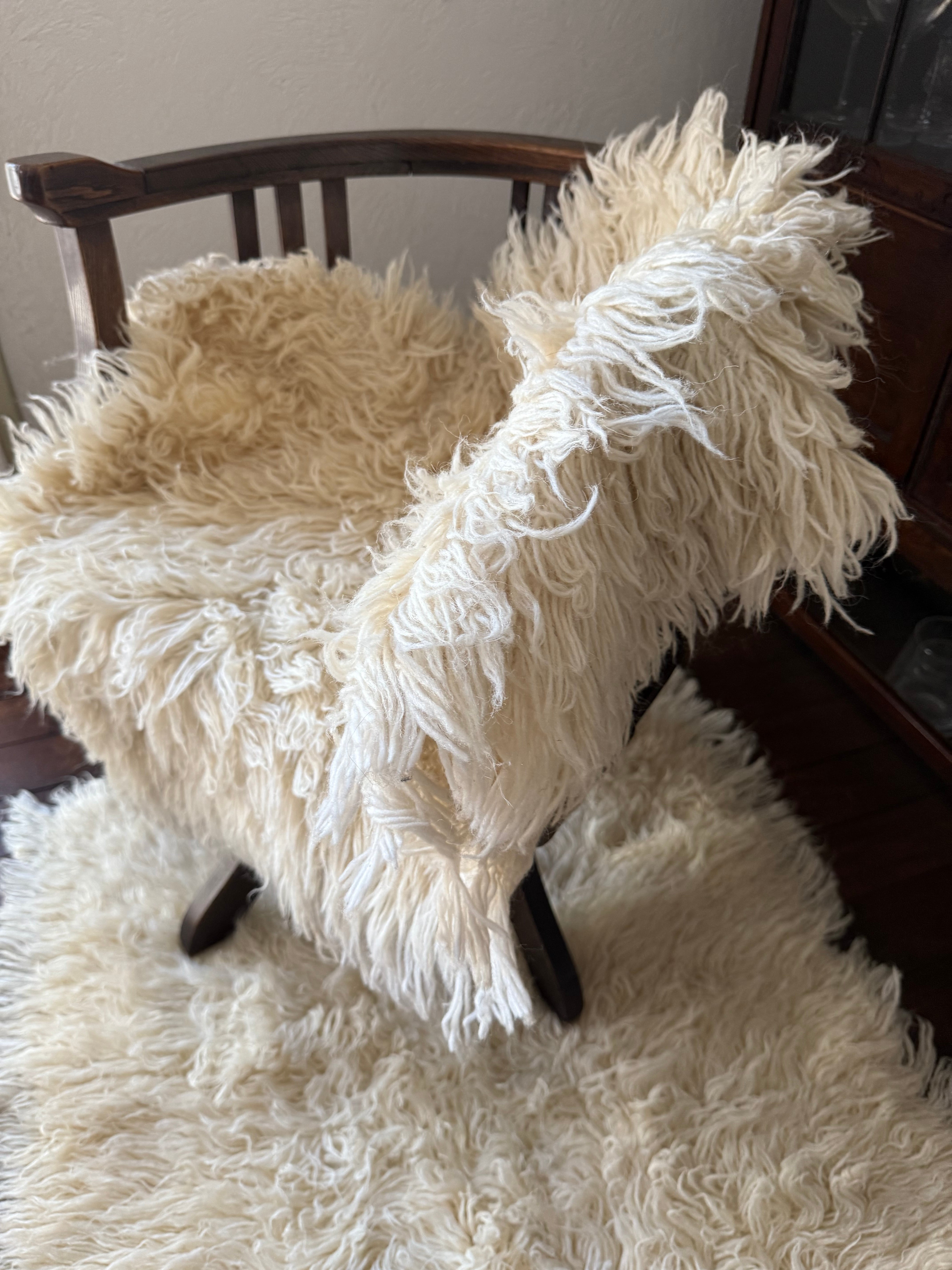 織り方はざっくりとしていて、いかにも家庭で織られてきた手織りの織り物。手で紡いだ長い羊の毛を織り込んでいます。