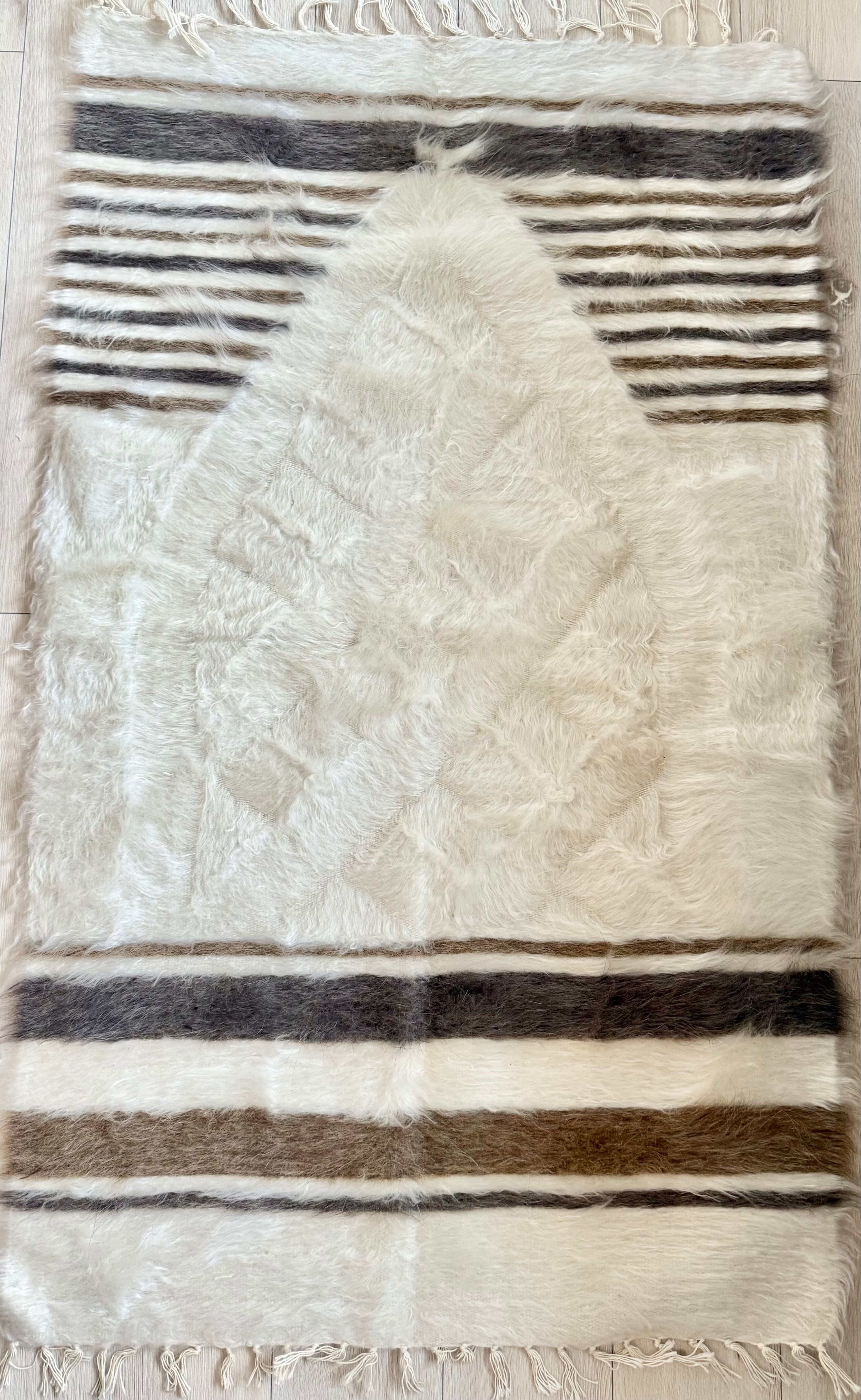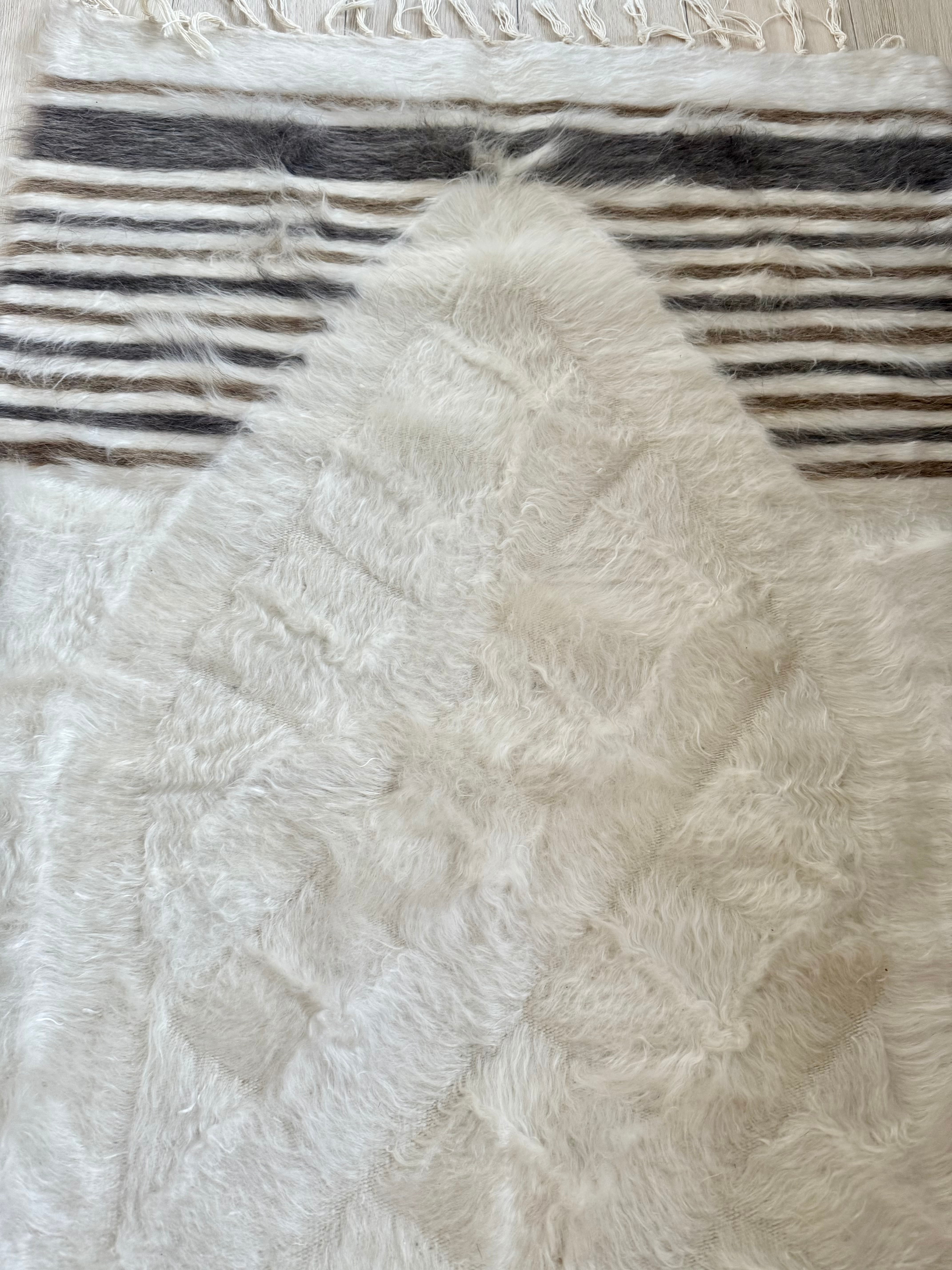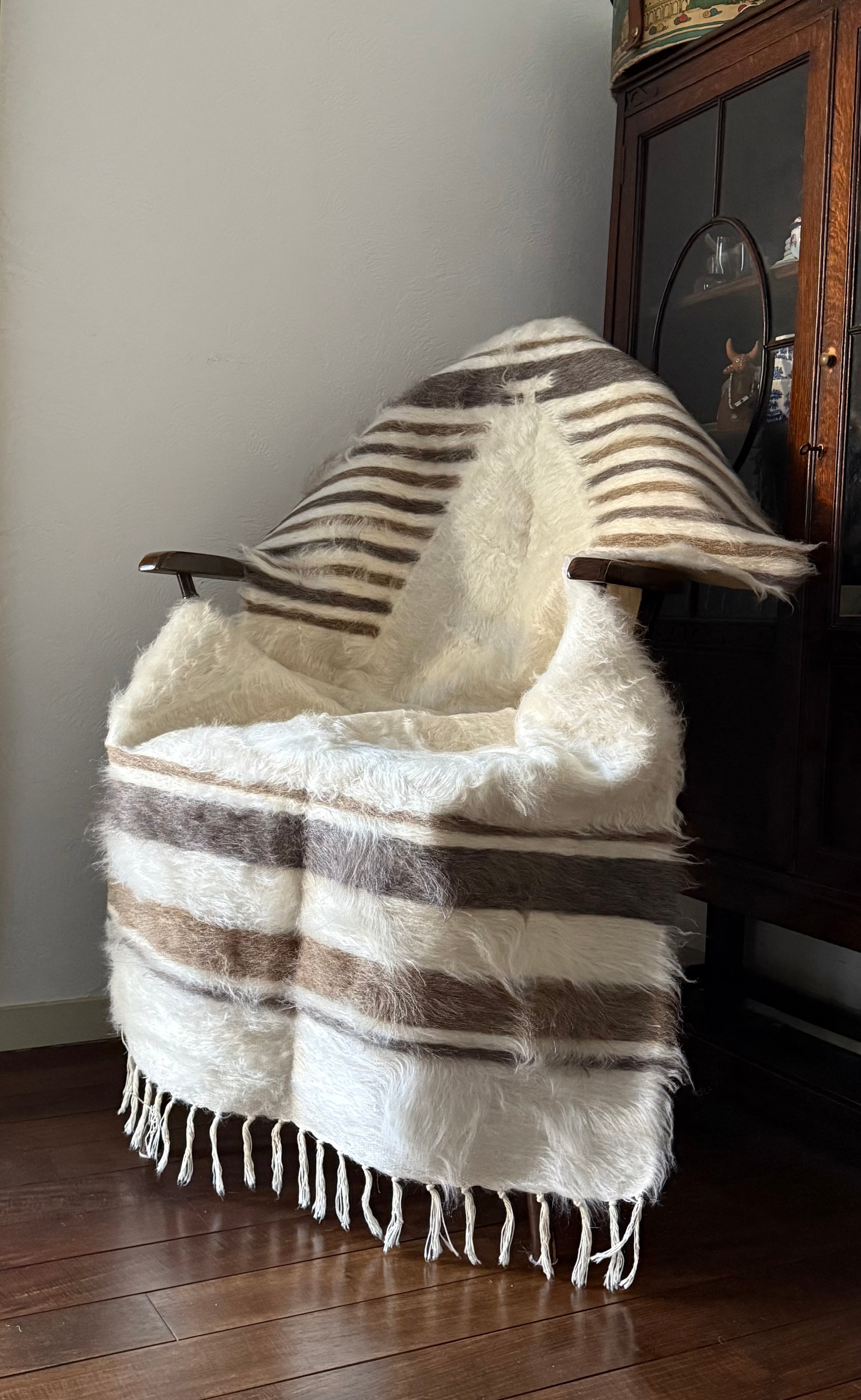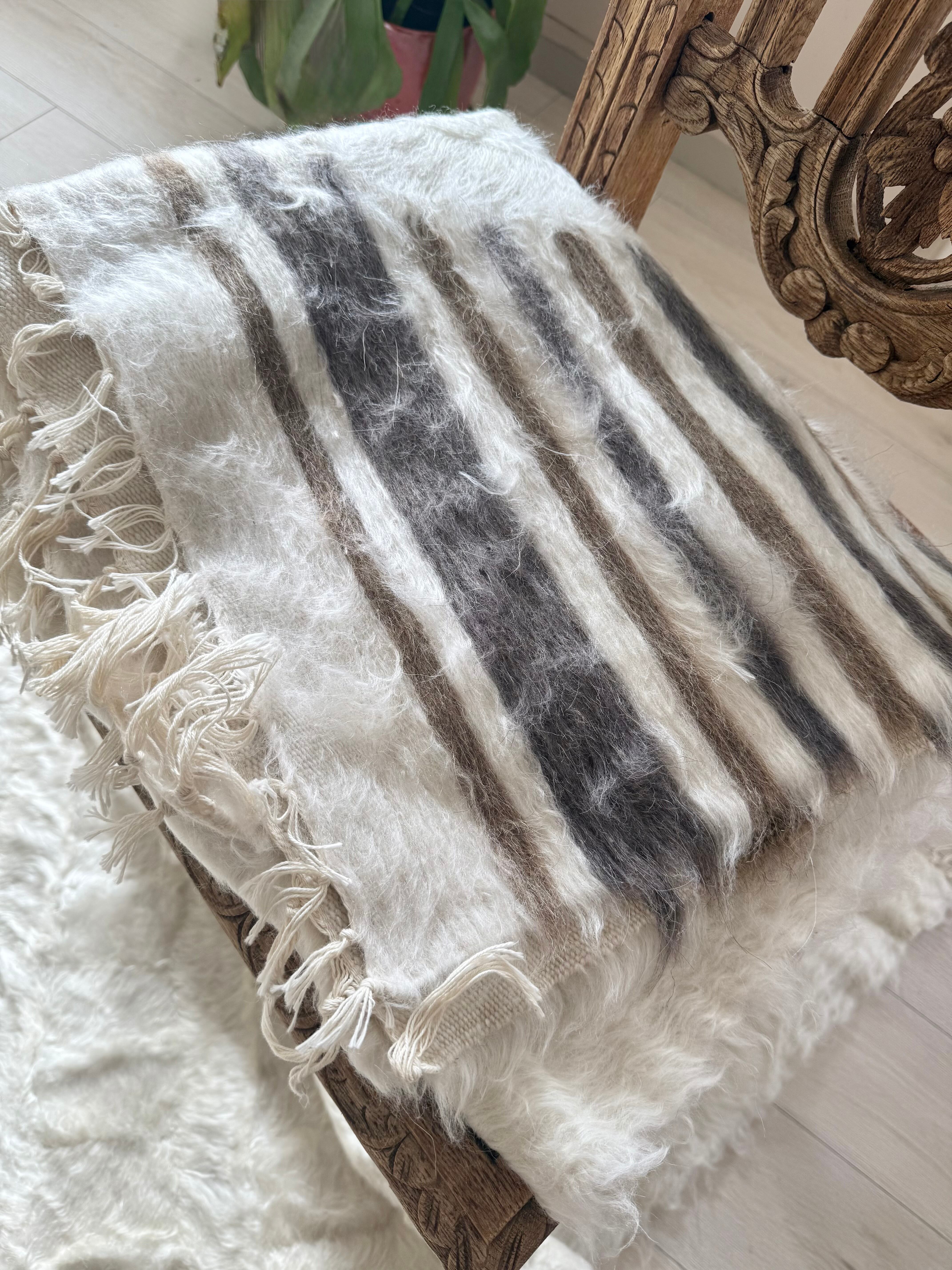 バッターニエは、アンゴラ山羊の毛で織られています。こちらはホワイト部分が特にとてもやわらかく、ちくちく感を感じませんでしたが、感覚には個人差がありますのでご了承ください。