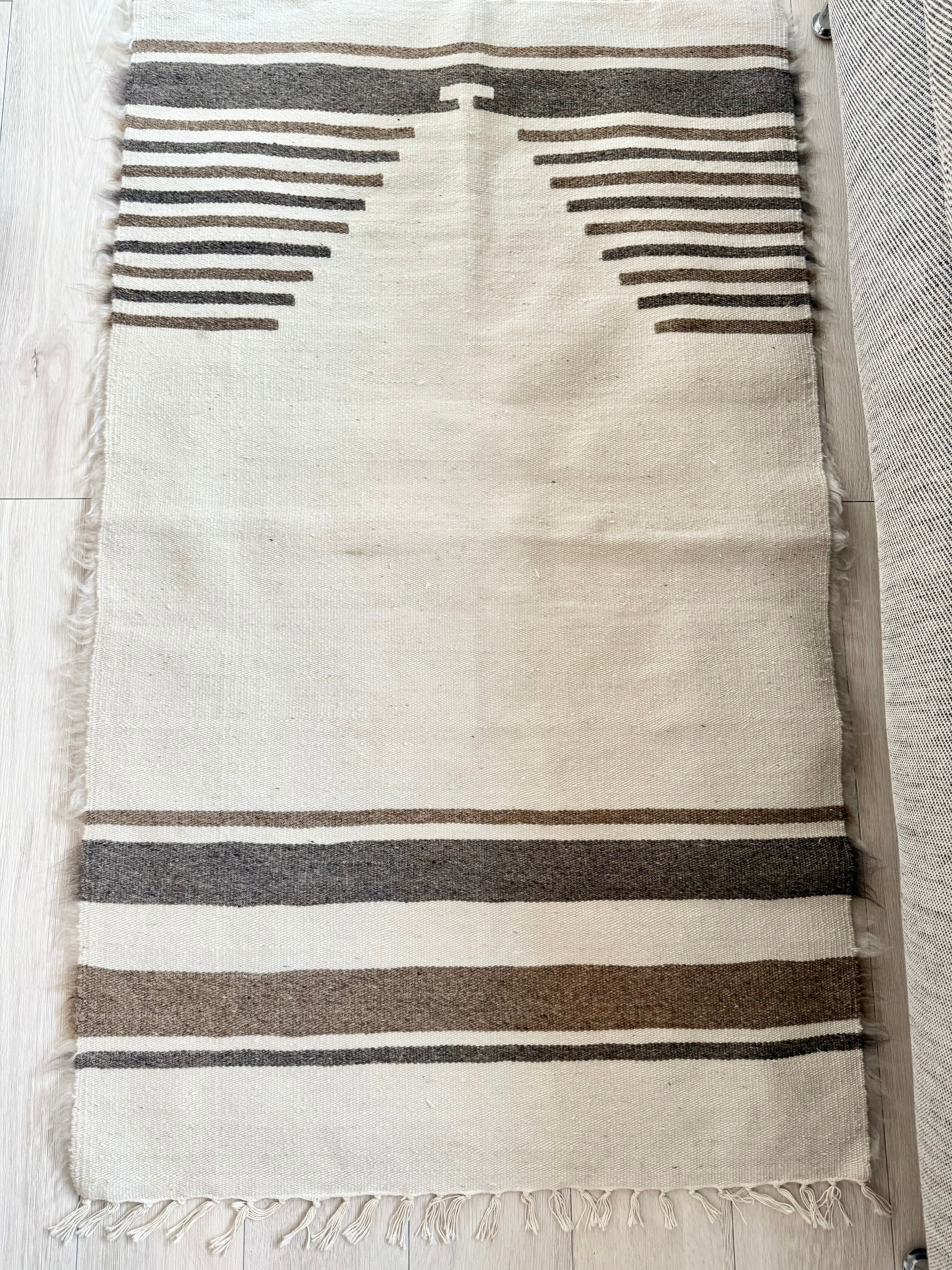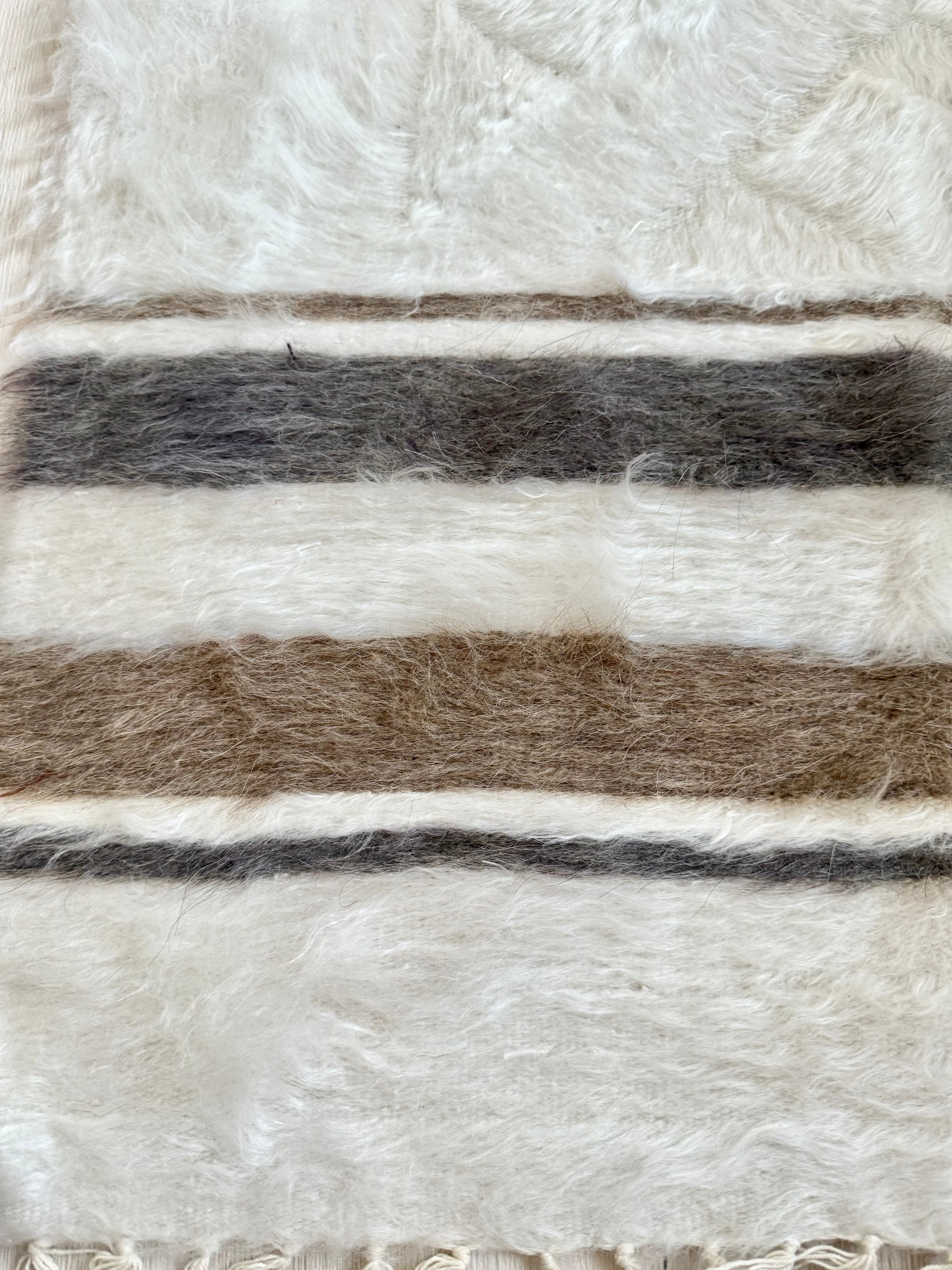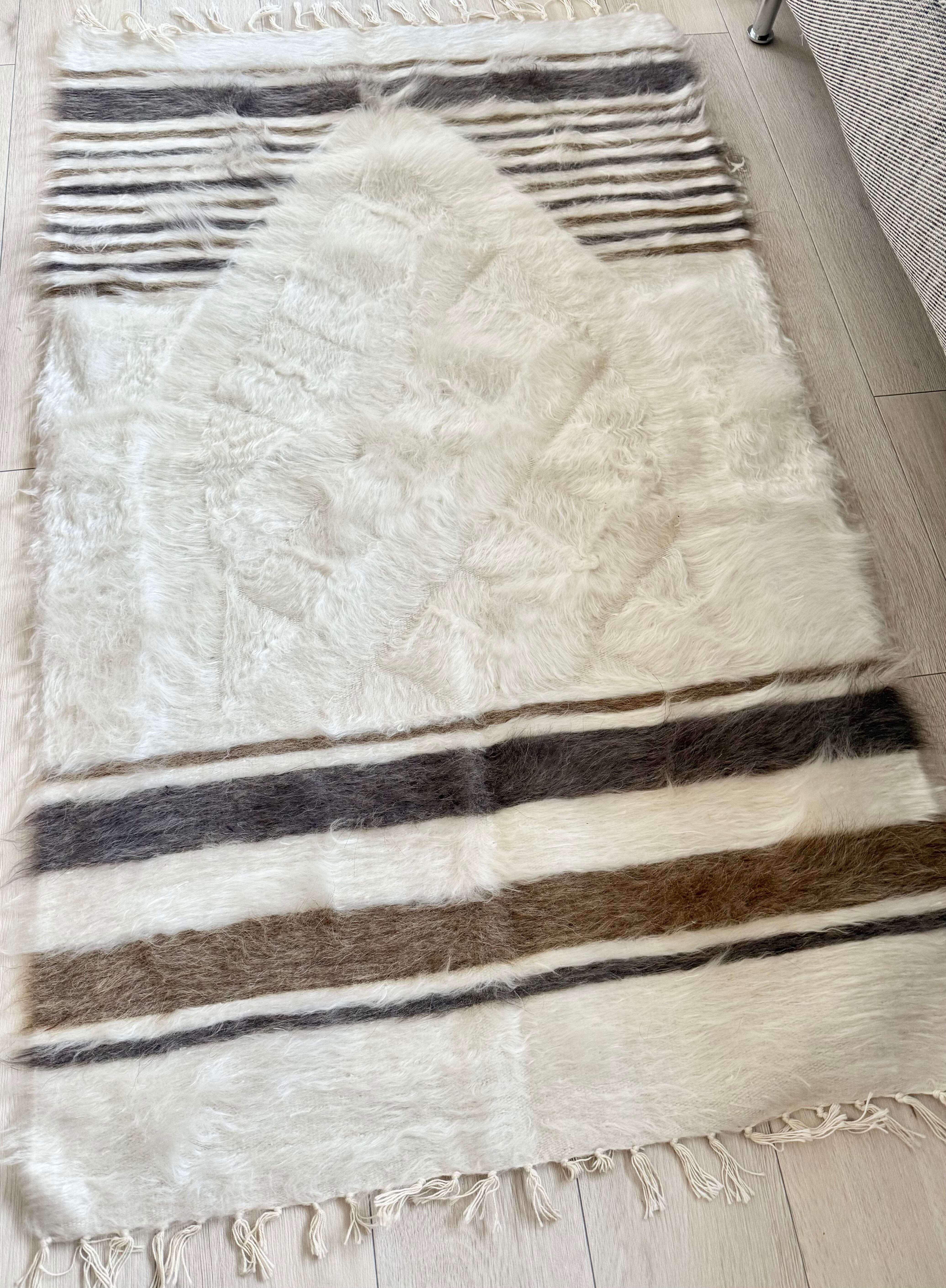 どのバッターニエもそうですが、リバーシブルで使え、裏側は起毛していないので美しいキリムとしても重宝します。ゴールドとシルバーのようなベージュとグレーの入ったホワイトは、インテリアに程よい優しさと暖かさをプラスしてくれます。