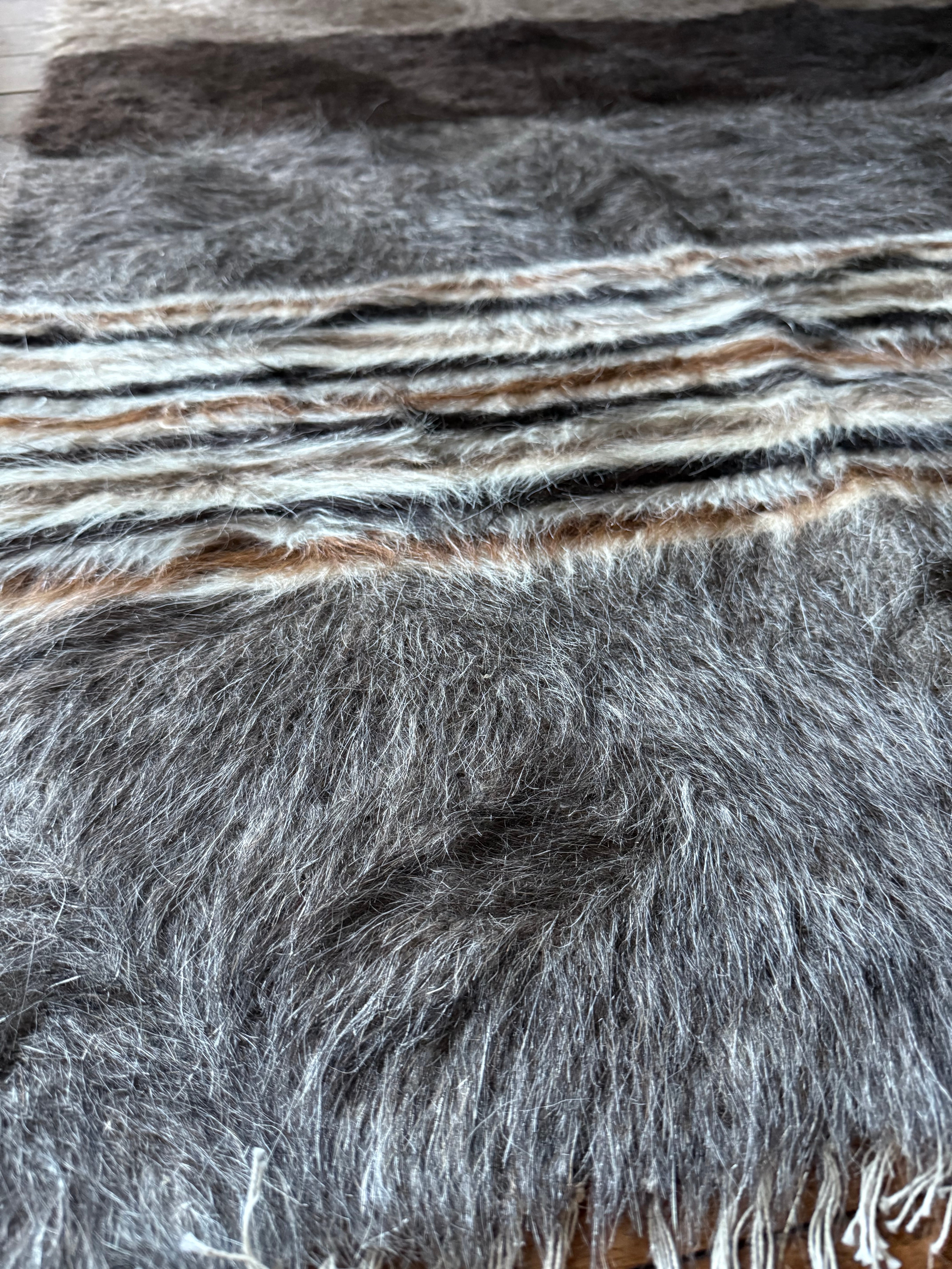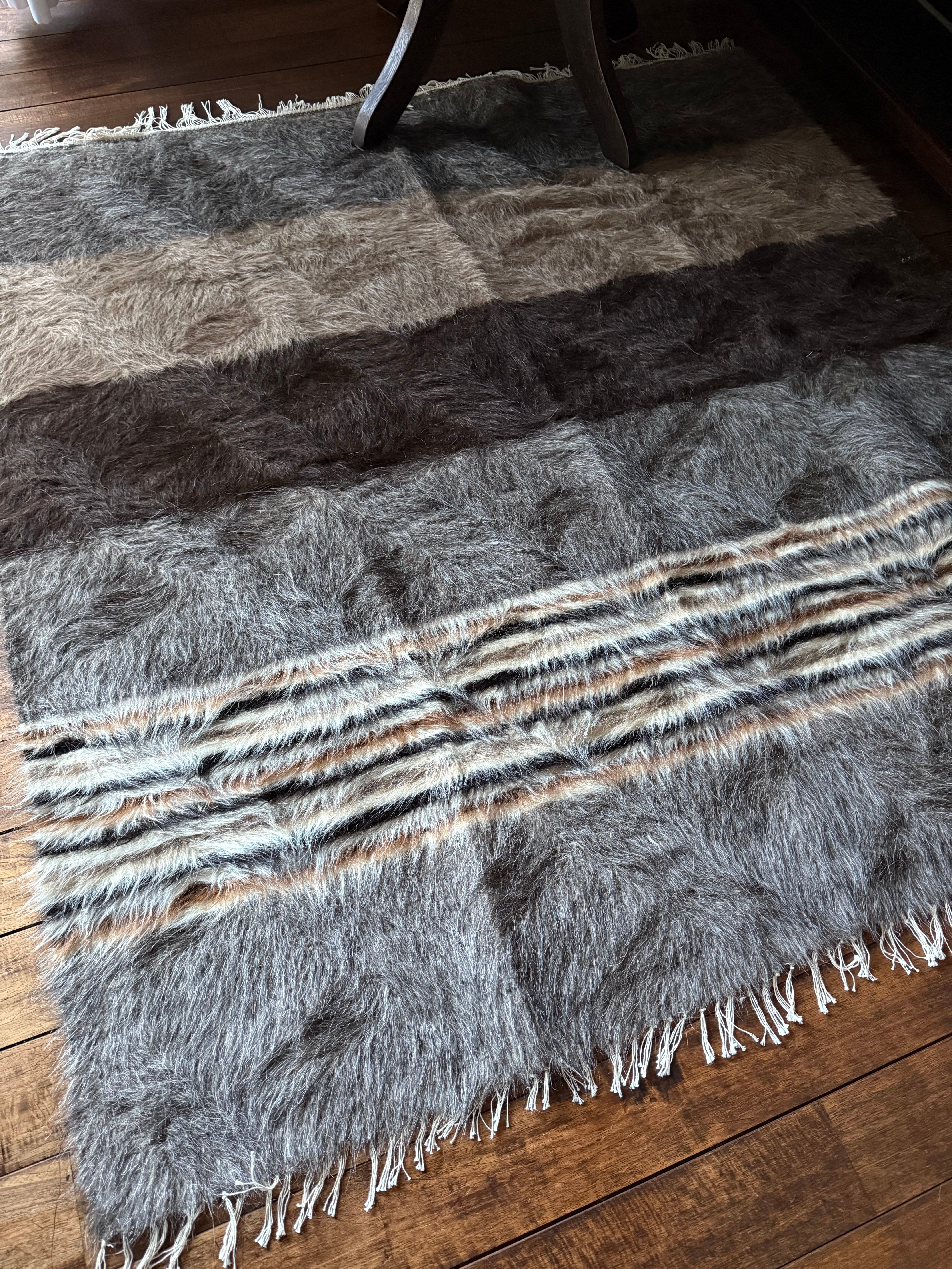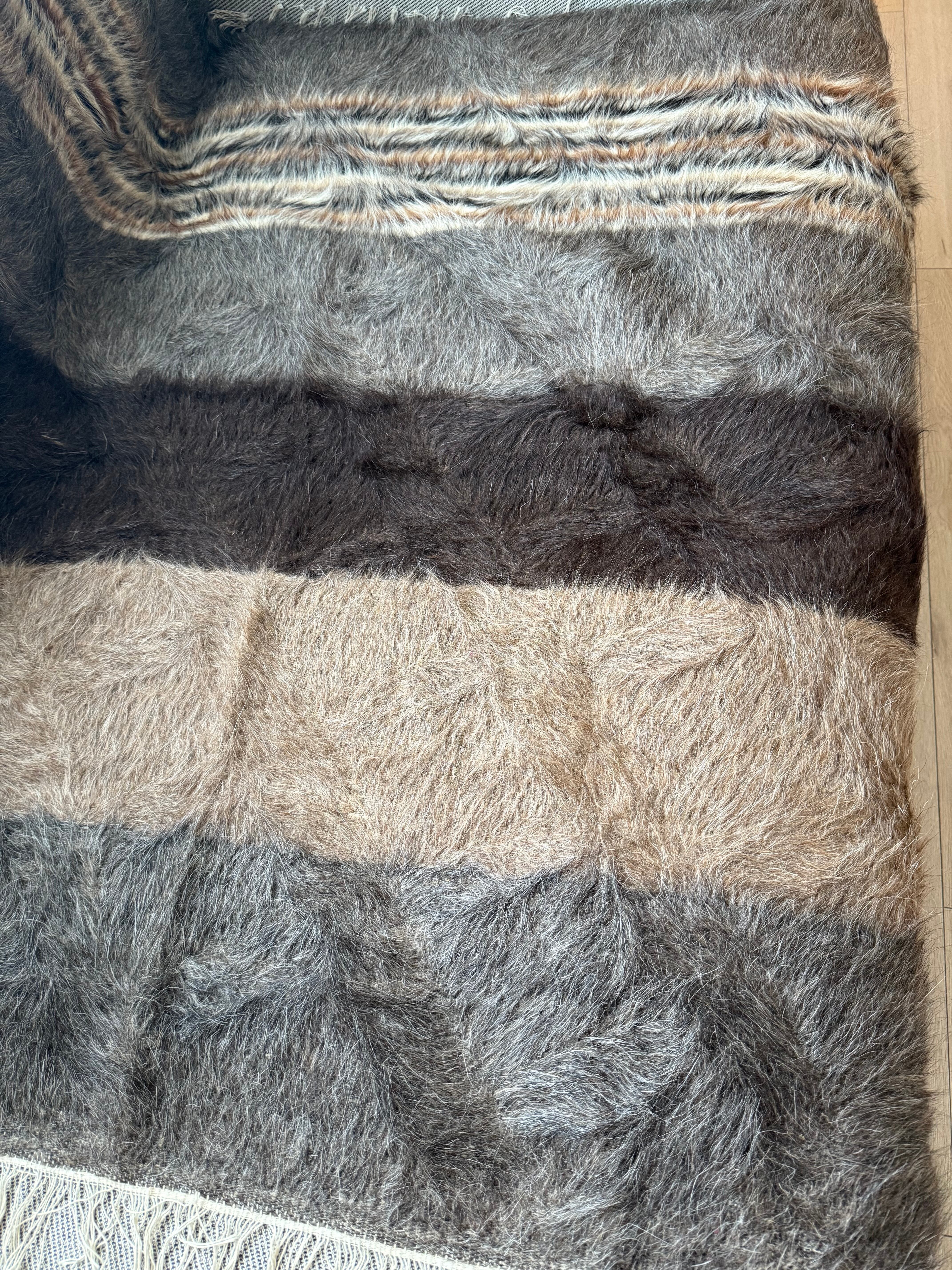 毛並みはとてもきれいですが、1970年代に織られた50年近く前のものになり、ほんの少しキリムがのぞいている部分もあります。(ストライプなのであまり目立ちません)
