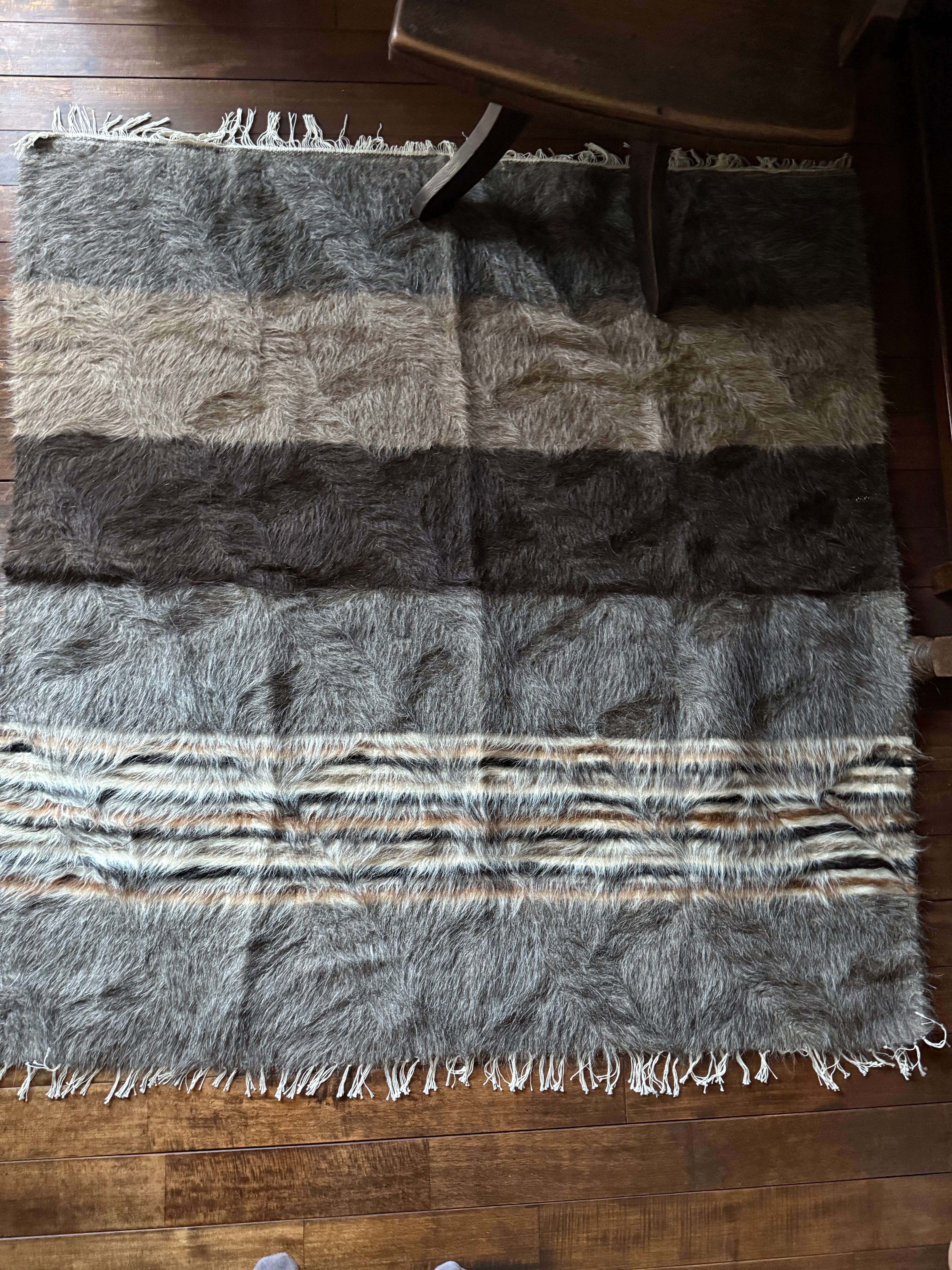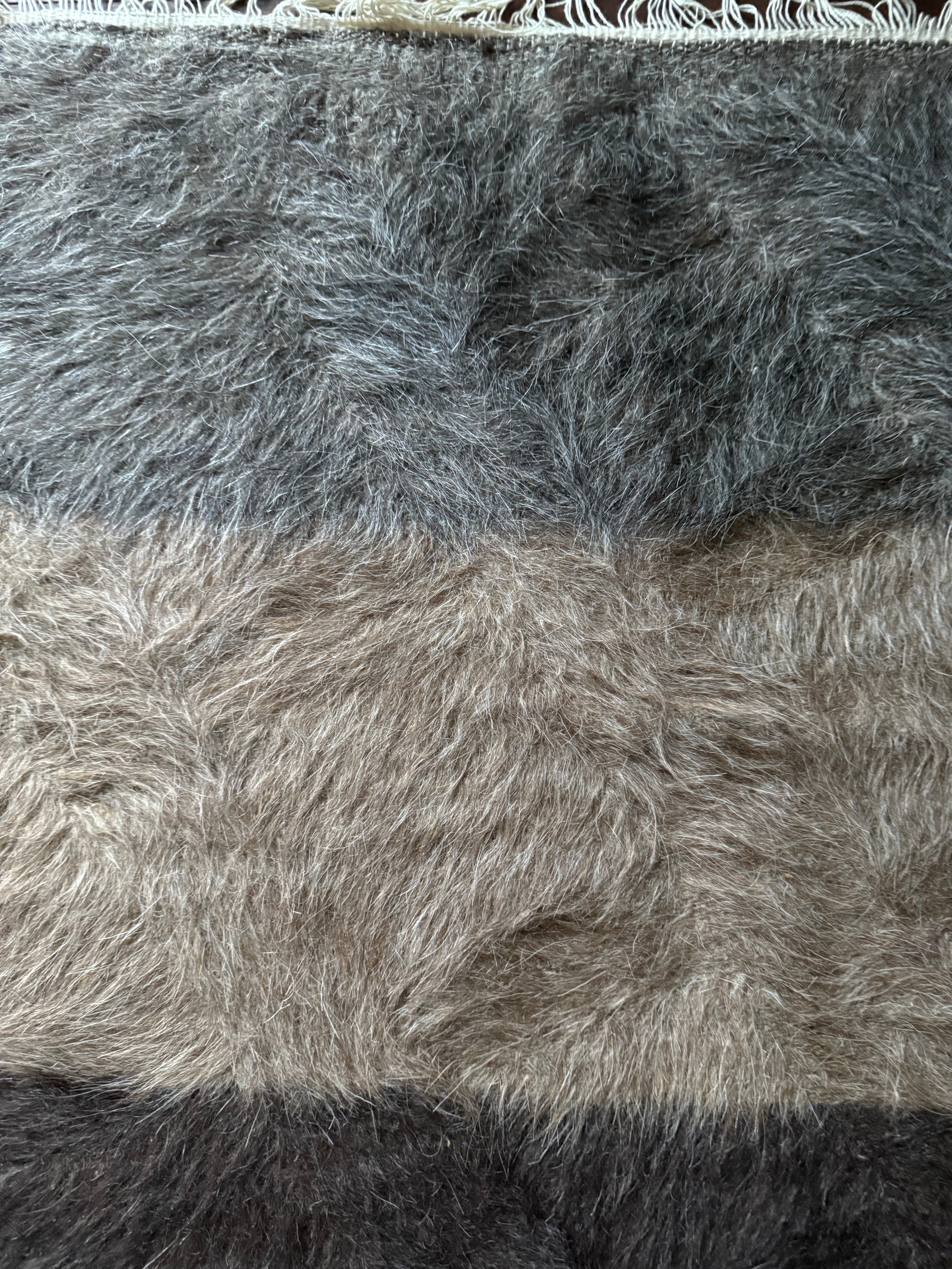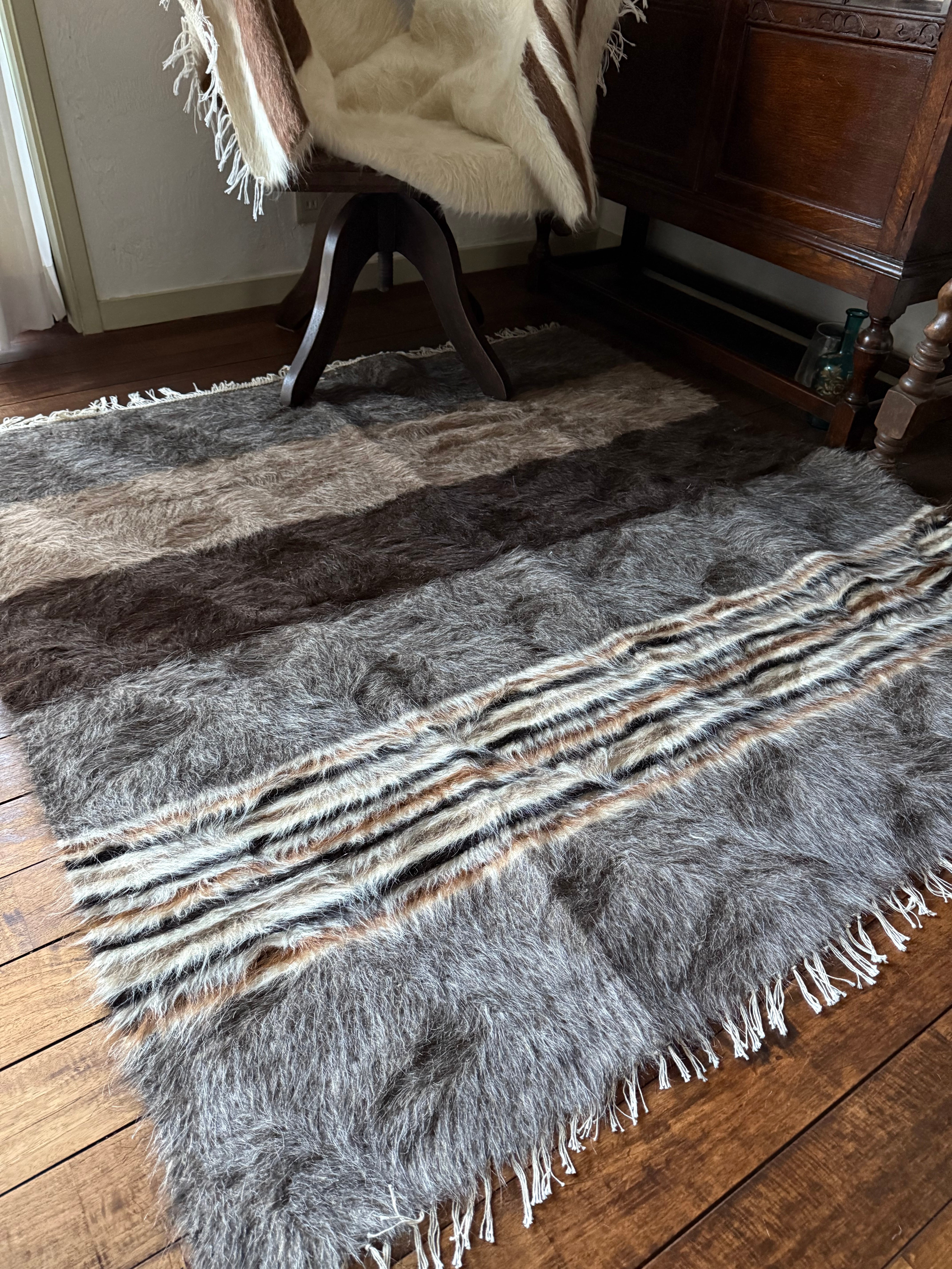 毛並みはとてもきれいですが、1970年代に織られた50年近く前のものになり、ほんの少しキリムがのぞいている部分もあります。(ストライプなのであまり目立ちません)
