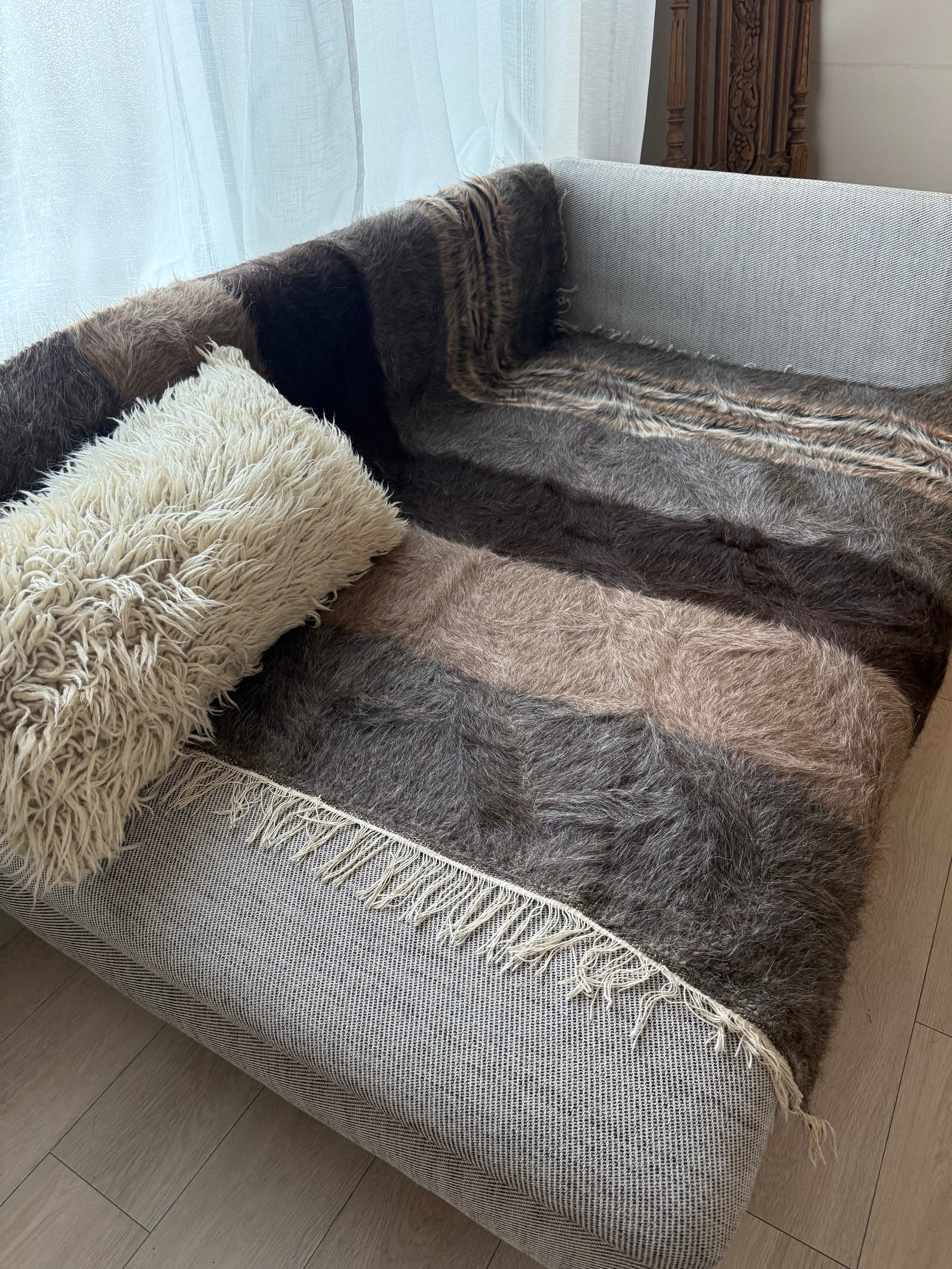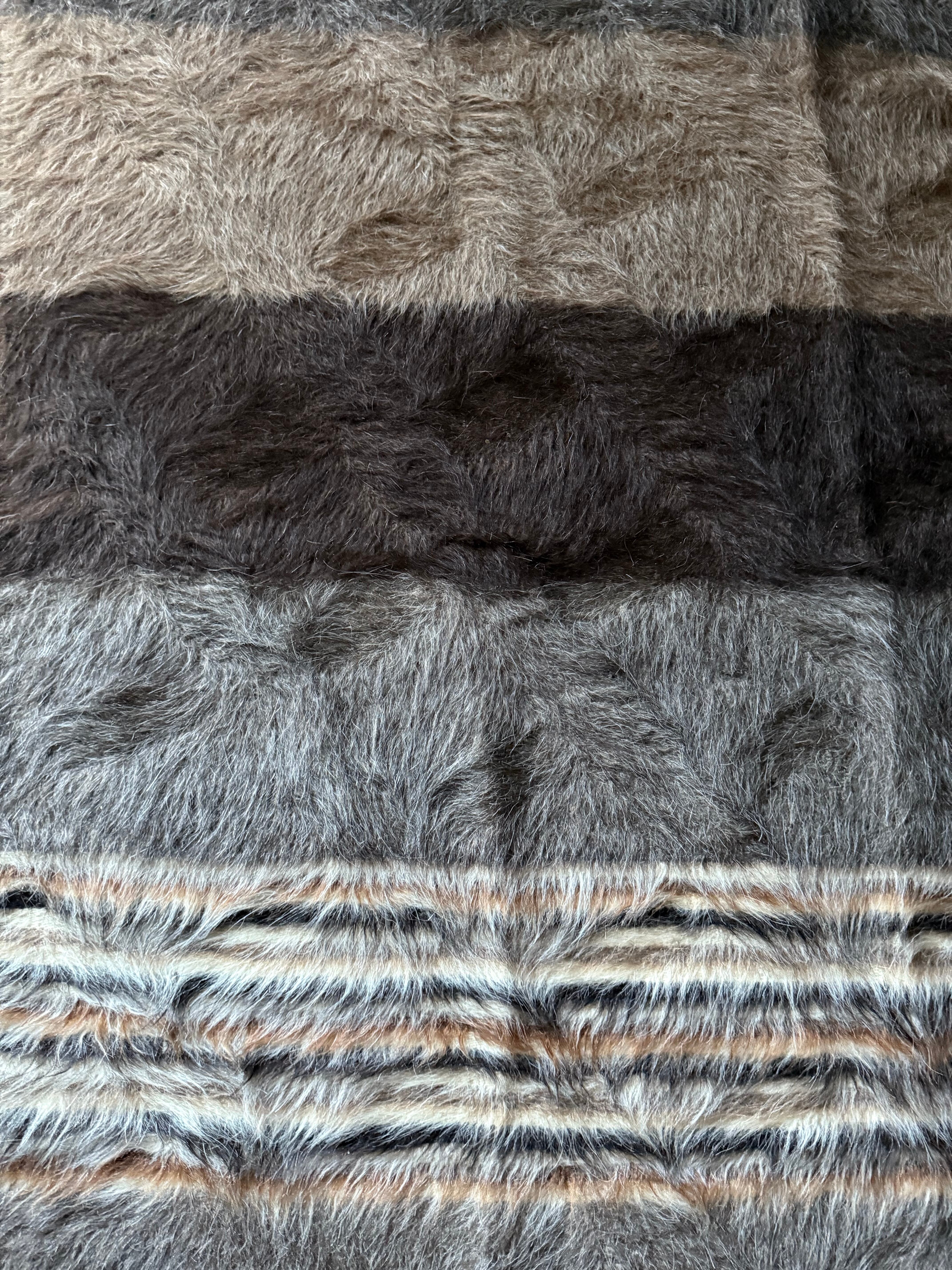 こちらは使用されたことのある1970年代後半のものをリサイズして正方形の形に仕上げています。ダイヤ柄の織り柄も残っており、毛量、毛の艶など含めて非常に状態のいい一枚です。