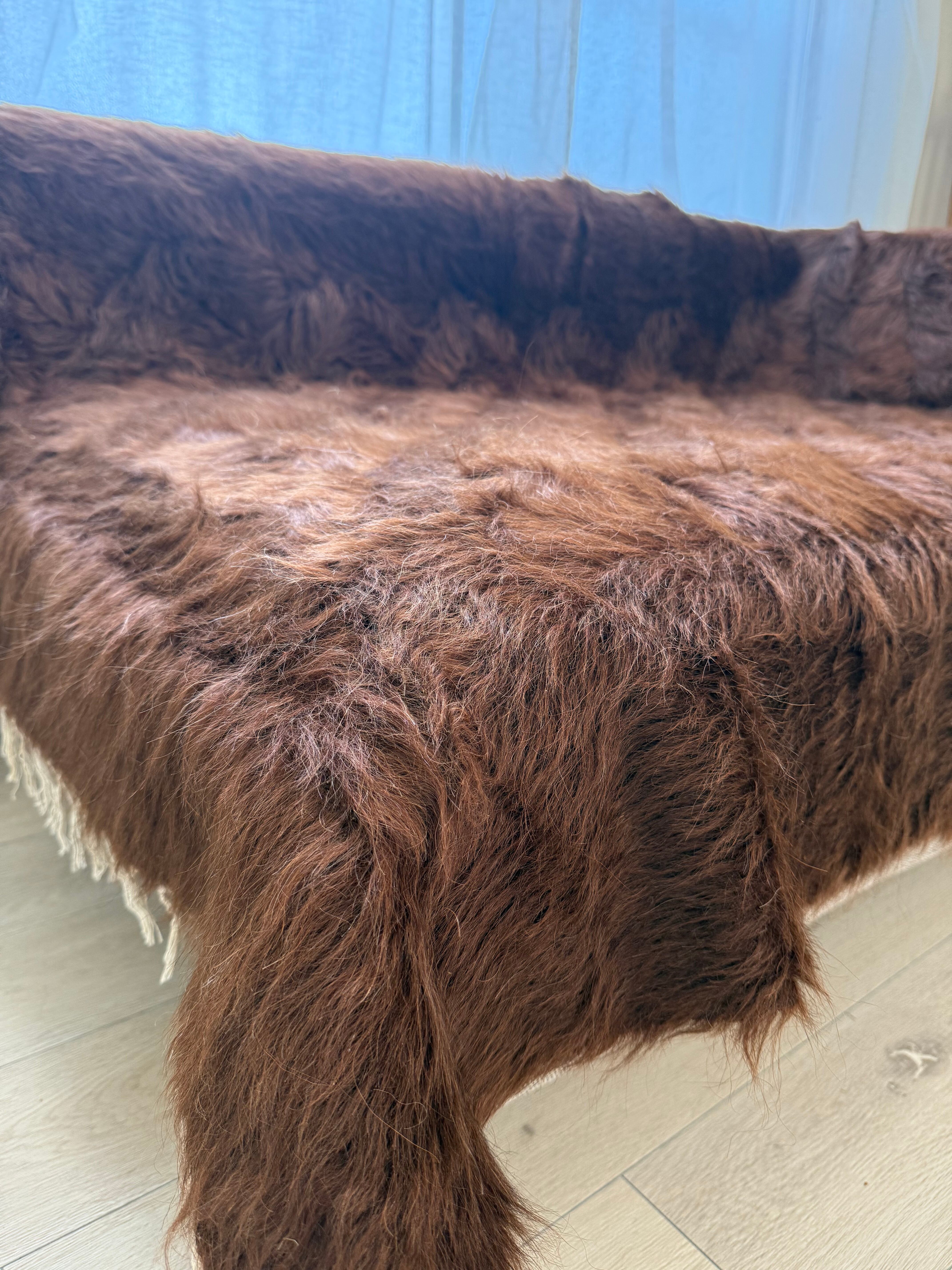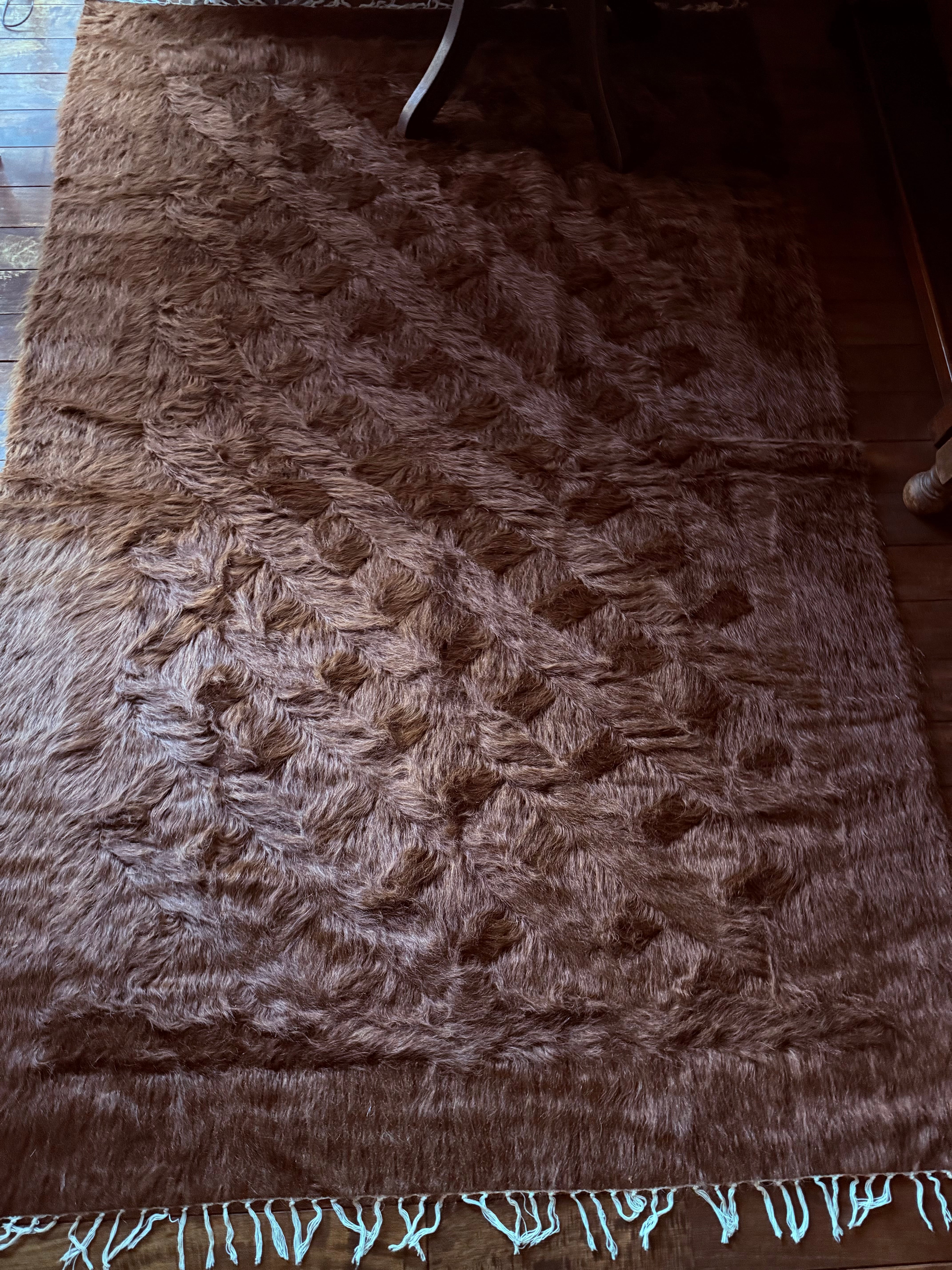 (アンゴラ山羊の毛は現代に私たちが慣れている羊毛やナイロンなどよりも、ツヤとはりがあります。だからこそ輝くのですが、肌着などで座られるとちくちくと感じる方もいらっしゃるかもしれません。普通のコットンのスカート、パンツ、チノパンなどや、秋冬の服で座られたらどなたでも気にならないと思います。もちろん足元に置かれる分にはさらさらとしてとても気持ちがいいと思います)