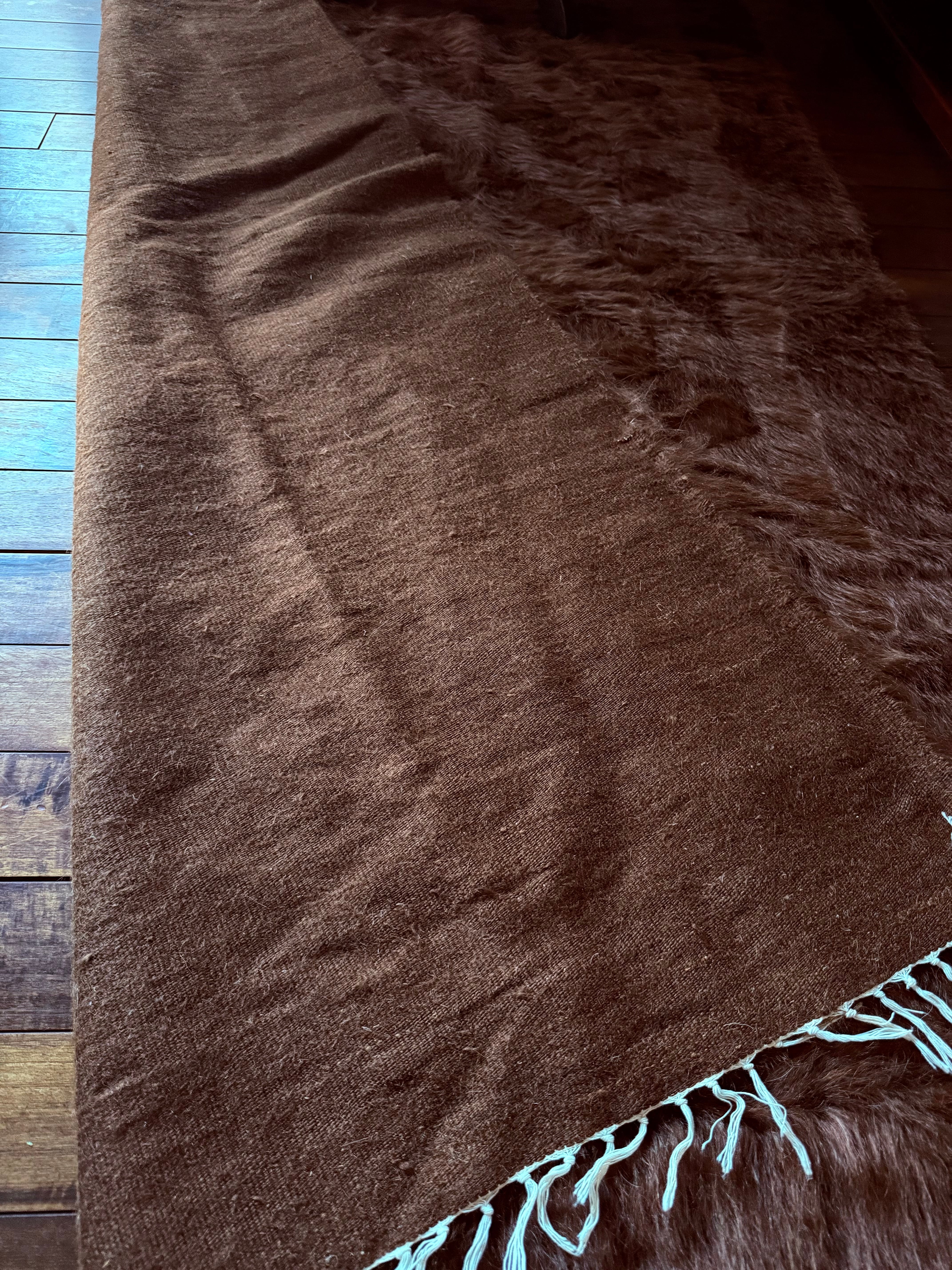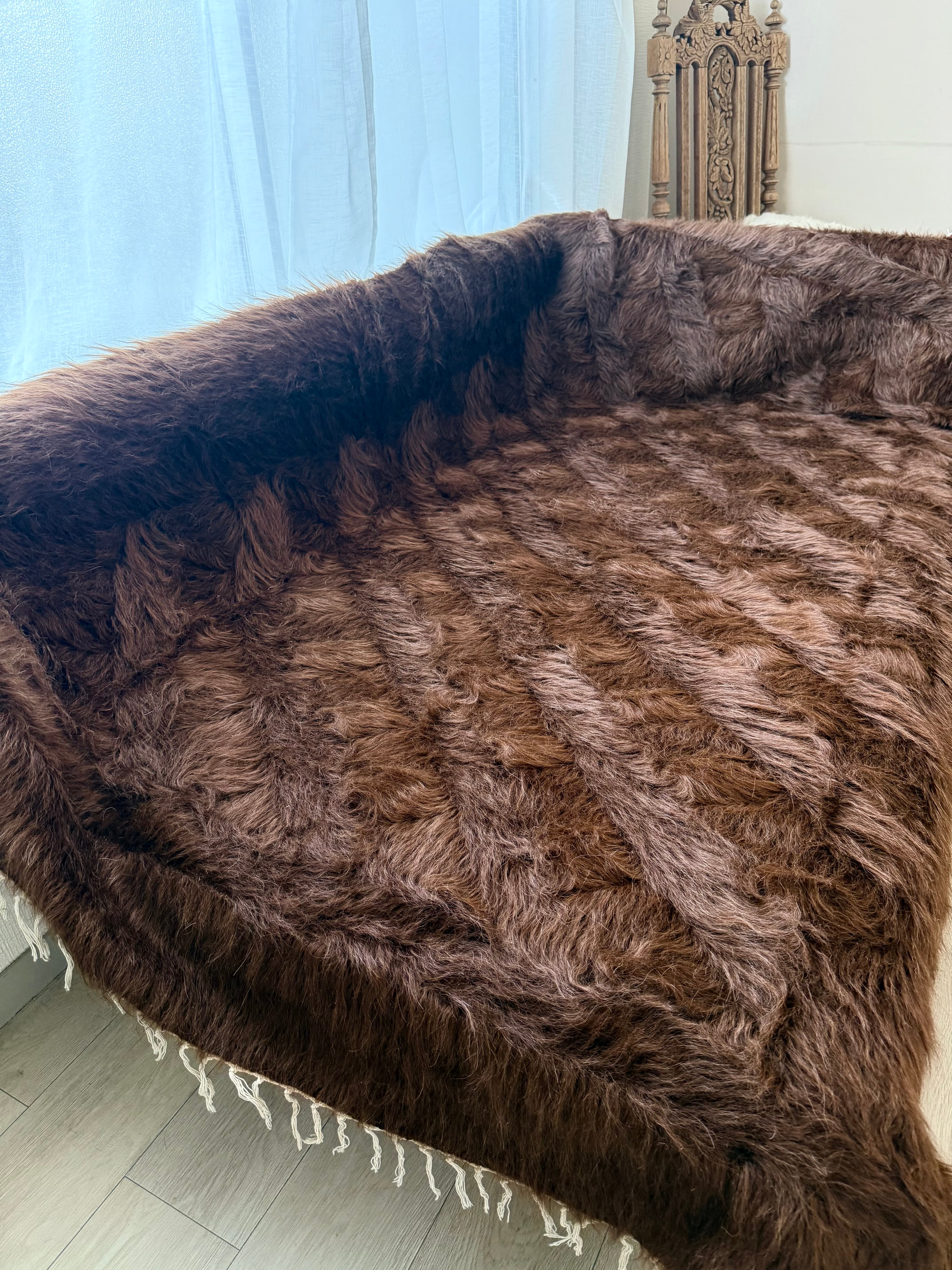 たっぷりとした毛は、光に当たるときらきらと輝きます。持ち上げるとずっしりと毛の厚みがあり、どんな寒い日にもこの1枚があれば安心です。