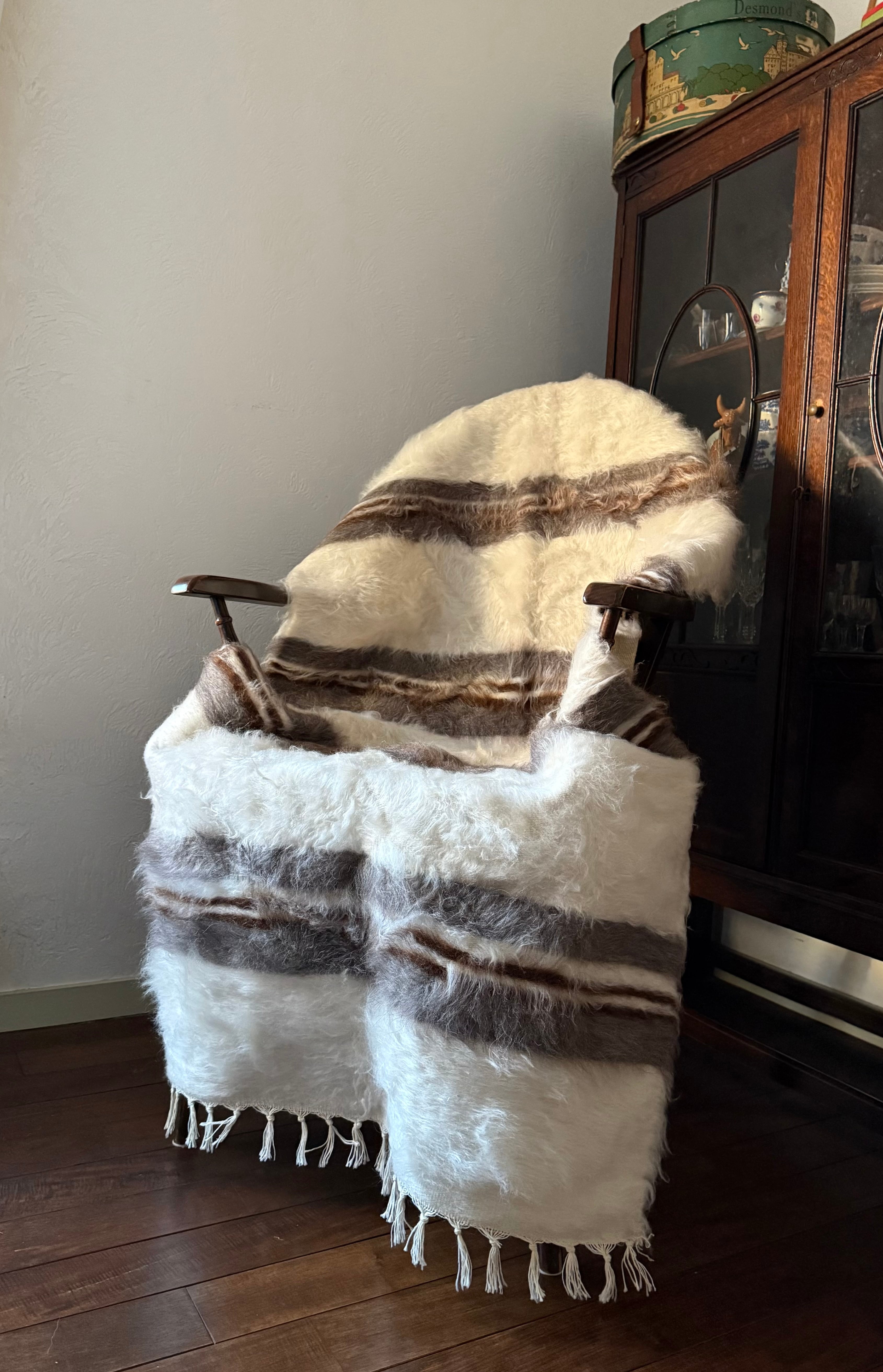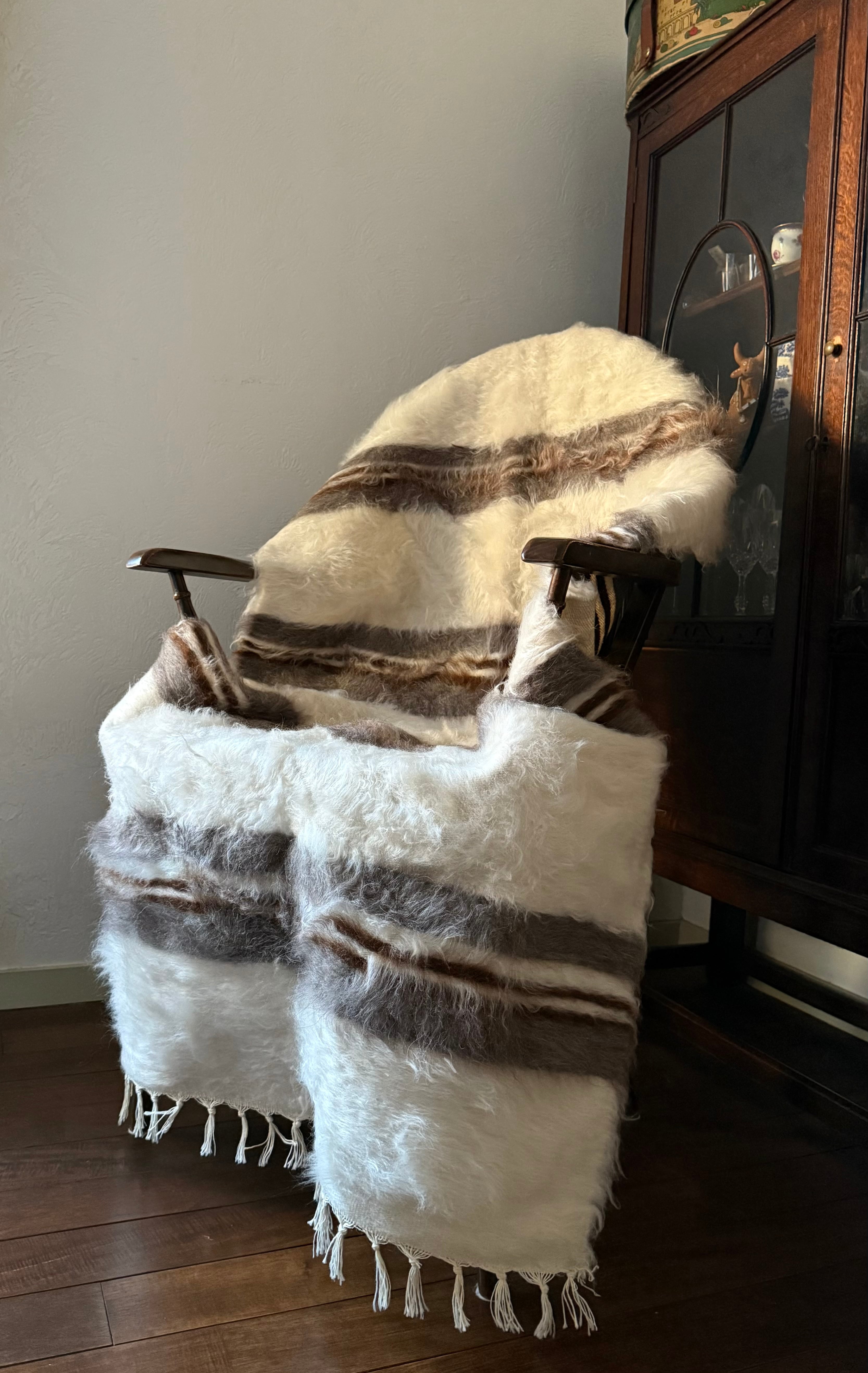 バッターニエは、アンゴラ山羊の毛で織られています。羊やウサギの毛などより、ハリがあり、艶があります。薄着や肌着で座るとほんの少しちくちく感を感じる方がいらっしゃるかもしれません。(また、山羊が座っていた藁やおがくず、木の繊維が毛の中に入っていることがよくあります)