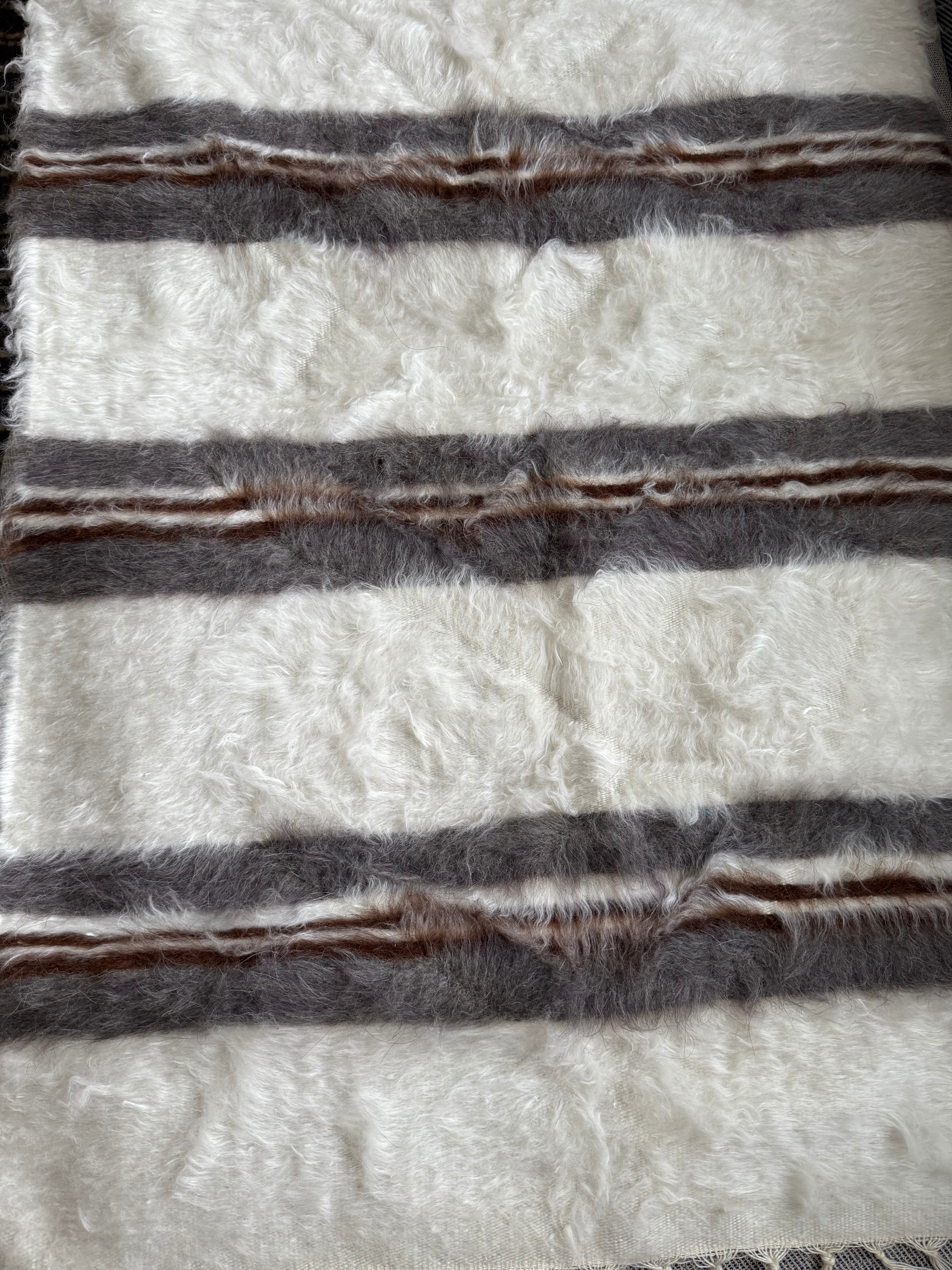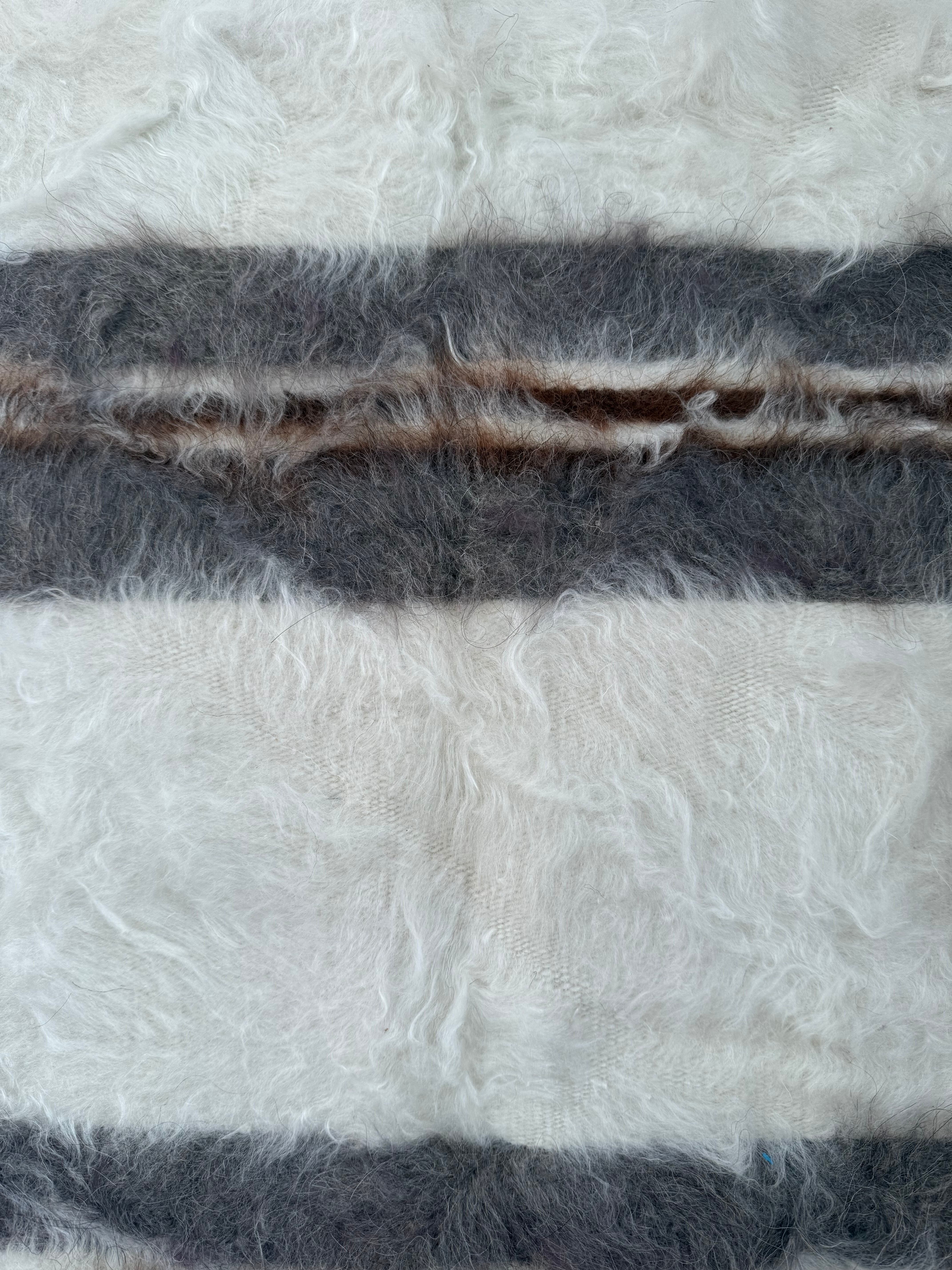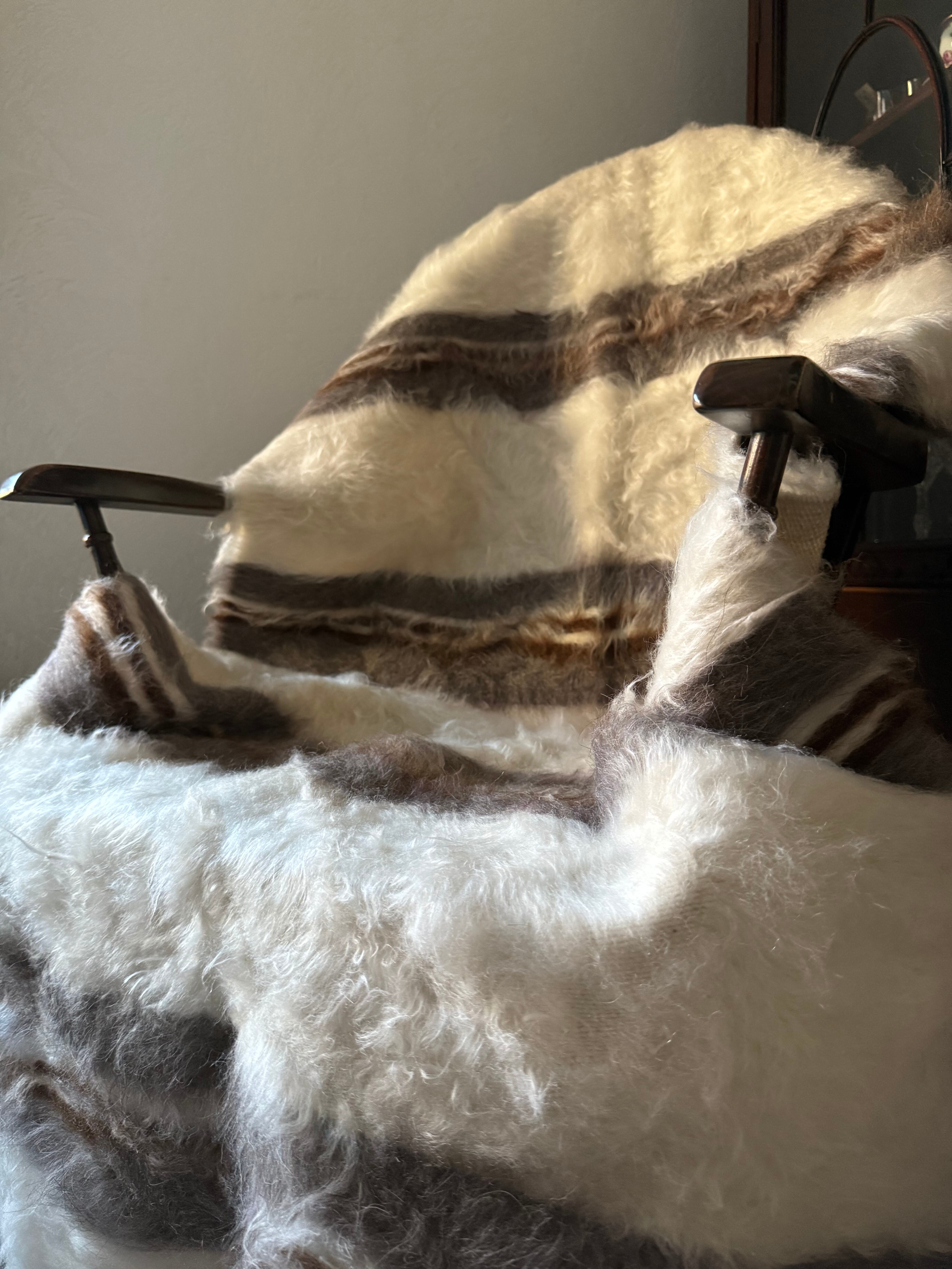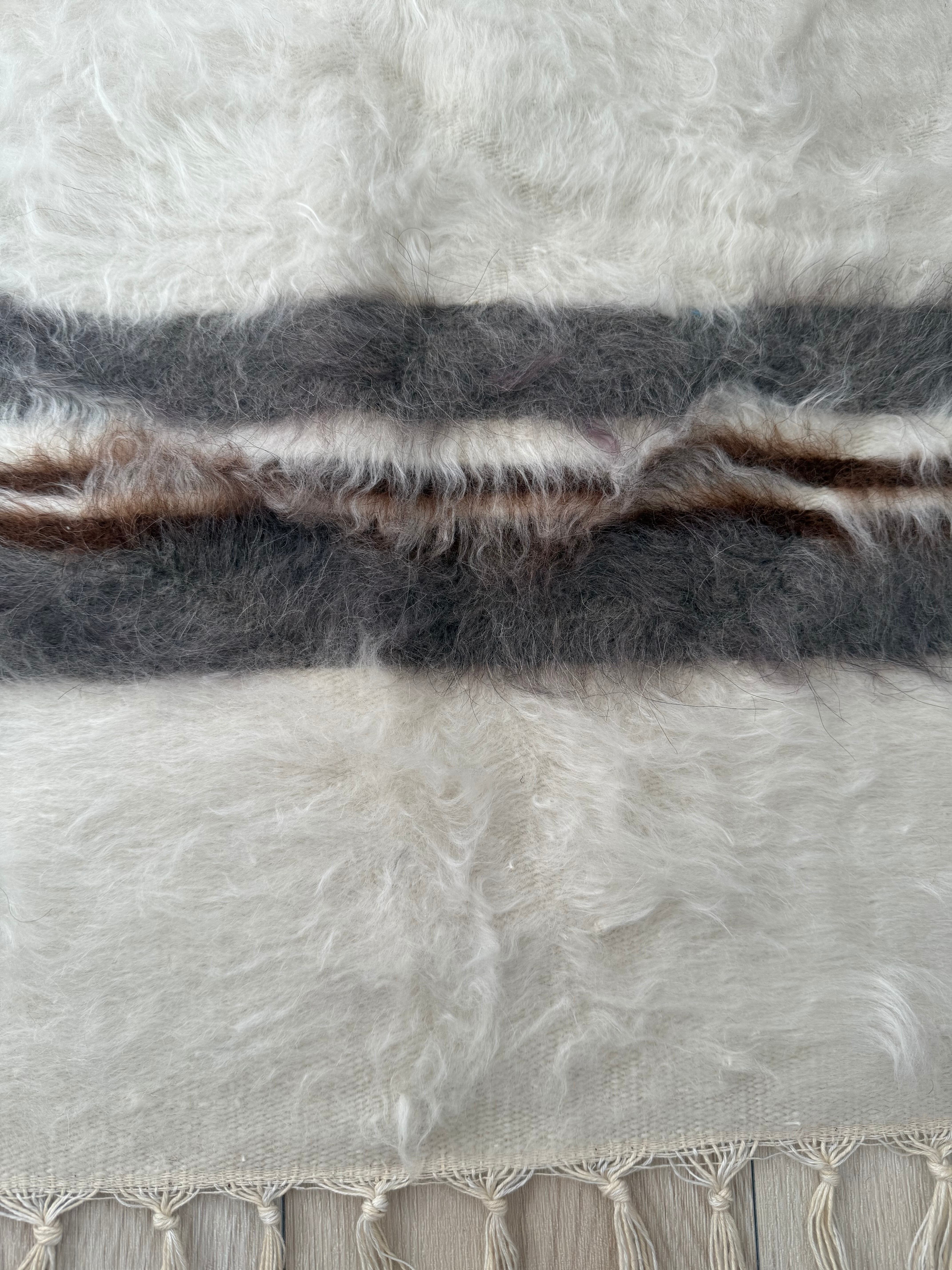 ※こちらは非常に手作り感のある一枚で、毛の中や裏側にいくつか毛糸を結んだ結び目があります。裏側からの写真がわかりやすいので最後の写真をご覧ください。