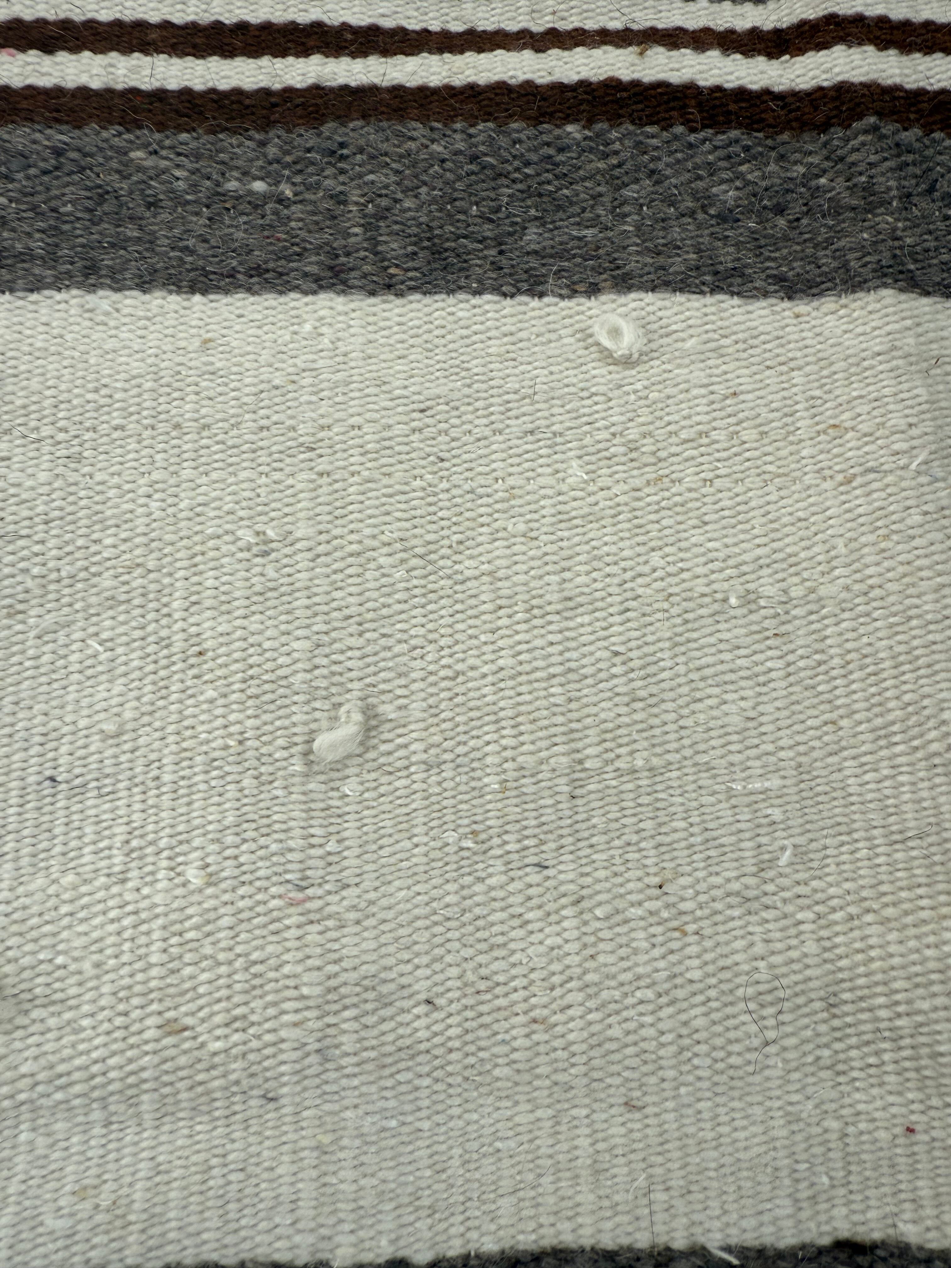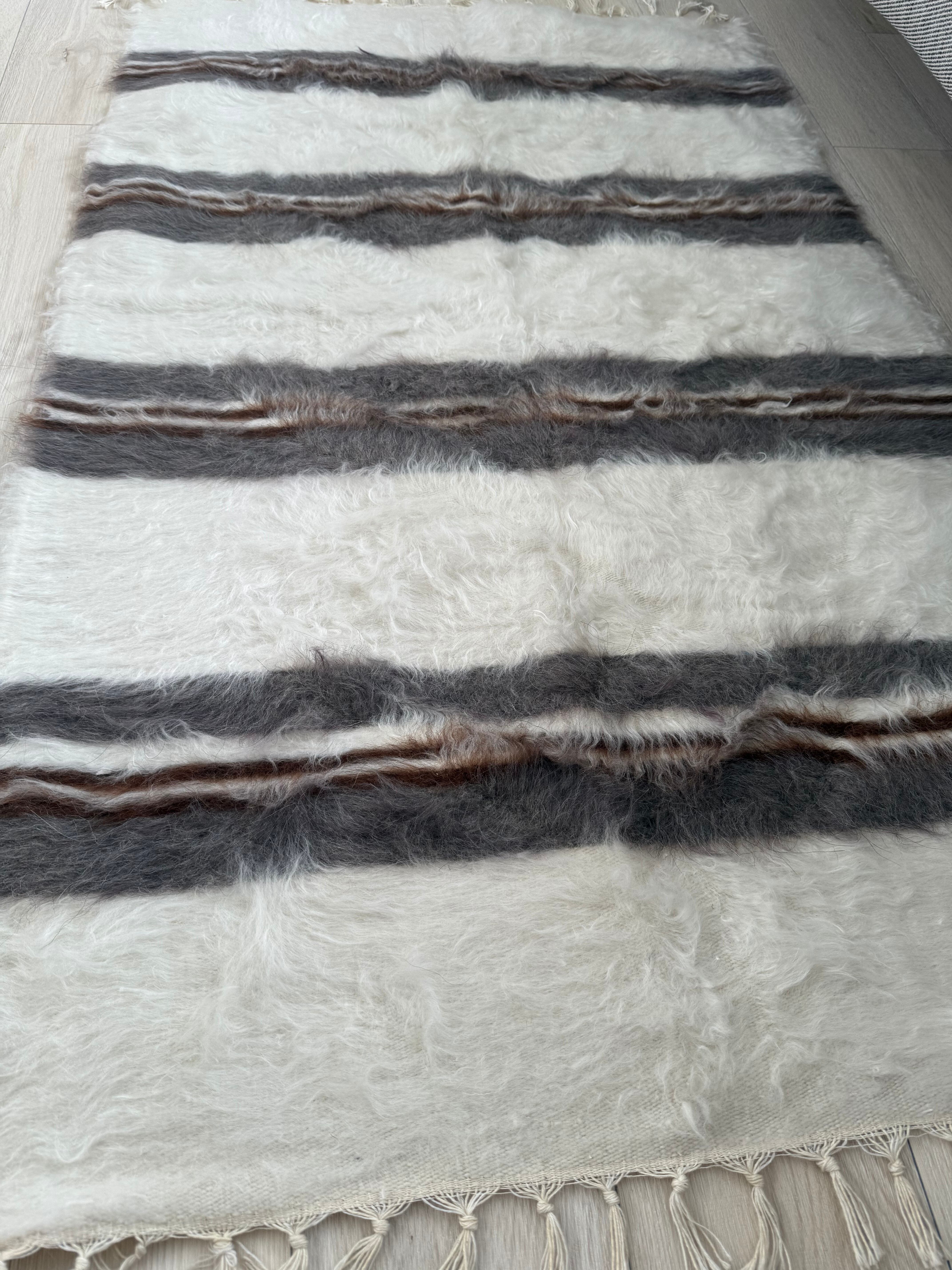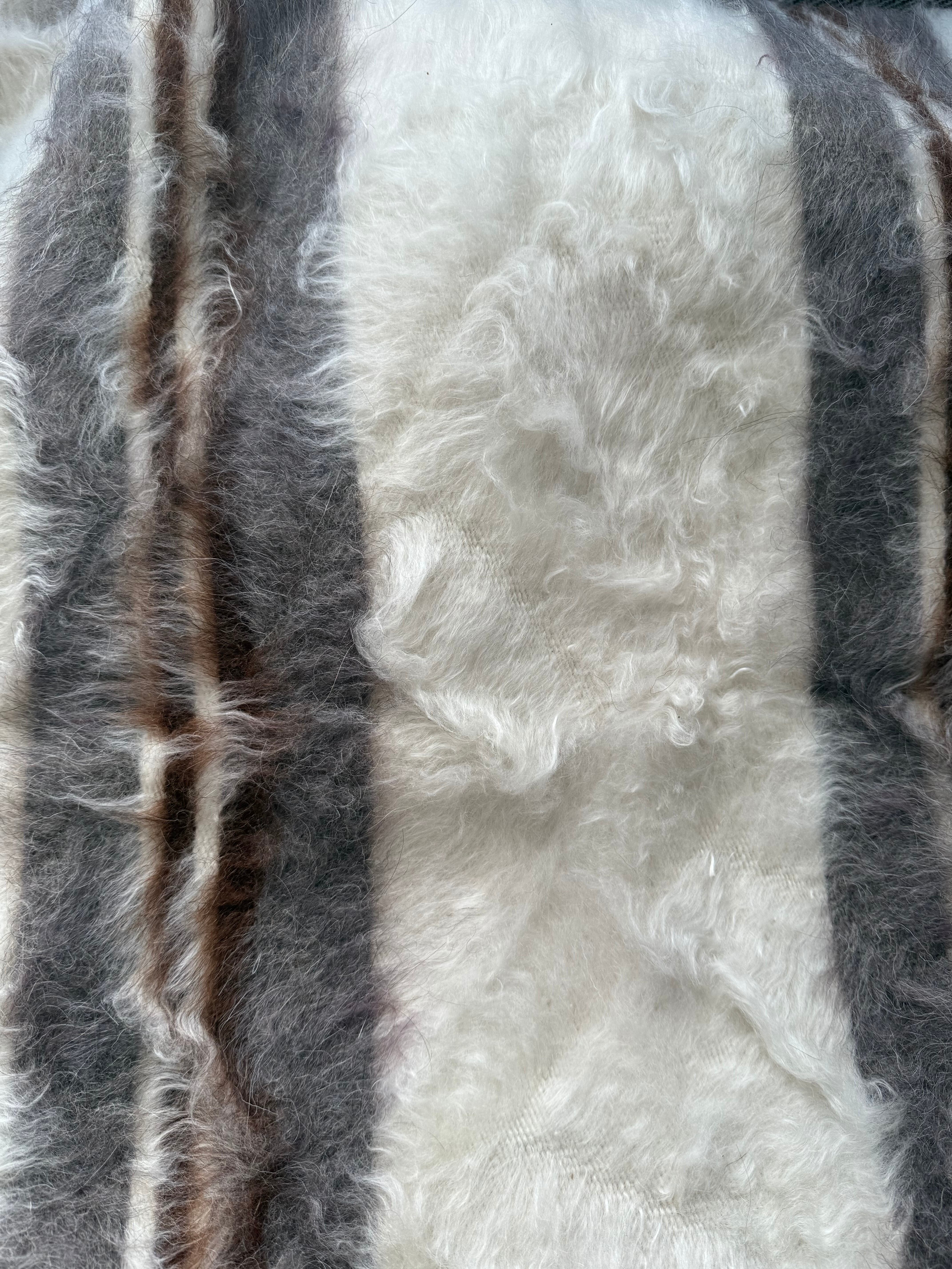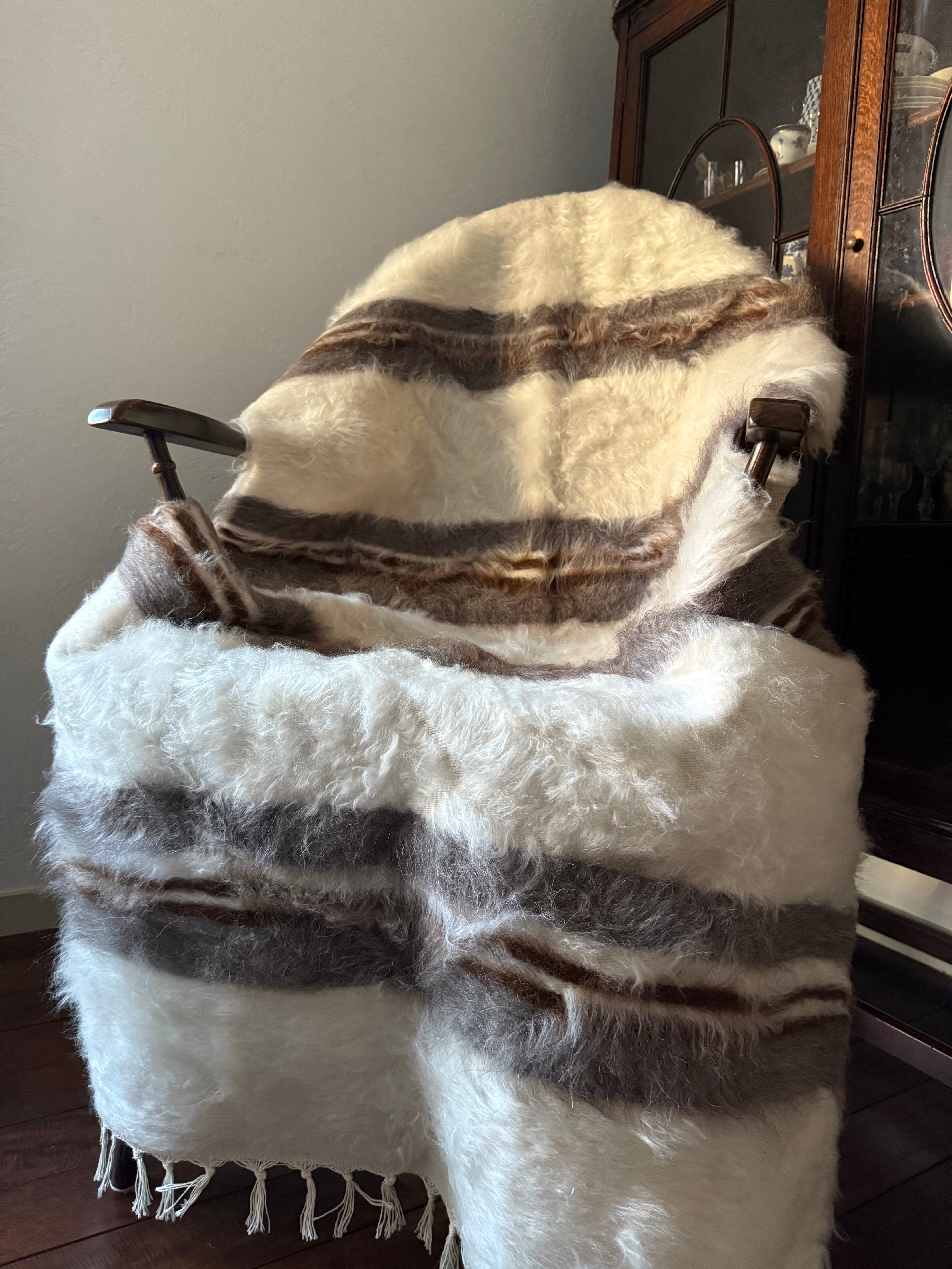 ※こちらは非常に手作り感のある一枚で、毛の中や裏側にいくつか毛糸を結んだ結び目があります。裏側からの写真がわかりやすいので最後の写真をご覧ください。