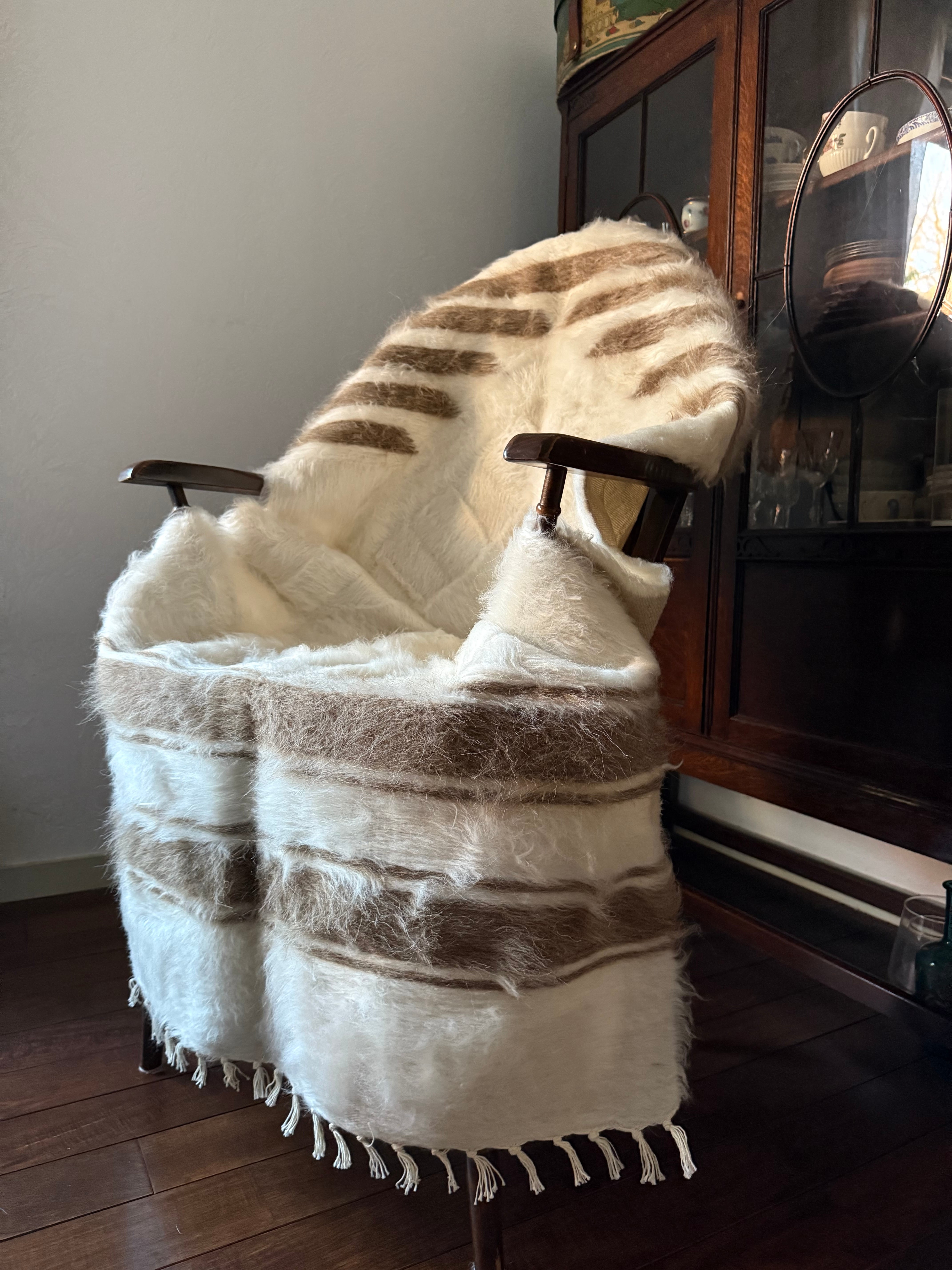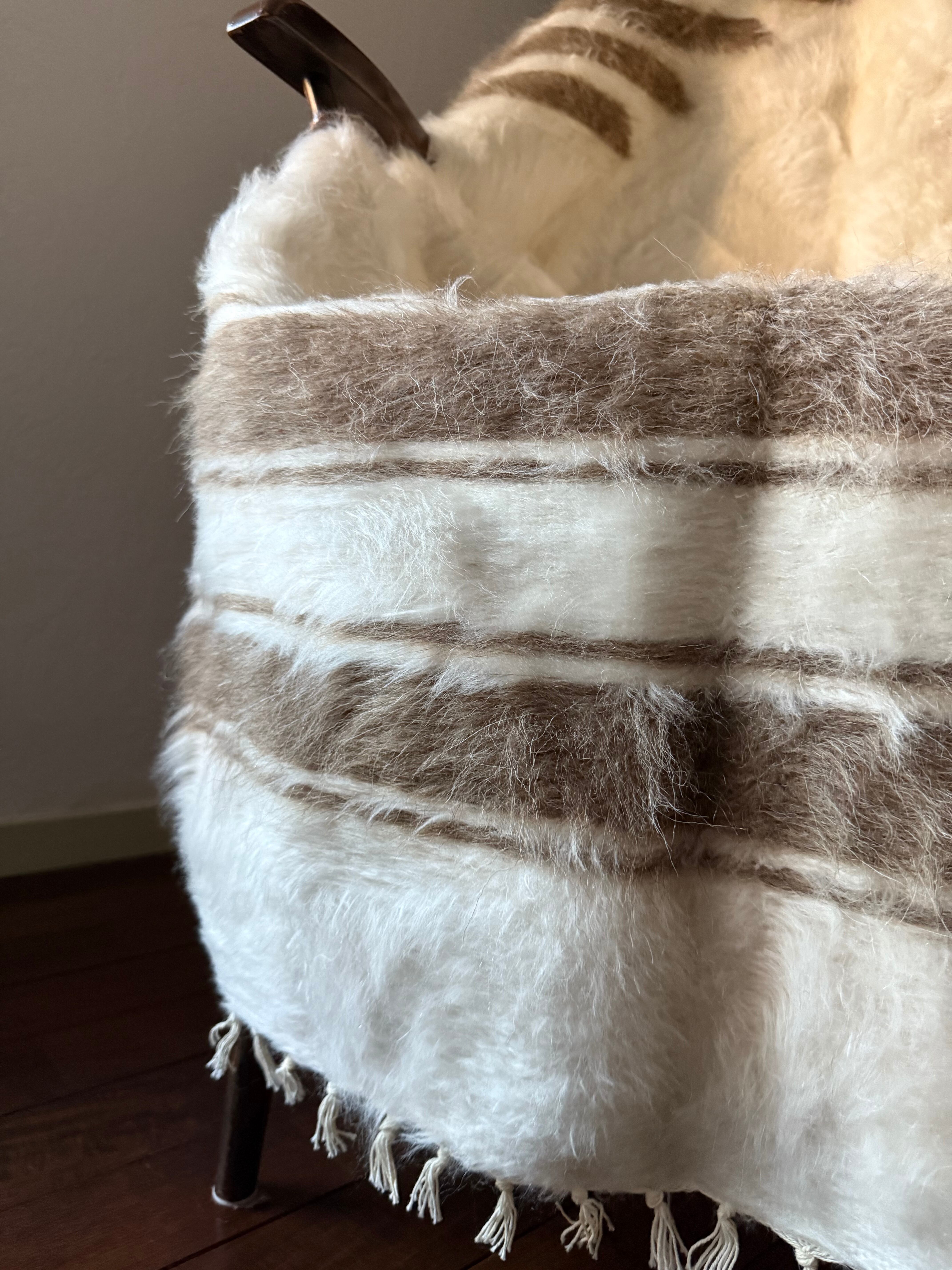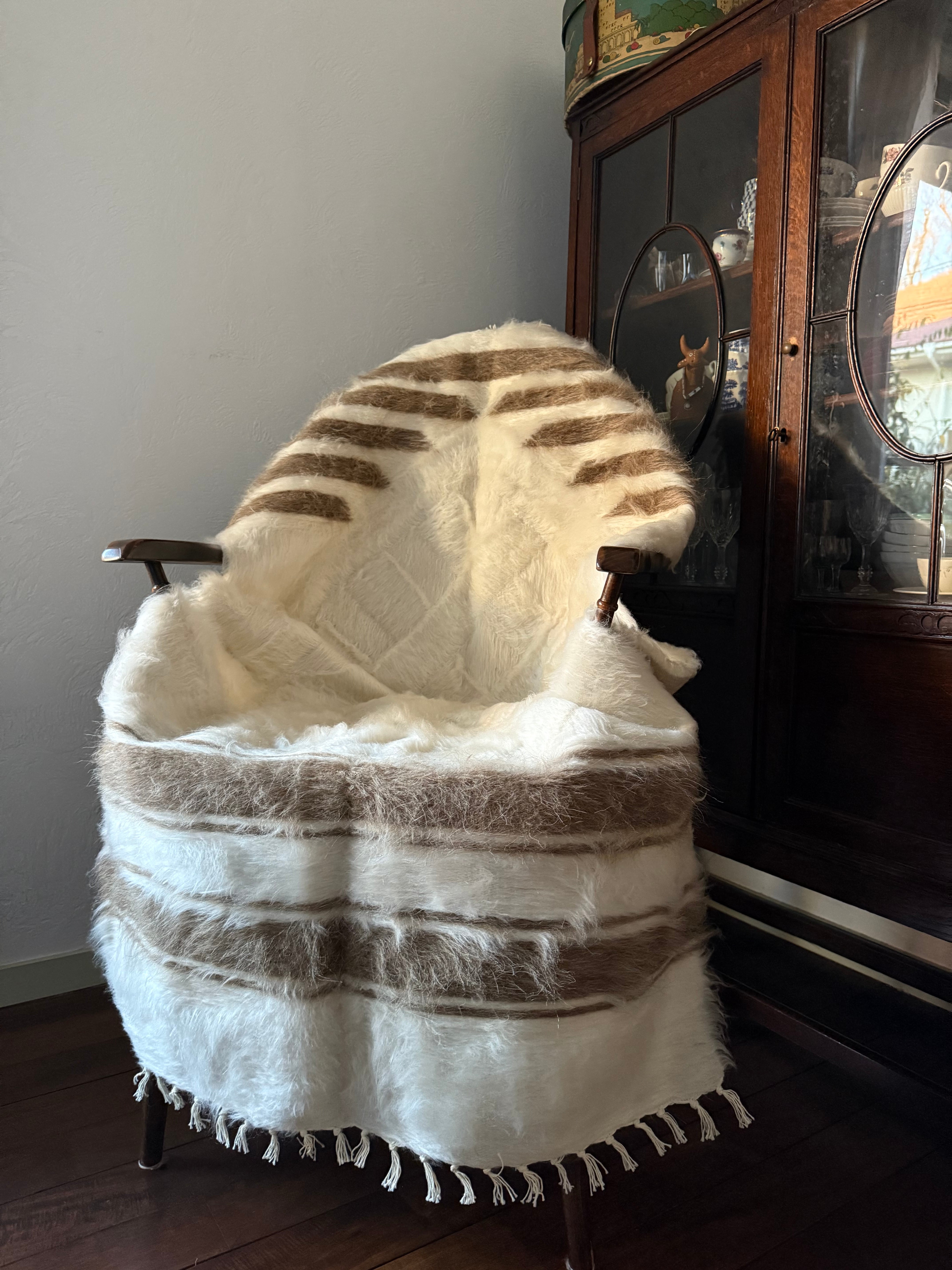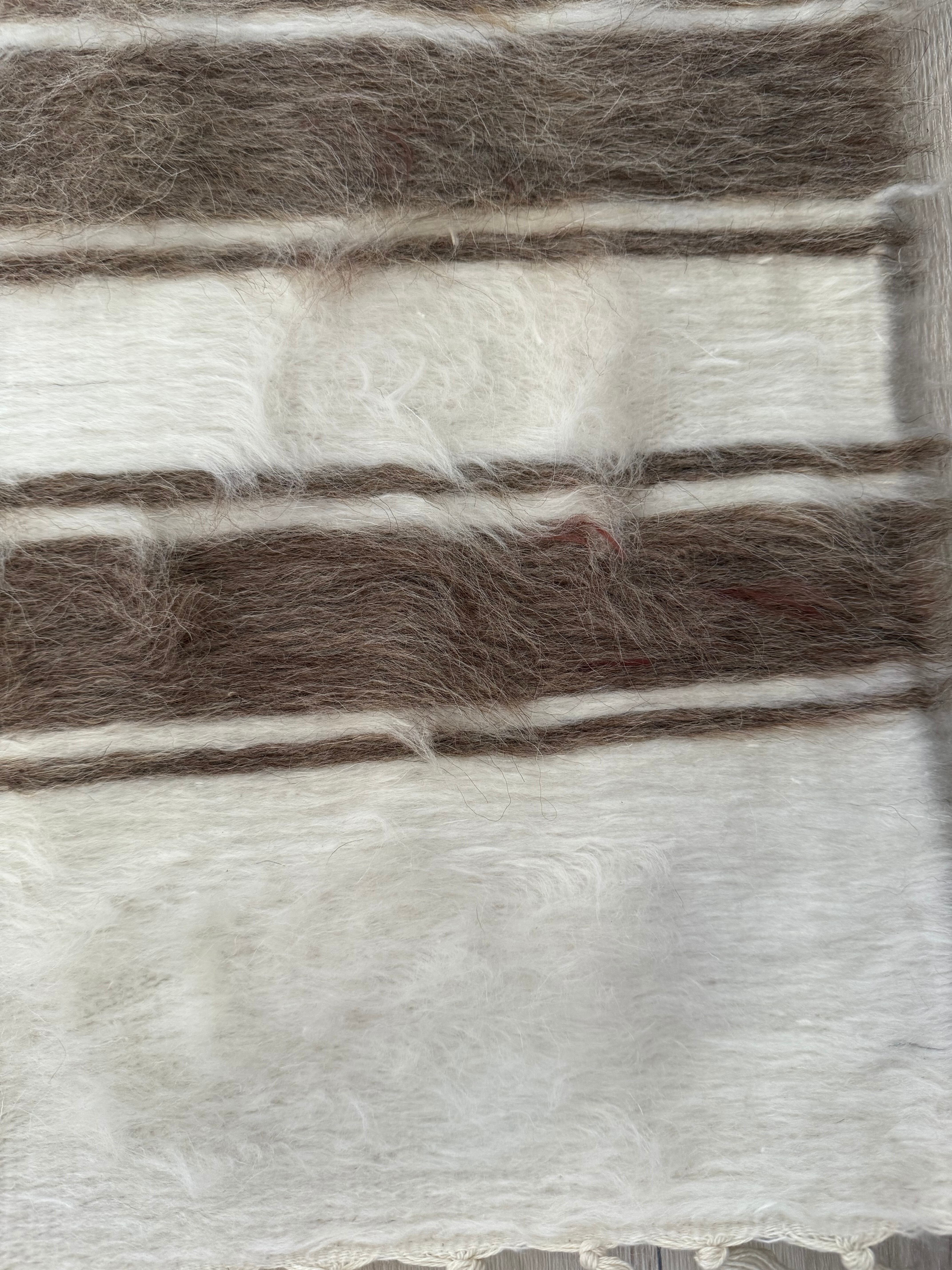バッターニエは、アンゴラ山羊の毛で織られています。こちらはホワイト部分が特にとてもやわらかく、ちくちく感を感じませんでしたが、感覚には個人差がありますのでご了承ください。