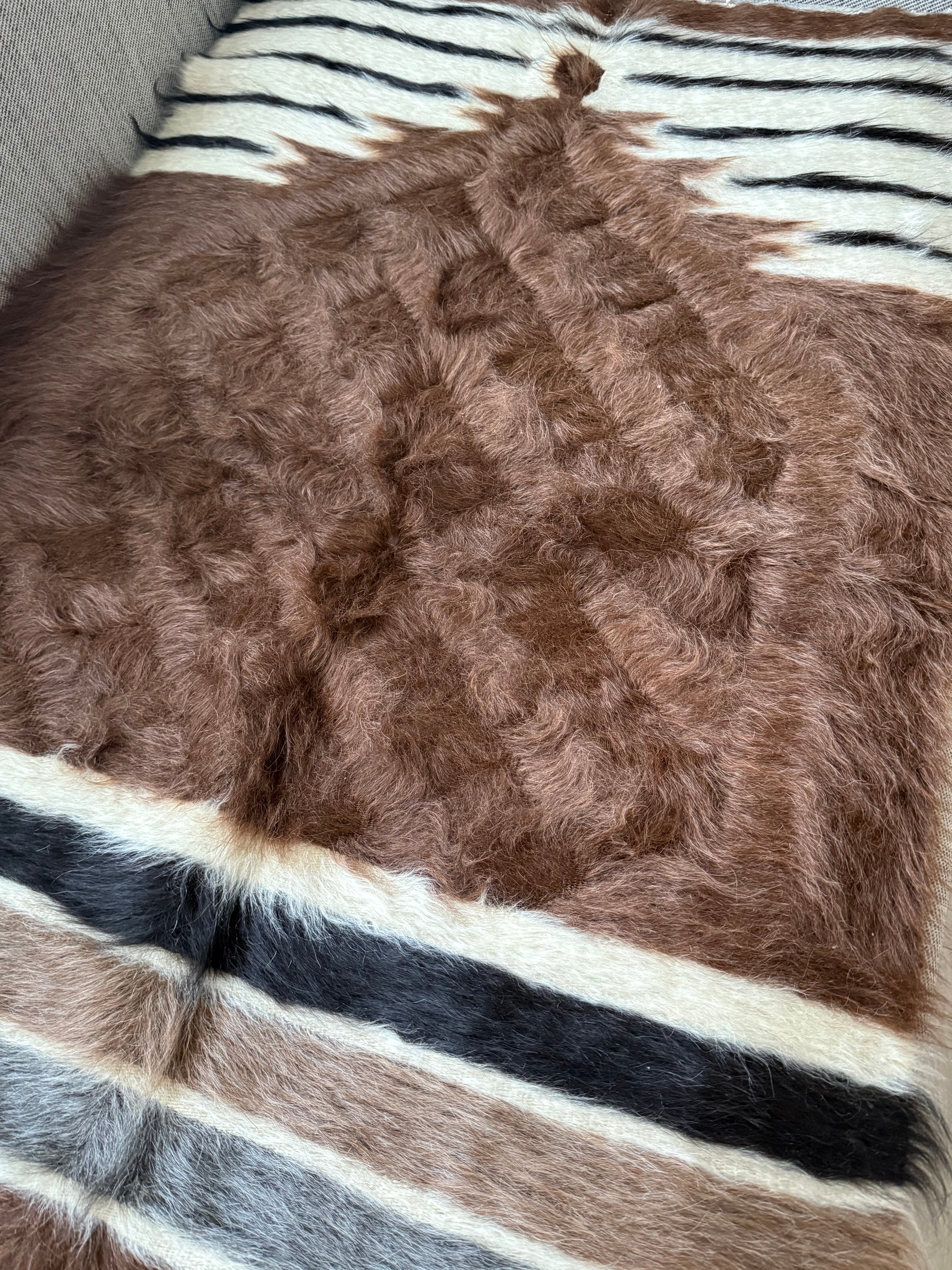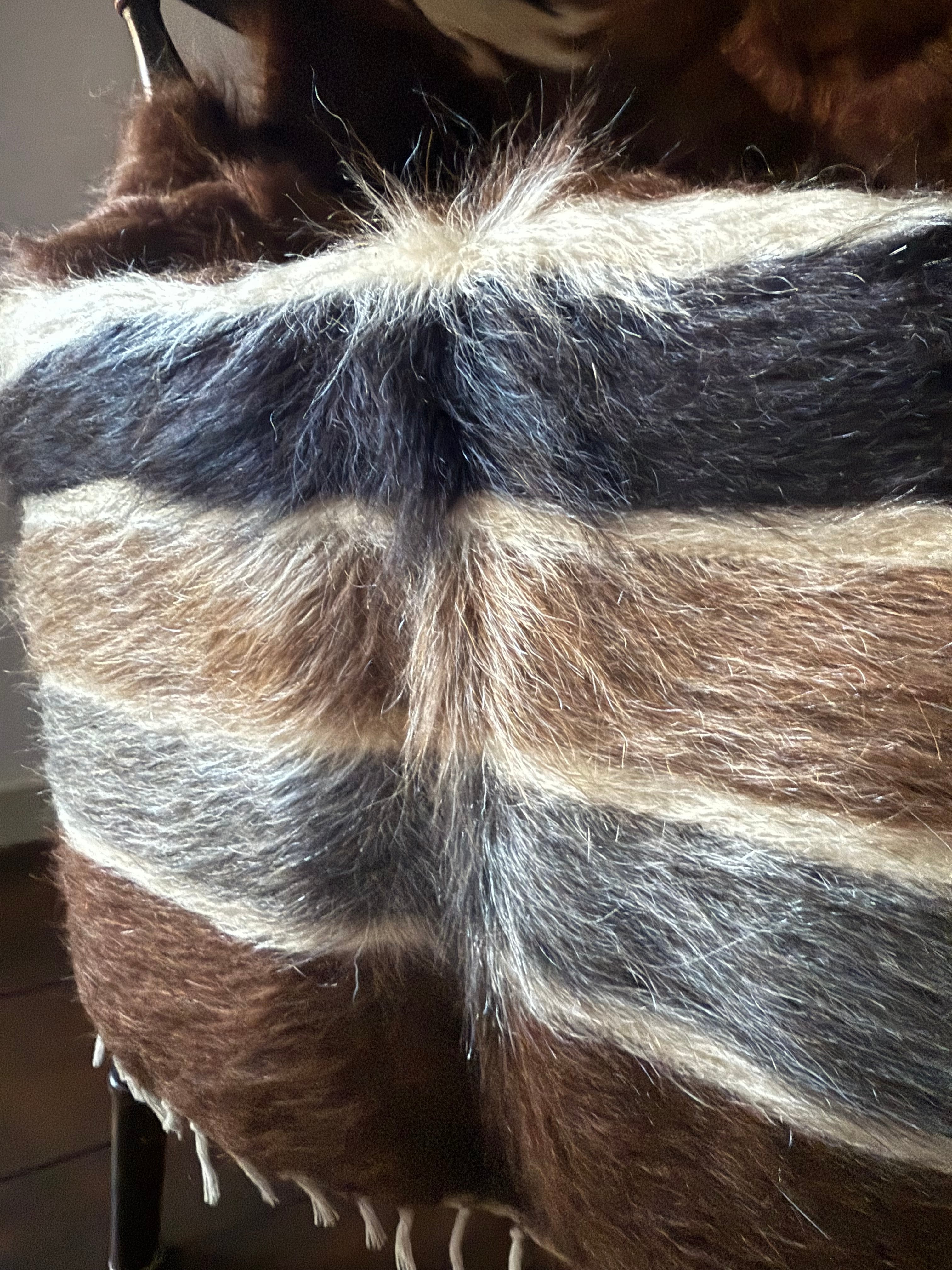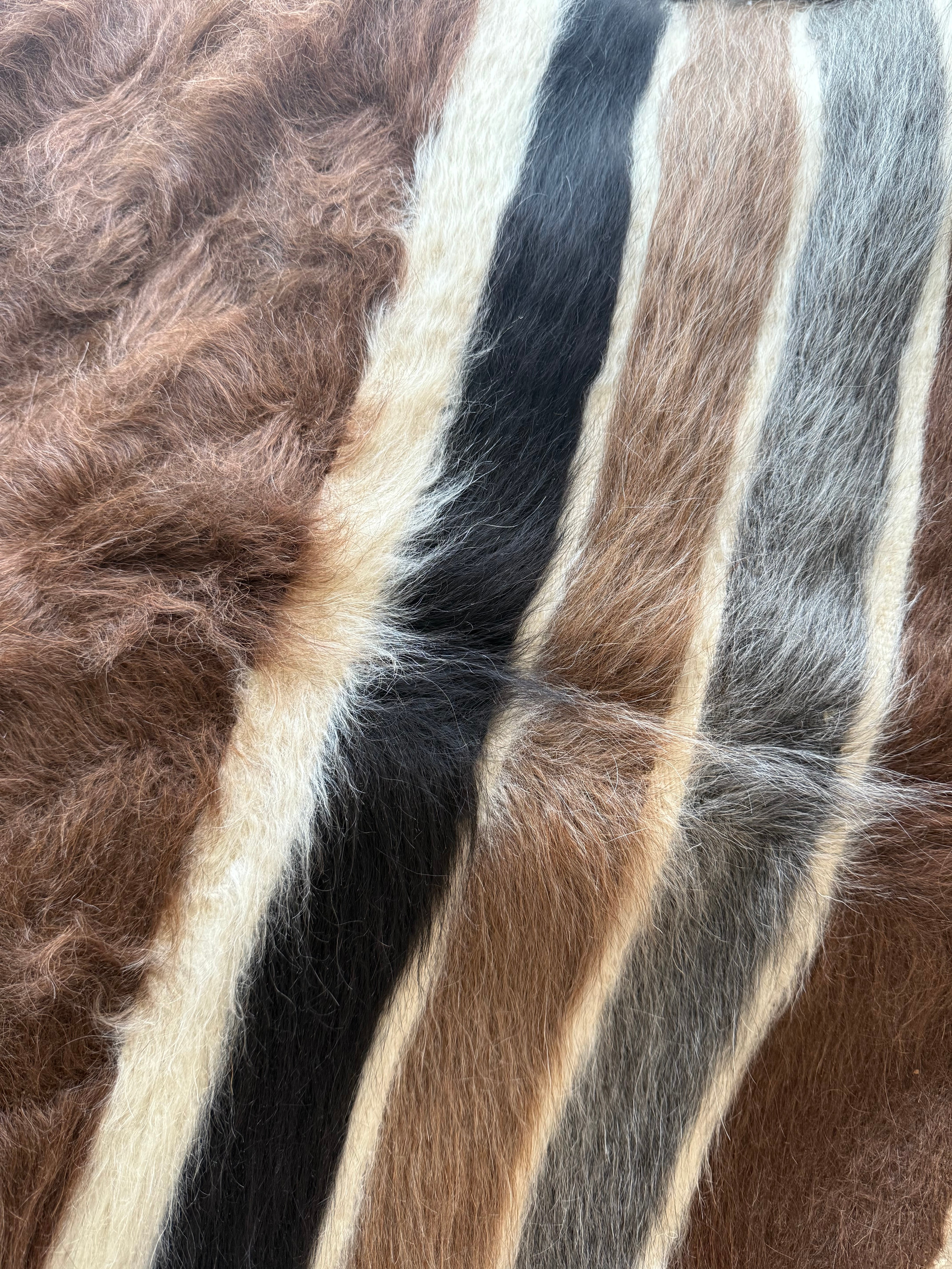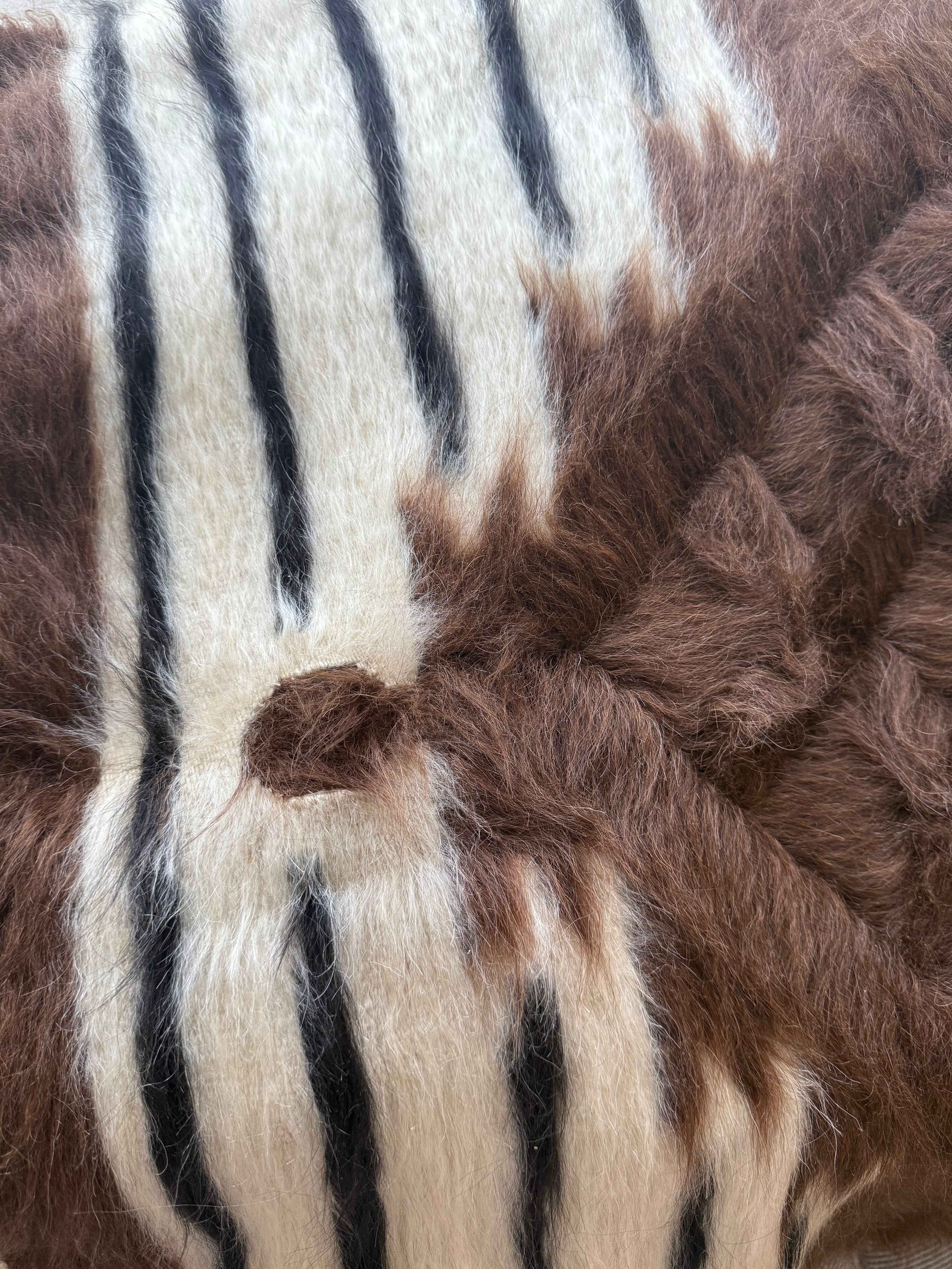 こちらはトップのホワイト部分にブラックのラインが入っているタイプで(ここのラインがブラウンのこともあり、ラインなしのものもあります)、このブラックが全体をきりりと引き締めています。中央のダイヤ柄もはっきりと出ており、毛並みも長く豊かです。