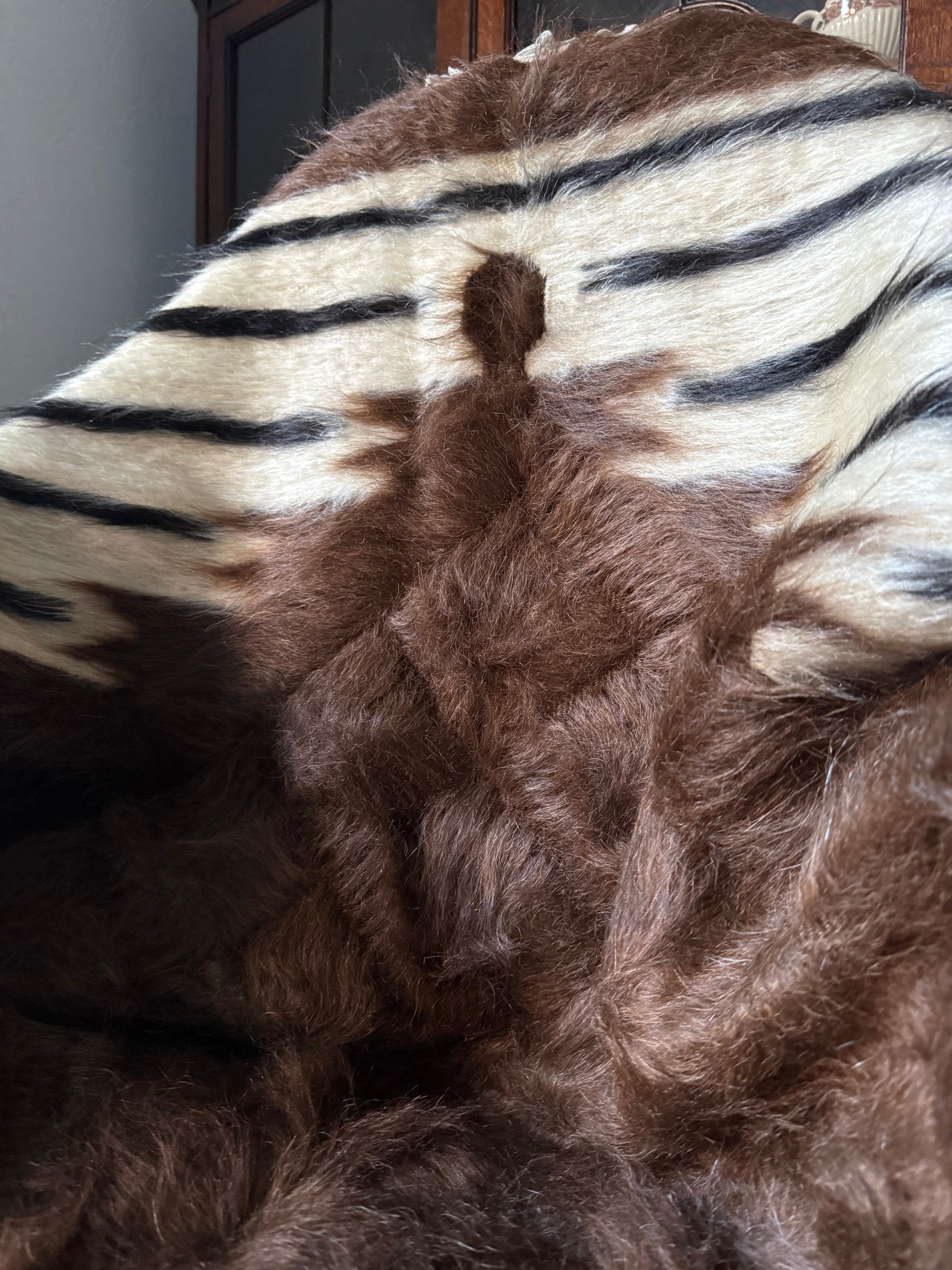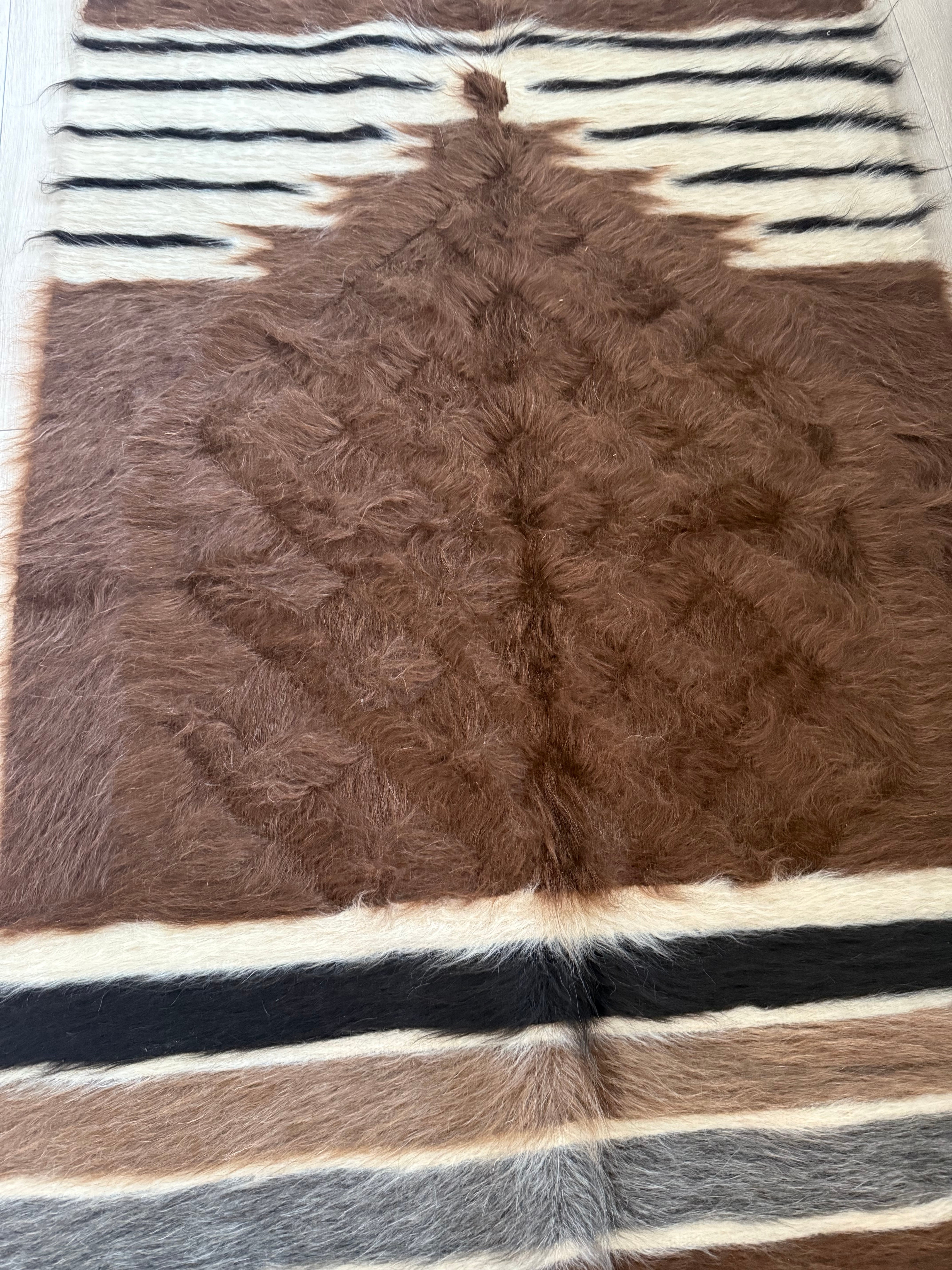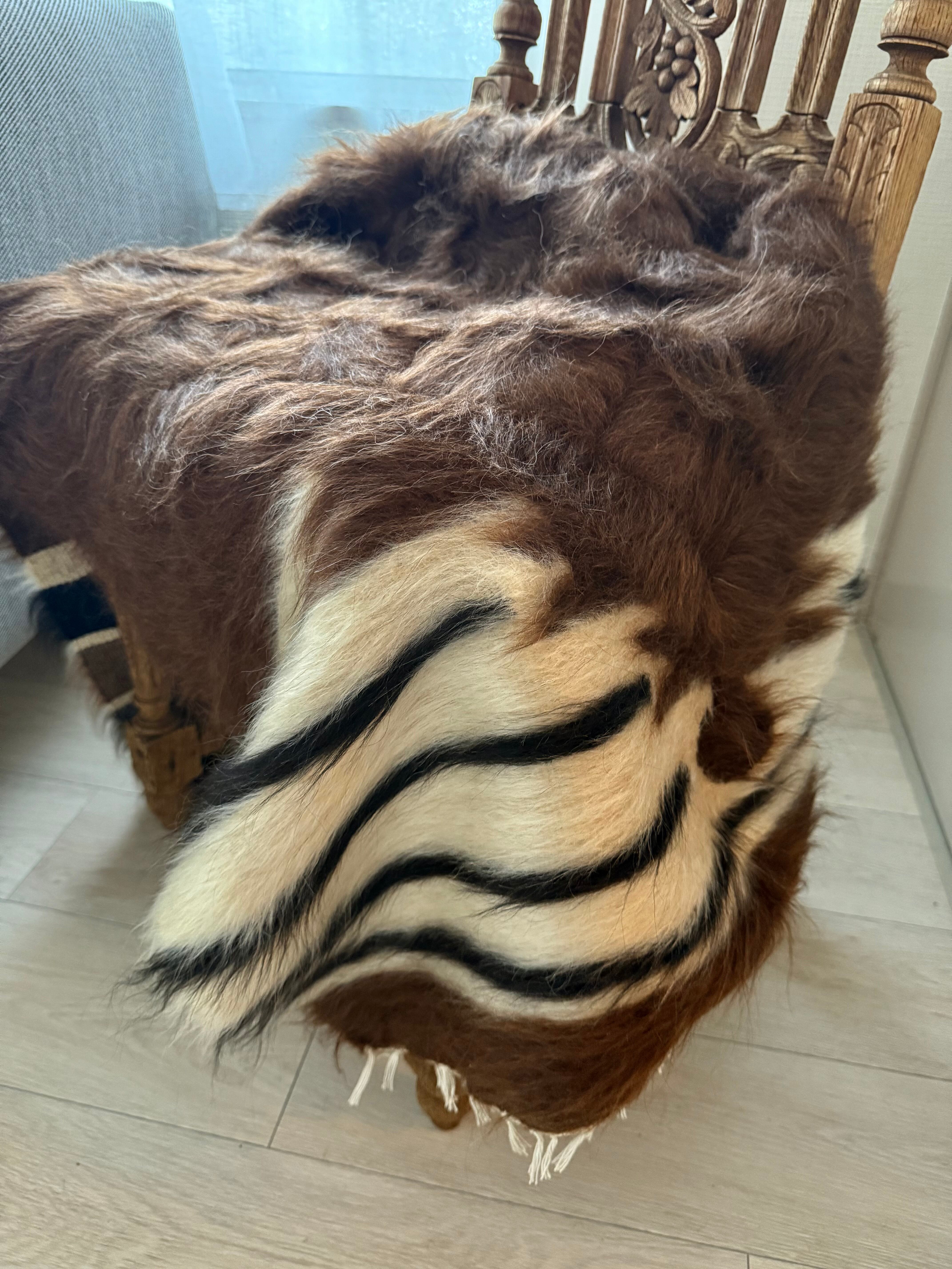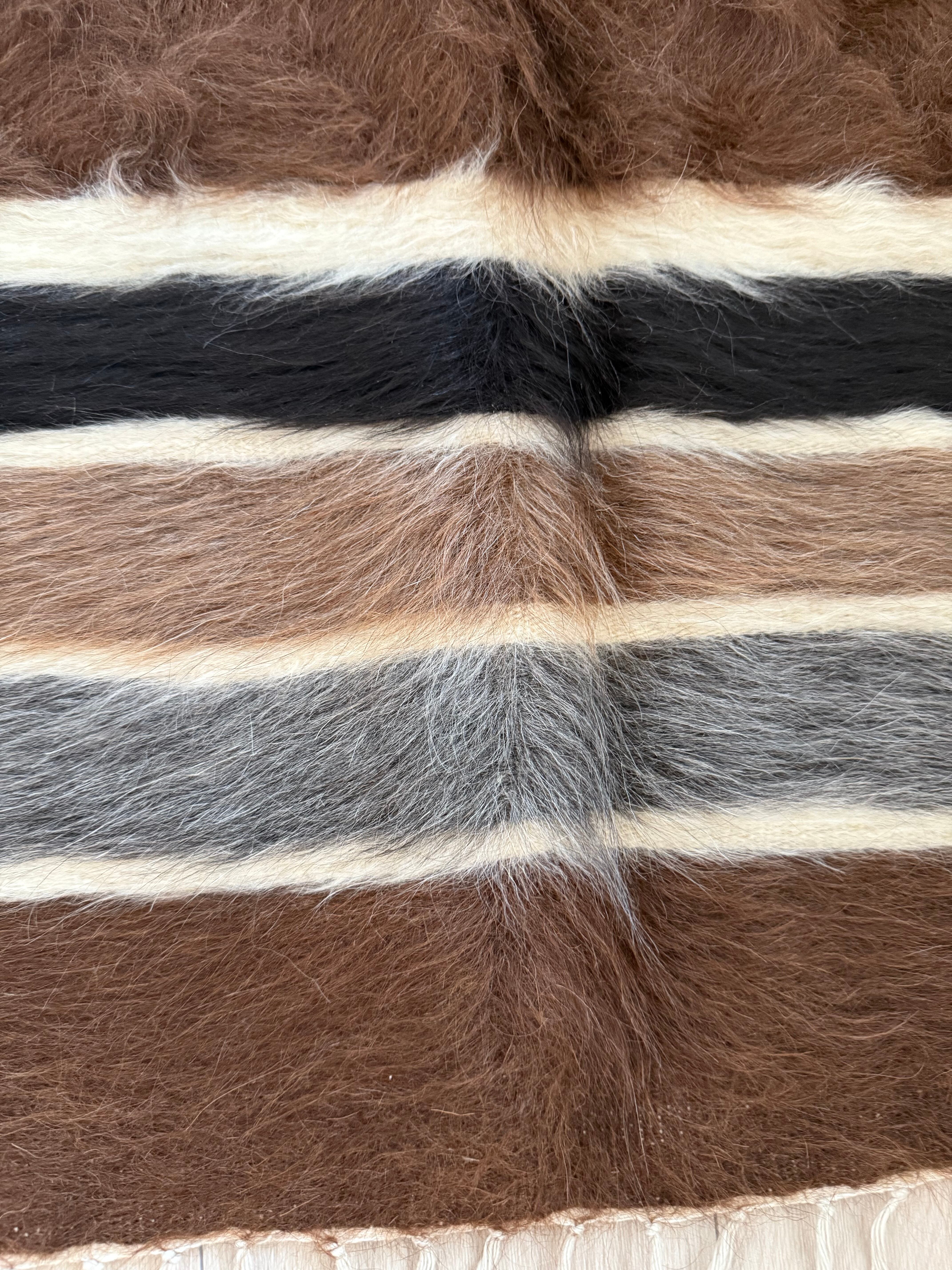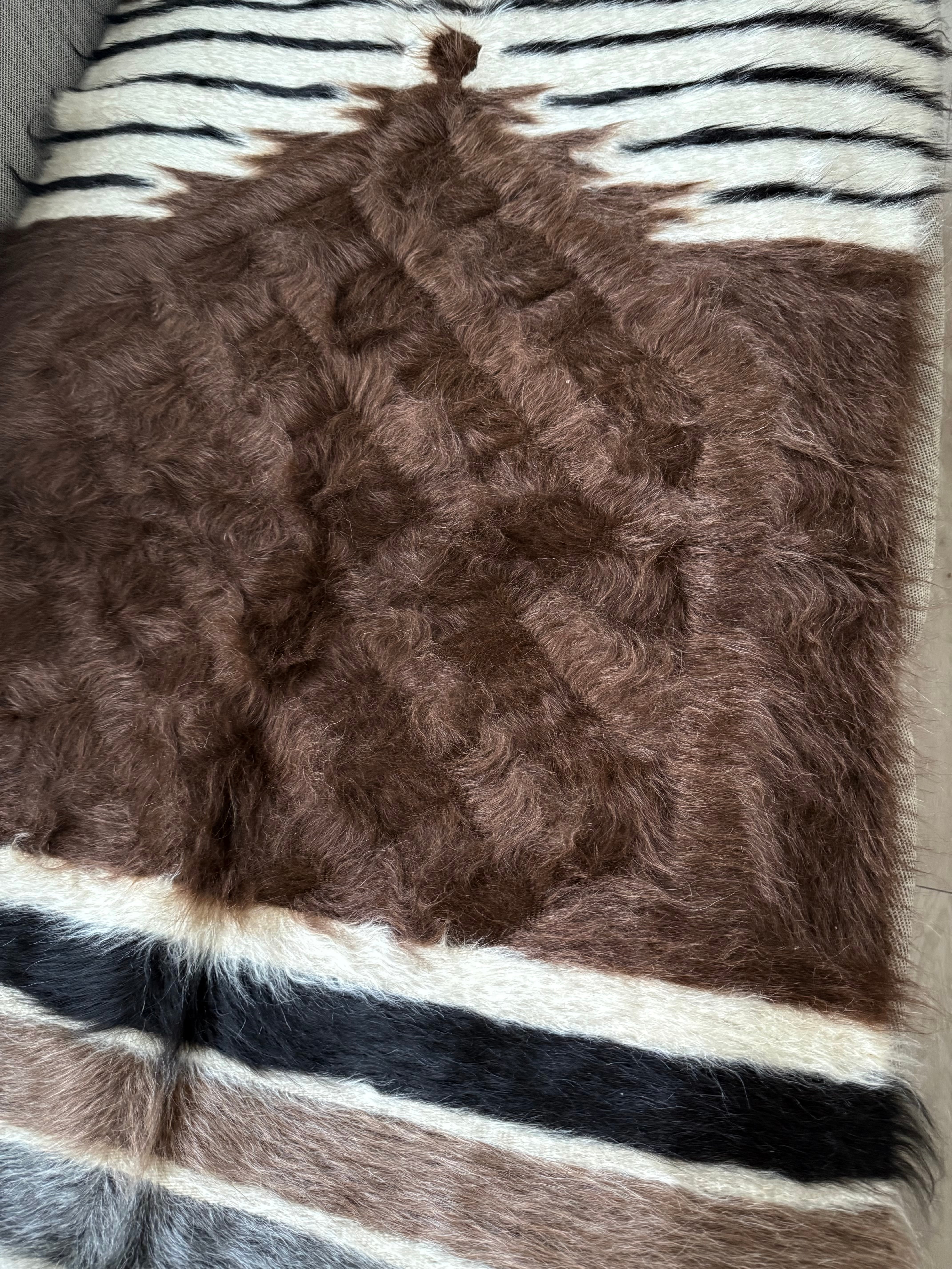 こちらはトップのホワイト部分にブラックのラインが入っているタイプで(ここのラインがブラウンのこともあり、ラインなしのものもあります)、このブラックが全体をきりりと引き締めています。中央のダイヤ柄もはっきりと出ており、毛並みも長く豊かです。