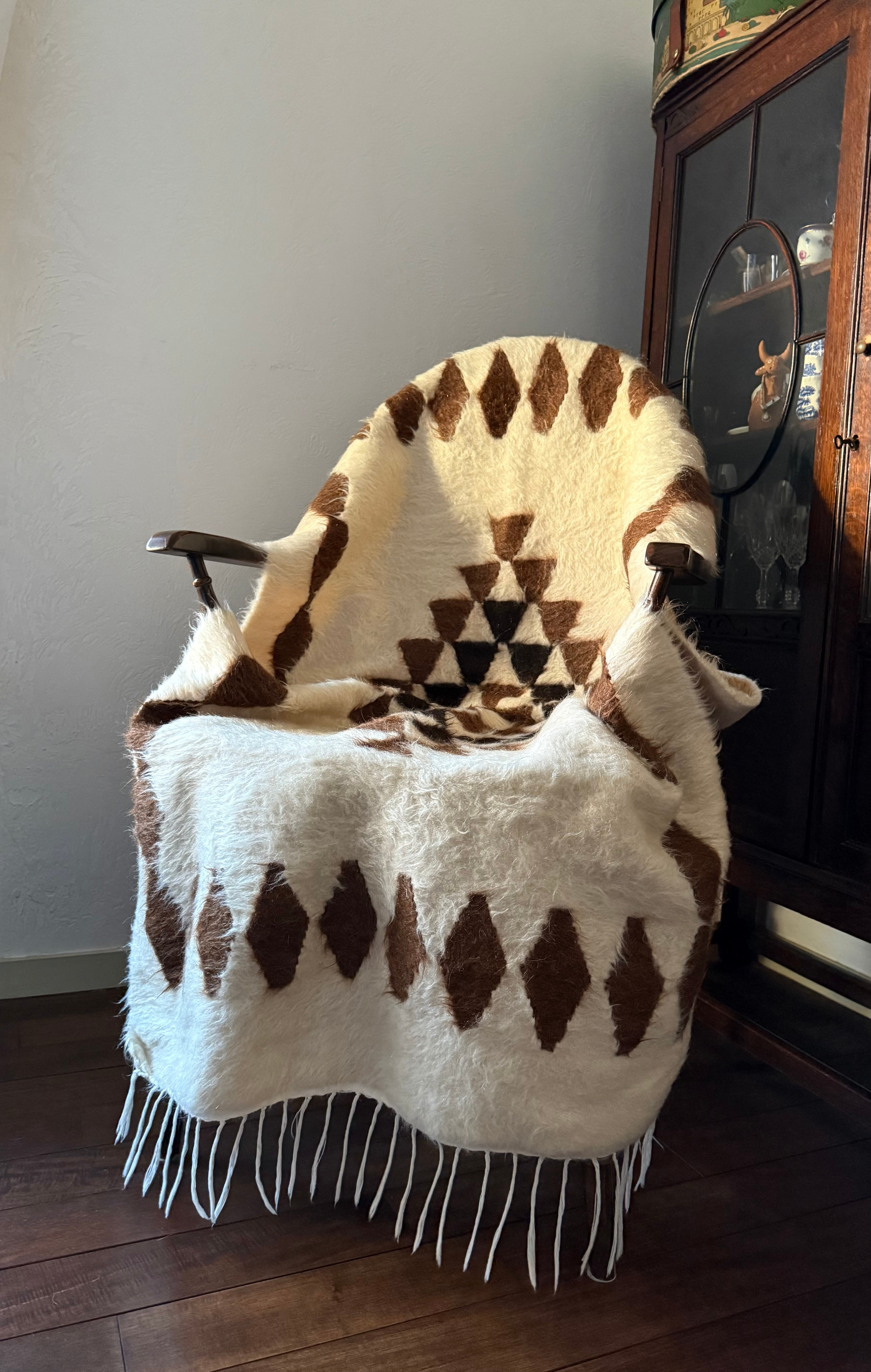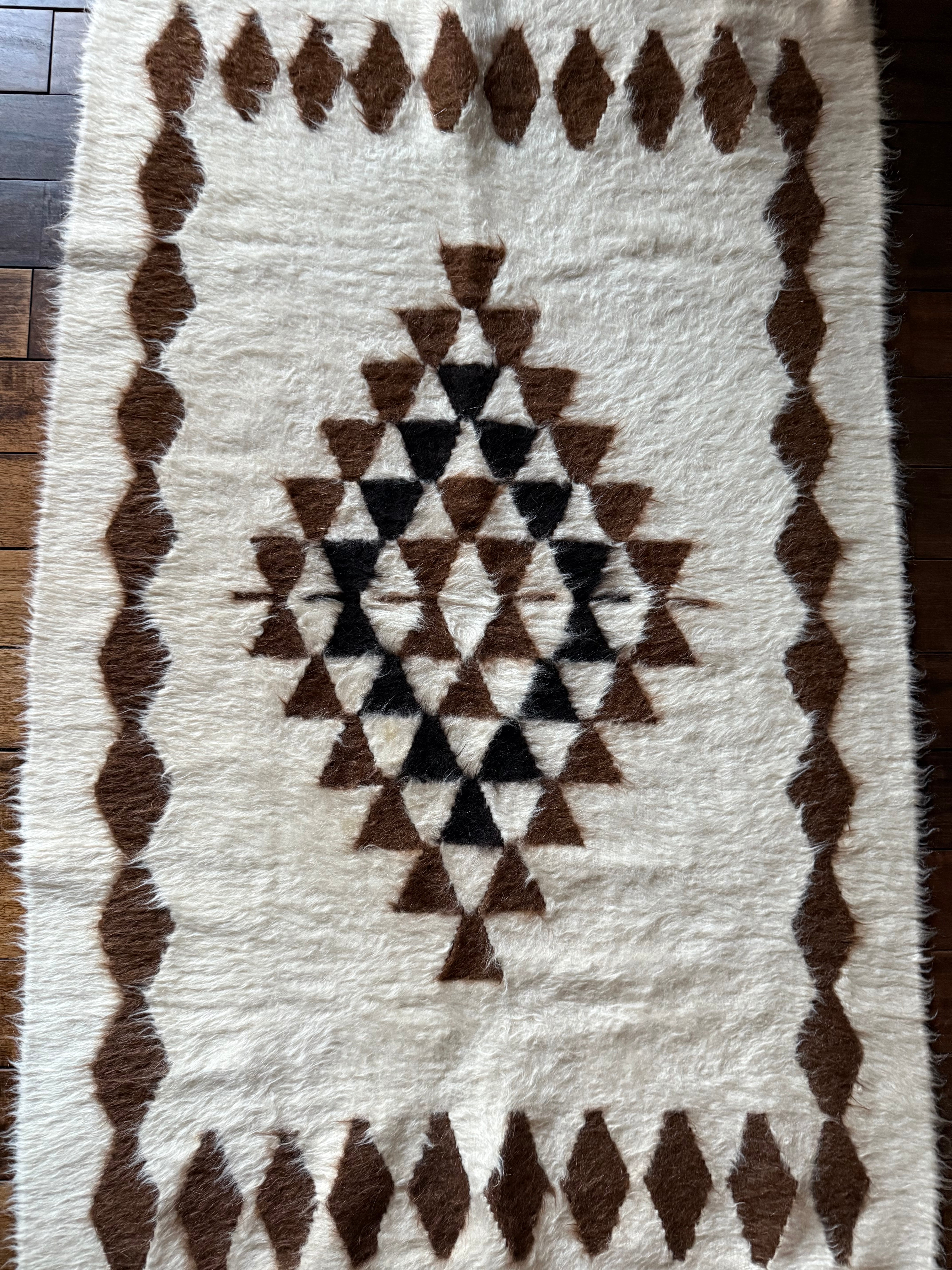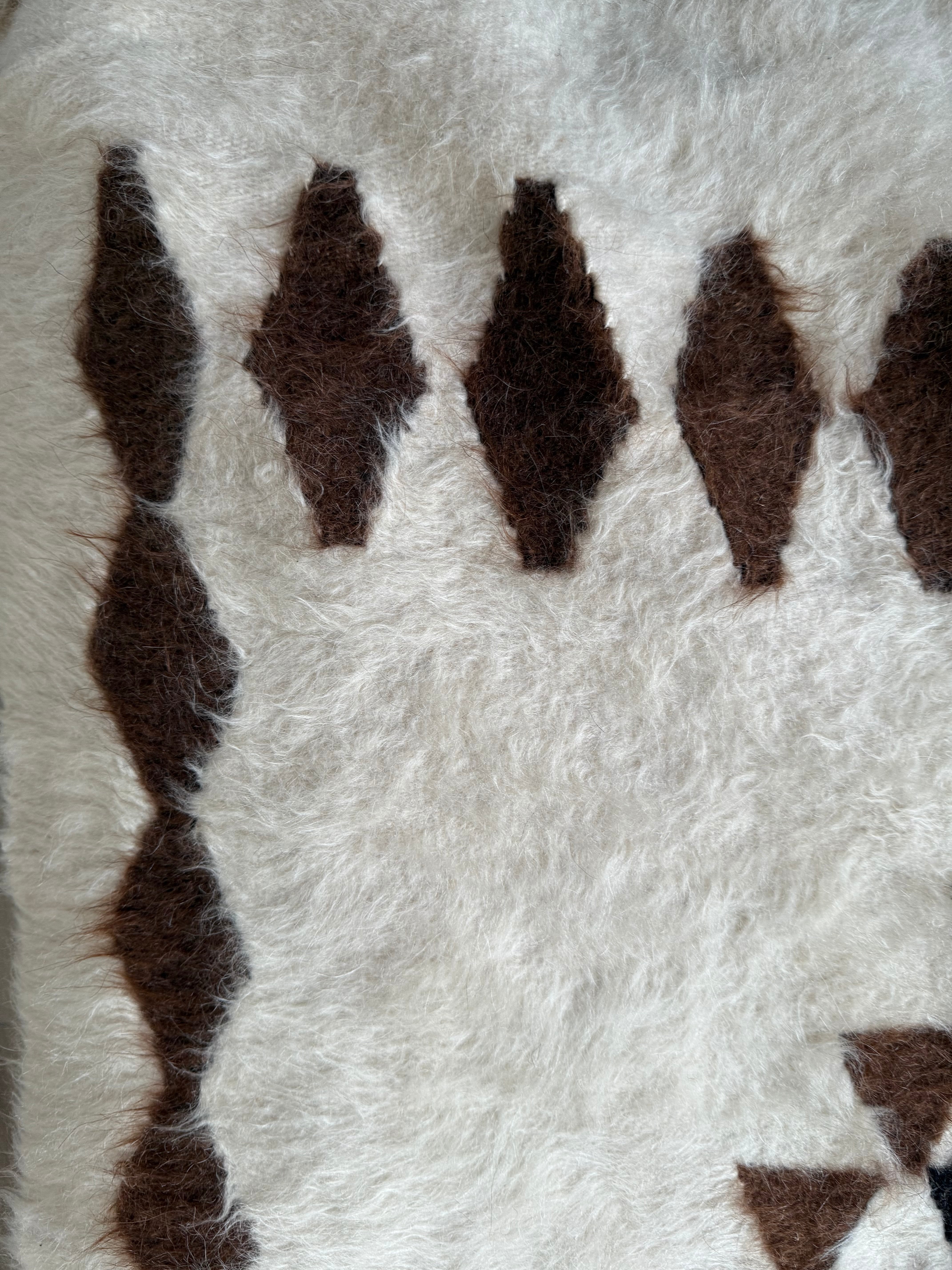 これは非常に珍しいパターン。ブラウンとブラックのダイヤ柄が全面にいくつもデザインされています。中央に描かれている三角の柄は、遊牧民の間では魔除けとしてよく使われる柄です(日本の蛇を表す鱗文と同じですね)。