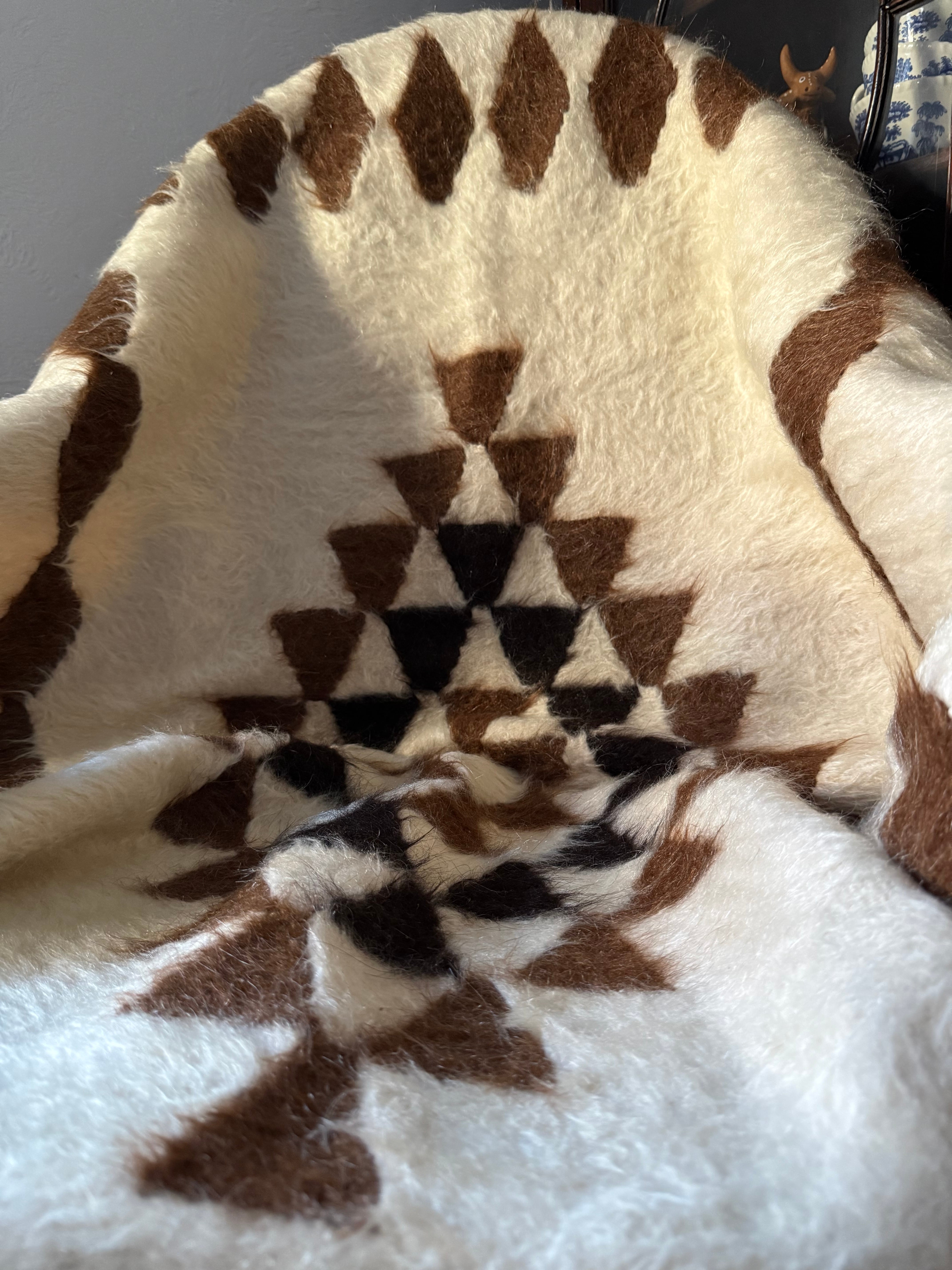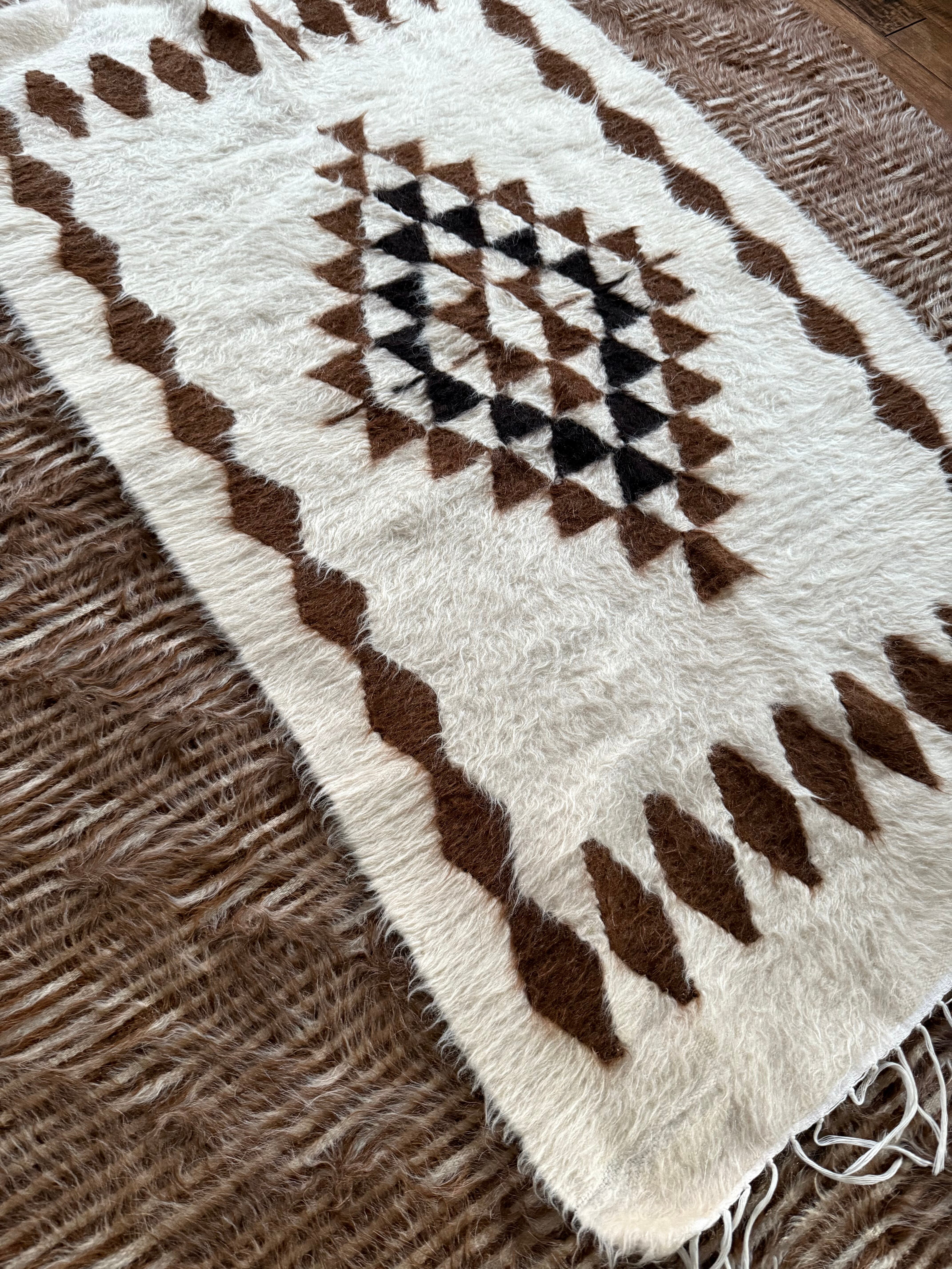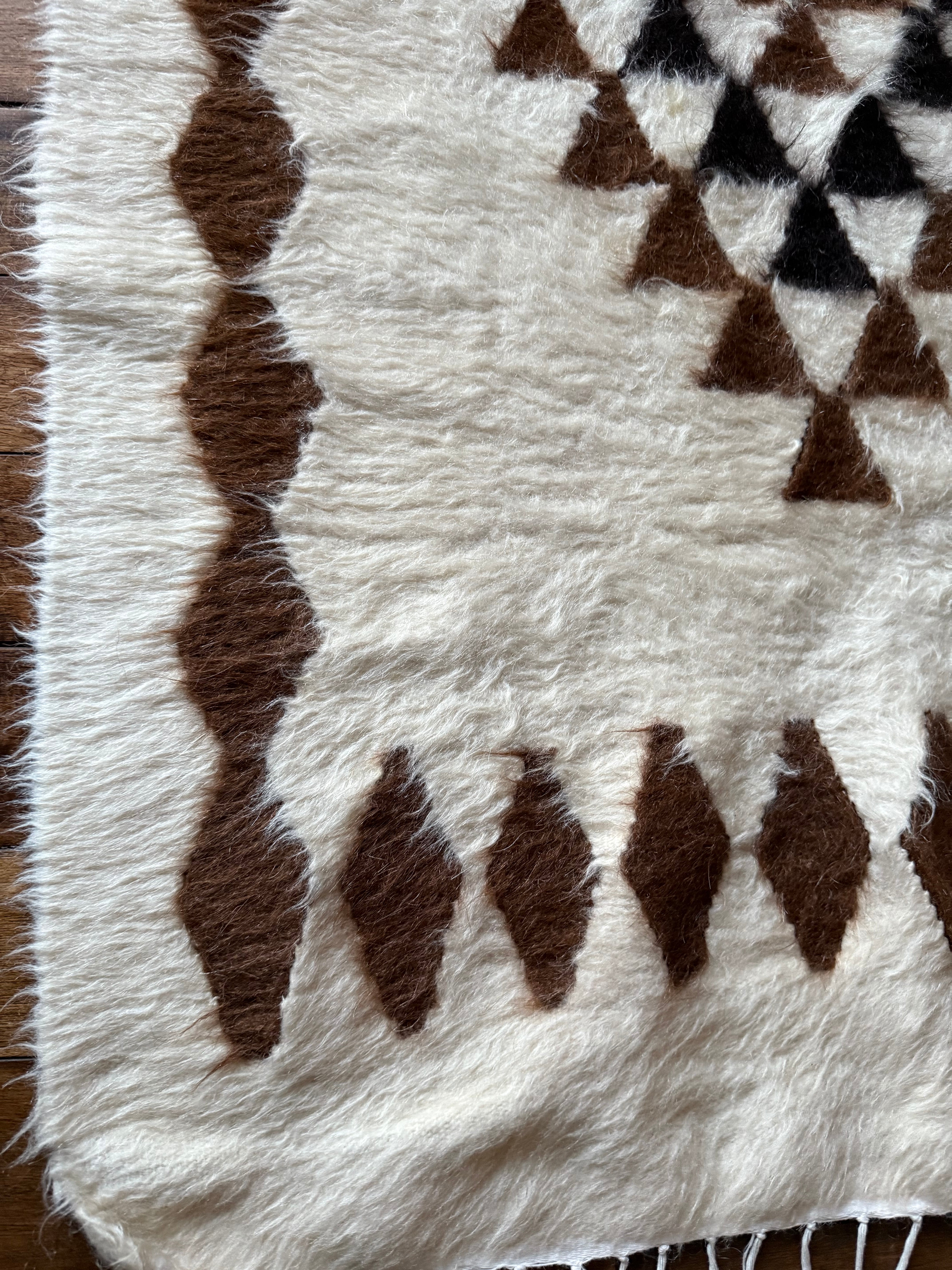 これは非常に珍しいパターン。ブラウンとブラックのダイヤ柄が全面にいくつもデザインされています。中央に描かれている三角の柄は、遊牧民の間では魔除けとしてよく使われる柄です(日本の蛇を表す鱗文と同じですね)。