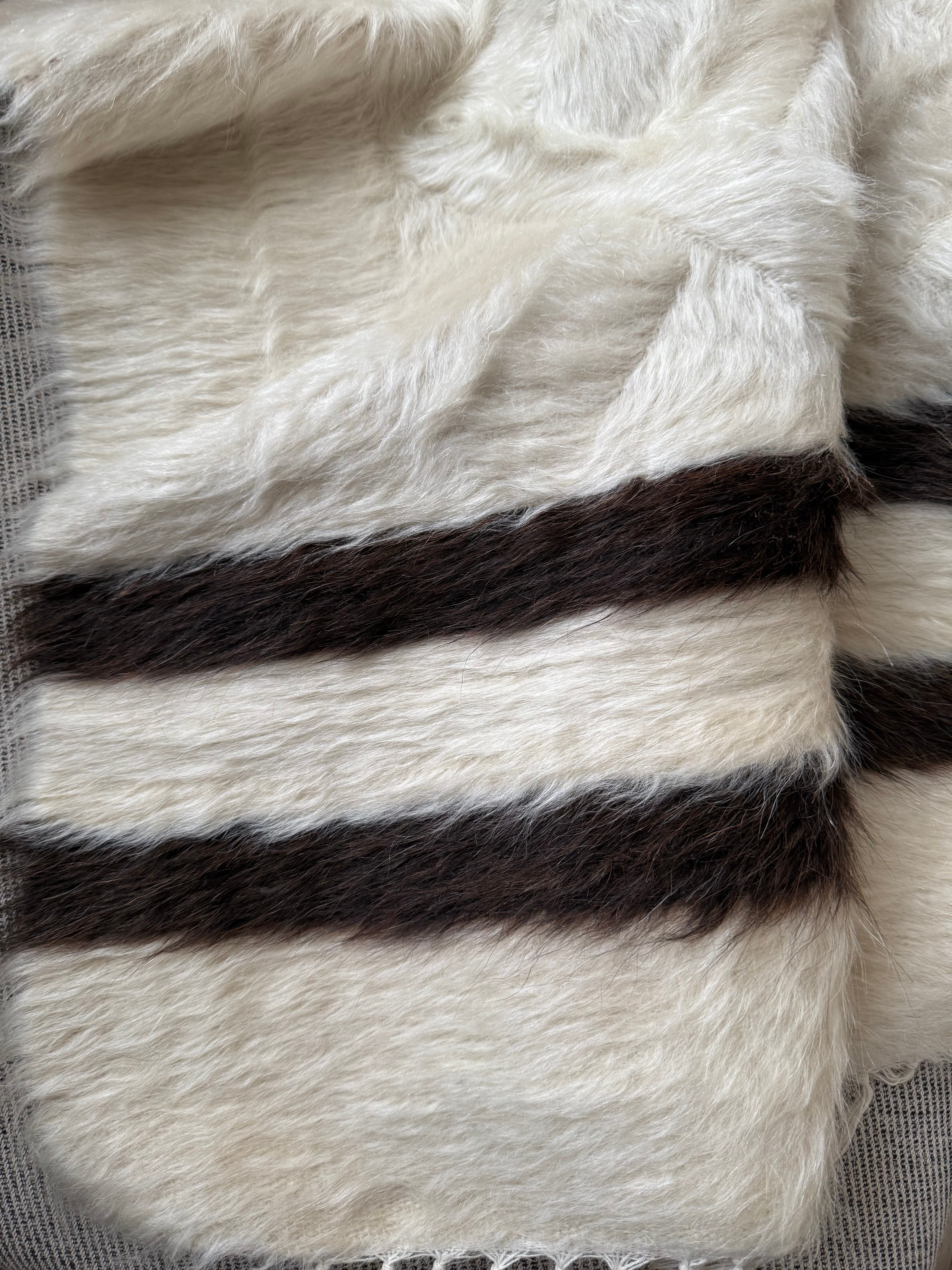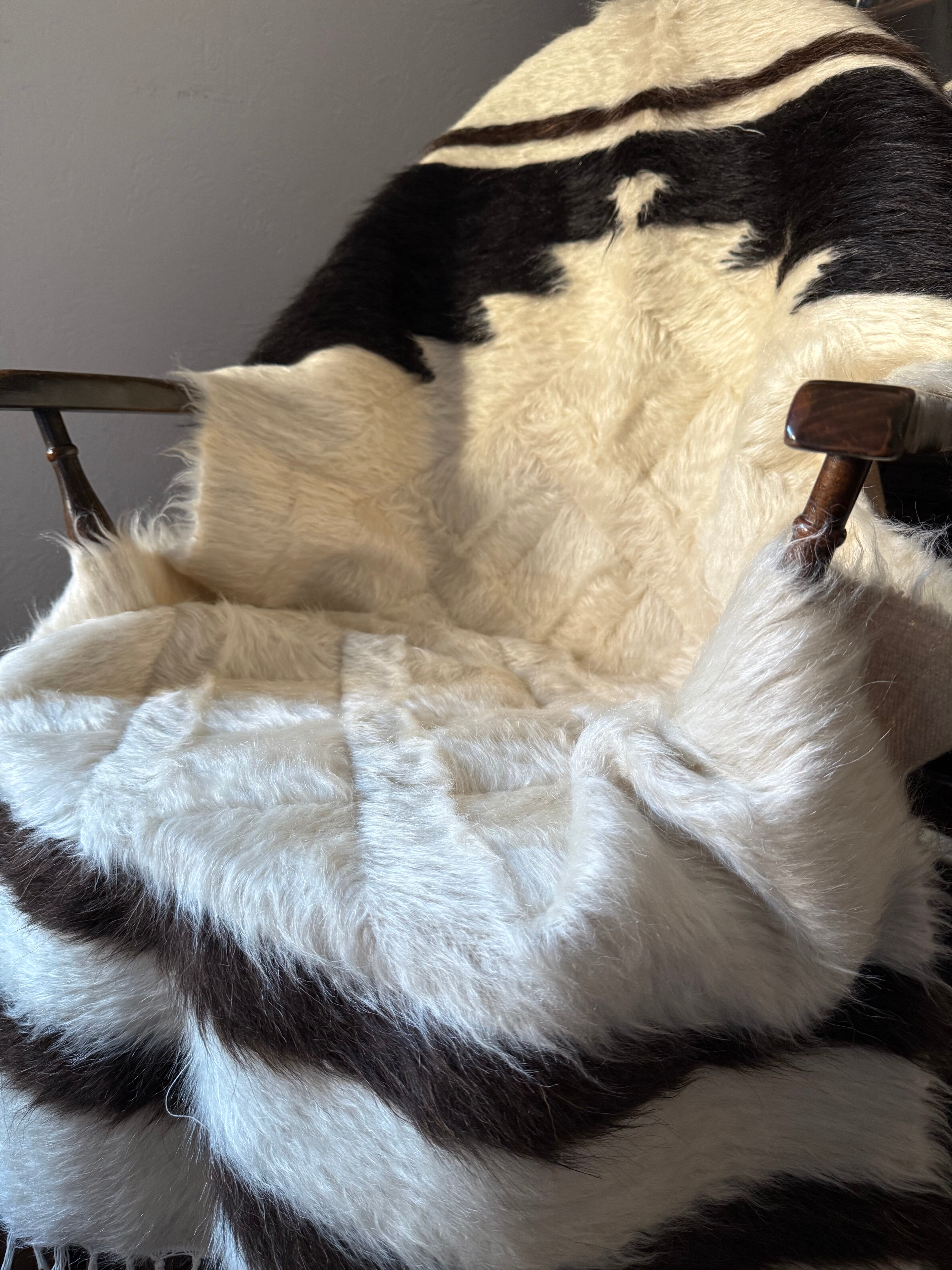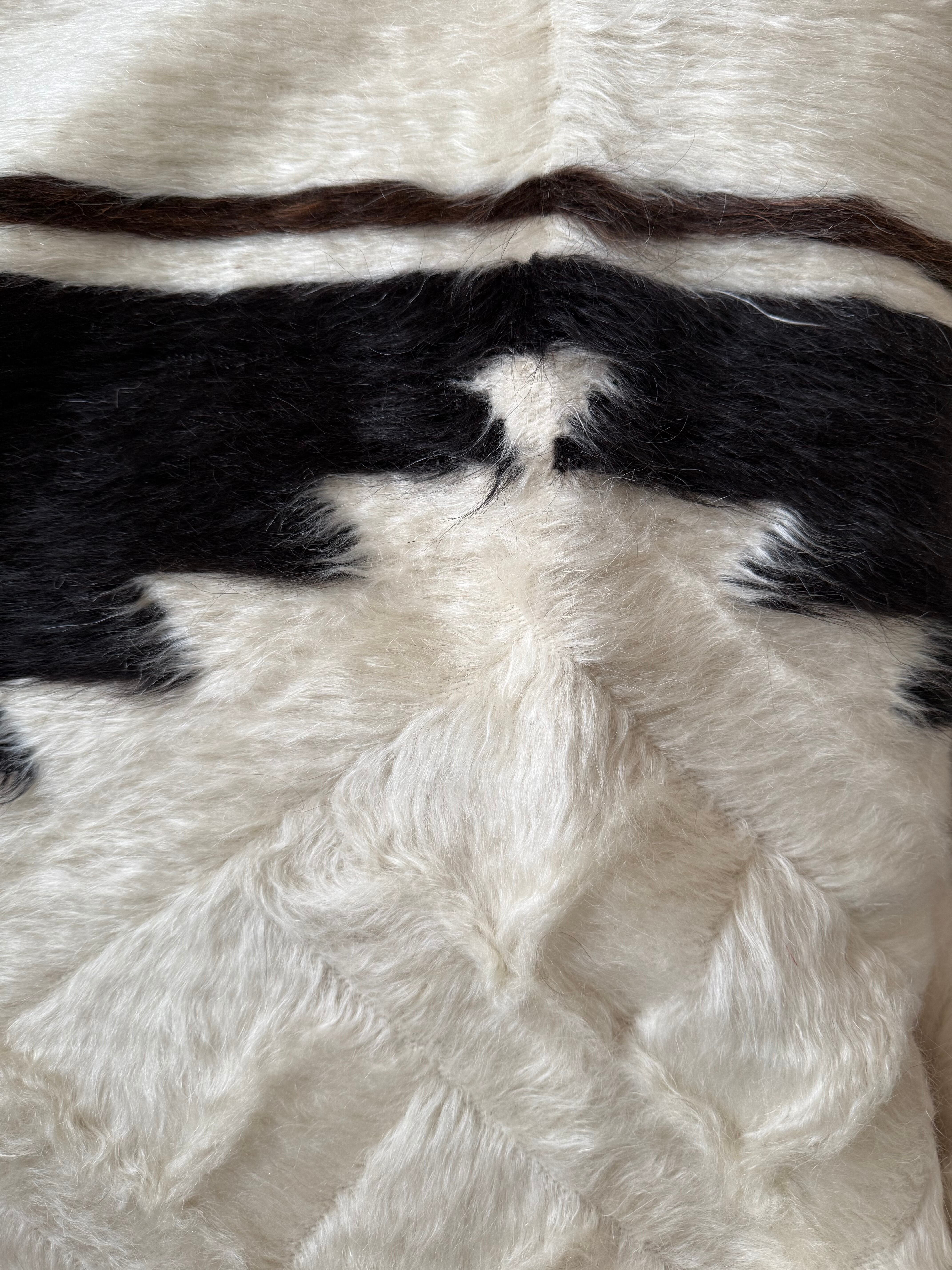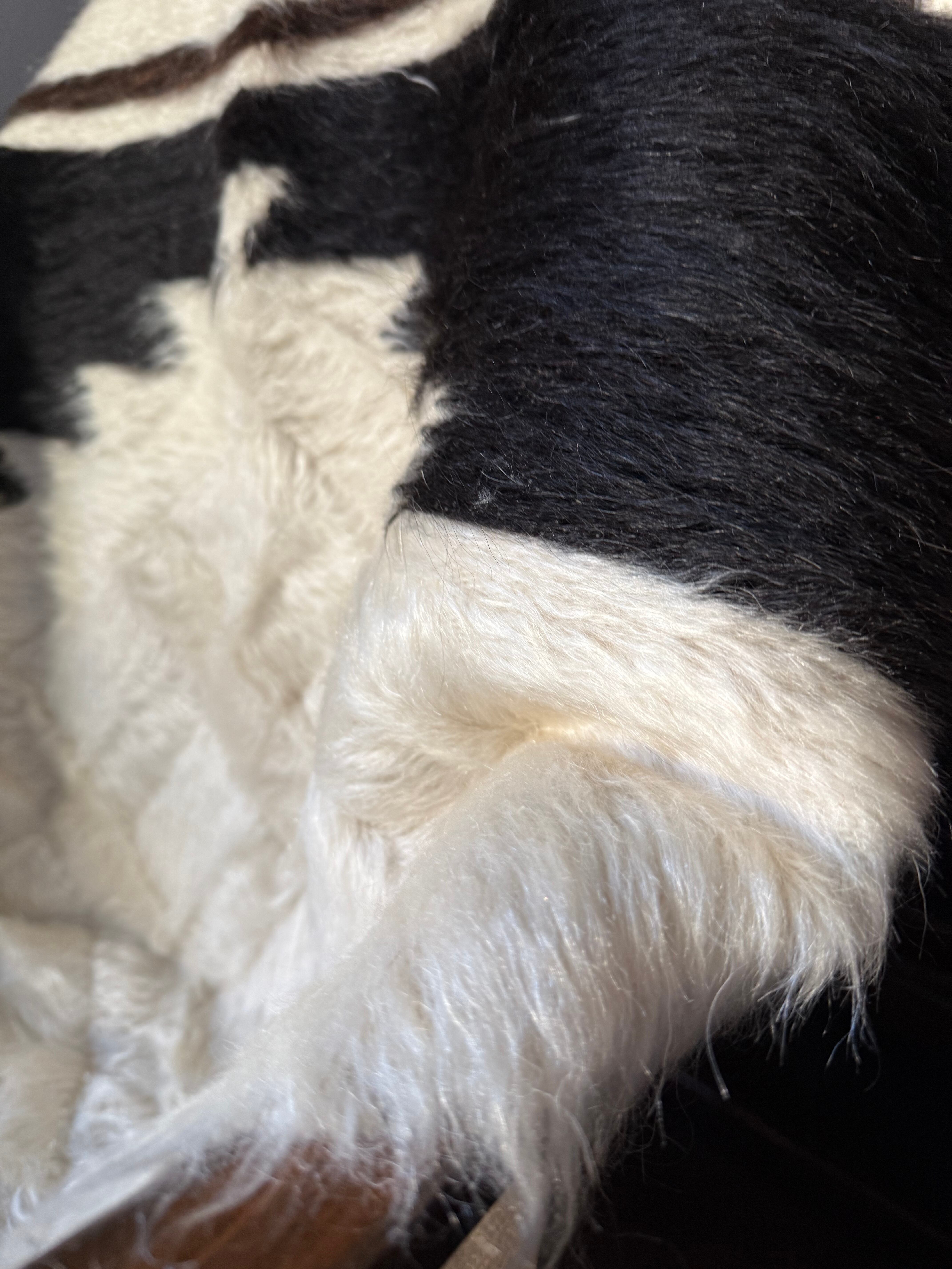 クリーム色の豊かなホワイトの毛をベースに、トップには漆黒のブラック、ボトムには黒に近いダークチョコレートブラウンが組み合わされた1枚。