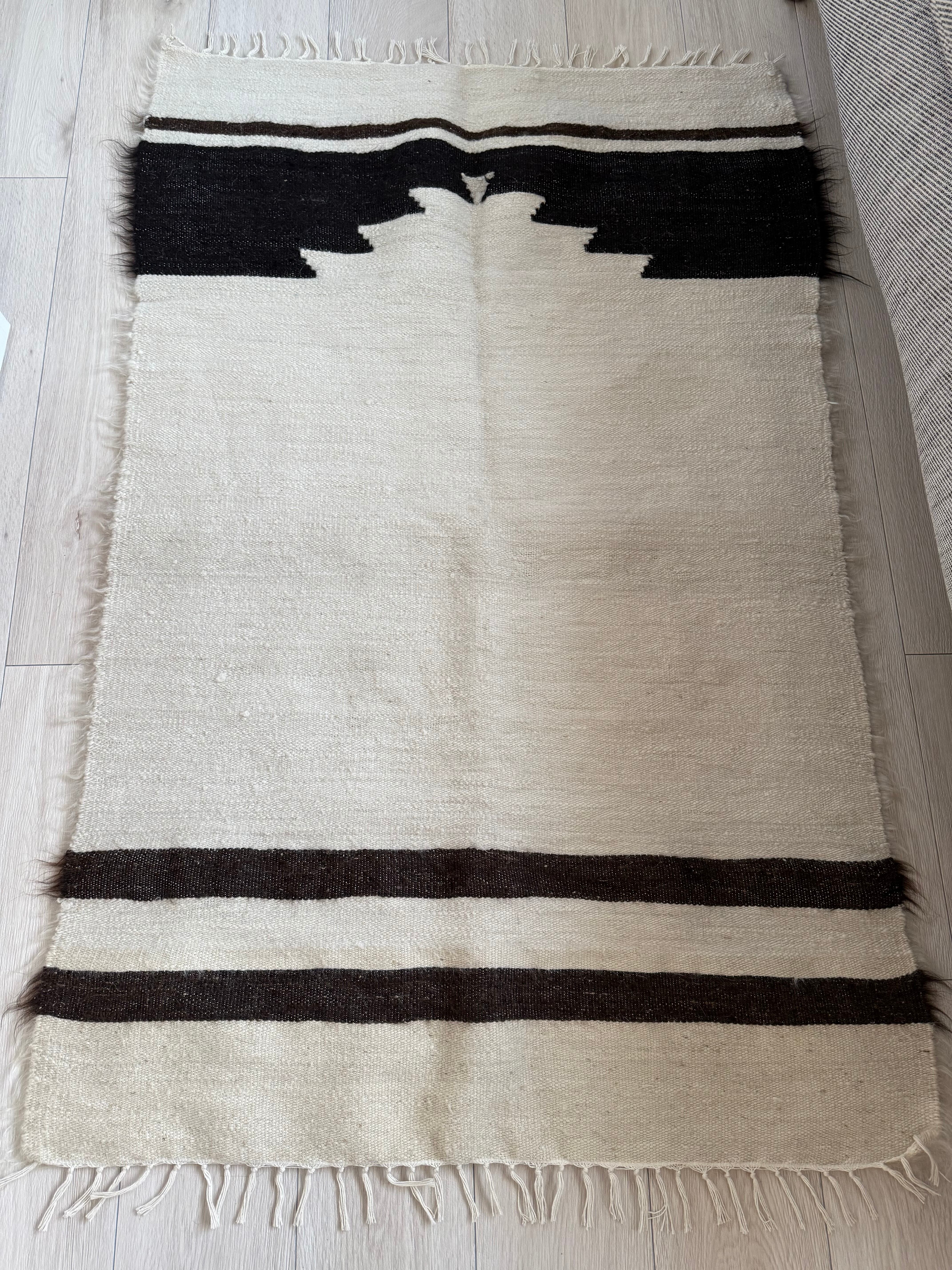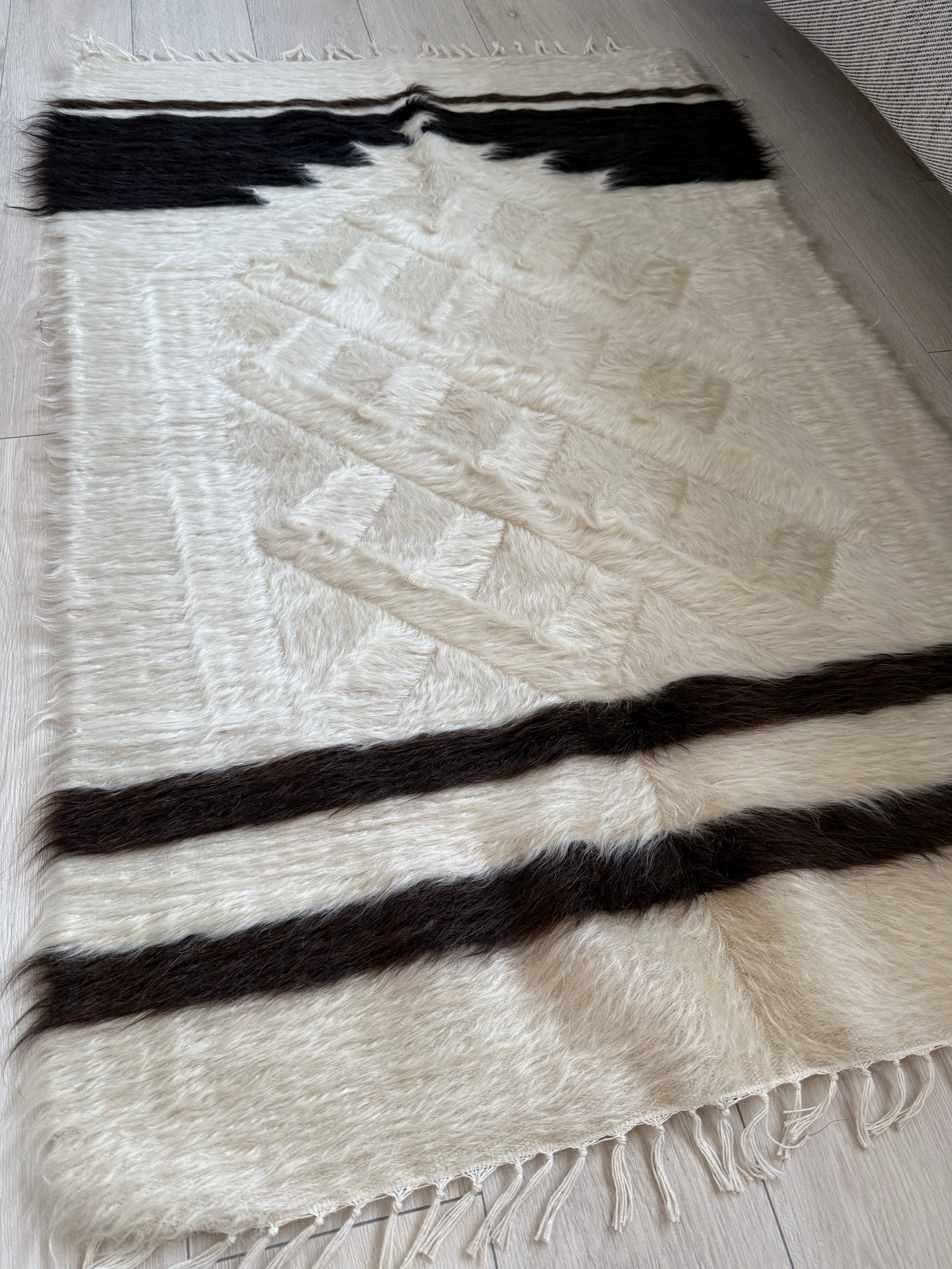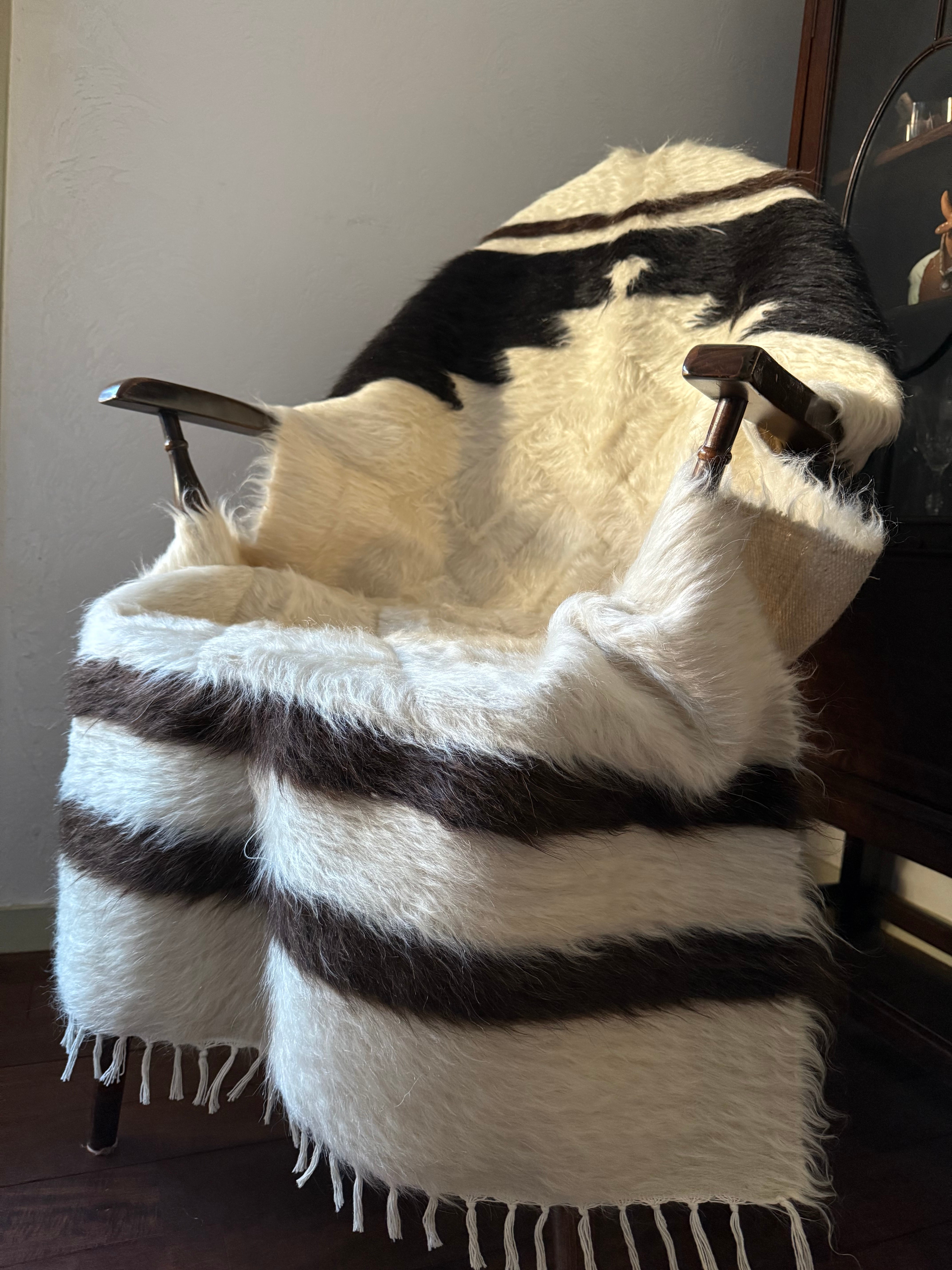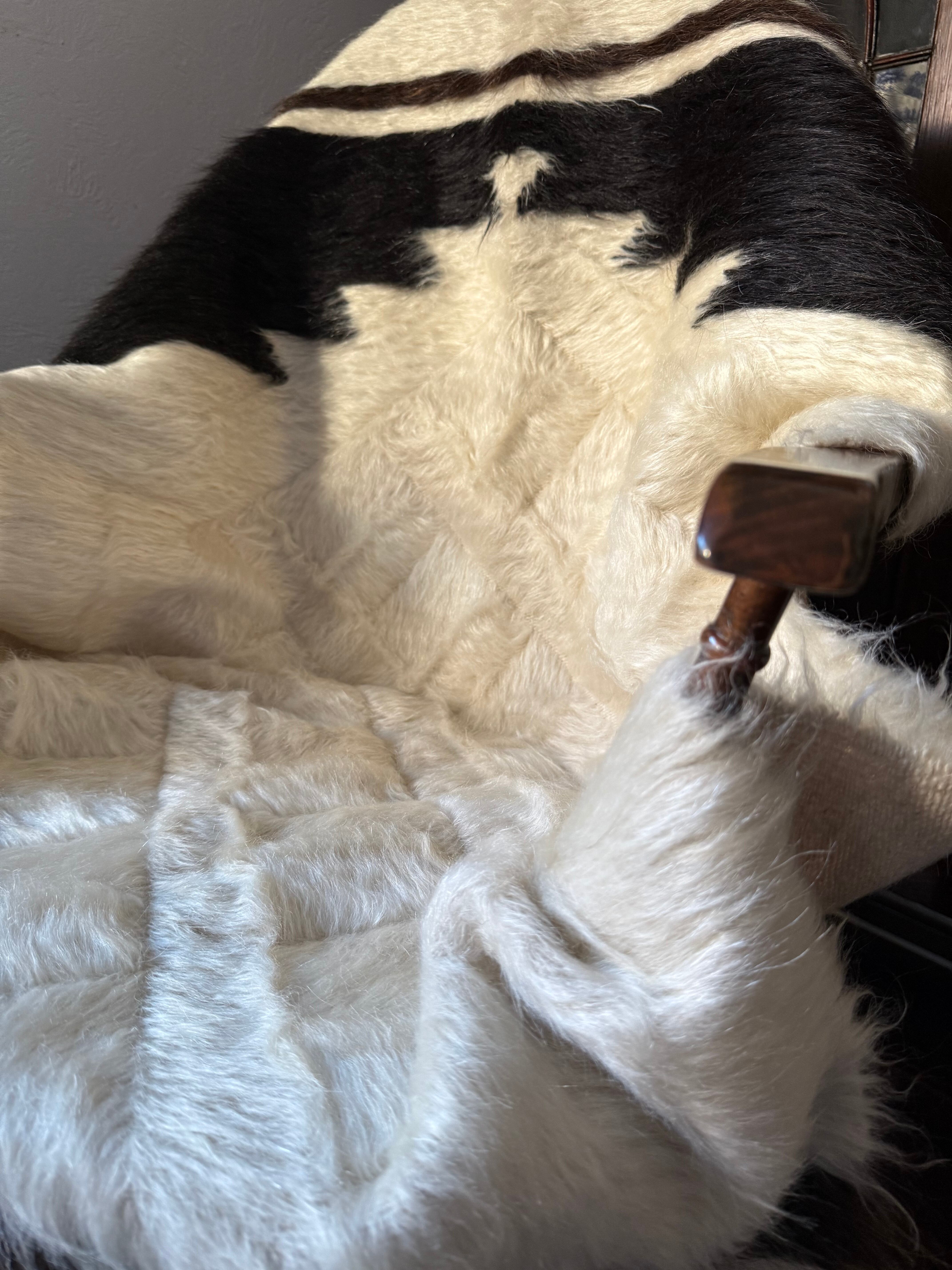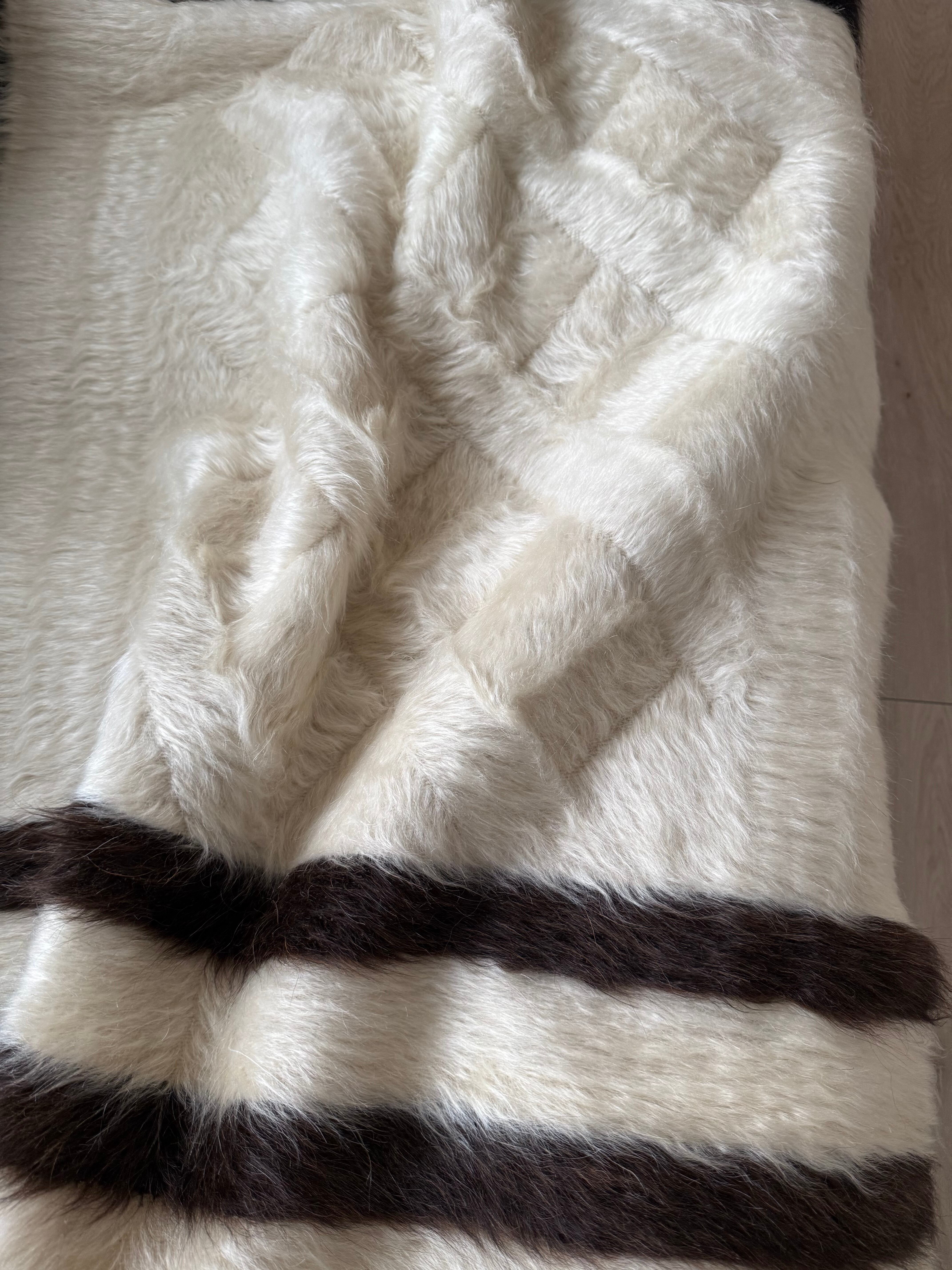 クリーム色の豊かなホワイトの毛をベースに、トップには漆黒のブラック、ボトムには黒に近いダークチョコレートブラウンが組み合わされた1枚。