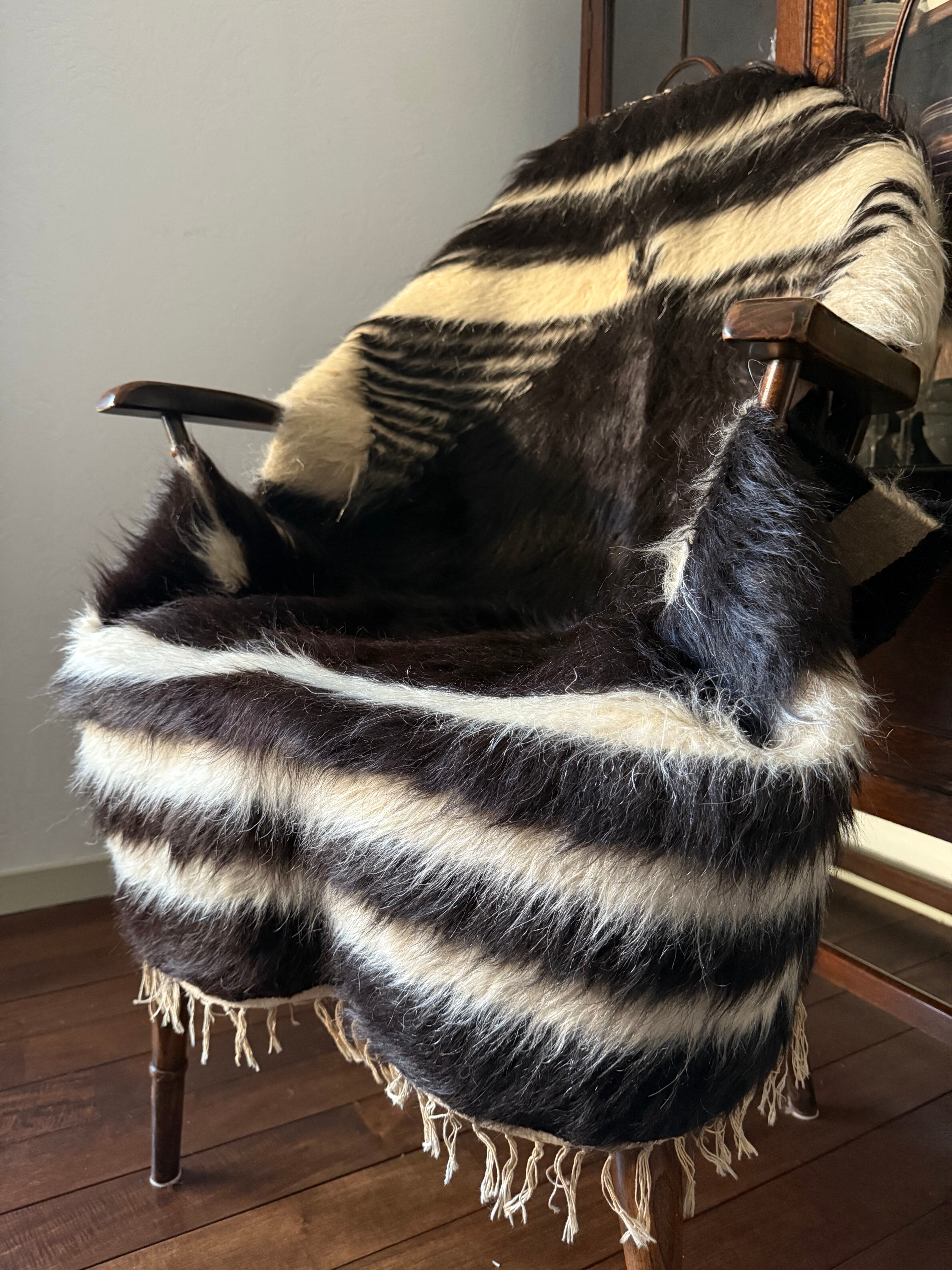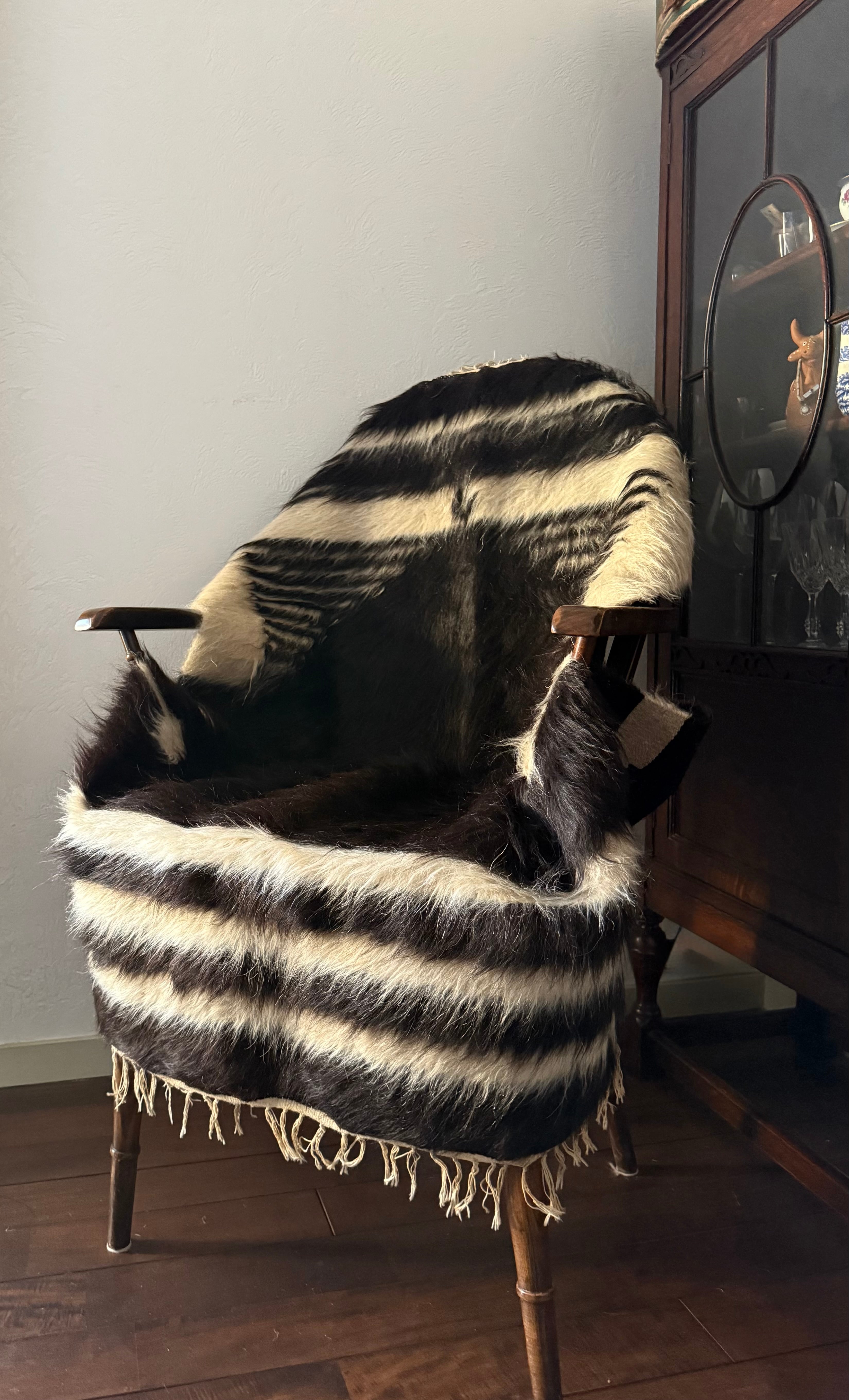 バッターニエは、アンゴラ山羊の毛で織られています。羊やウサギの毛などより、ツヤとハリがあり、夏の薄着や肌着などで座ると、ほんの少しちくちく感を感じるかもしれません。(個人的にはあまり感じませんでしたが)