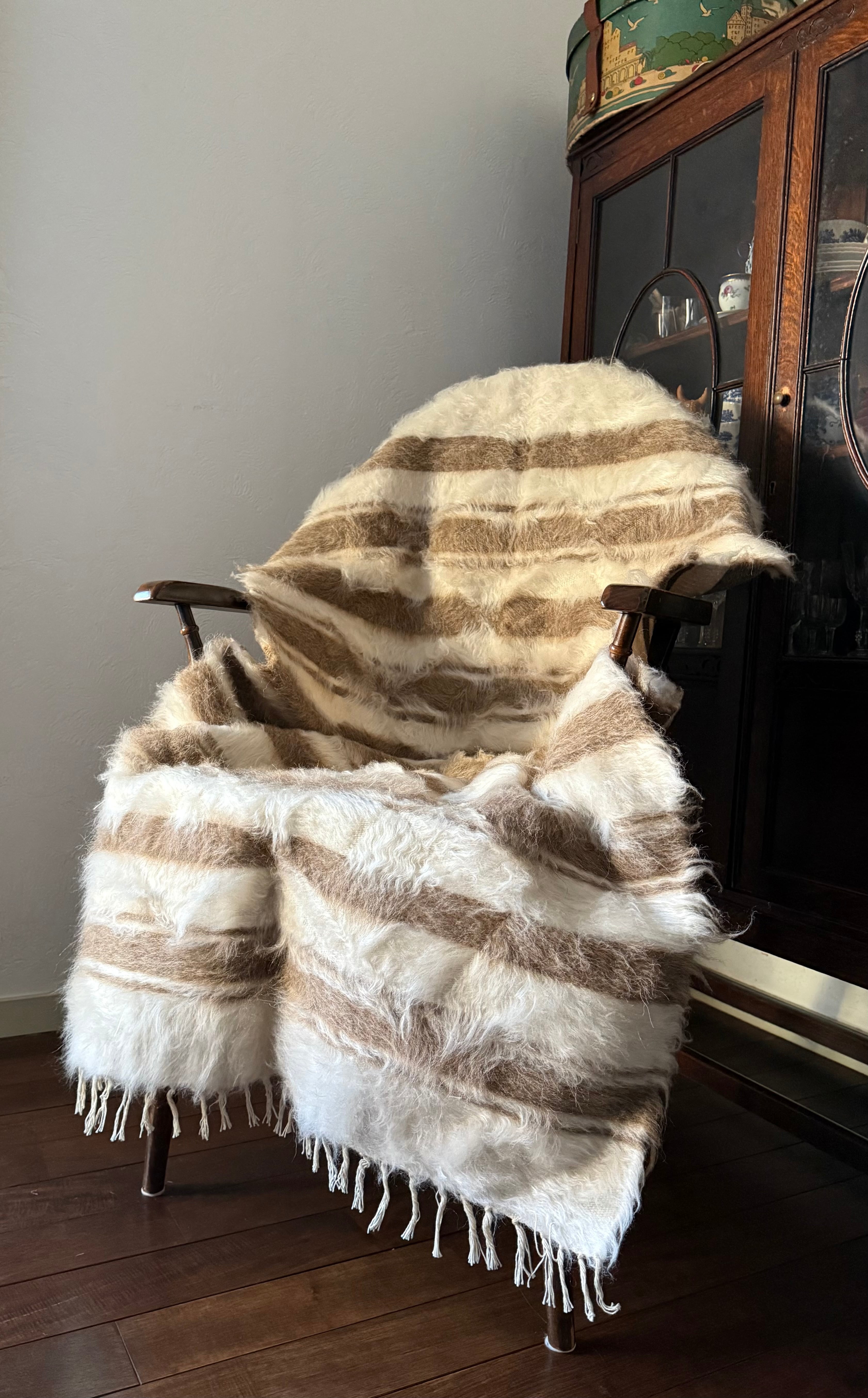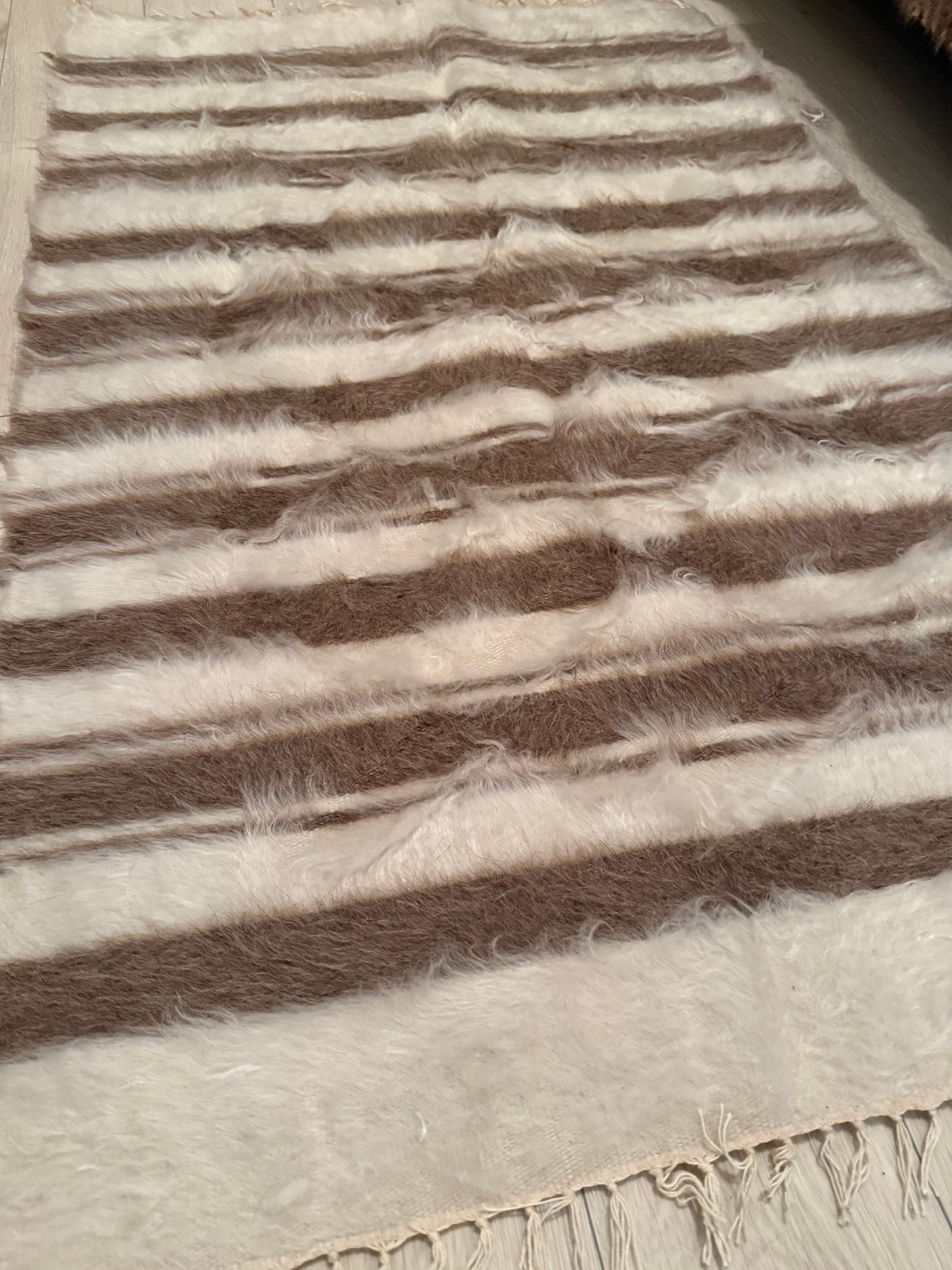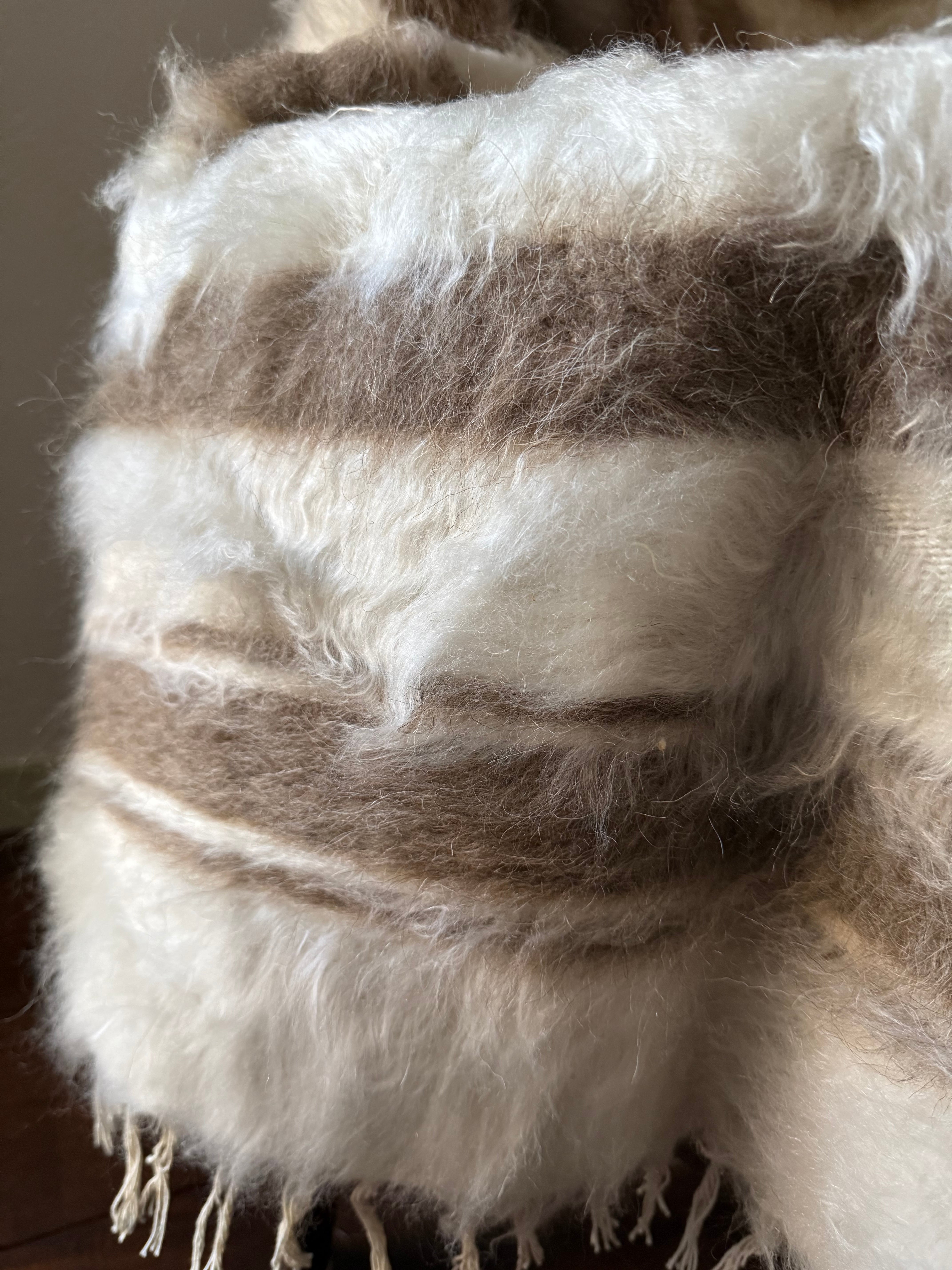 ホワイトをベースに、モカ色の太い線と細い線が繰り返されるシックシンストライプで、ふんわりとした毛とこの微妙な色合わせがとても素敵です。