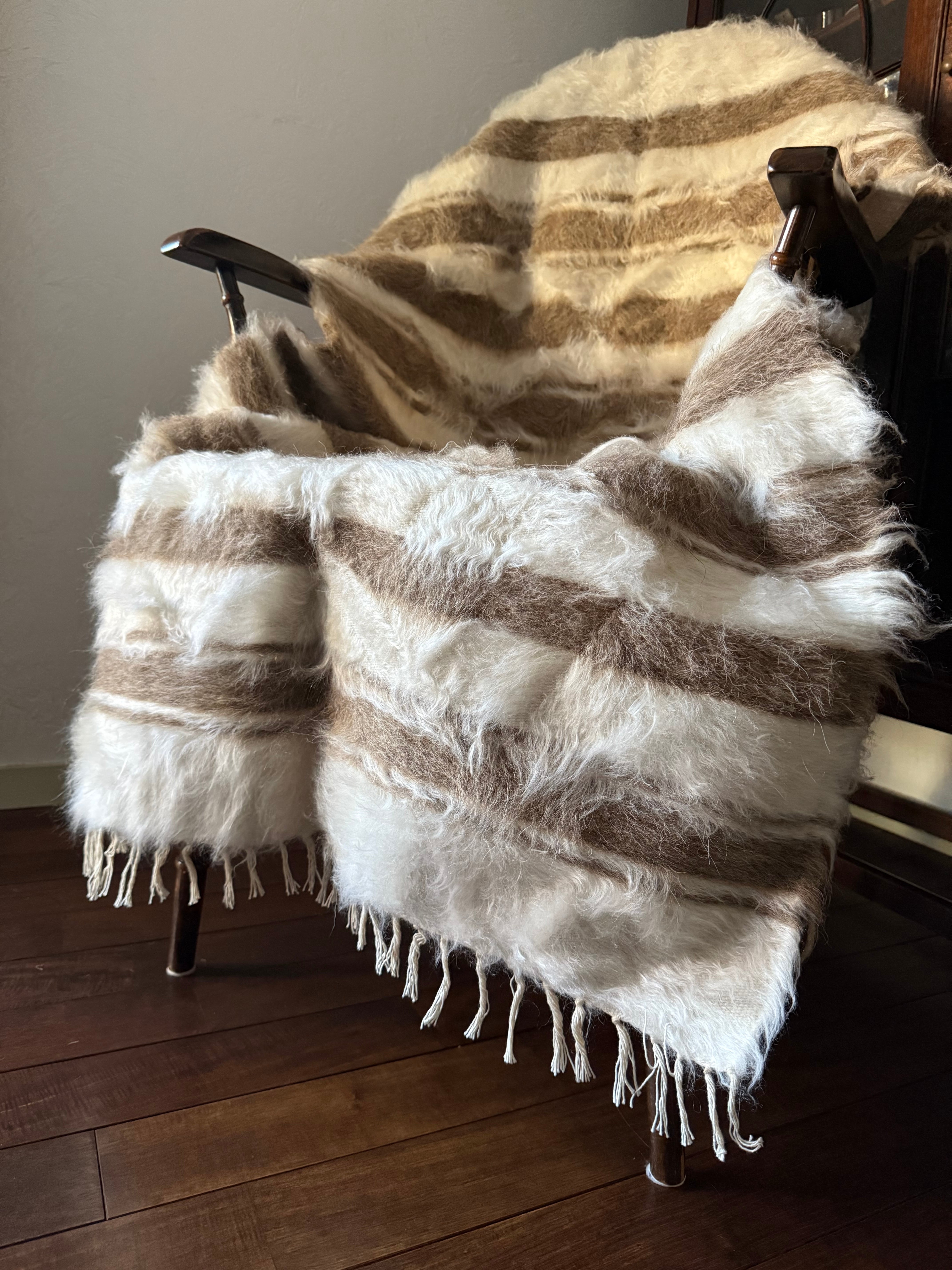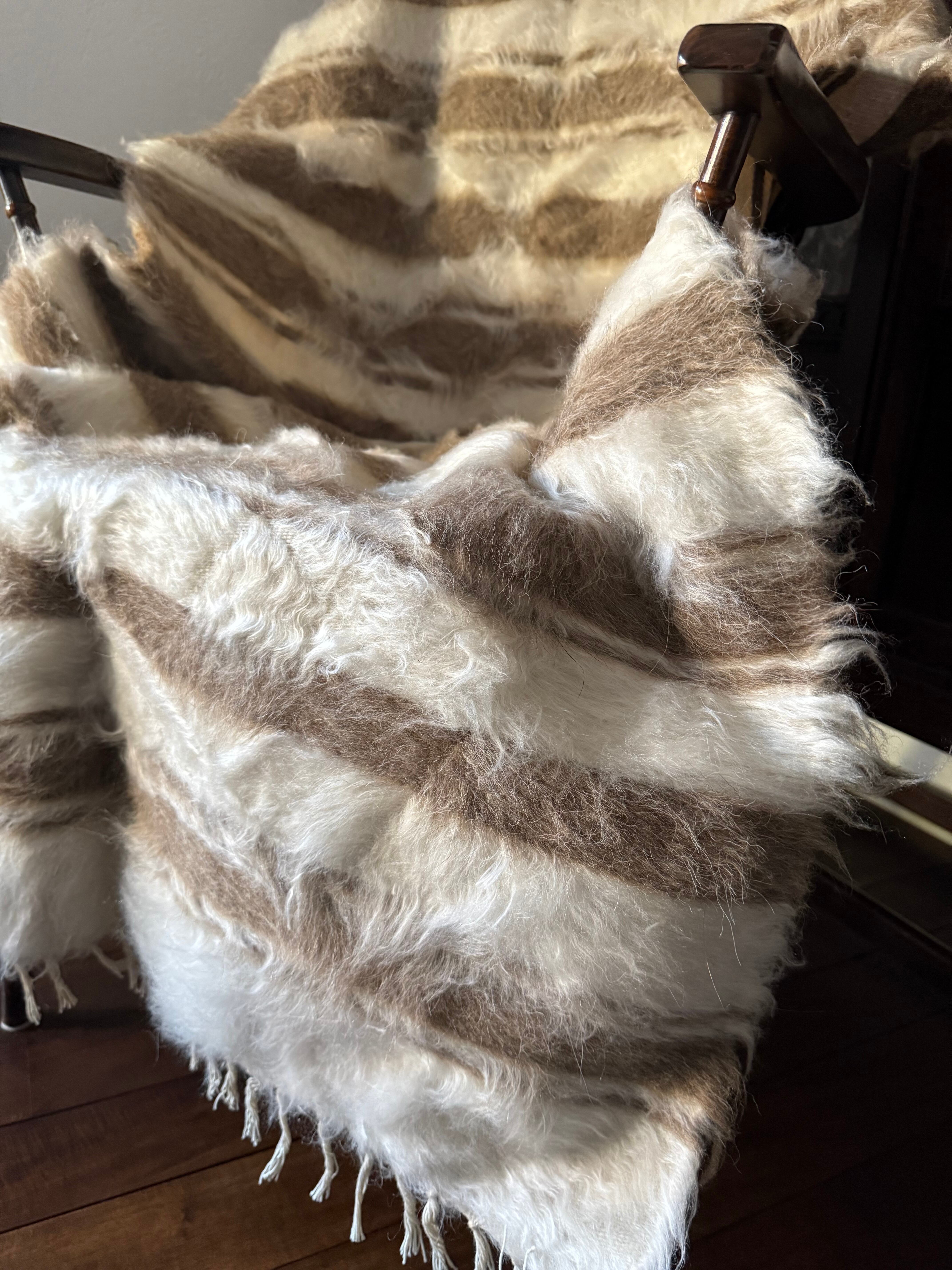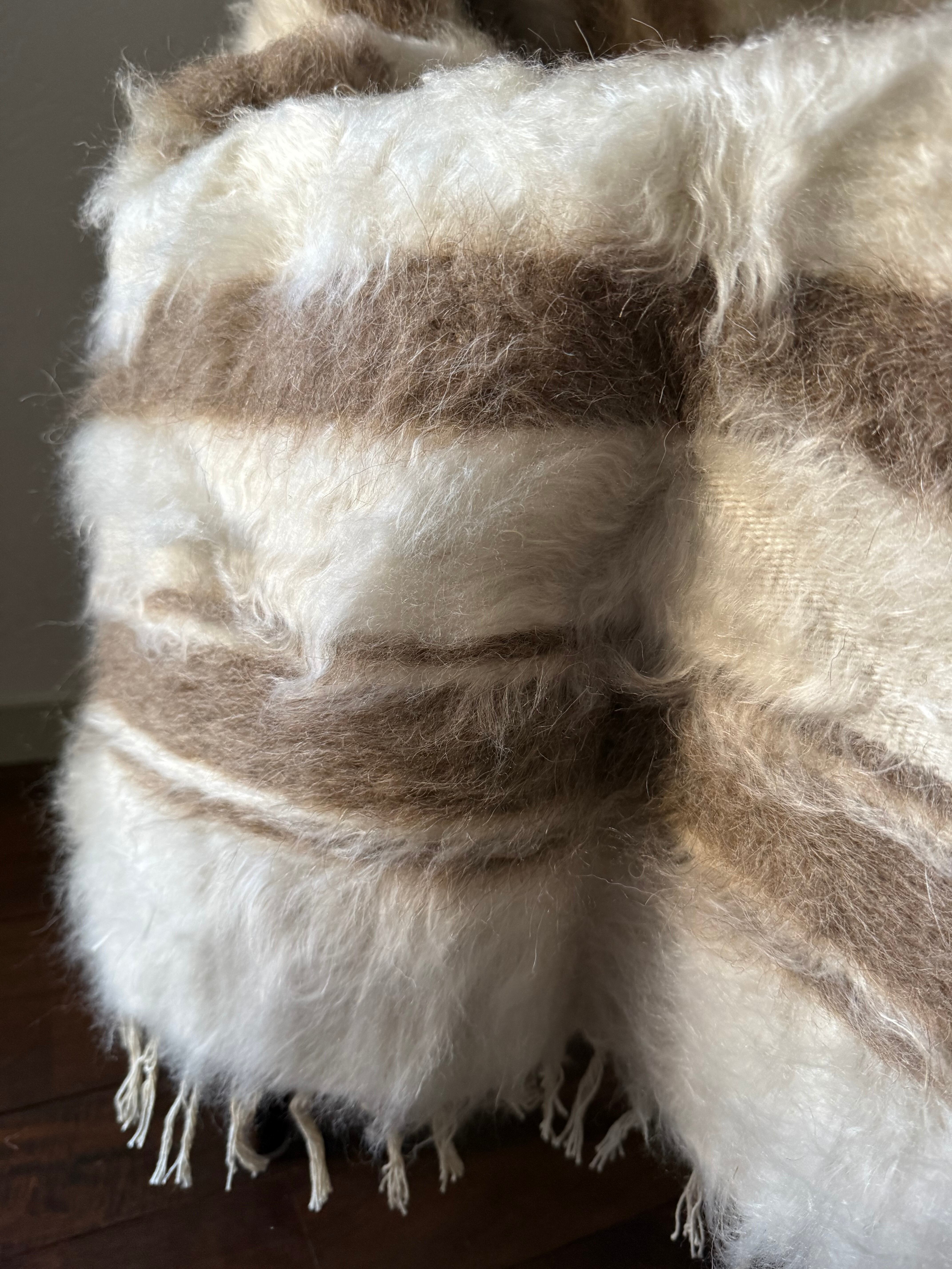 ホワイトをベースに、モカ色の太い線と細い線が繰り返されるシックシンストライプで、ふんわりとした毛とこの微妙な色合わせがとても素敵です。