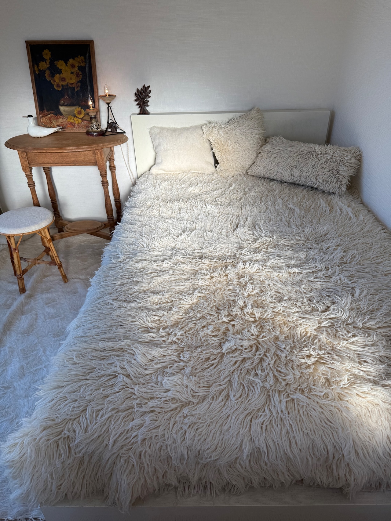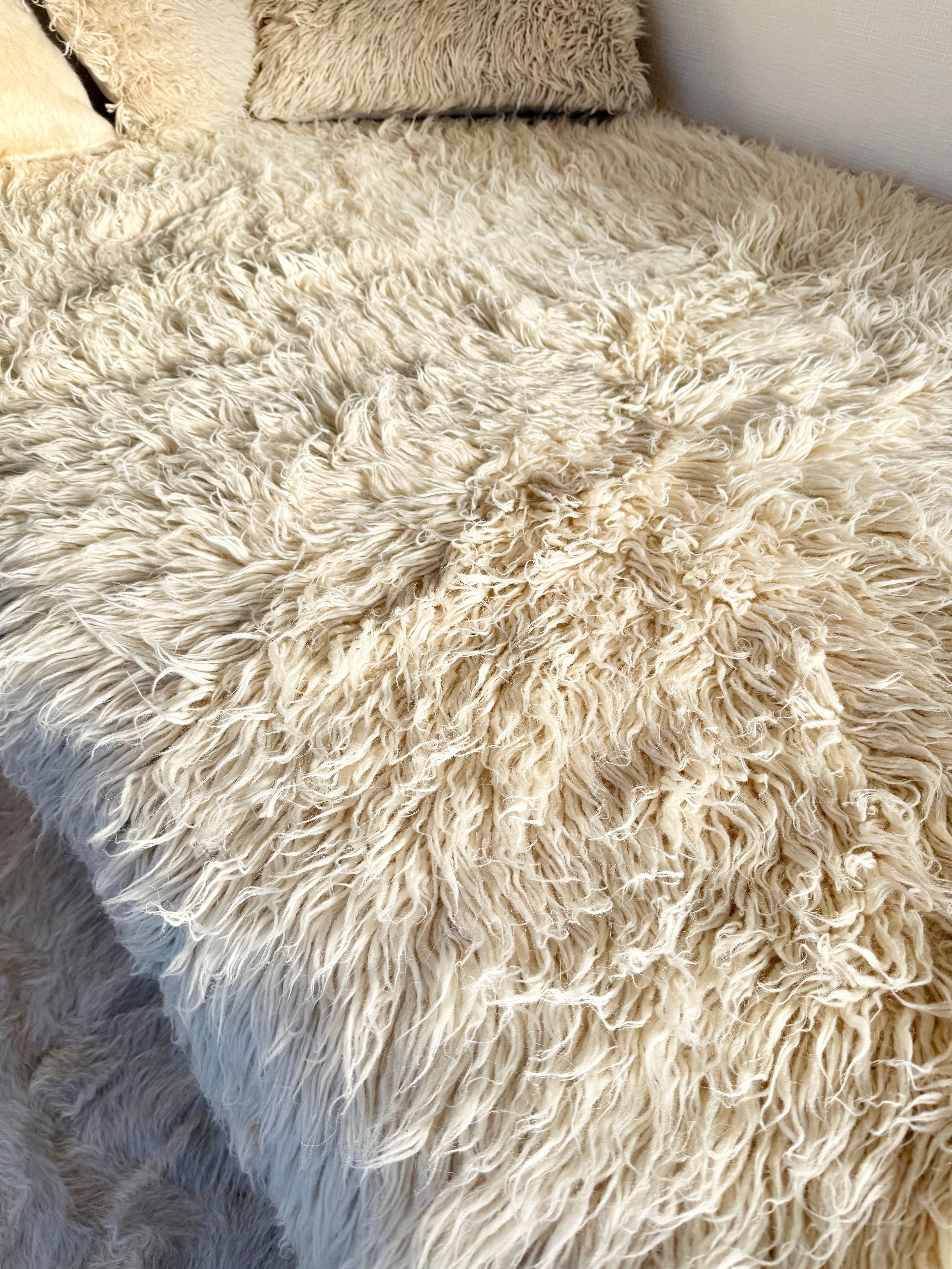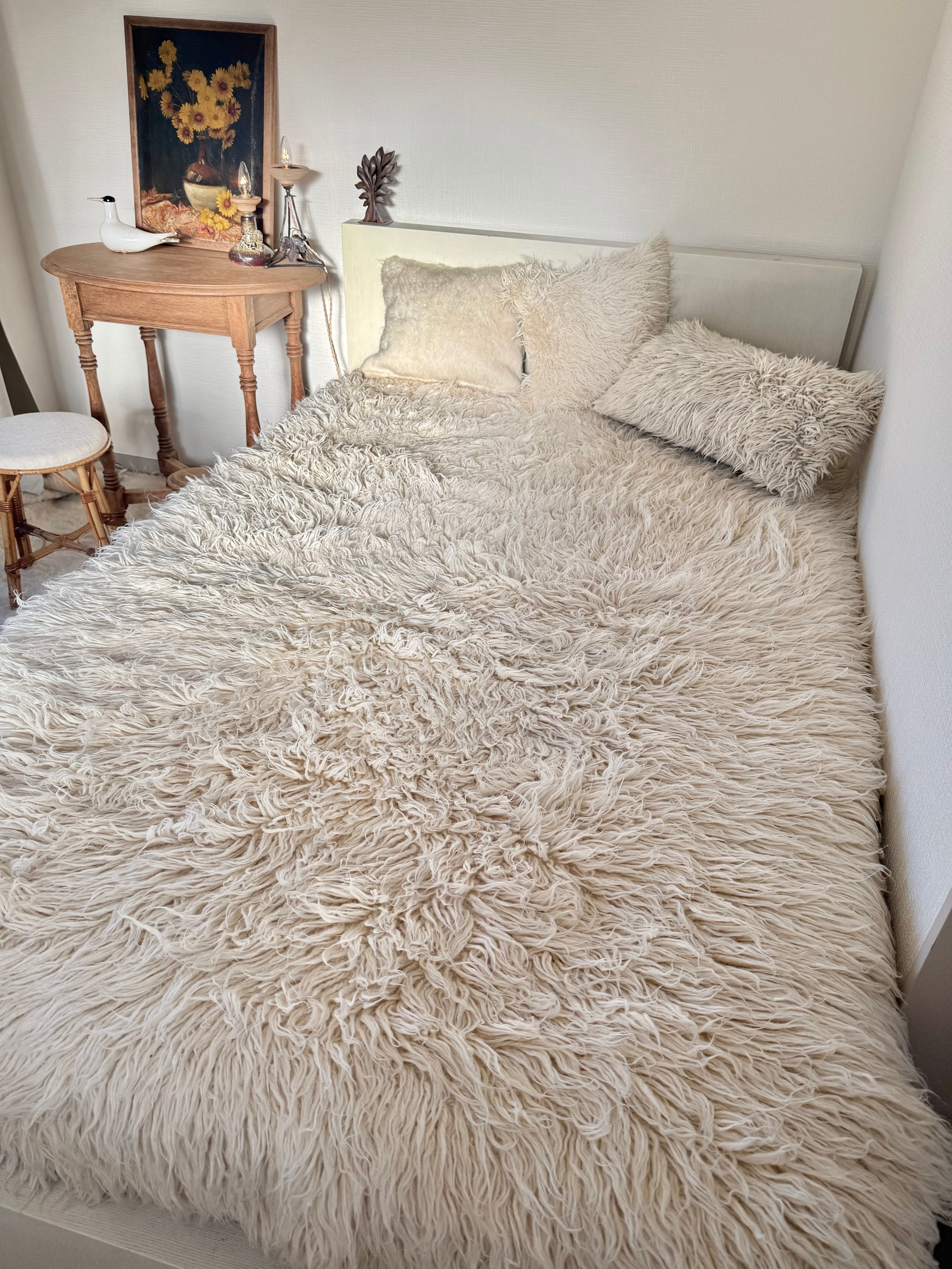(こちらはセミダブルのベッドにかけています。両端が垂れ下がるには少しだけ長さが足りませんが、これ以上ないほどふさふさとした大きめの毛布をかける感覚でお使い頂けます)