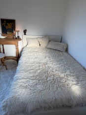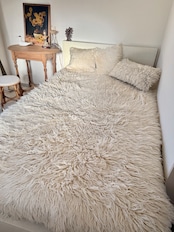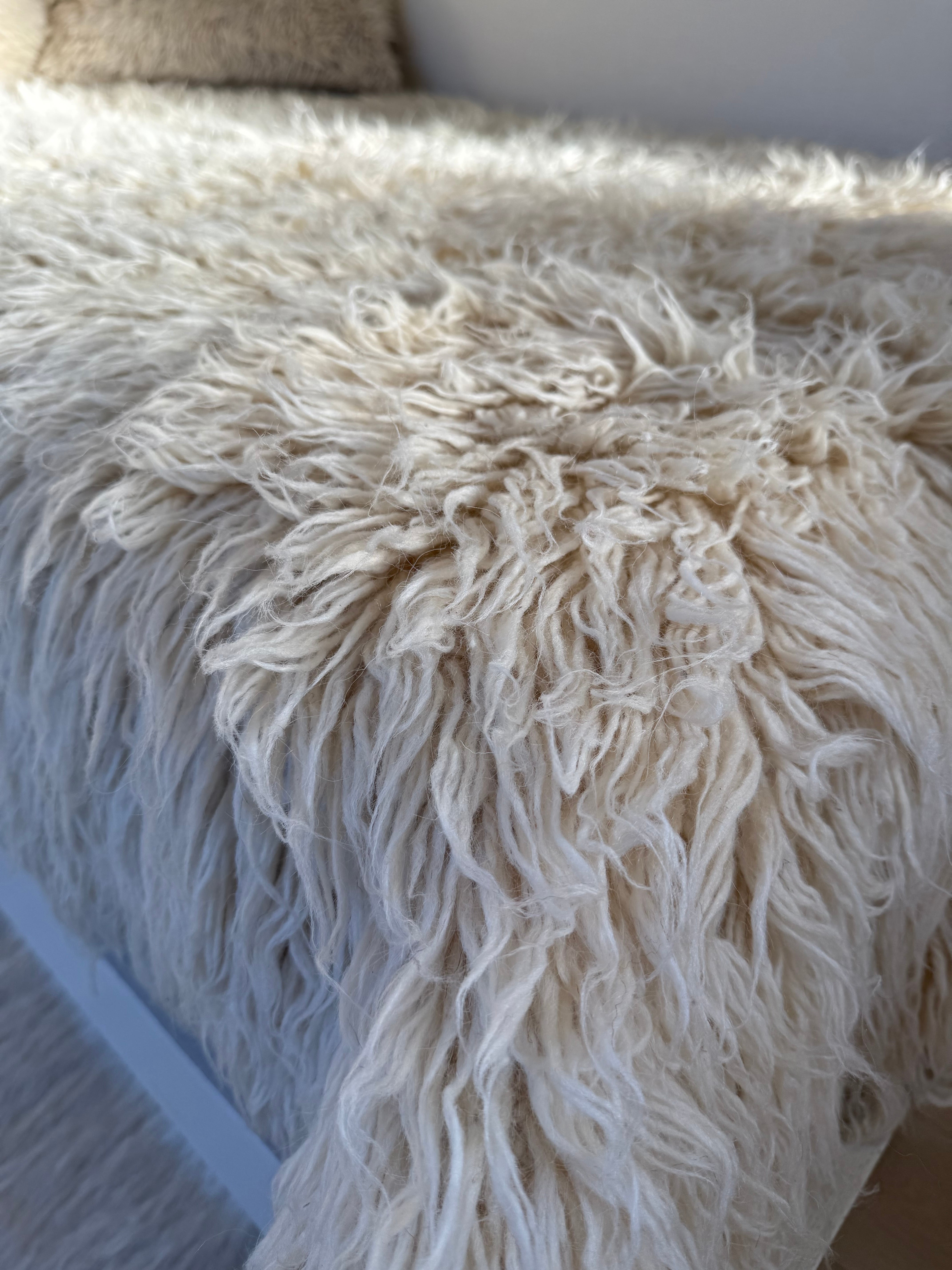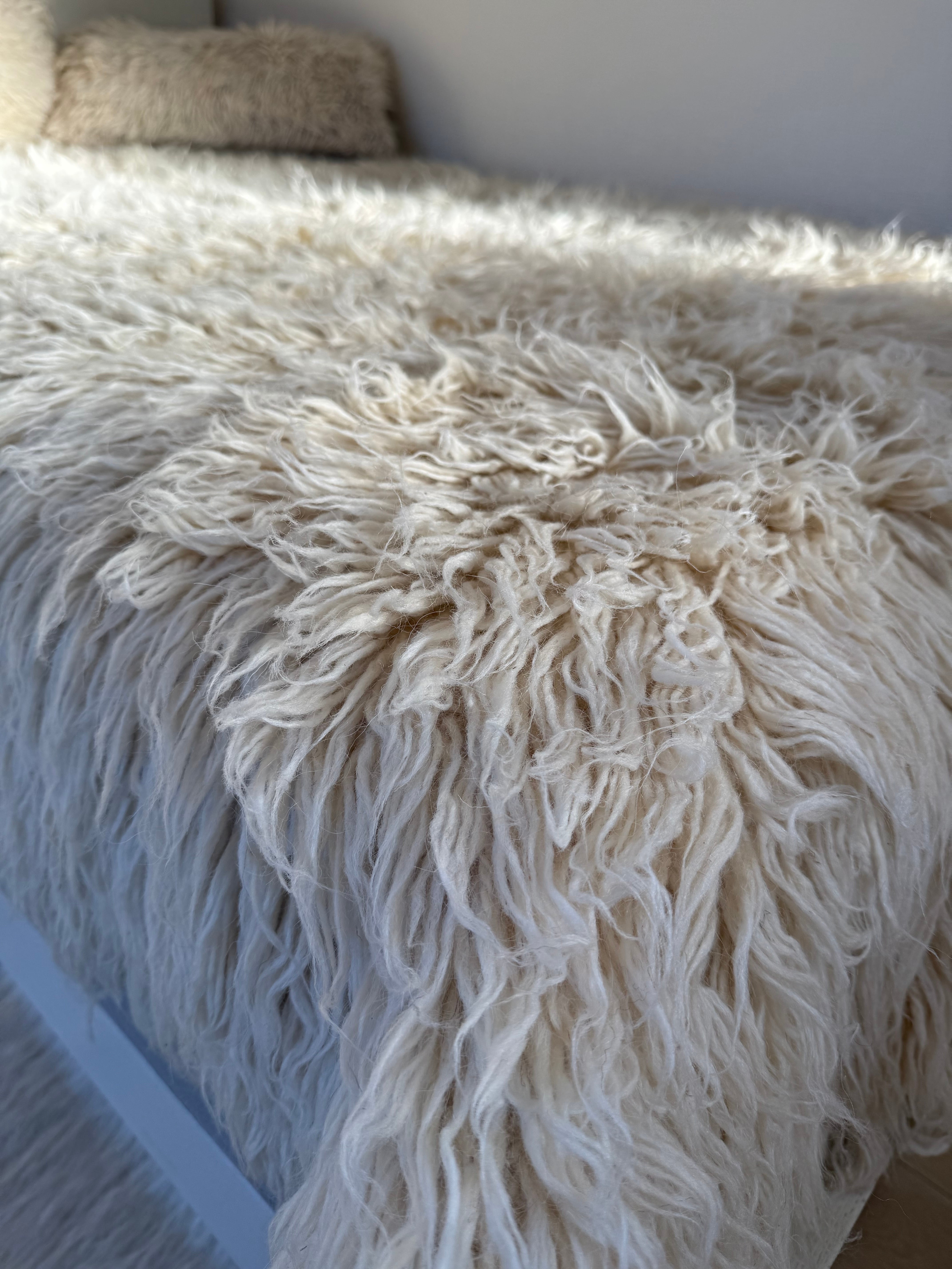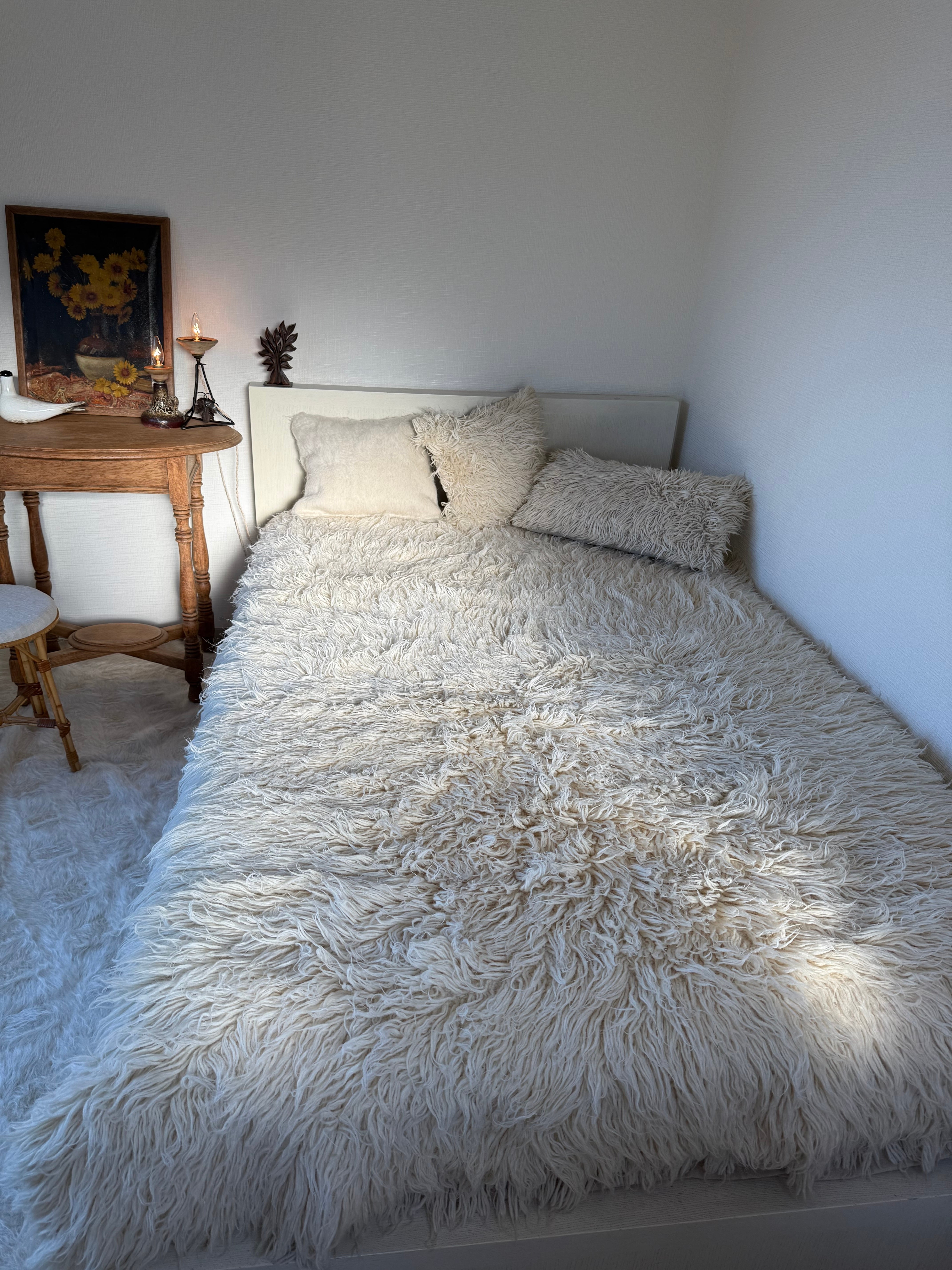(こちらはセミダブルのベッドにかけています。両端が垂れ下がるには少しだけ長さが足りませんが、これ以上ないほどふさふさとした大きめの毛布をかける感覚でお使い頂けます)