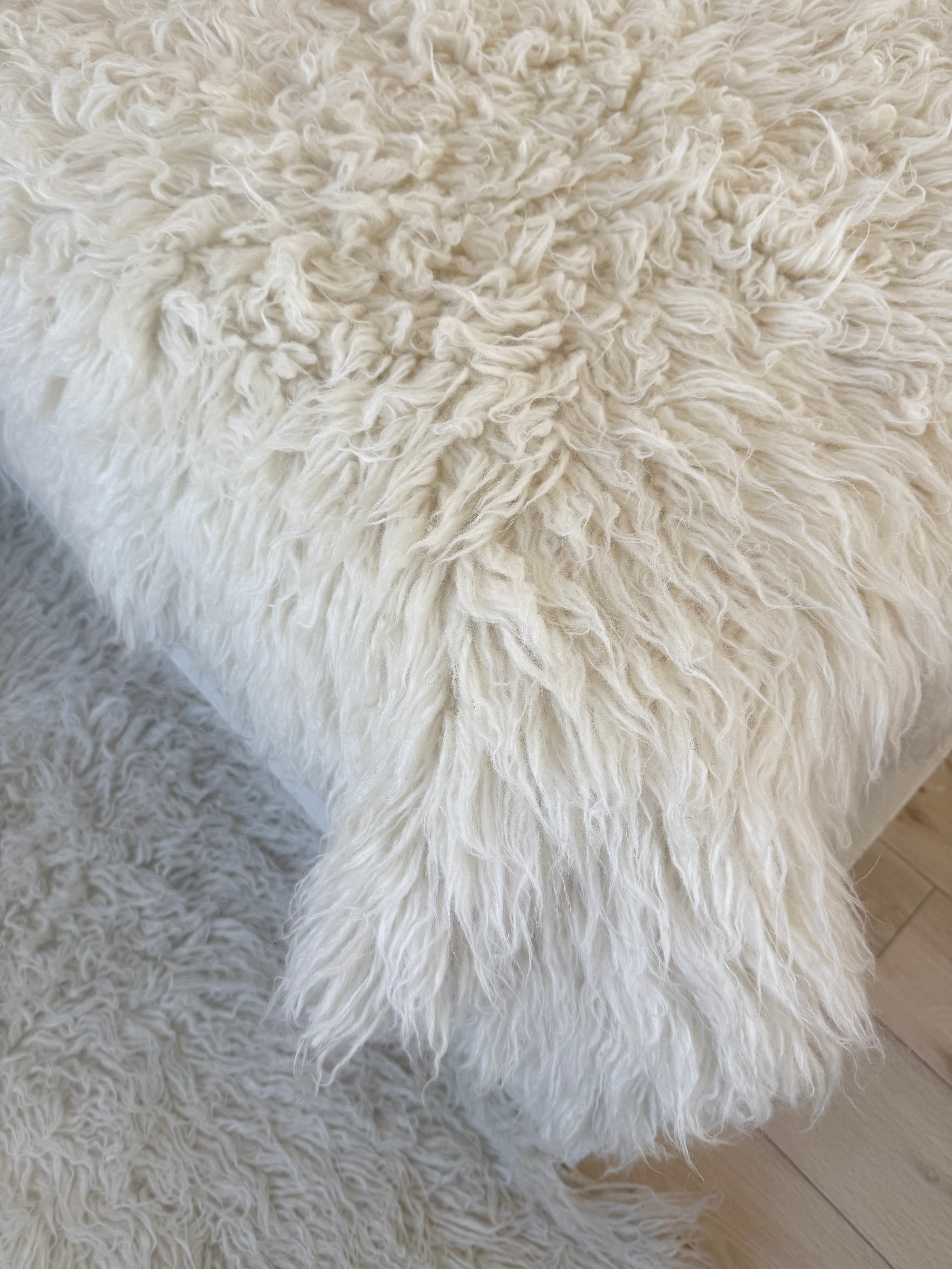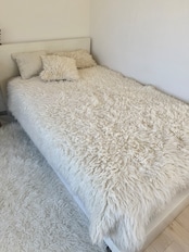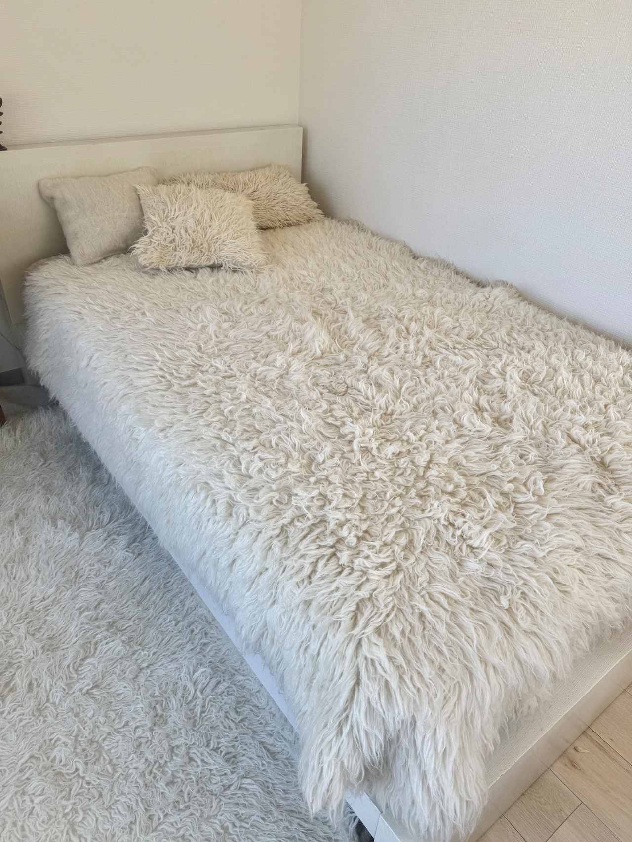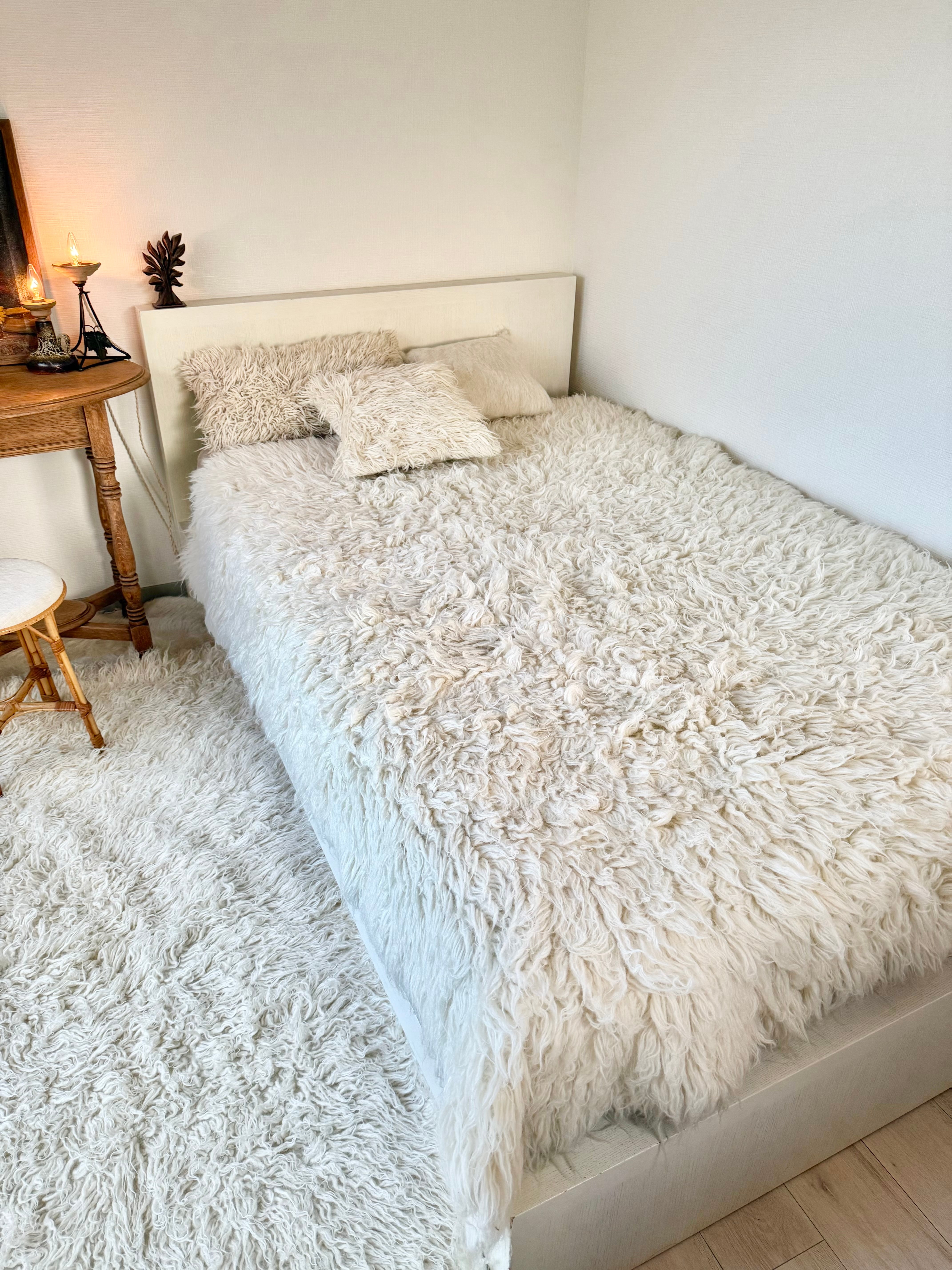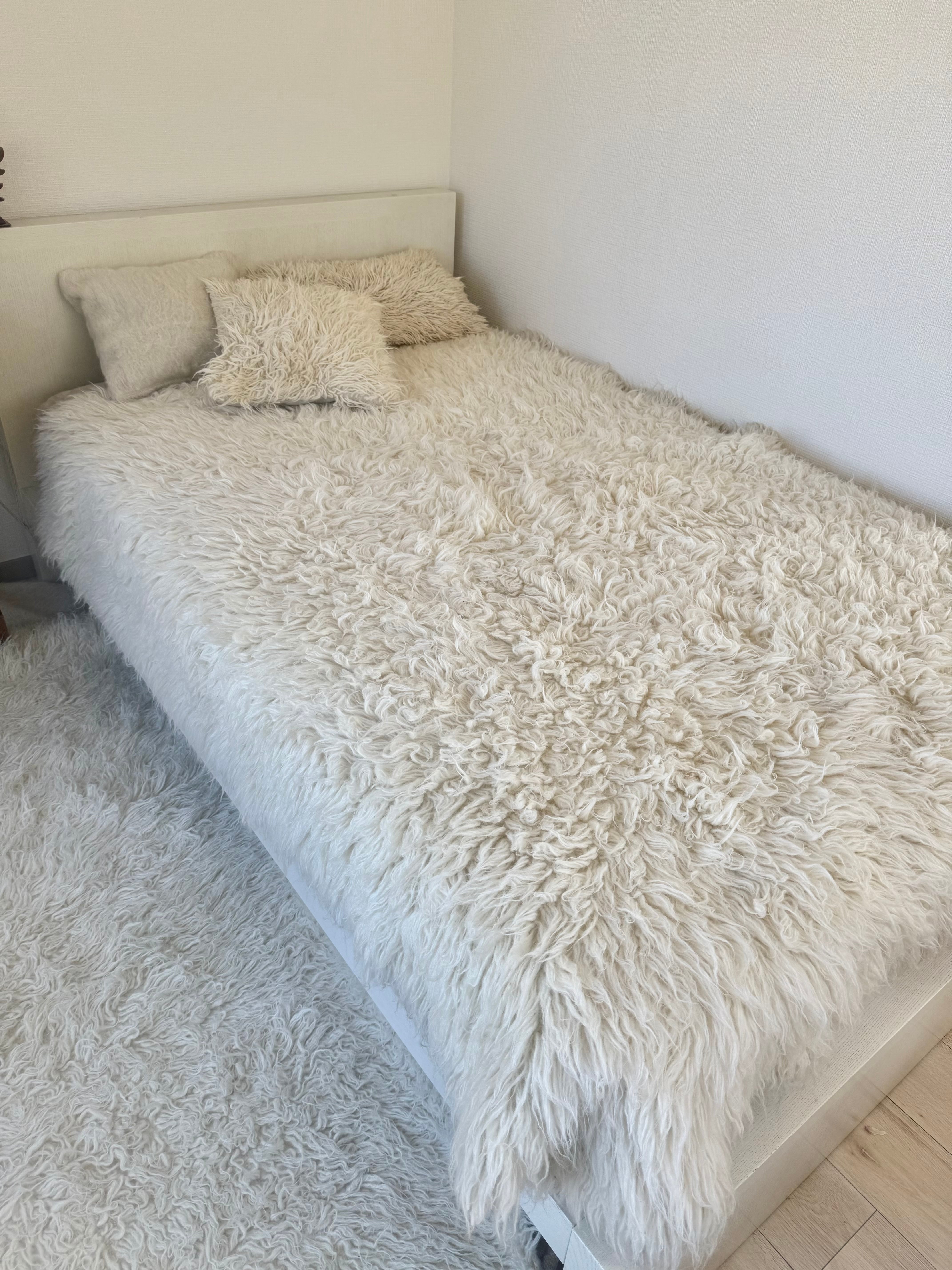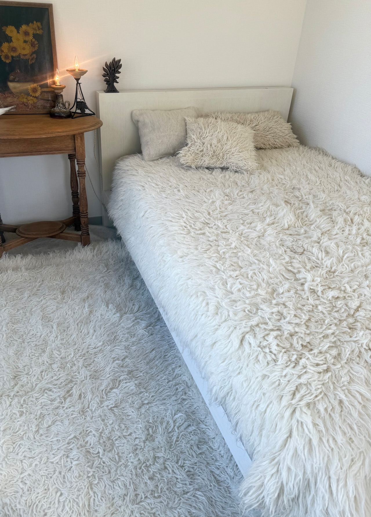 (こちらはセミダブルのベッドにかけています。両端が垂れ下がるには少しだけ長さが足りませんが、これ以上ないほどふさふさとした大きめの毛布をかける感覚でお使い頂けます)